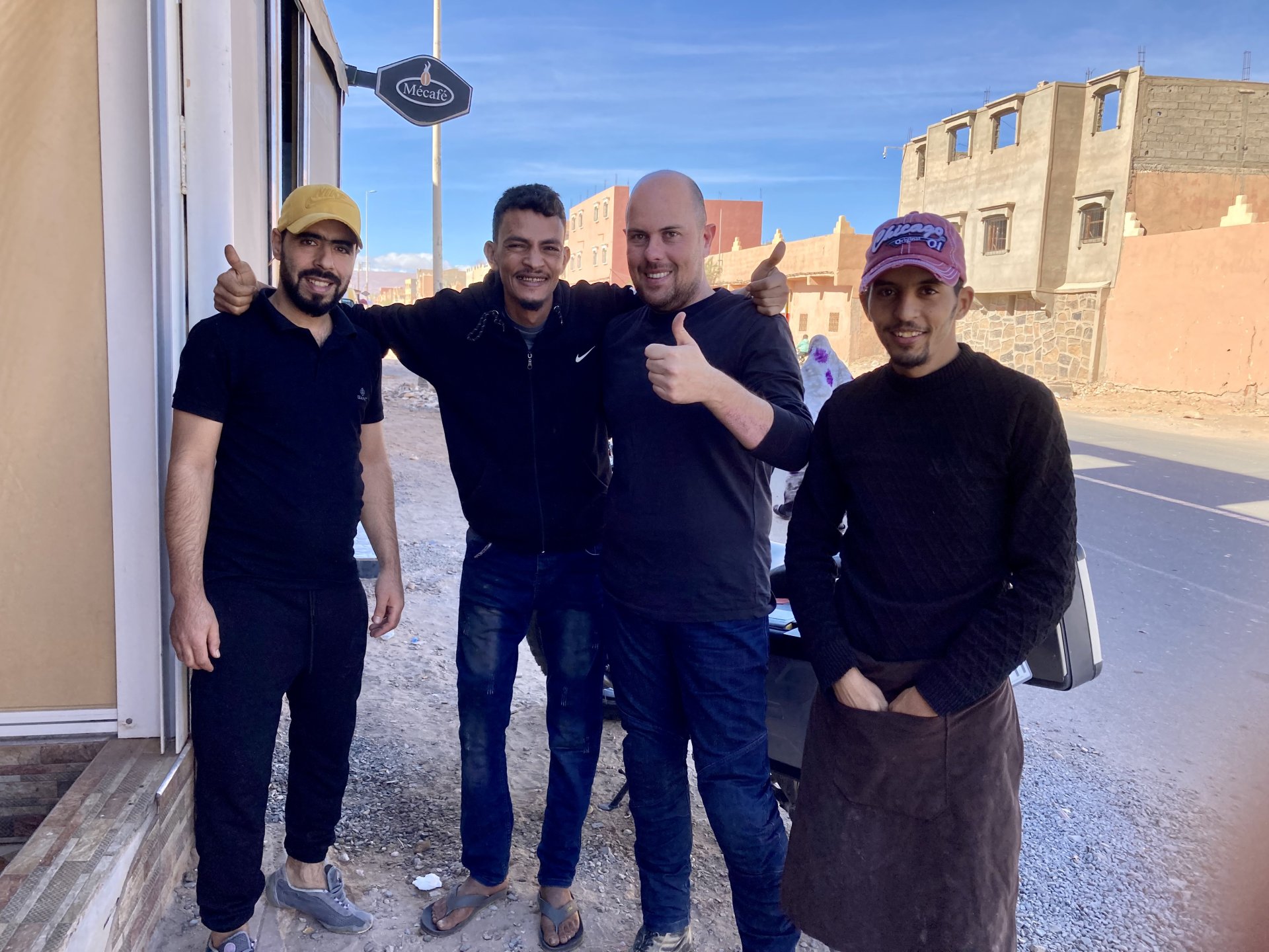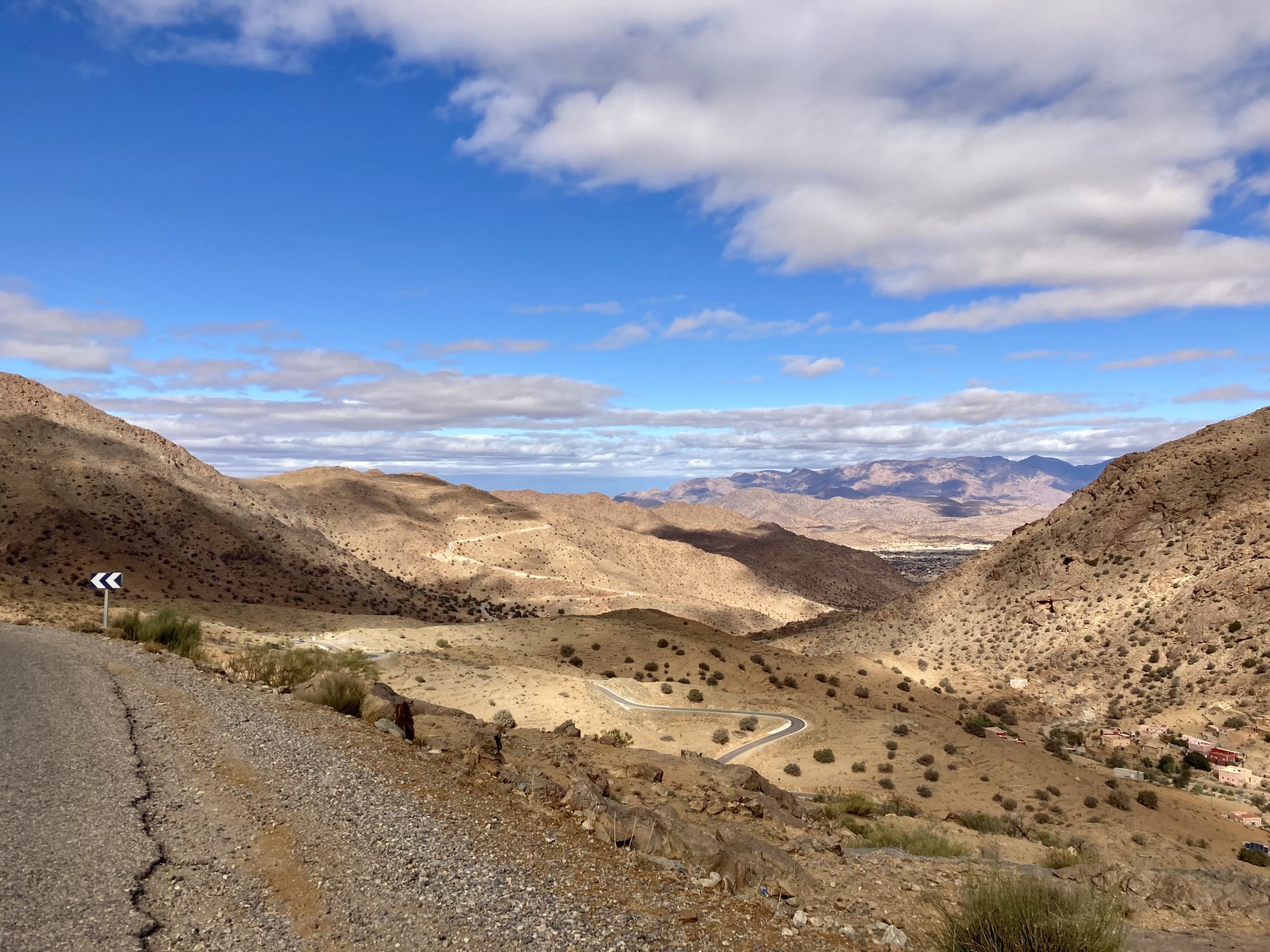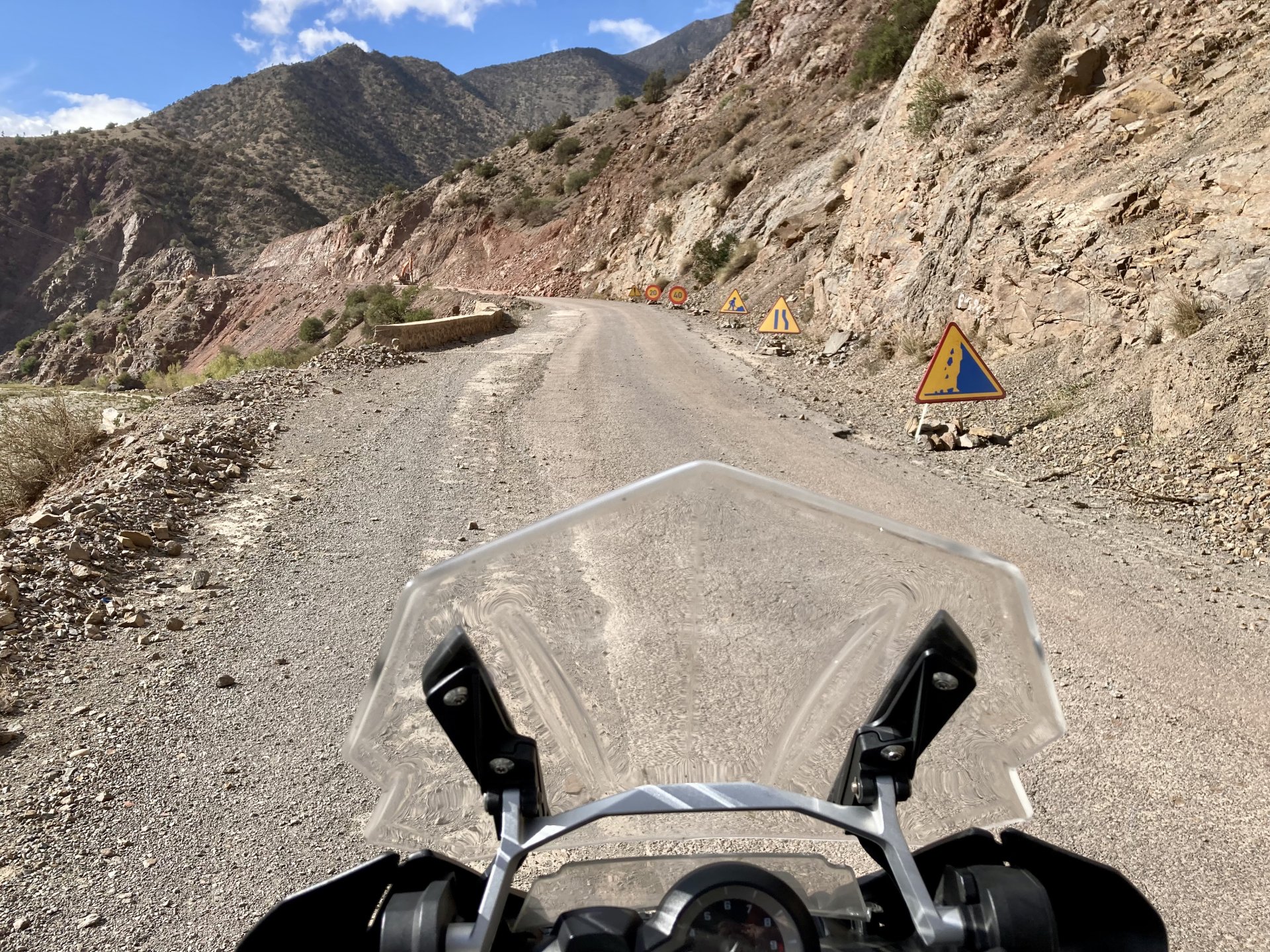 06th December, Tuesday Dawn at 08:05 from my hotel room. Breakfast my hotel was not included in the room price I paid, and I didn't feel at all captivated by it either, too international and I'm feeling like an adventure. The plan was to swiftly ride out of Marrakech and through the Atlas heading East. Roads are cool, views are cool, weather seems to be behaving, all's cool. I ride out heading to Azilal. Already out of town I am not missing breakfast, but I am missing something to start the day comfortably instead of just water, so stop by a Café Mobile. The quality of the expresso these guys put out from the back of a small van is amazing, 10 times better than the best you can get in most Europe except Portugal and Italy, and even then there might be a case for Morocco's roadside café. The guy is surprised I take pictures of his car, but I tell him that's not very common in Portugal. He quickly says that if I plan on making a Portuguese business he is available as a partner , but being no fool quickly says that in Portugal you probably need fees and permits and taxes, there you just set it up and go. At 6 net dirhams per expresso it IS pretty good business. He did follow good practices on cleaning the stuff and preparing it for the next coffee using boiling water, more so than most cafes in Portugal, I was amazed. Maybe one of these days I'll start going for the more complicated coffees like milk and foams and sugars and all that stuff, maybe after going back to Taroudant and staying in the gay hotel too Azilal is a very civilized place, if I were to go live in Morocco for good and looking for a place to properly live this could well be it. I stop to send a postcard home Tagalf, just a village full of people living a hard mountain life, all the kids smiled and laughed though Donkeys, always stop for donkeys Riding out of Azilal, a young man is hitch hiking along, not a tourist but a kid on trainers and just jeans and a sweater walking along a road, he must have been 17 or 19, I wave back and he salutes me with their gesture of waving at you and then touching their hearts, so I ride back and offer him a ride. Carried him for maybe 30 or 40km in 7 or 8ºC, he should have been freezing but always with a smile and happy to not be walking. When I left him he said he was going up to Beni Melal, maybe another 30km but going north, he had no problems thanking for the ride and I watched as he walked away decidedly down the road, hope he got a ride instead of walking through the night as it's cold there. Stopped in Aghbala, it was 15:17 when this picture was taken. Aghbala has many qualities: it's got a kick ass adventure sounding name, it's busy in a Atlas exotic sort of adventure way instead of nasty city way, smoke from coal grills and woodburning chimneys was wafting through the air, streets were paved with mud covered tarmac, people couldn't give a shit about me being there except for kids, I spotted a little snack place with a hot metal plate, so stop the bike and walk in. The lady running the place didn't speak a word of french but we got along, I managed to get my favourite sardines served inside a bread long with diced tomatoes and onions, it was pretty fucking awesome and flavoured perfectly. Just the kind of thing to pick you up. Picture does not do it justice. Also had a kind of sausage, that feels like mostly paprika inside with little meat, it was quite spicy. I've no idea what it's made of. As I was eating, there was a lady with a child in the back. The little girl completely taken with curiosity came to investigate me from a safe distance. After a few winks she finally gave me the biggest smile, I didn't catch that on a picture though. Nothing like a silly traveller to make women put on a pretty smile for a crazy foreigner Feeling comforted from both a great meal and the warming smiles, I crack on! The plan was to make it back to Imilchil, the little mountain village I had passed through a few days before, and take the lovely mountain dirt pass again, going again to Boulmane and then coming back north up the Todra Gorge. This would add at least a day to my trip but who cares, I make progress... Temperatures drop substancially, it's now about 16:30 and it's been between 6 to 8ºC for the last hour or so, then it becomes clear the more mountain passes crossing the Atlas aren't a good idea, I'll let the pictures tell you why, that white stuff is where I'm heading. I've been to Imilchil and that area in days that saw me enduring 35º before and after, and still being sort of chilly there, it didn't sound like a half pleasant idea to go past there with snow on, so that plan was discarded and I fell back on plan B, Plan B was to go near Zaida, and stay back on the same place I did before. Funny enough that's what me and Maria did in 2017, stayed there once going South and once going North. I went, and about one hour later got there. It was now getting proper cold in the area. I tried the check in and nobody was there, the restaurant and you could go in and rob the place, nobody around, tried to see if the room I wanted was open and it wasn't, then tried everything again and found the TV room, everyone was watching the first half of the Morocco vs Spain match. I got my key and we left formalities for later, quickly had a hot shower and made it there to watch the end of the match. Morocco won on penalties, their goalkeeper "Bono" was gigantic and eliminated Spain. Most people lost their shit, the single one guy in front of the tv not jumping? He's a Spaniard: Now, Moroccans are insane about football, they will now way more about the portuguese league than I ever will, they'll know players names from the first 15 teams in Portugal, and that knowledge extends to Spain, France, Germany, England and Italy, it's amazing. They will watch most things with true enthusiasm, and that day Portugal was to play agains Switzerland. My new friend Mamoud proclaimed he would watch the match with me, so 