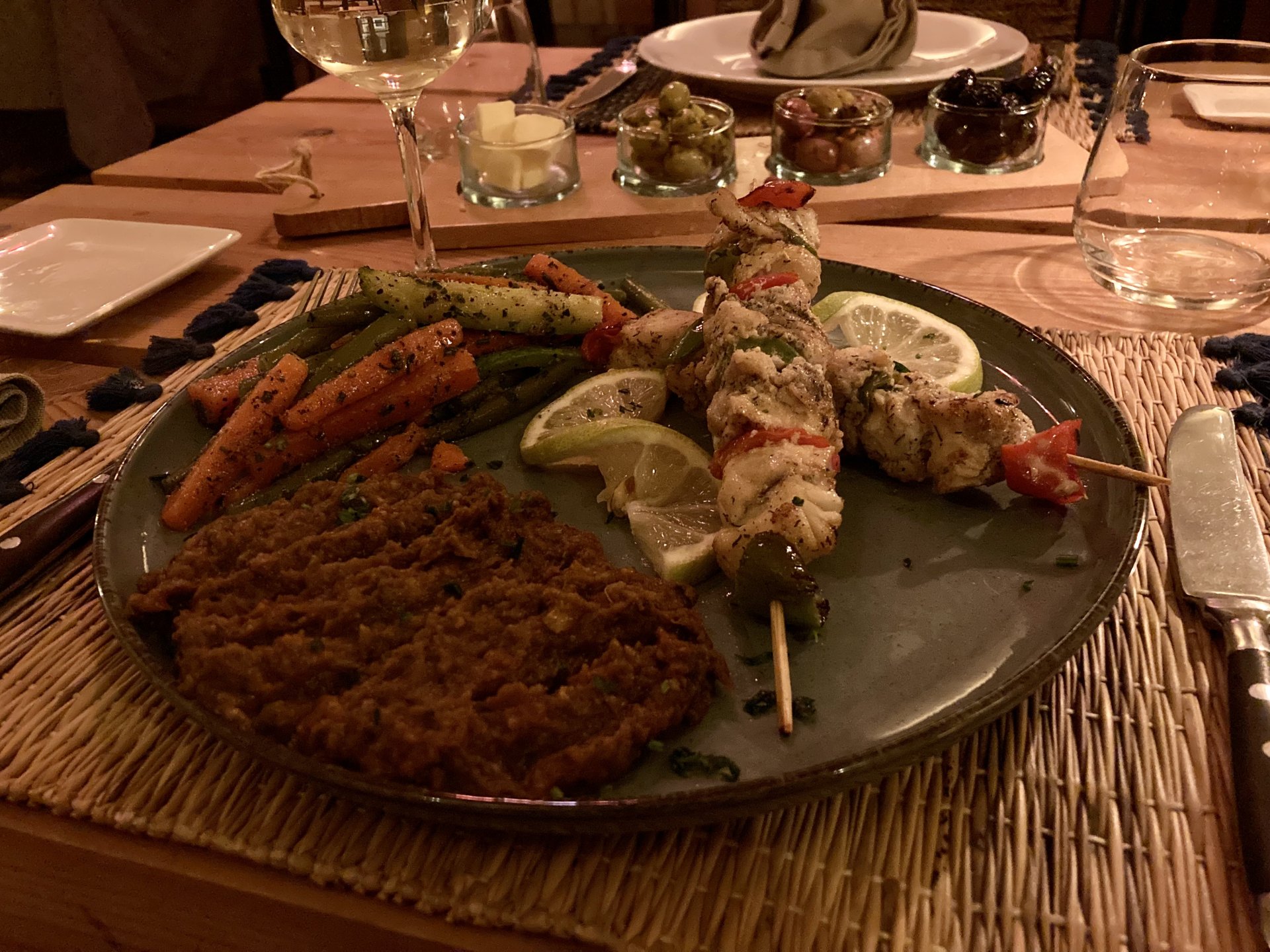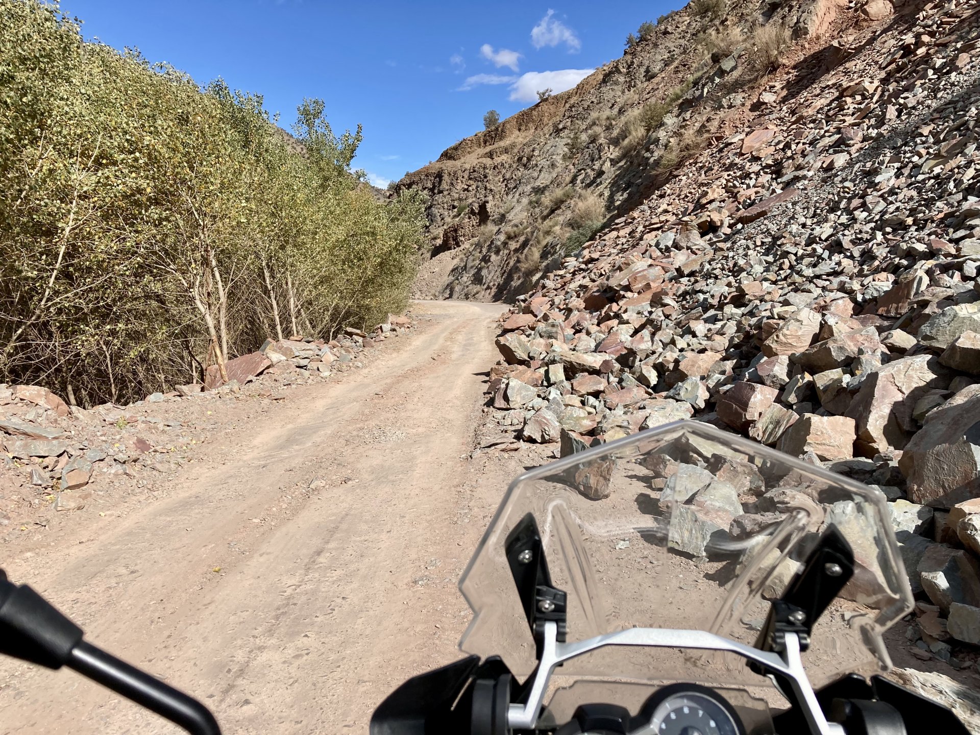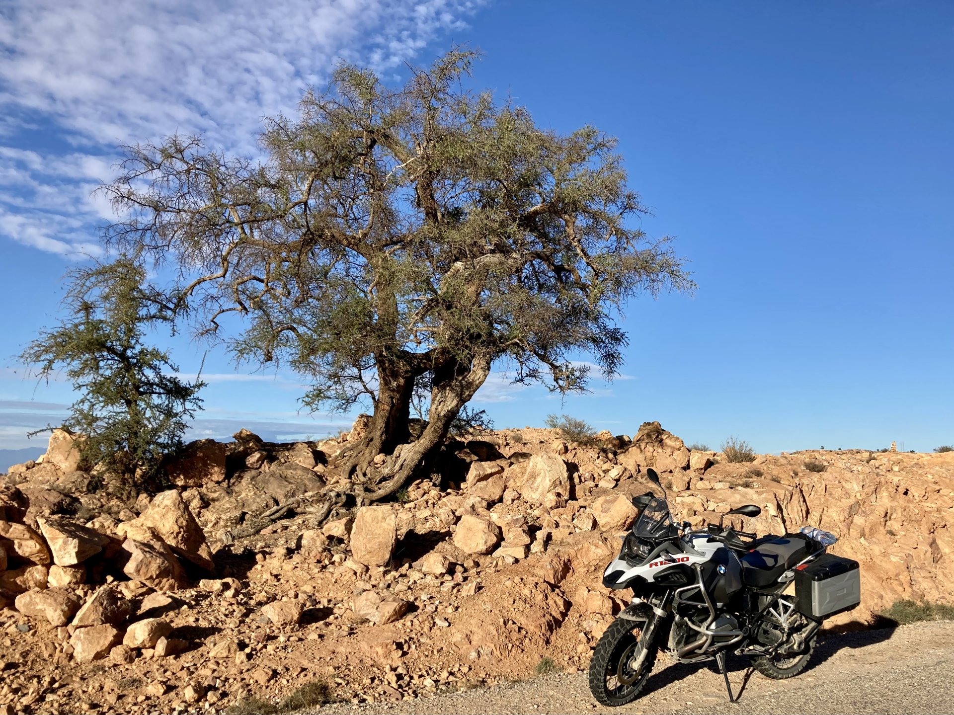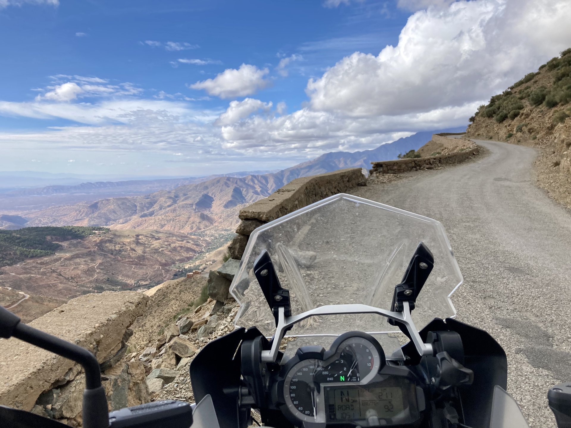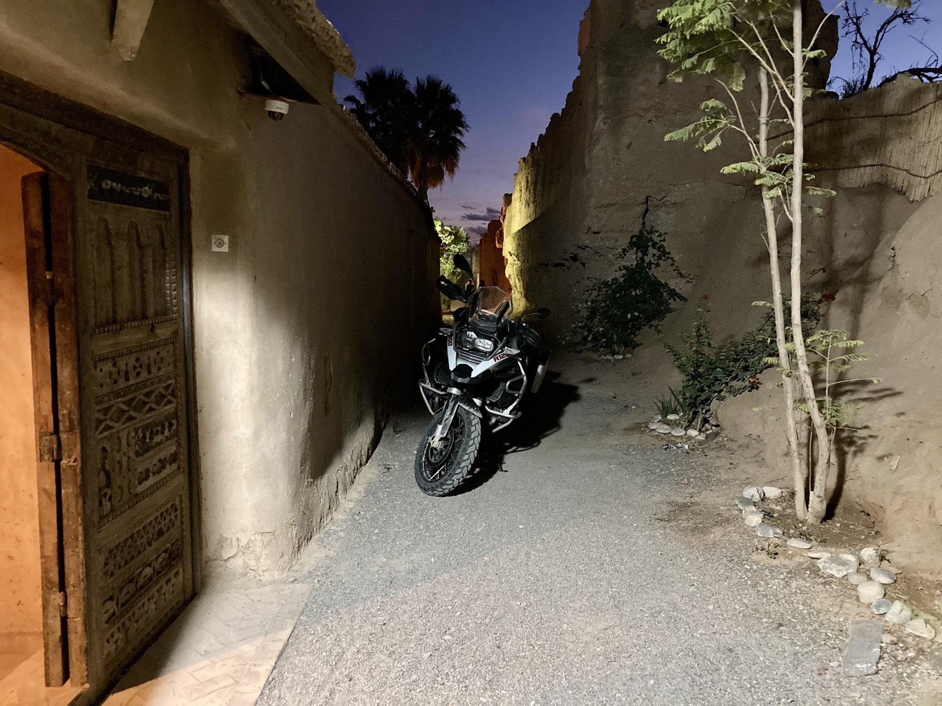 04th December, Sunday Wake up at my own pace after a night well slept. This traveling all day does provide for good sleep, and I can definitely feel that compared to when at home. I am also in love with the feeling of packing stuff to the bike, which takes 5 seconds with BMW's Vario cases, then have something to eat and some hot beverage, and then ride off like you're a pro. Makes me feel like a movie star The plan is to ride back east for a bit all the way to Four El Hism on the R102, then turn the bike North and use that canyon to climb over the mountains over to Argan territory, stop at a small town that sells some Argan based products, and then go in the direction of Marrakech past the most Star Wars sounding city name ever, Taroudant, and the Tizi N'Test mountain pass, all good stuff to look forward to on the start of the journey north, I certainly wouldn't be reaching Marrakech's chaos today, though, and was unsure where to stop. Ahead of me, I knew I had some of the best mountain roads over the following three days. Morning cold and saying hello to donkeys when stopping to put on my warm gloves. Reach the palm trees of Tamarnt and head north on a gorge road, the R107 starts down on the desert, enters into the mountains via a gorge, climbs on the end of it and goes to Tafraout: Arriving in Tafraout at almost 14:00, I shop around to buy a little bit of pure Argan oil, and have some amazing chicken for lunch And at 15:00 get back on the road north, heading to Taroudant! This was to be an amazing bit of the trip, Argan trees grow very slowly so most of the ones I see over these mountains are really old, it's a great experience. Over near the other side of that valley there is Taroudant, it was now about 17:30 so I was going to get there at around sunset time. Traveling here took forever, the roads are amazing and worthy of more time, the distances aren't even that great but I kept stopping to look at trees and pick a few argan seeds to take home. Temperature was climbing as I approached the valley in front too, which felt great after the morning's cold. Beyond the valley, you get the first glimpse of the Atlas too, it's always an impressive landmark to approach. Taroudant is a walled city, like a smaller less chaotic Marrakech. It's got a cool vibe to it, I stopped once for tea in the middle of the day and liked how it felt, back then it was quite a hot day though, and I was happy to sprint for the mountains, today it felt warm as I arrived which was good, the next day I knew I was going to be cold at 2000 meters. Being a walled city, it's got a few doors around it, but makes navigation hard, I searched on google maps for a hotel and found somewhere on the outskirts, it was now getting dark and I felt tired, so went for it, what happened next was a bit surreal. I showed up at the place and it was a riad sort of thing with a walled in garden like what is normal on the outskirts of town, it looked alright but had disco music blaring. I park the bike inside the closed gates, and there's a weird ambience going on. Walk into reception and the guy tells me they had a 700 dirham room for me, I laugh at him and tell him they've got some at 500 in booking, and he tells me to sit down and talk. Now, this dude sits down next to me and very quietly, and gaily, tells me to consider a special price of 400 dirhams with breakfast included, and that I should let him show me the room. It doesn't sound good, I get a weird feeling again and tell him no deal, and I prepare to leave, he then insists and tells me that for 400 dirhams I get the room, breakfast, dinner, and that he would really be happy if I were with him so he could show the room to me, and doing that he simply lays his hand gently on my leg. I then realize what sort of place that is, why I had a weird feeling when saluting the guys sitting on the garden, how weird and out of place the Ibiza type music sounded, and what really came with that room, so quite quickly told him I'd stay nearer to the city center, and left. I then find another place inside the city walls, it's pricier but seems really very nice and less chance of sex with other men. After getting a little lost I did find the location, and was delighted to ride a little bit of a weird access street lodged between the city walls and the hotel entrance itself. This hotel, the Moulin de Taroudant, (can't say Taroudant without picturing Jedis and light sabers!) was an old water mill now refurbished by a french guy, they had nice comfy beds, rooms with no offers of sex, and a very relaxing restaurant where I had a pretty gourmet fish skewer and aubergine pure, it was good. After a nice shower to wash the road off me, I was delighted to have a glass of Moroccan white wine outside, and then eat by the fireplace, where I met a nice older couple of Scots, and staid late drinking red wine with them. Charlie and his kind wife (with a very weird name that I can't for the life of me remember) were great company. I slept well, having had a bottle and a half of pretty average red wine I felt ready for bed. The next day? Mountain roads surely await, and adventure