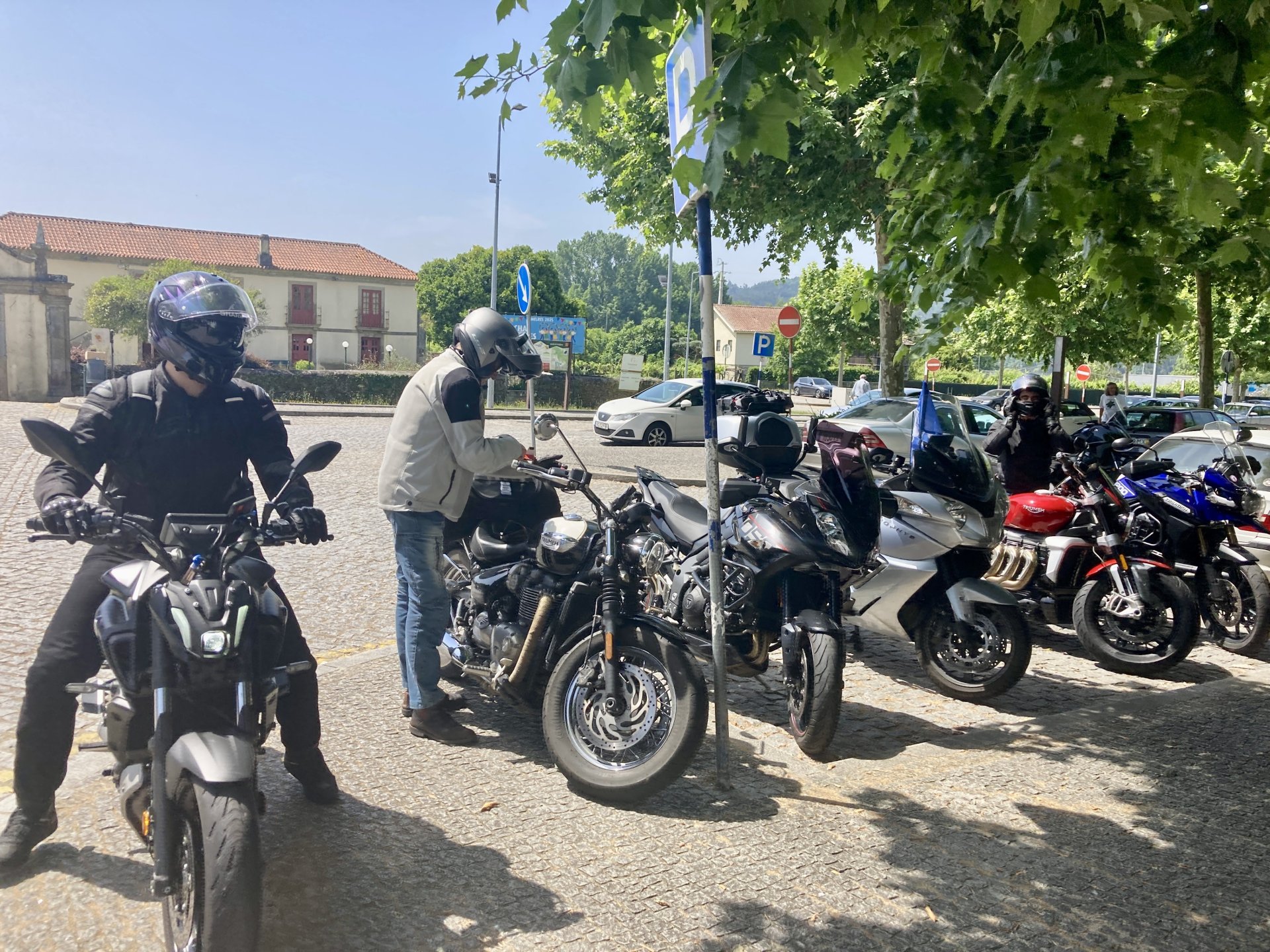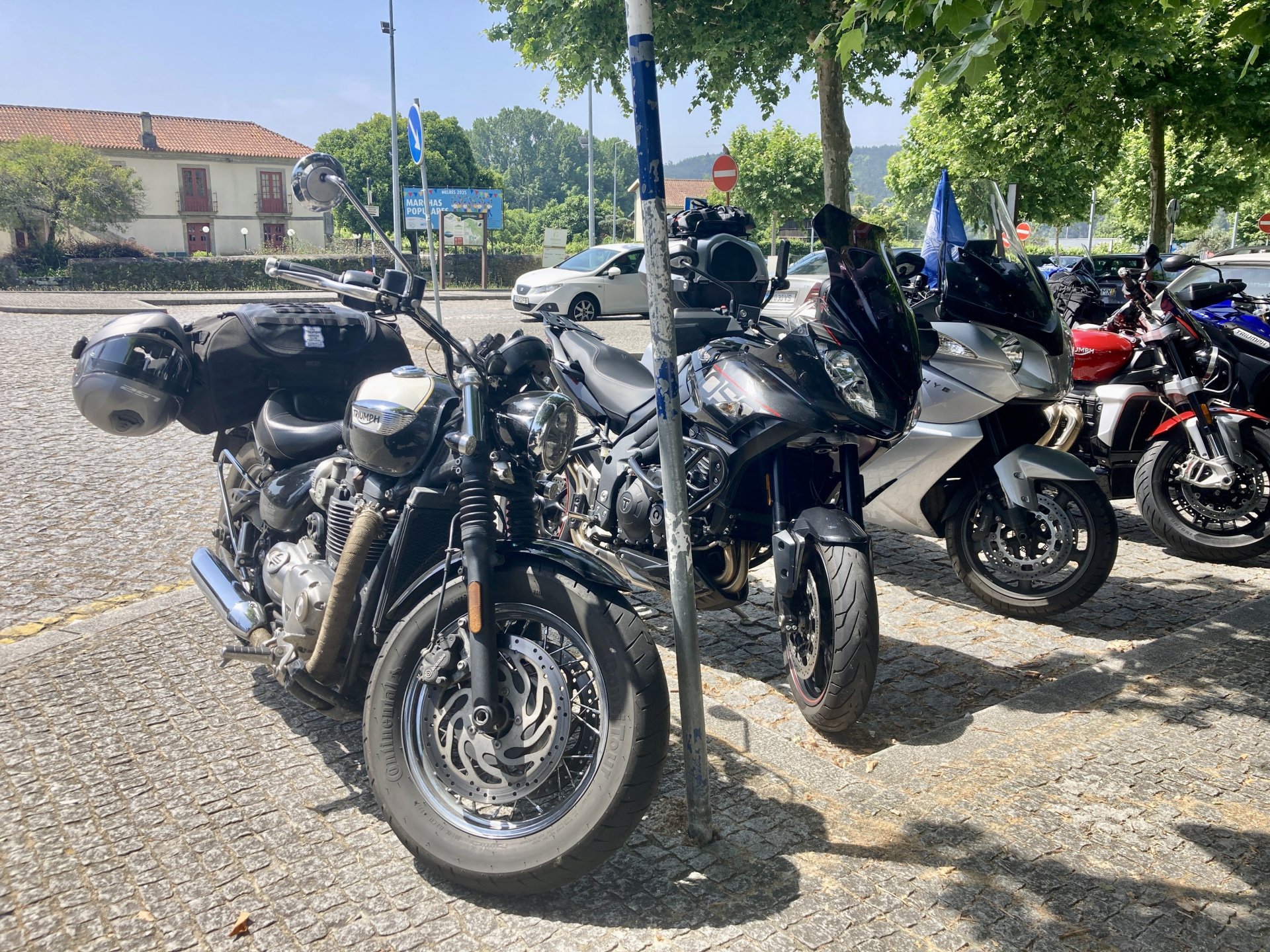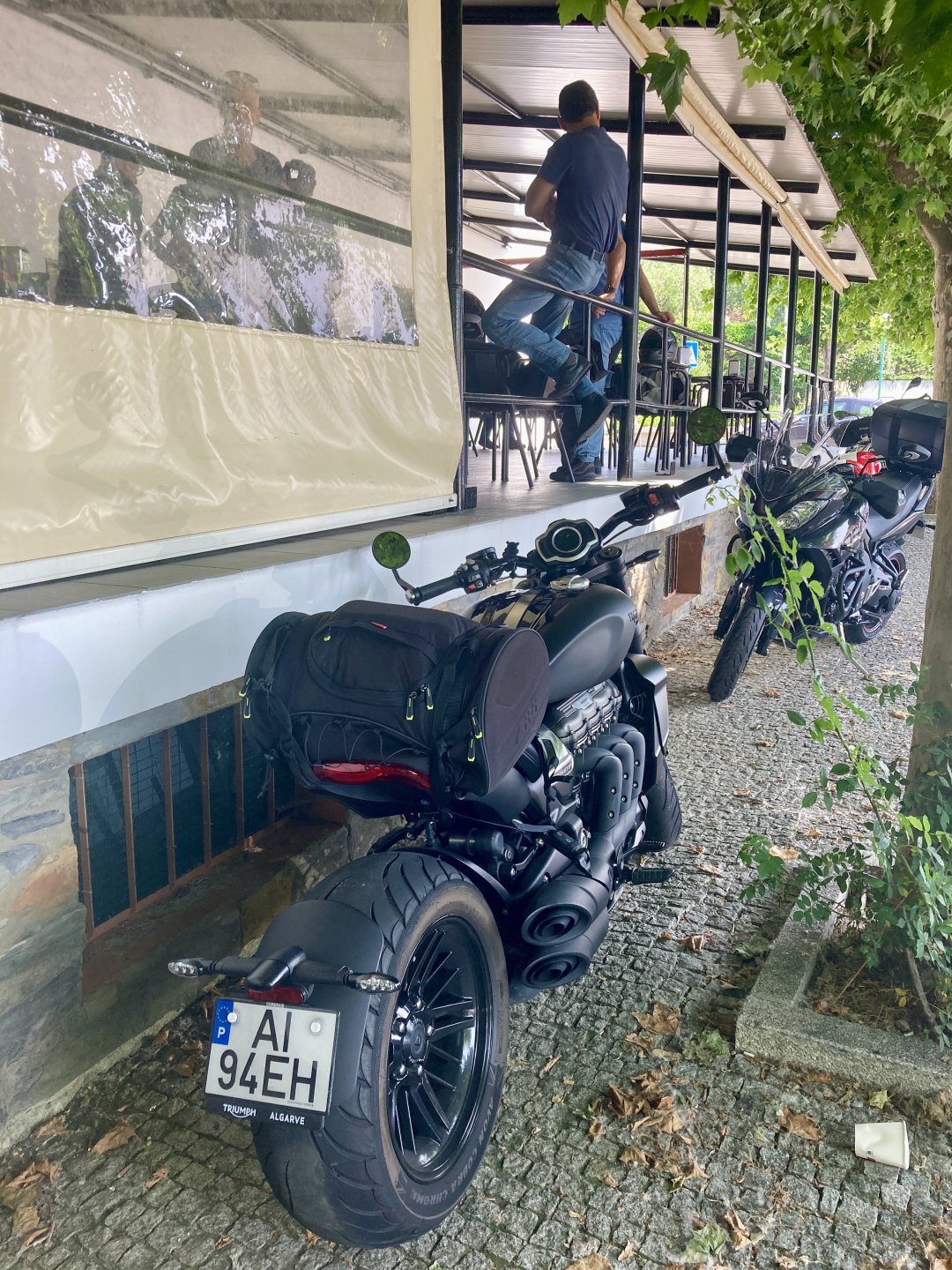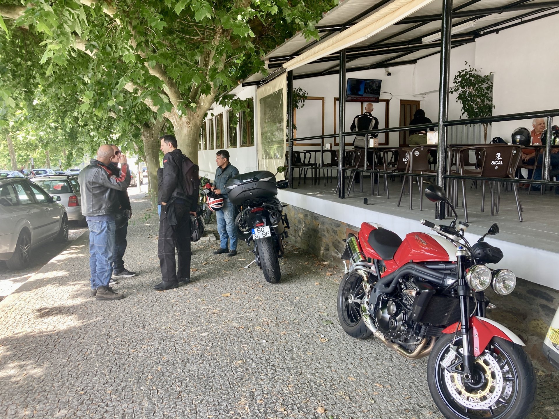 3. This is from a few weeks ago, I helped Sofia and her friends with guiding a meeting of the Triumph Moto Clube Portugal in the Douro. She is now president of the club and this would be her first meeting as such. There were a few people coming from different locations, and we'd ride up the Douro valley, stop for lunch and then ride to the hotel for Gins, swimming pool, and dinner. I waited under some shade, as it was about to be a really hot day. First one arriving: Then Sofia arriving with a few bikes from Lisbon, already 300/350km into the day for them: Most people have known each other for a while now, but I only knew a couple. Arriving from Viseu, Agostinho on a very pretty Rocket and João from the Algarve with a Speedmaster. Not everyone rode in on a Triumph though, it's a welcoming club. They would in fact be chasing my GS for the whole day and next morning Off we went and onto the restaurant for lunch. I am not used to guiding big groups, and the twisty roads with multiple chances for the group to be split and lost made it slower than I'd like, but we got there. João, who organized the trip was riding a Kove since his Triumph had fallen off a hill and still not fixed, and the Kove had a bright yellow headlight, which came in handy as he was closing the group and was very easy to spot in the distance. Even more people were joining us at the lunch stop, and I think in total it must have been 12 or 13 bikes. Here we are, before all bikes were together: https://youtube.com/shorts/-JwFELXx4Kw?si=doJFL1wjJ7N9cJQq Lunch stop, very scenic but the 36º made it hot out in the open balcony. Rideout after lunch was tricky, very hot and the group took forever to start moving. Eventually we made it to the hotel and I retired to the coolness of the AC in my room to recover a little from the pollen allergies that were driving me insane. Later, gin tonics by the swimming pool got the mood going, and dinner was enjoyed: After dinner it was still warm, made the gins flow easier and people were happy. Snooker started as serious but that didn't last for long In the morning, I packed up and while people were dragging themselves around I rode up to Armamar in Sofia's bike to fuel it up. Sunday morning in a rural town, and the dogs were coming to town There was posing for group pictures and all the Triumphs lined up, spirits were high. We rode out and within 30 minutes stopped for the morning espresso One of the Speed Triples suffered a broken alternator and had to be towed home, this meant the group was broken and while some went on to do some sightseeing a few of us stuck around waiting for the truck before meeting them later for lunch. Late sunday morning, it took a while to arrive but once there it was all very efficient. All but one bike in front of our lunch stop. Food was great, good laughs were had but I have no pictures of that. Eventually we said our goodbyes and we all headed home to different locations around the country, Sofia was very happy: 2 or 3 hours later, via country roads pestered with sunday afternoon traffic, we stopped for a cold water at the cafe we met the previous day: A good weekend was had, not much in the way of riding motorcycles but a lot of laughs and hanging around and socializing. Made a few friends, which was the highlight of the meet.
