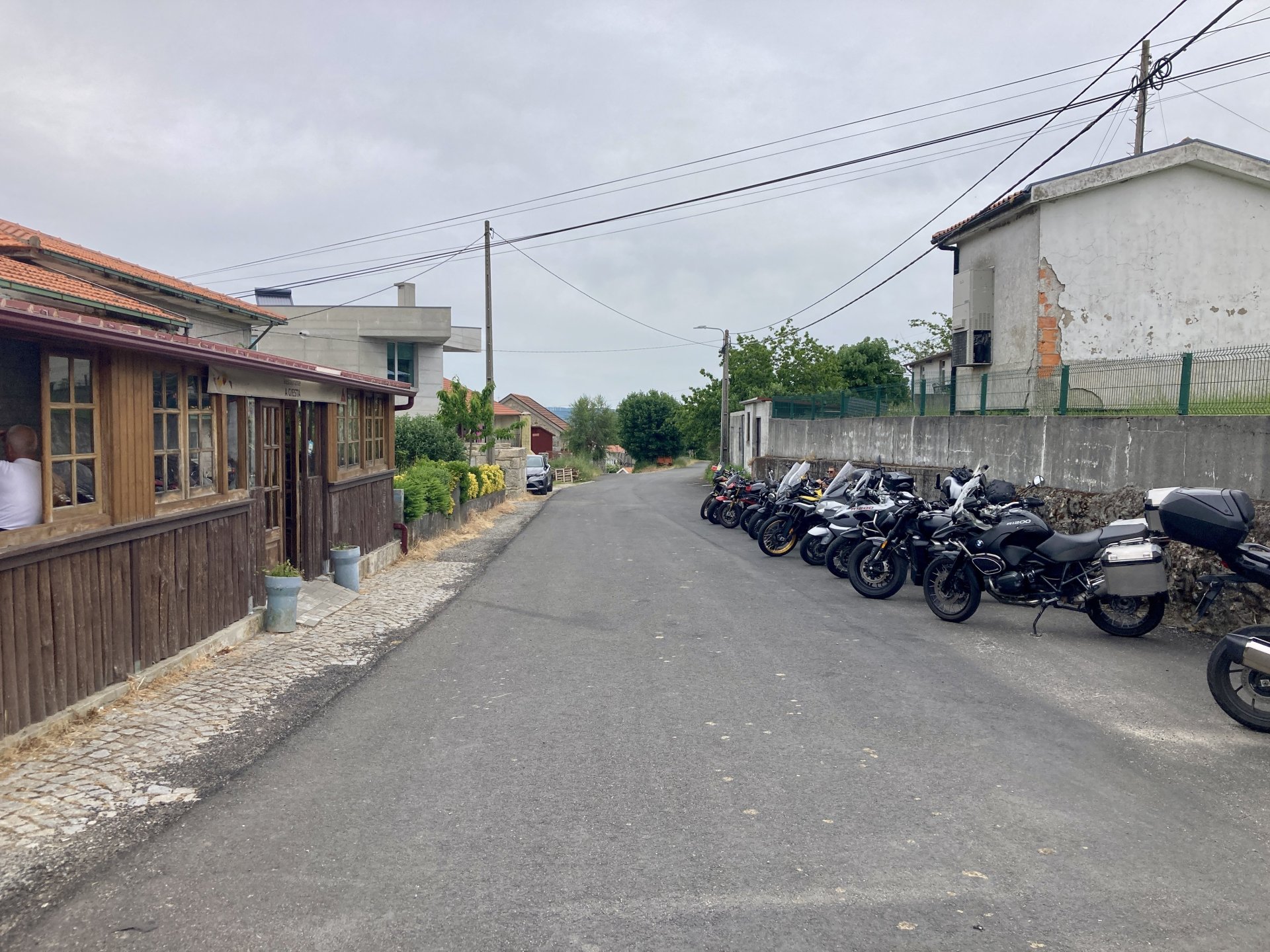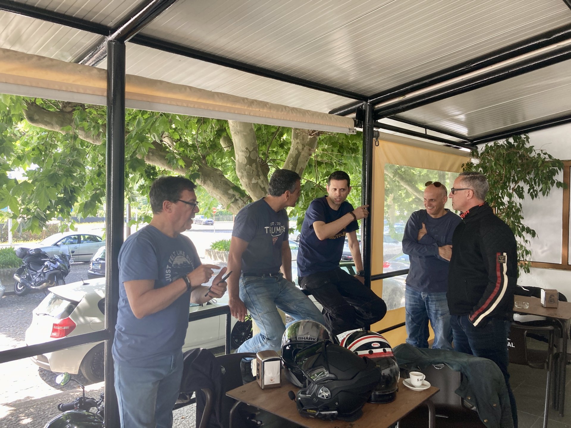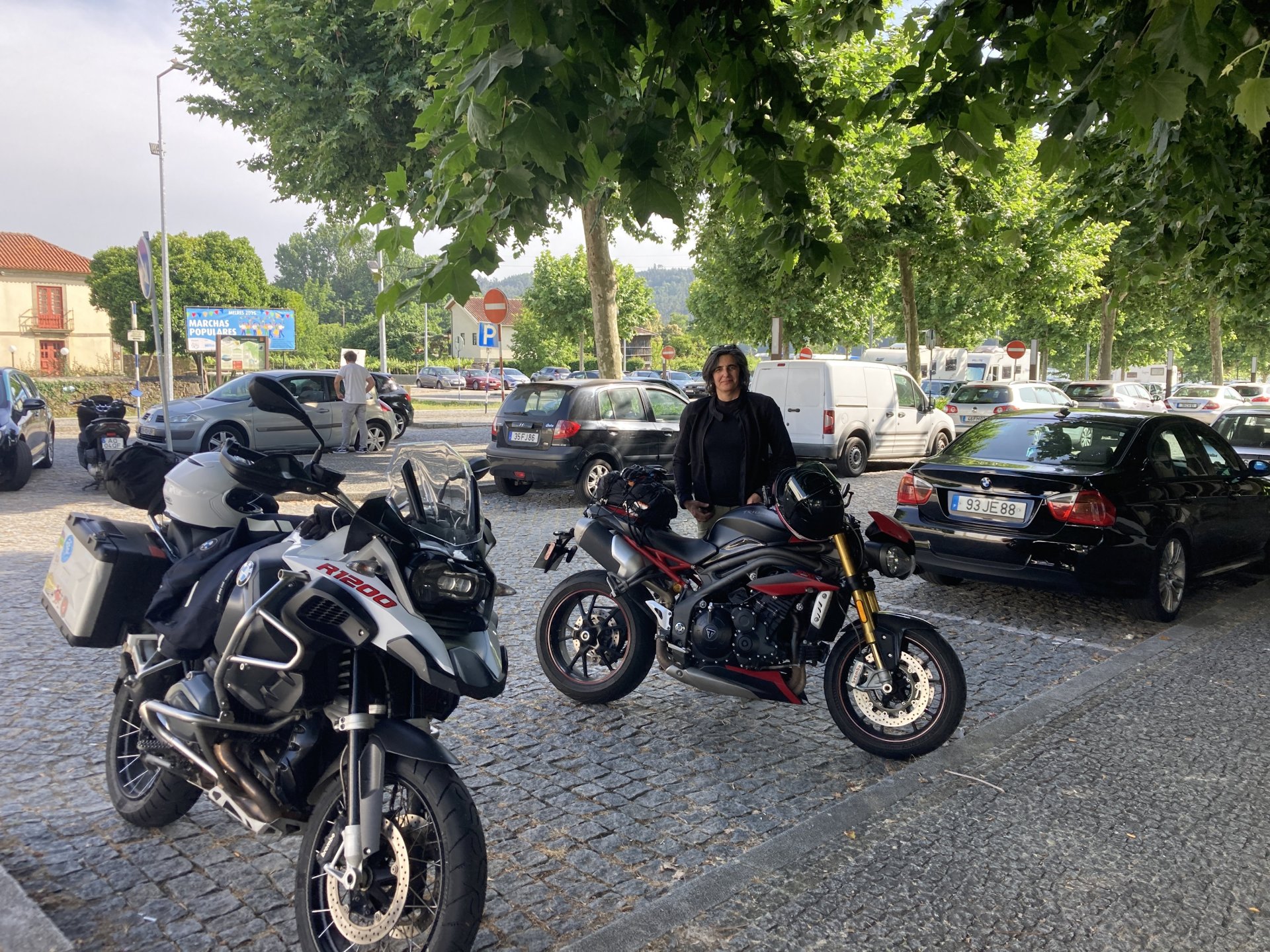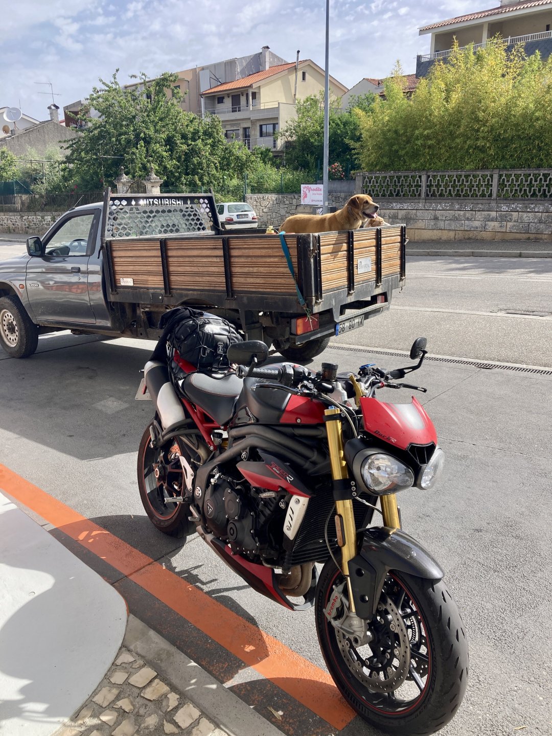 3. This is from a few weeks ago, I helped Sofia and her friends with guiding a meeting of the Triumph Moto Clube Portugal in the Douro. She is now president of the club and this would be her first meeting as such. There were a few people coming from different locations, and we'd ride up the Douro valley, stop for lunch and then ride to the hotel for Gins, swimming pool, and dinner. I waited under some shade, as it was about to be a really hot day. First one arriving: Then Sofia arriving with a few bikes from Lisbon, already 300/350km into the day for them: Most people have known each other for a while now, but I only knew a couple. Arriving from Viseu, Agostinho on a very pretty Rocket and João from the Algarve with a Speedmaster. Not everyone rode in on a Triumph though, it's a welcoming club. They would in fact be chasing my GS for the whole day and next morning Off we went and onto the restaurant for lunch. I am not used to guiding big groups, and the twisty roads with multiple chances for the group to be split and lost made it slower than I'd like, but we got there. João, who organized the trip was riding a Kove since his Triumph had fallen off a hill and still not fixed, and the Kove had a bright yellow headlight, which came in handy as he was closing the group and was very easy to spot in the distance. Even more people were joining us at the lunch stop, and I think in total it must have been 12 or 13 bikes. Here we are, before all bikes were together: https://youtube.com/shorts/-JwFELXx4Kw?si=doJFL1wjJ7N9cJQq Lunch stop, very scenic but the 36º made it hot out in the open balcony. Rideout after lunch was tricky, very hot and the group took forever to start moving. Eventually we made it to the hotel and I retired to the coolness of the AC in my room to recover a little from the pollen allergies that were driving me insane. Later, gin tonics by the swimming pool got the mood going, and dinner was enjoyed: After dinner it was still warm, made the gins flow easier and people were happy. Snooker started as serious but that didn't last for long In the morning, I packed up and while people were dragging themselves around I rode up to Armamar in Sofia's bike to fuel it up. Sunday morning in a rural town, and the dogs were coming to town There was posing for group pictures and all the Triumphs lined up, spirits were high. We rode out and within 30 minutes stopped for the morning espresso One of the Speed Triples suffered a broken alternator and had to be towed home, this meant the group was broken and while some went on to do some sightseeing a few of us stuck around waiting for the truck before meeting them later for lunch. Late sunday morning, it took a while to arrive but once there it was all very efficient. All but one bike in front of our lunch stop. Food was great, good laughs were had but I have no pictures of that. Eventually we said our goodbyes and we all headed home to different locations around the country, Sofia was very happy: 2 or 3 hours later, via country roads pestered with sunday afternoon traffic, we stopped for a cold water at the cafe we met the previous day: A good weekend was had, not much in the way of riding motorcycles but a lot of laughs and hanging around and socializing. Made a few friends, which was the highlight of the meet.