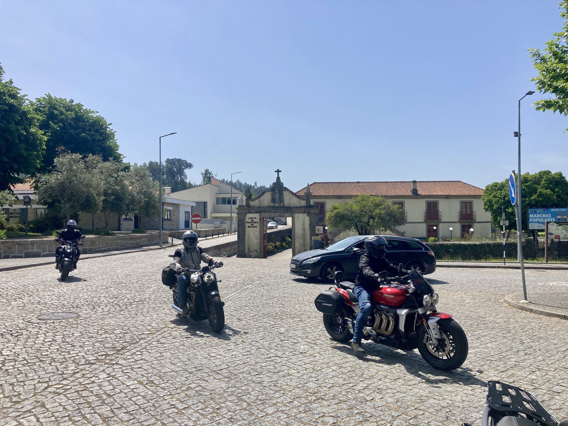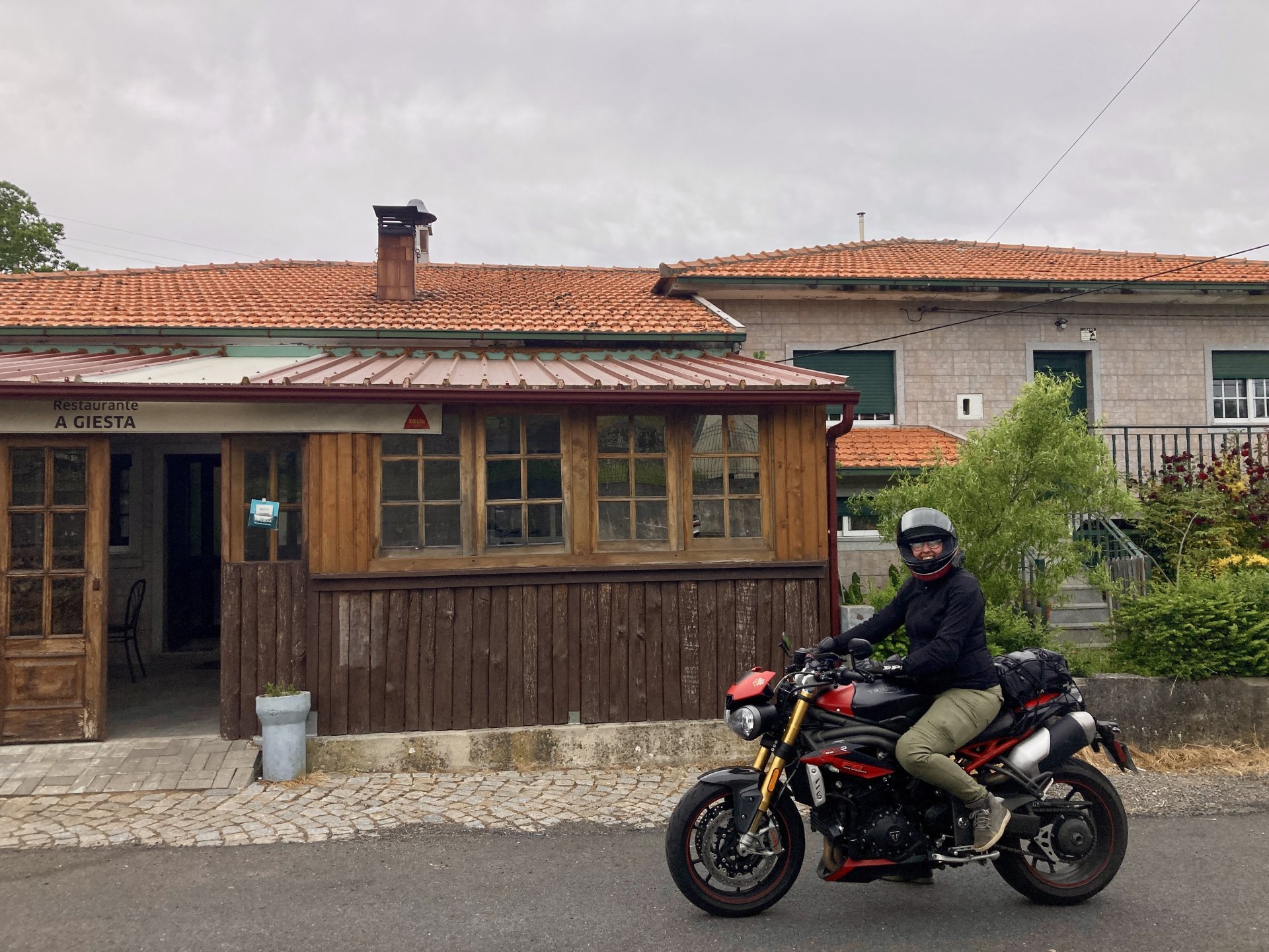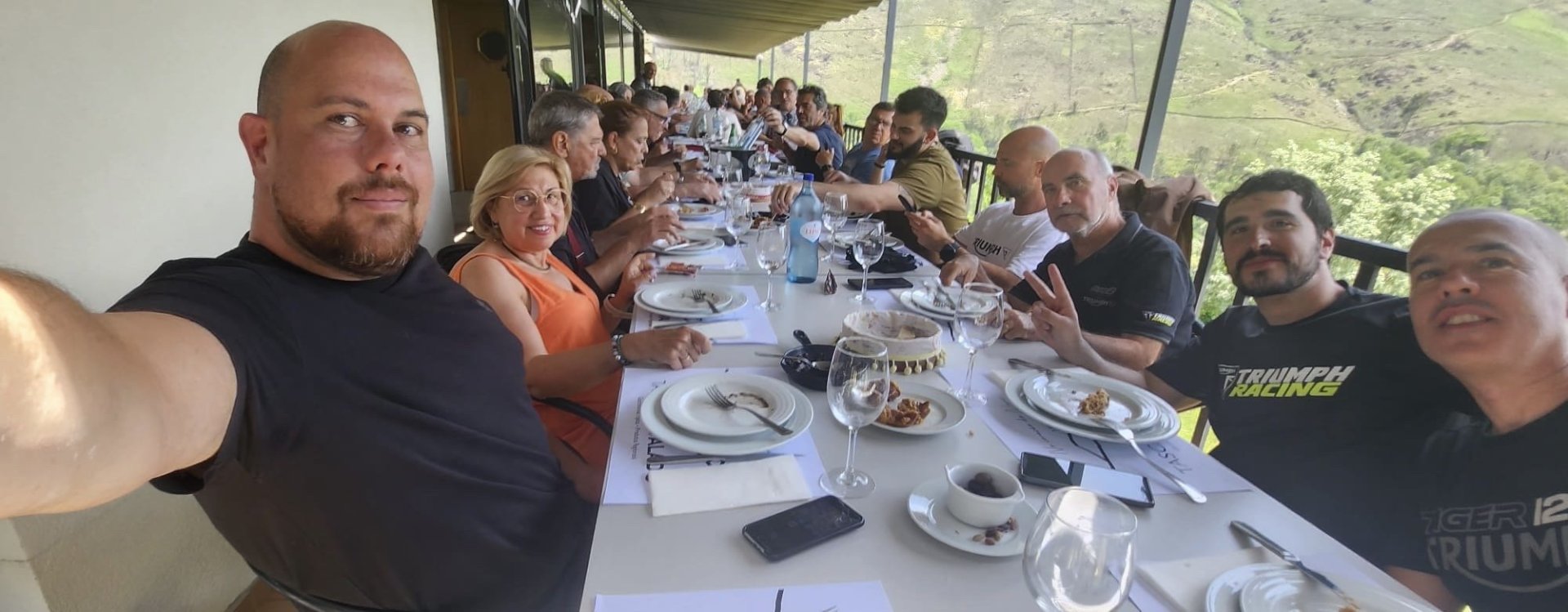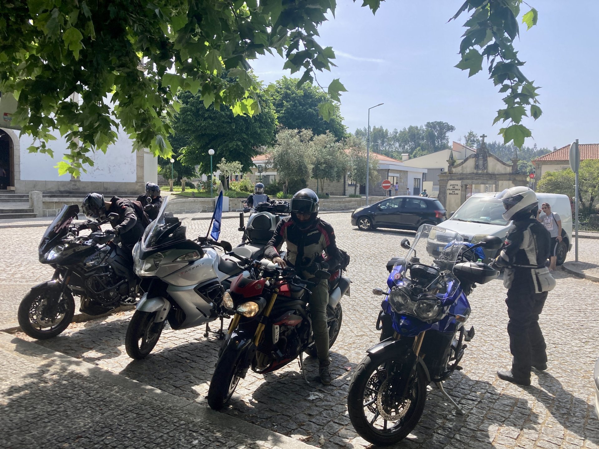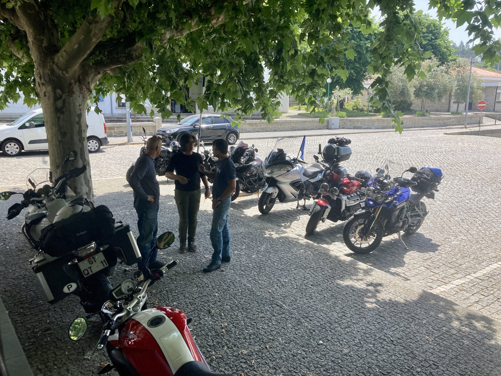 3. This is from a few weeks ago, I helped Sofia and her friends with guiding a meeting of the Triumph Moto Clube Portugal in the Douro. She is now president of the club and this would be her first meeting as such. There were a few people coming from different locations, and we'd ride up the Douro valley, stop for lunch and then ride to the hotel for Gins, swimming pool, and dinner. I waited under some shade, as it was about to be a really hot day. First one arriving: Then Sofia arriving with a few bikes from Lisbon, already 300/350km into the day for them: Most people have known each other for a while now, but I only knew a couple. Arriving from Viseu, Agostinho on a very pretty Rocket and João from the Algarve with a Speedmaster. Not everyone rode in on a Triumph though, it's a welcoming club. They would in fact be chasing my GS for the whole day and next morning Off we went and onto the restaurant for lunch. I am not used to guiding big groups, and the twisty roads with multiple chances for the group to be split and lost made it slower than I'd like, but we got there. João, who organized the trip was riding a Kove since his Triumph had fallen off a hill and still not fixed, and the Kove had a bright yellow headlight, which came in handy as he was closing the group and was very easy to spot in the distance. Even more people were joining us at the lunch stop, and I think in total it must have been 12 or 13 bikes. Here we are, before all bikes were together: https://youtube.com/shorts/-JwFELXx4Kw?si=doJFL1wjJ7N9cJQq Lunch stop, very scenic but the 36º made it hot out in the open balcony. Rideout after lunch was tricky, very hot and the group took forever to start moving. Eventually we made it to the hotel and I retired to the coolness of the AC in my room to recover a little from the pollen allergies that were driving me insane. Later, gin tonics by the swimming pool got the mood going, and dinner was enjoyed: After dinner it was still warm, made the gins flow easier and people were happy. Snooker started as serious but that didn't last for long In the morning, I packed up and while people were dragging themselves around I rode up to Armamar in Sofia's bike to fuel it up. Sunday morning in a rural town, and the dogs were coming to town There was posing for group pictures and all the Triumphs lined up, spirits were high. We rode out and within 30 minutes stopped for the morning espresso One of the Speed Triples suffered a broken alternator and had to be towed home, this meant the group was broken and while some went on to do some sightseeing a few of us stuck around waiting for the truck before meeting them later for lunch. Late sunday morning, it took a while to arrive but once there it was all very efficient. All but one bike in front of our lunch stop. Food was great, good laughs were had but I have no pictures of that. Eventually we said our goodbyes and we all headed home to different locations around the country, Sofia was very happy: 2 or 3 hours later, via country roads pestered with sunday afternoon traffic, we stopped for a cold water at the cafe we met the previous day: A good weekend was had, not much in the way of riding motorcycles but a lot of laughs and hanging around and socializing. Made a few friends, which was the highlight of the meet.
