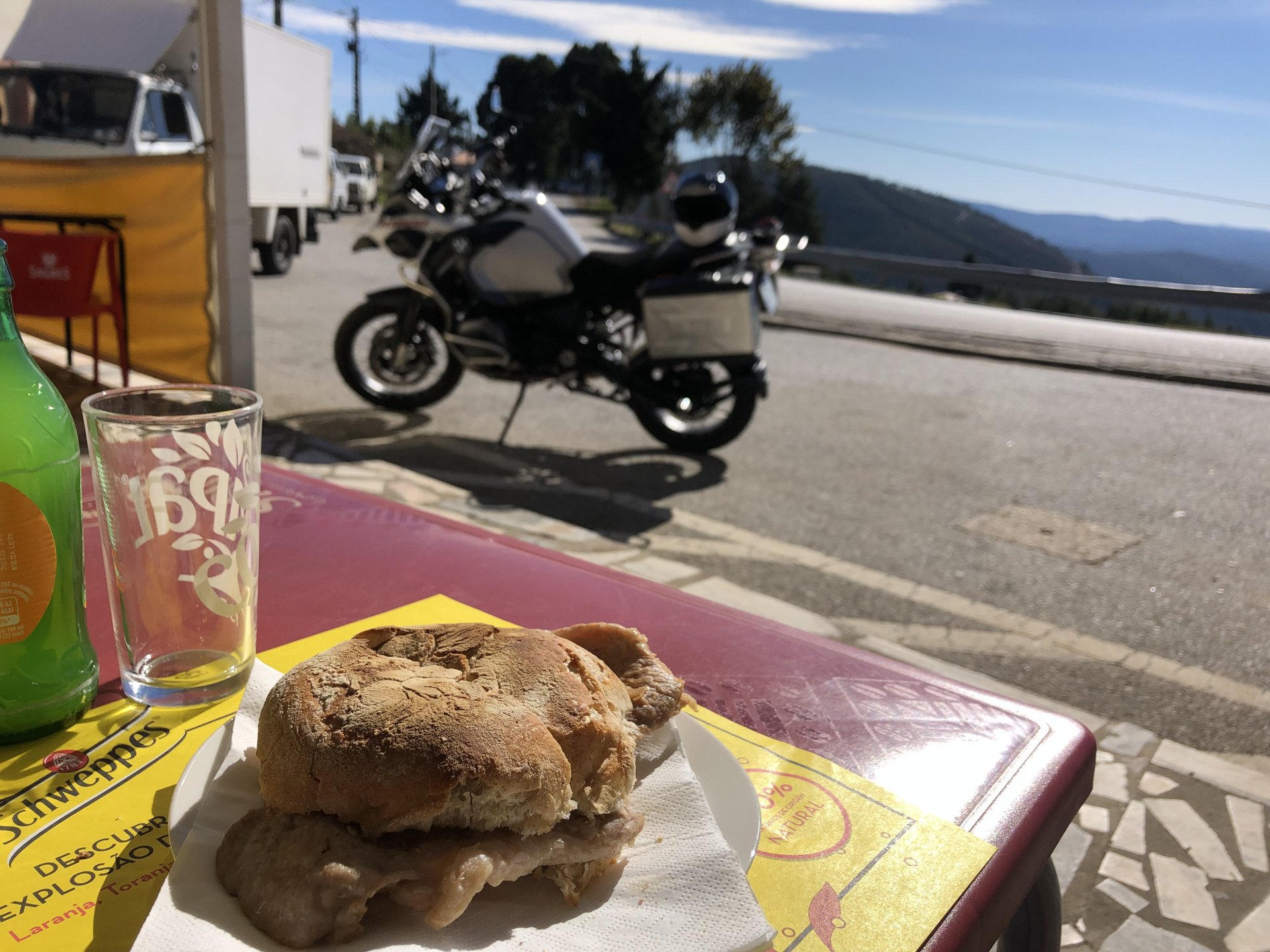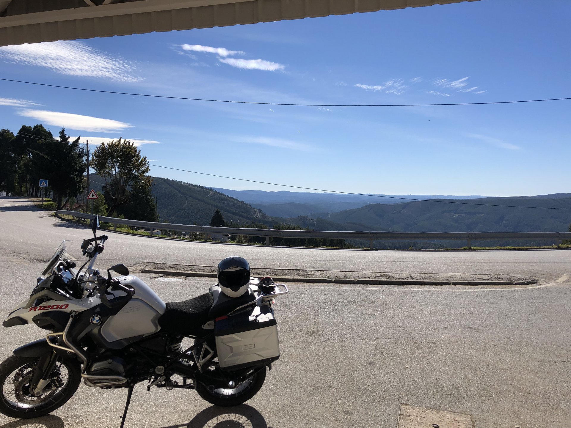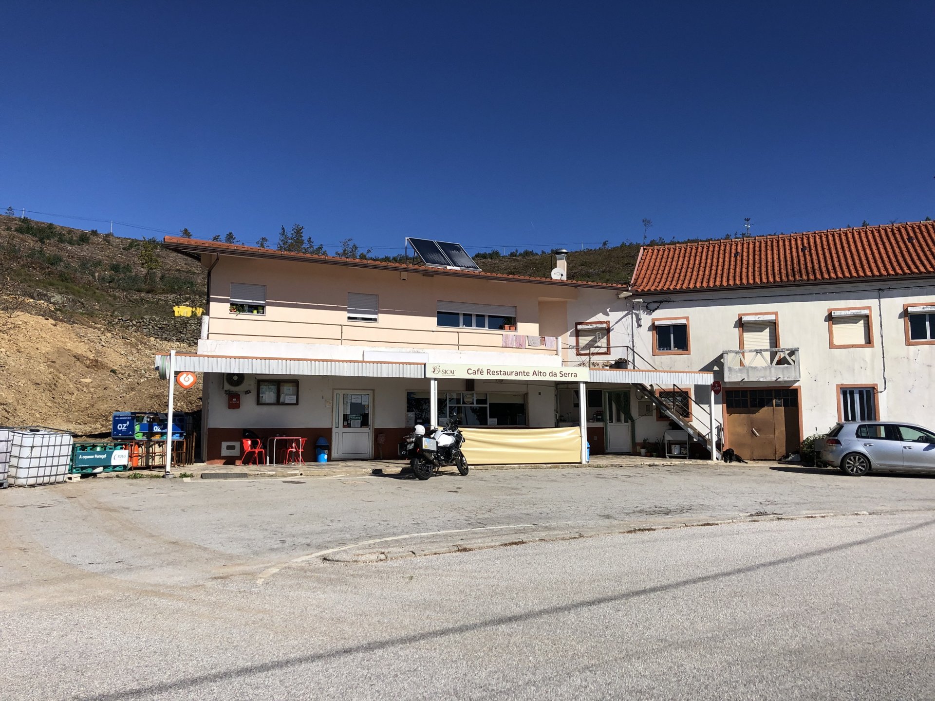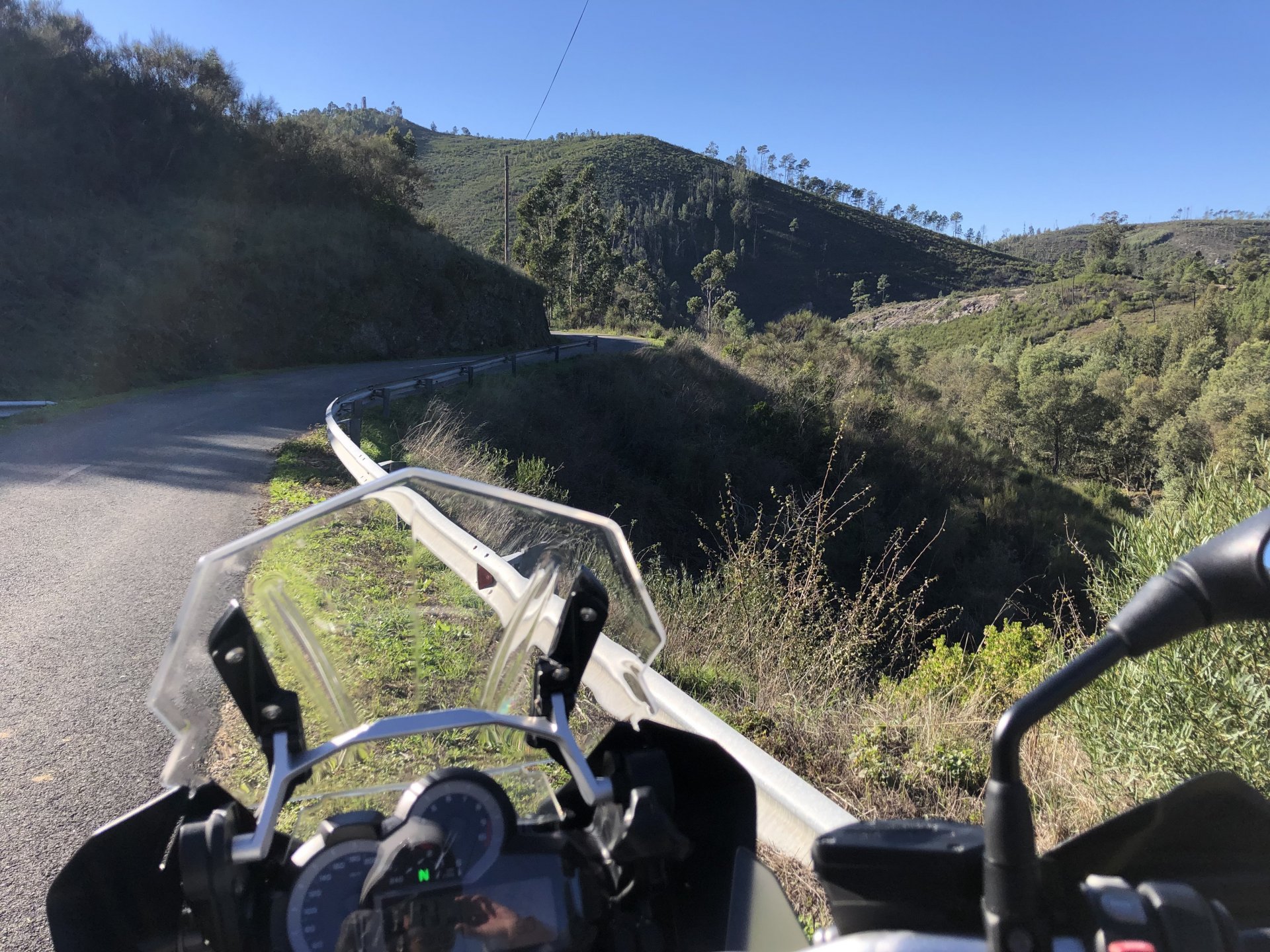 Went out for a drink to Porto, haven't done that in ages on a saturday night but a friend was staying overnight there while bringing his new car from Germany to Lisbon and me and my brother had to look at the amazing new set of wheels. This turned into a later night than I was expecting so it was a struggle to leave the house by 9:30 or 10, I was set on taking the long scenic route to my home instead of the motorway, and I did. A short 30 or 40 minutes on the motorway to get going and then off in search of twisty roads. I took few pictures at first, it was too cold for me to feel like stopping and taking the warm gloves off and go for the phone which was inside my jacket. First stop was for lunch at a small rural cafe on the N2, Portugal's longest road A bowl of hot vegetable soup to warm up, it hit the spot before a pork sandwich Two other customers showed up for a taste of my sandwich Not a bad view, the whole time I was there I think only two bikes passed, and two cars both arriving to the cafe, very quiet for a sunny sunday. I think both the MotoGP and the cold morning stopped people from getting out. Better for me! A while later, a brief stop for a picture stopped over a dam Later still, stopped by Portugal's geodetic center, in Vila D'El Rei On some of the smaller parts of the N2, stopped for a short walk on the Penedo Furado viewpoint. I was going south and it warmed up a little in the afternoon, suddenly no more cold. Back on the road And no more pictures, sun was starting to go down so pressed on home, perfect winter weather today!