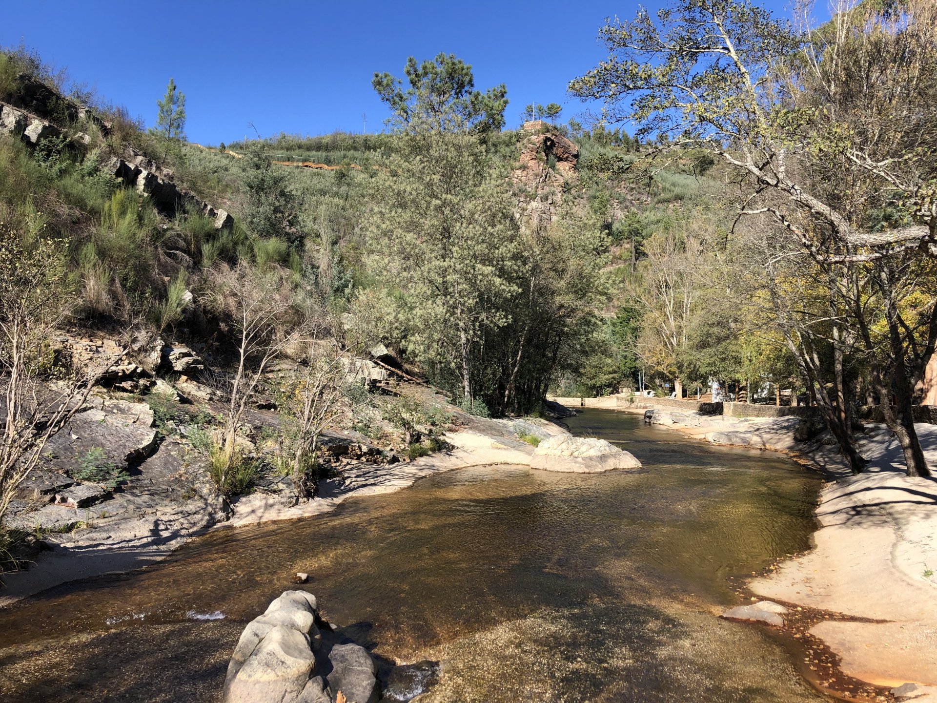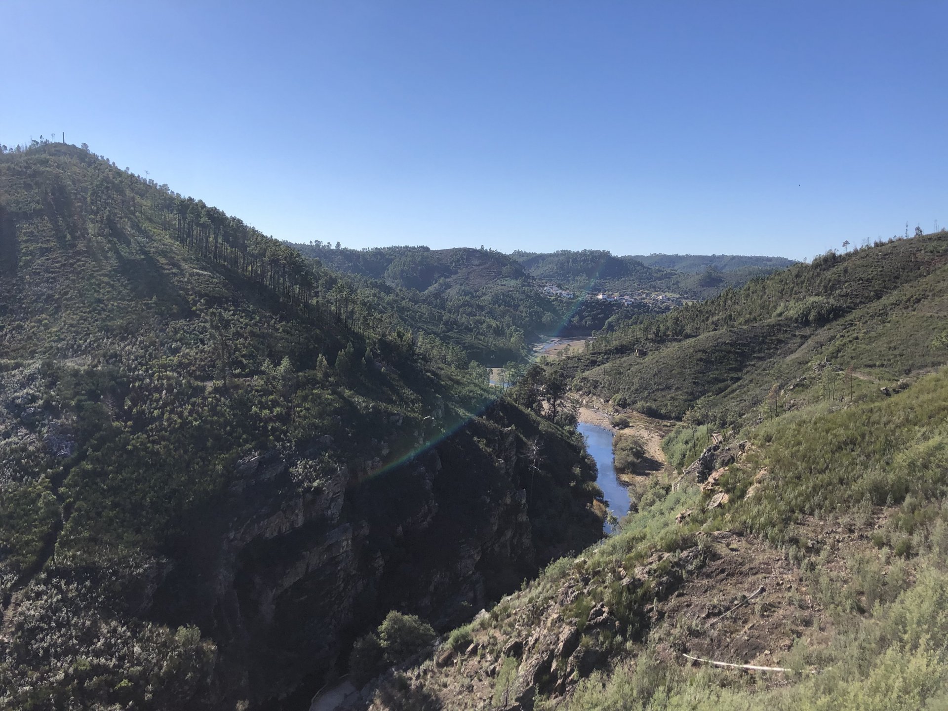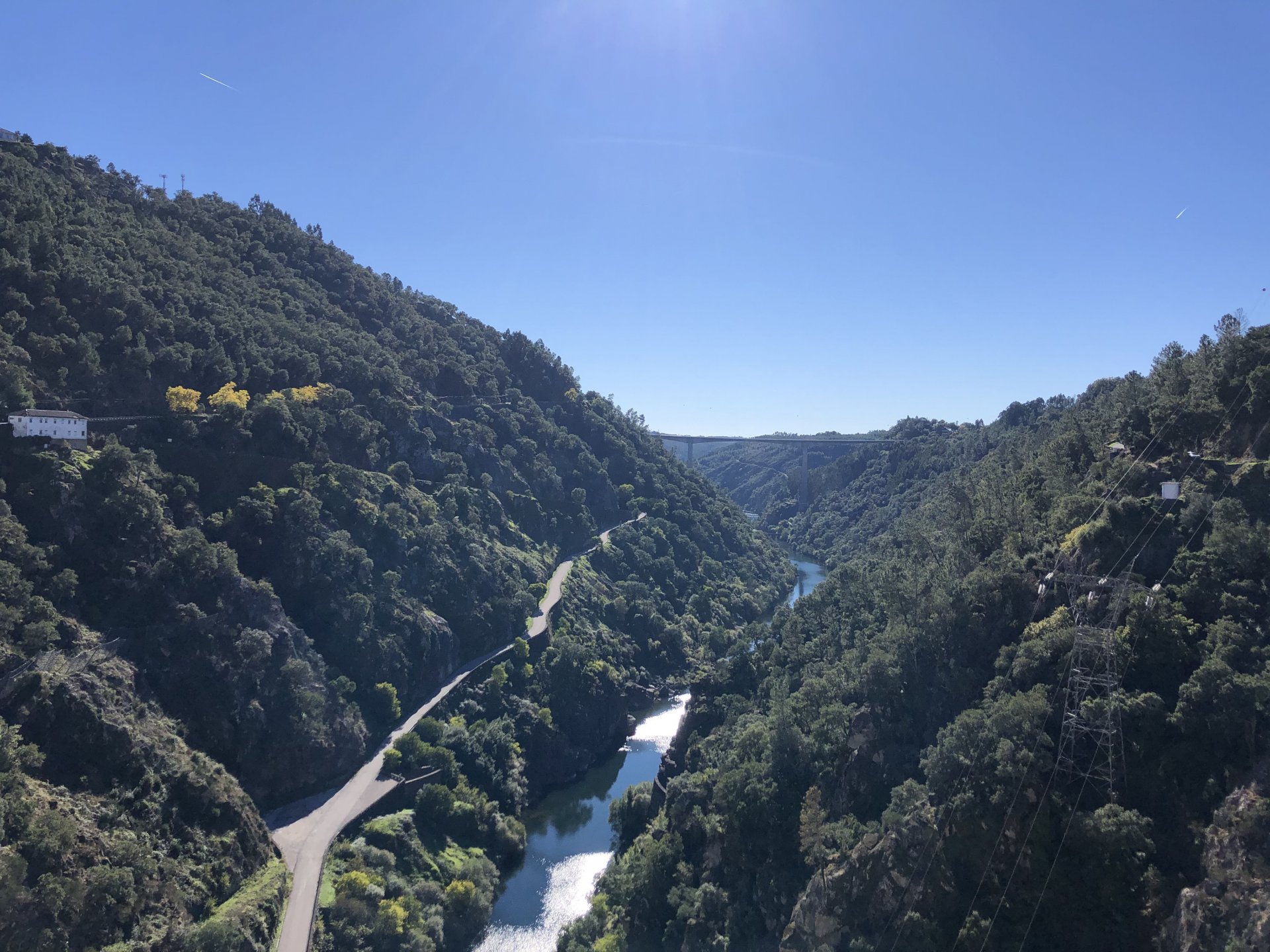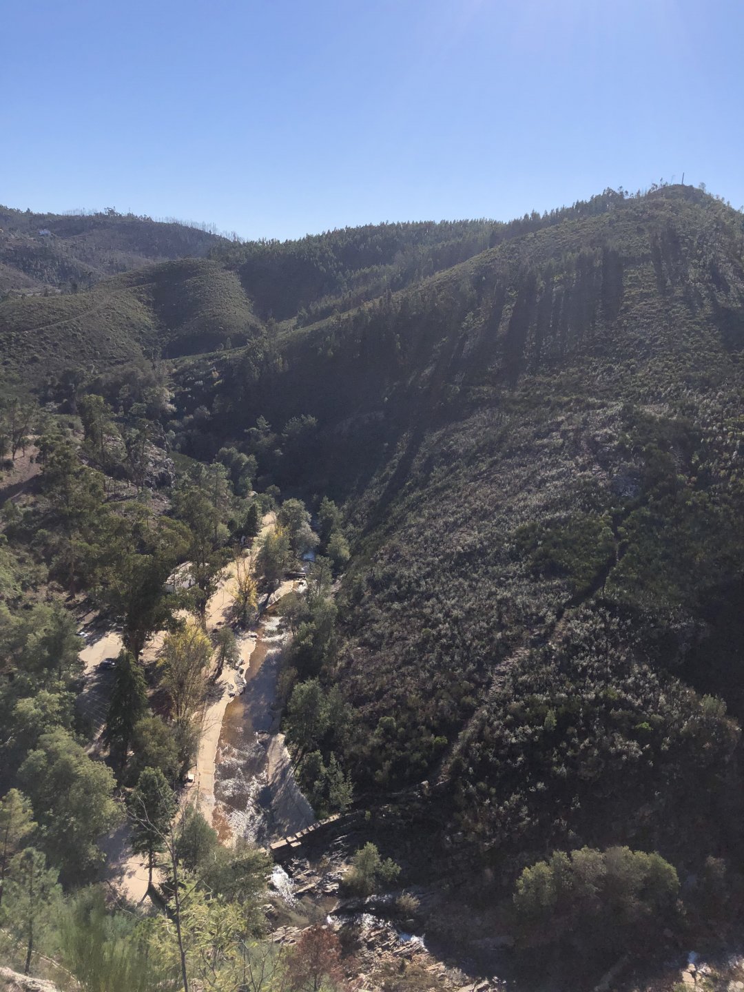 Went out for a drink to Porto, haven't done that in ages on a saturday night but a friend was staying overnight there while bringing his new car from Germany to Lisbon and me and my brother had to look at the amazing new set of wheels. This turned into a later night than I was expecting so it was a struggle to leave the house by 9:30 or 10, I was set on taking the long scenic route to my home instead of the motorway, and I did. A short 30 or 40 minutes on the motorway to get going and then off in search of twisty roads. I took few pictures at first, it was too cold for me to feel like stopping and taking the warm gloves off and go for the phone which was inside my jacket. First stop was for lunch at a small rural cafe on the N2, Portugal's longest road A bowl of hot vegetable soup to warm up, it hit the spot before a pork sandwich Two other customers showed up for a taste of my sandwich Not a bad view, the whole time I was there I think only two bikes passed, and two cars both arriving to the cafe, very quiet for a sunny sunday. I think both the MotoGP and the cold morning stopped people from getting out. Better for me! A while later, a brief stop for a picture stopped over a dam Later still, stopped by Portugal's geodetic center, in Vila D'El Rei On some of the smaller parts of the N2, stopped for a short walk on the Penedo Furado viewpoint. I was going south and it warmed up a little in the afternoon, suddenly no more cold. Back on the road And no more pictures, sun was starting to go down so pressed on home, perfect winter weather today!