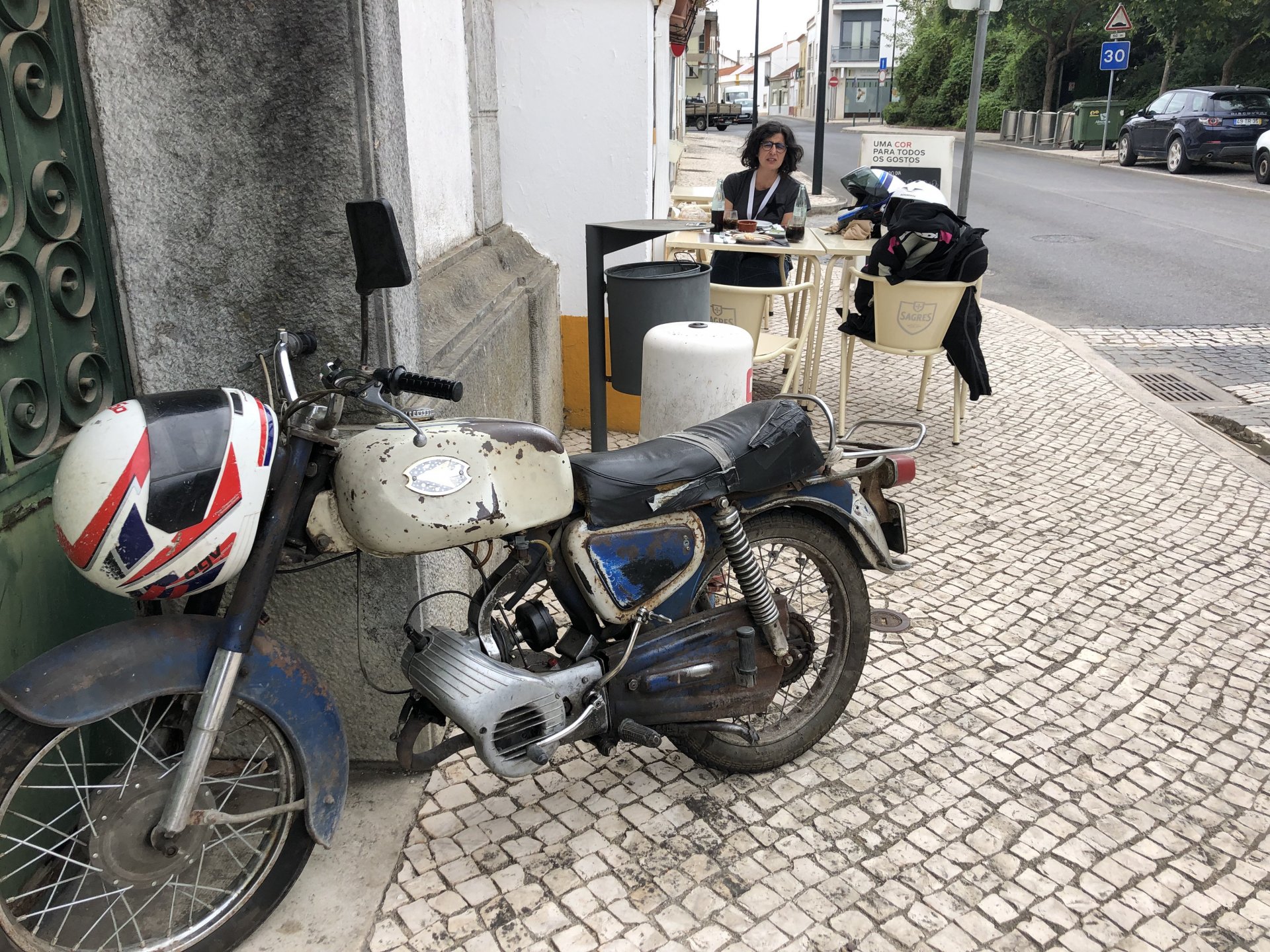 After a very short ride over that bridge you see in the previous pictures, we went to Almeirim to have a spot of lunch and visit a local wine producer, stopped by our table, a great older 50cc bike, so typical in Portugal and with amazing patina. It started first kick and rode off with hardly an effort.
