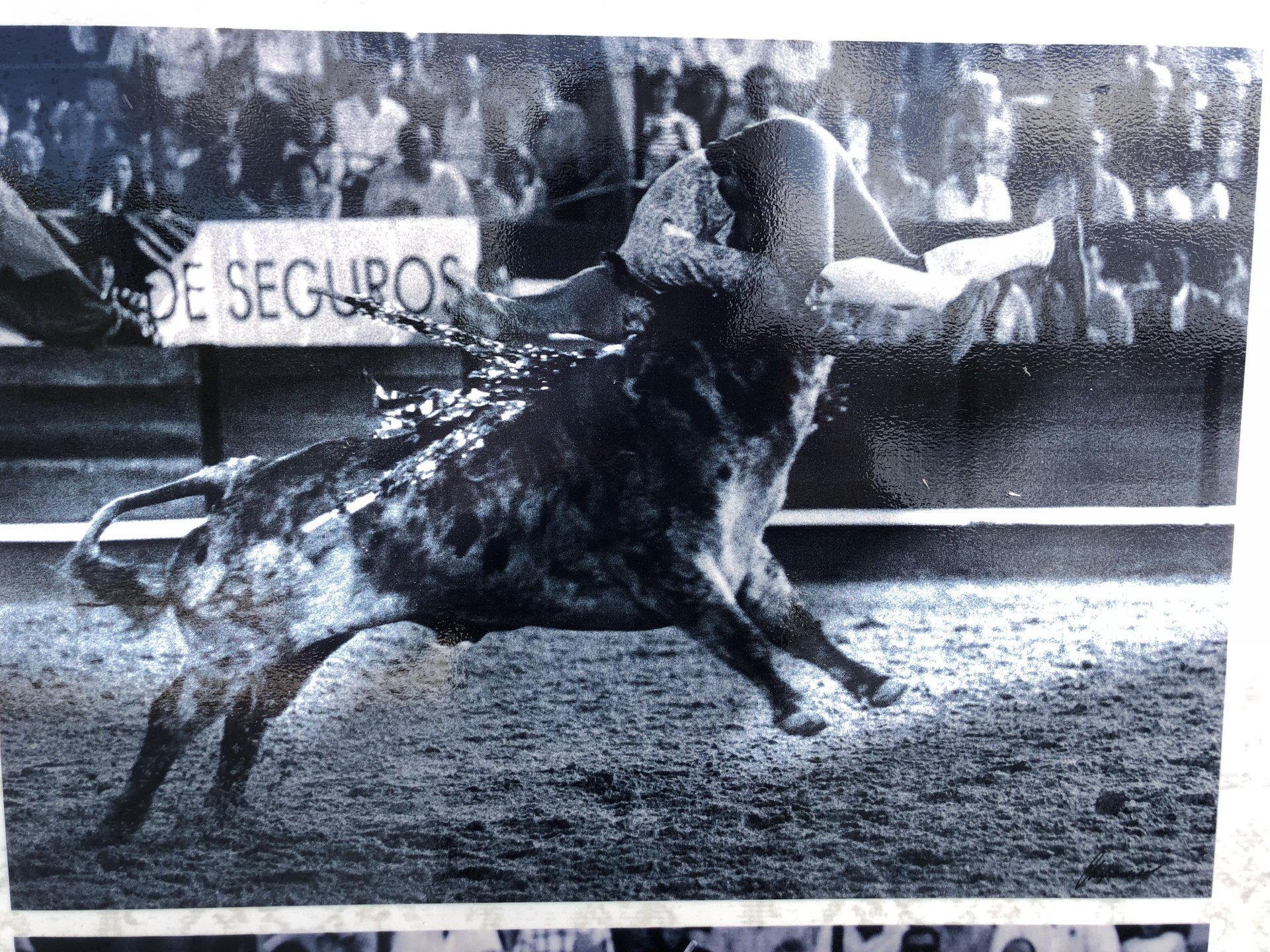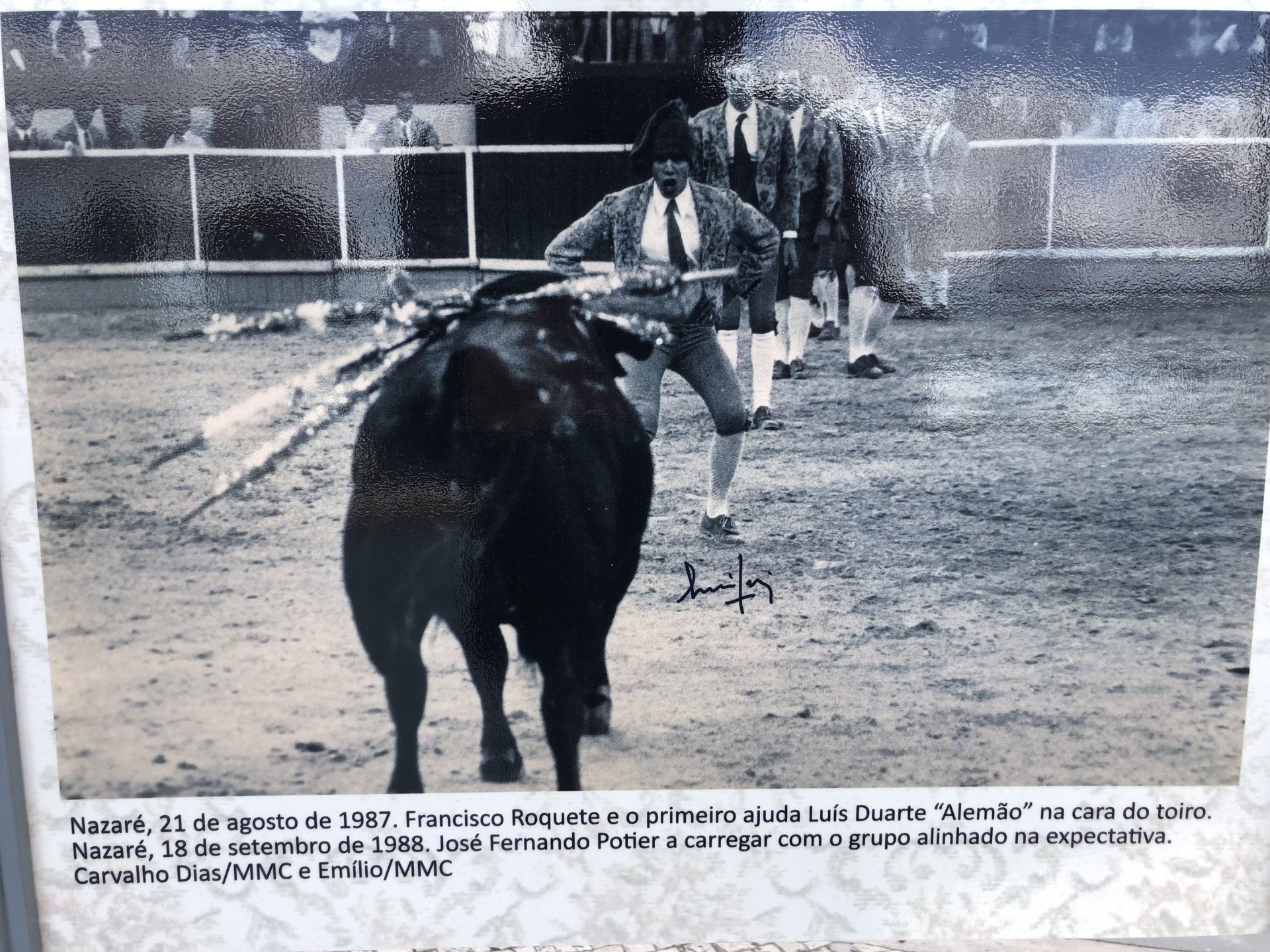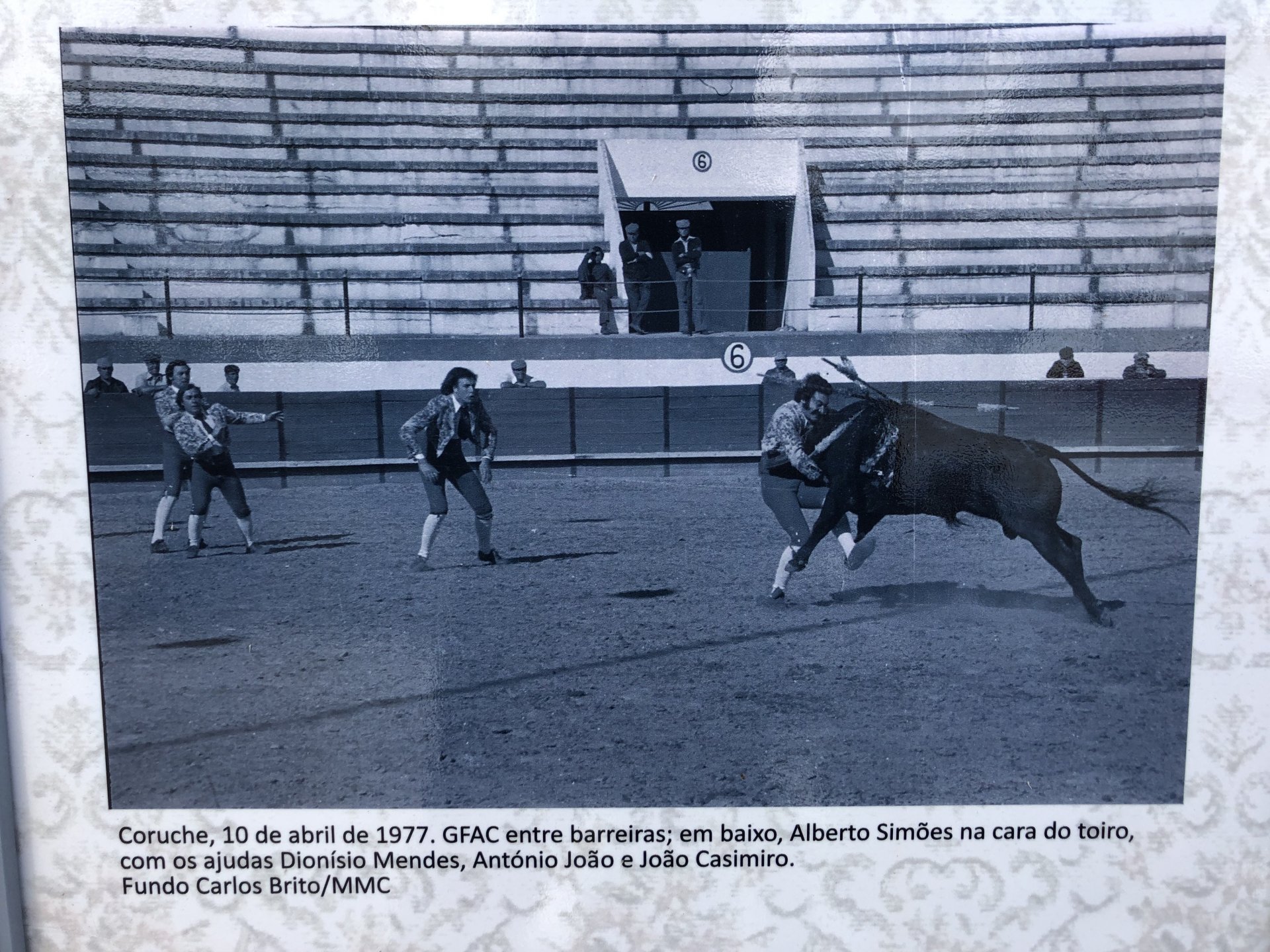 Coruche is very big on bullfighting, and although I prefer to see bulls lose on the hills than being tortured on the arena, there is a specific form of bullfighting that I do appreciate. The "Forcados" face the bull head on, and when it charges they grab it by the horns and hold on while a few of their team mates grab it and try to stop the bull. Simple as that, it does goes wrong for the guy in front sometimes... here are a couple of pictures in a small outdoor exhibit where we were stopped.