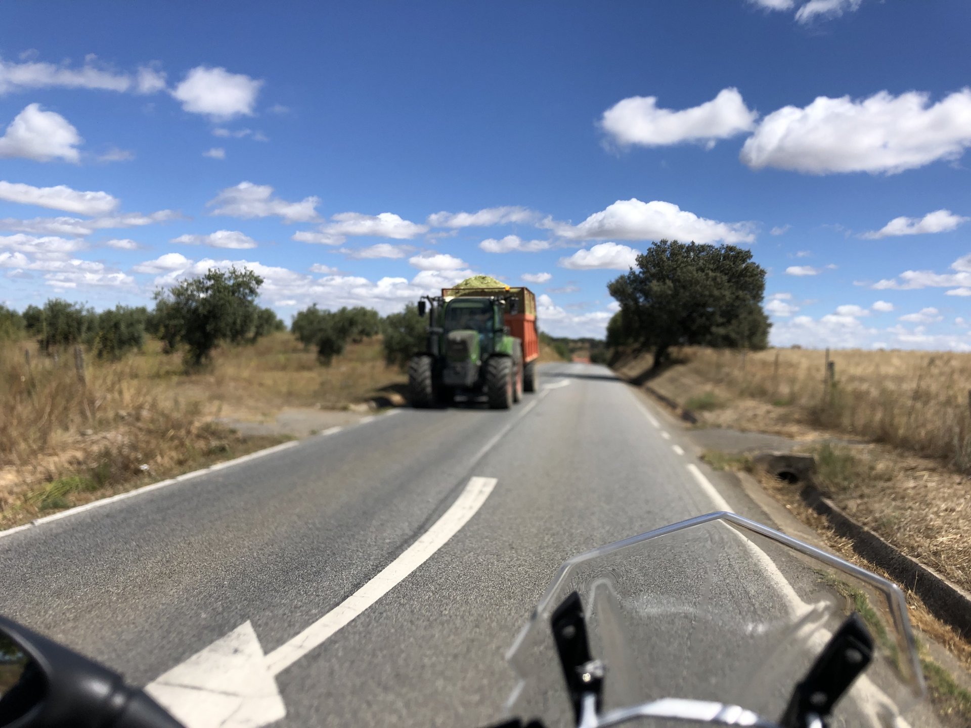 Riding further to the warm Alentejo, I took this moving cockpit picture of a loaded trailer being towed by a tractor, weird distortion from the moving phone camera
