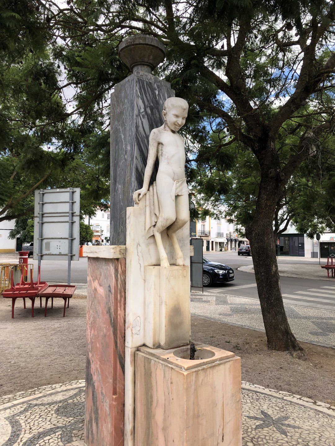 After a stop in a cheese maker's shop, where we filled my cardboard top box with delicious things, we had only a short ride to Estremoz where Sofia had a meeting in the center of town. While waiting I went to buy some local bread to go with the meats and sat on a terrace under the shade and had some water. There I became quite disturbed to see the most evil looking statue I've ever seen. It's a boy Satyre: