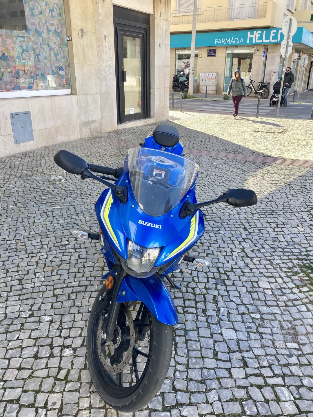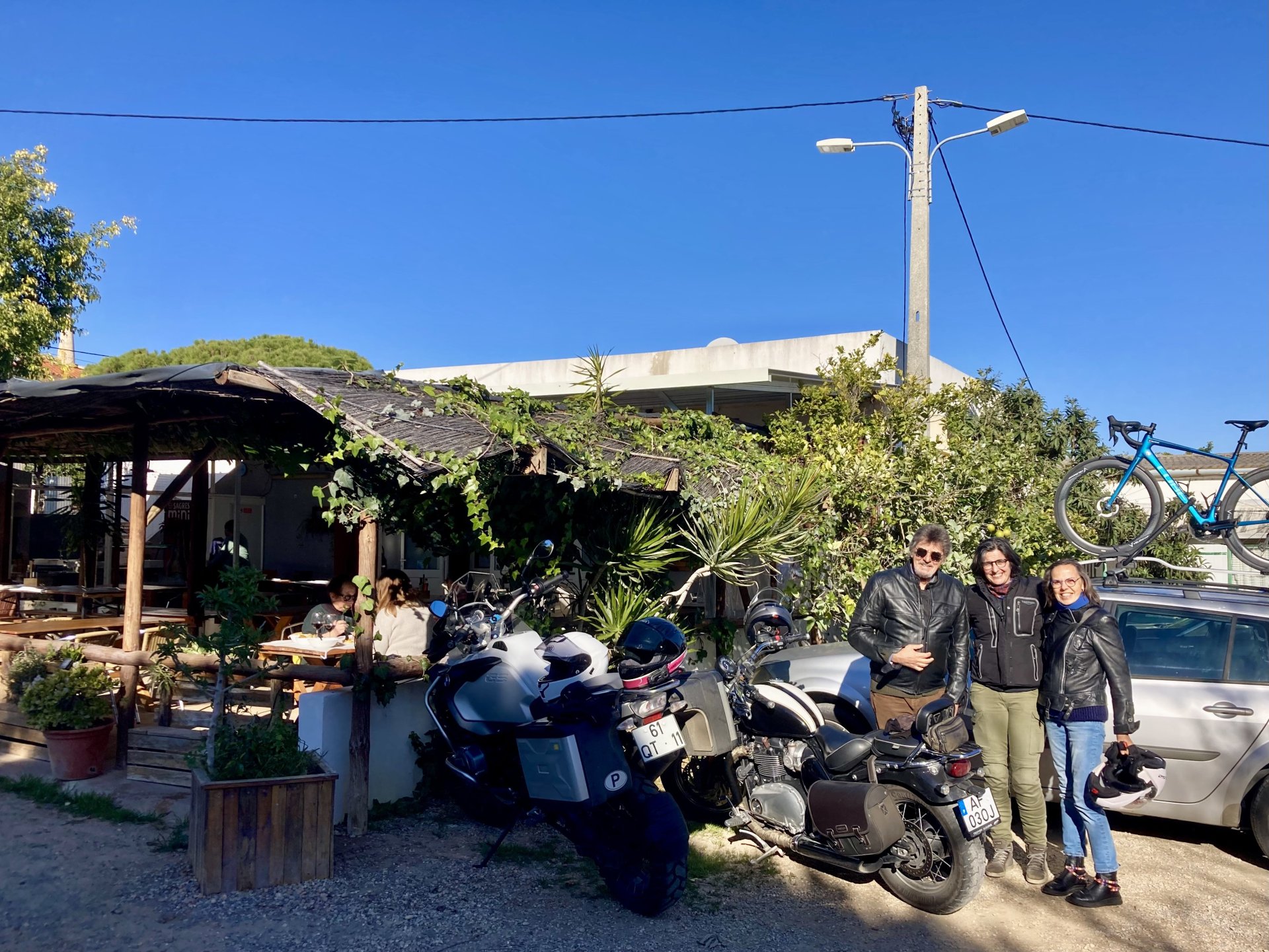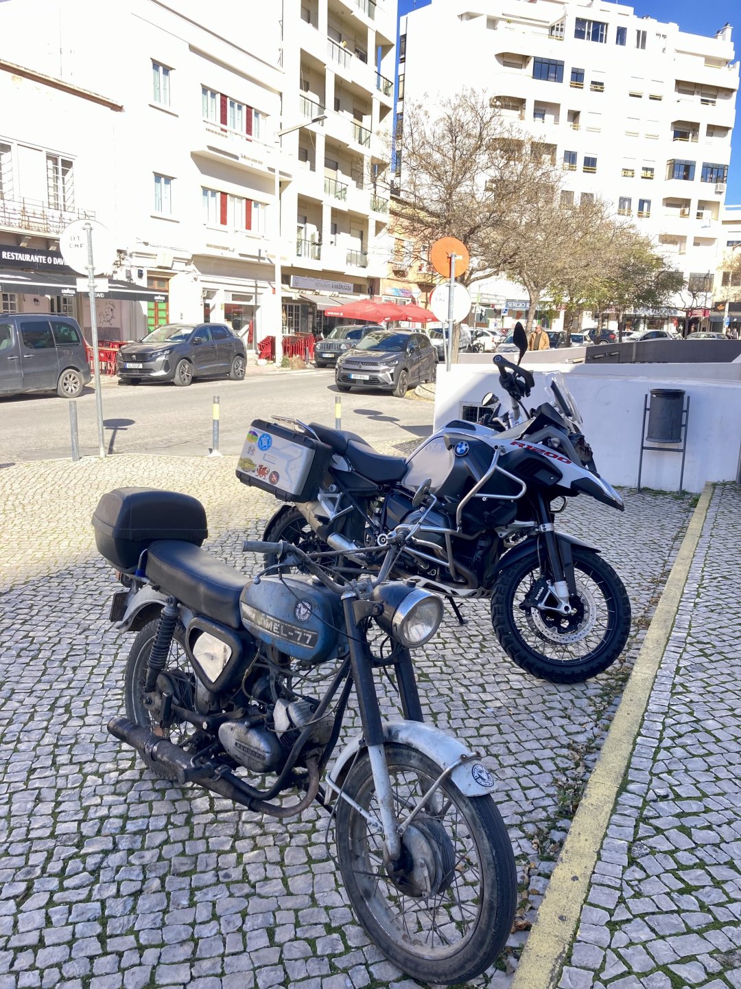 Next day we went for a walk. Had a nice breakfast outside and left on foot, after an hour or so made it to the beach for a cold refreshment. It's a very cool bar / restaurant with a great view of the ocean. We booked a table for dinner and walked off back home. Sofia went for a rest and I took the GS out for a wash that ended up making it look almost worse, and the Triumph for fueling up because I'm such a great guy. It was a lazy day, which is exactly what Sofia was looking for. The next day we went for lunch with João, he would take us to a very typical Algarvian restaurant, first meeting him in Faro by the market with a brief stop by the marina. We spotted a little 125cc Suzuki that looked very similar to Niel's 1000cc beast, this one even had a similarly slick looking front tire: Parked my bike next to the market side by side with a neglected looking but strong running Famel, fully made in Portugal with an engine built under license from Zundapp. Stickers were Faro MC, arguably Portugal's most important MC. Lunch took forever in true Portuguese style, coal grilled fish under some vines, I loved it! Sunset was watched by the sea, and it was very nice. Got back home in the cold, as temperatures plummet when the sky is this clear, minimum that night was 3 or 4ºC. It was very romantic. Next day, typical Portuguese motorcycling.