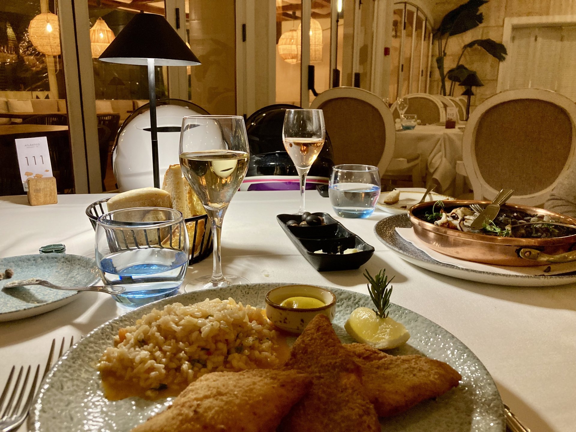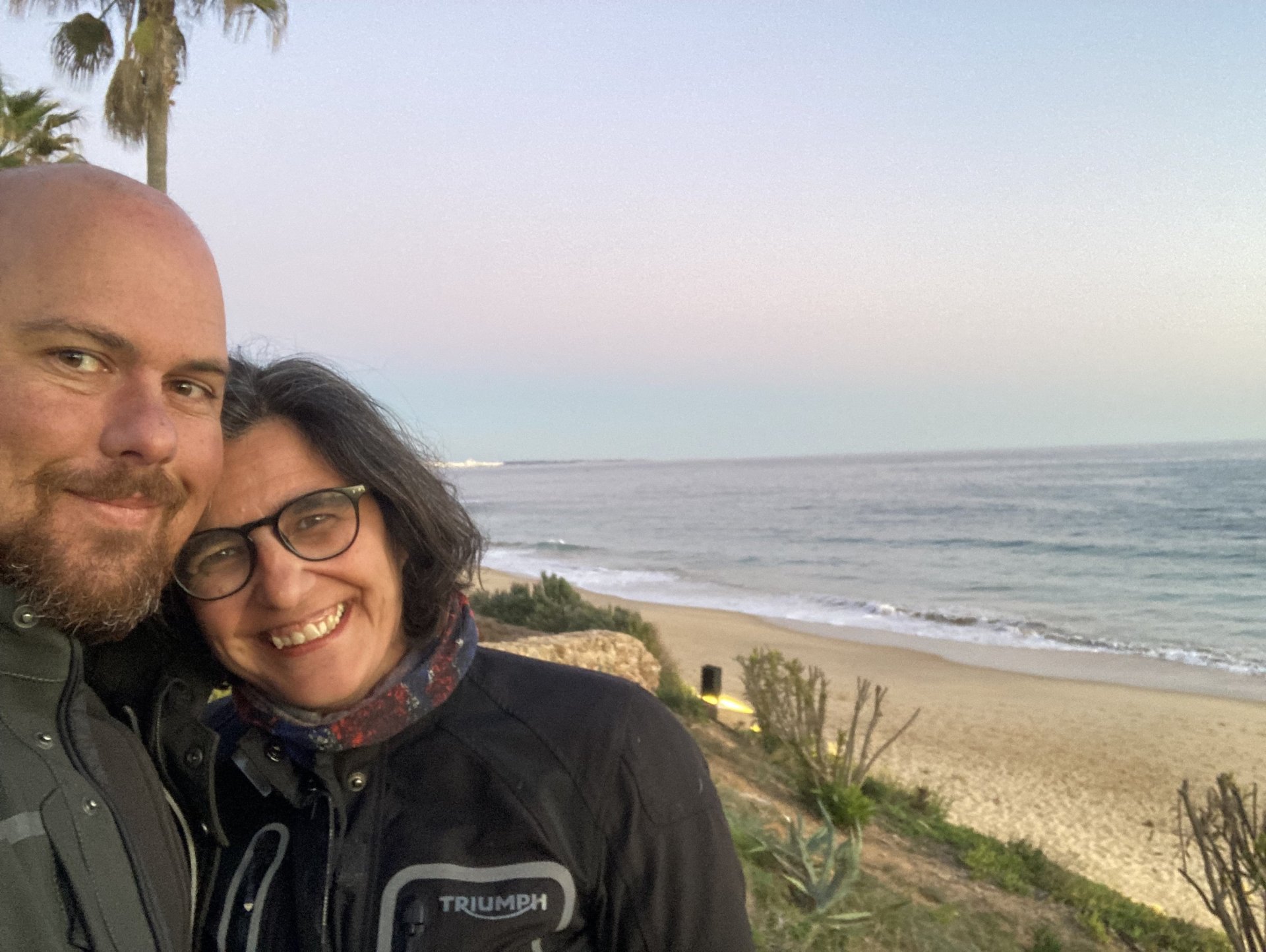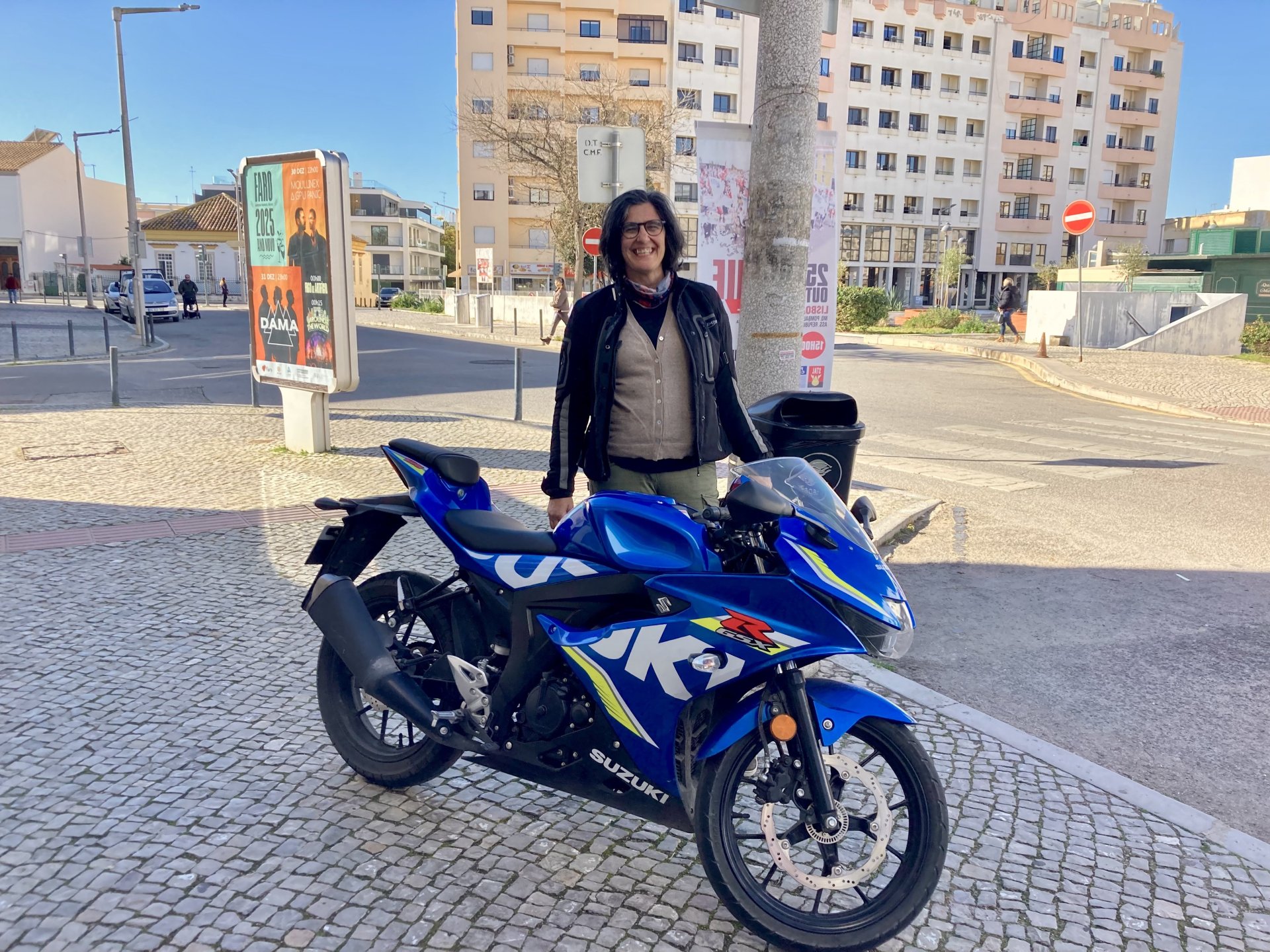 Next day we went for a walk. Had a nice breakfast outside and left on foot, after an hour or so made it to the beach for a cold refreshment. It's a very cool bar / restaurant with a great view of the ocean. We booked a table for dinner and walked off back home. Sofia went for a rest and I took the GS out for a wash that ended up making it look almost worse, and the Triumph for fueling up because I'm such a great guy. It was a lazy day, which is exactly what Sofia was looking for. The next day we went for lunch with João, he would take us to a very typical Algarvian restaurant, first meeting him in Faro by the market with a brief stop by the marina. We spotted a little 125cc Suzuki that looked very similar to Niel's 1000cc beast, this one even had a similarly slick looking front tire: Parked my bike next to the market side by side with a neglected looking but strong running Famel, fully made in Portugal with an engine built under license from Zundapp. Stickers were Faro MC, arguably Portugal's most important MC. Lunch took forever in true Portuguese style, coal grilled fish under some vines, I loved it! Sunset was watched by the sea, and it was very nice. Got back home in the cold, as temperatures plummet when the sky is this clear, minimum that night was 3 or 4ºC. It was very romantic. Next day, typical Portuguese motorcycling.