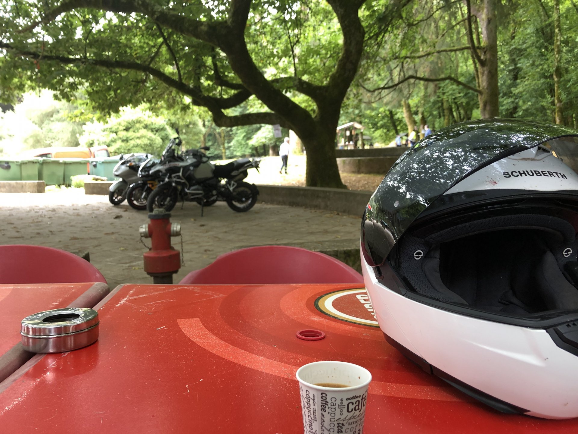 Got up and staid in bed for an hour watching the sky outside, with the dark clouds rolling by, then got up and came to my hilltop cafe for a coffee. chilling on a table away from the cyclists, before it gets busy, off in a few minutes