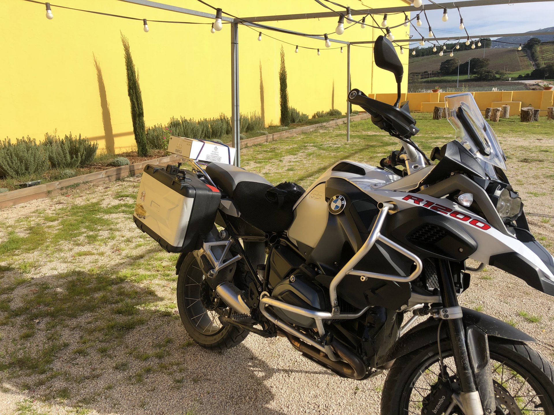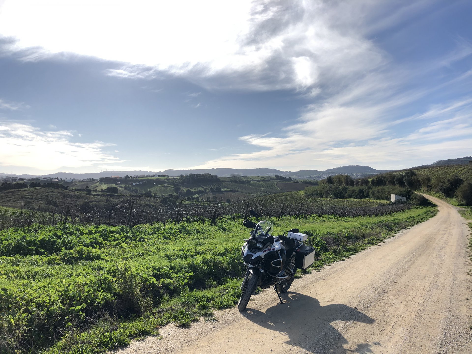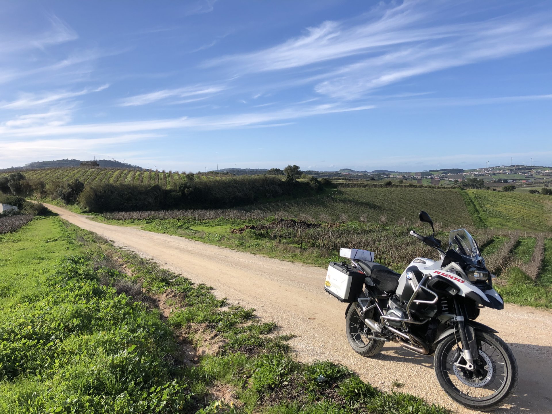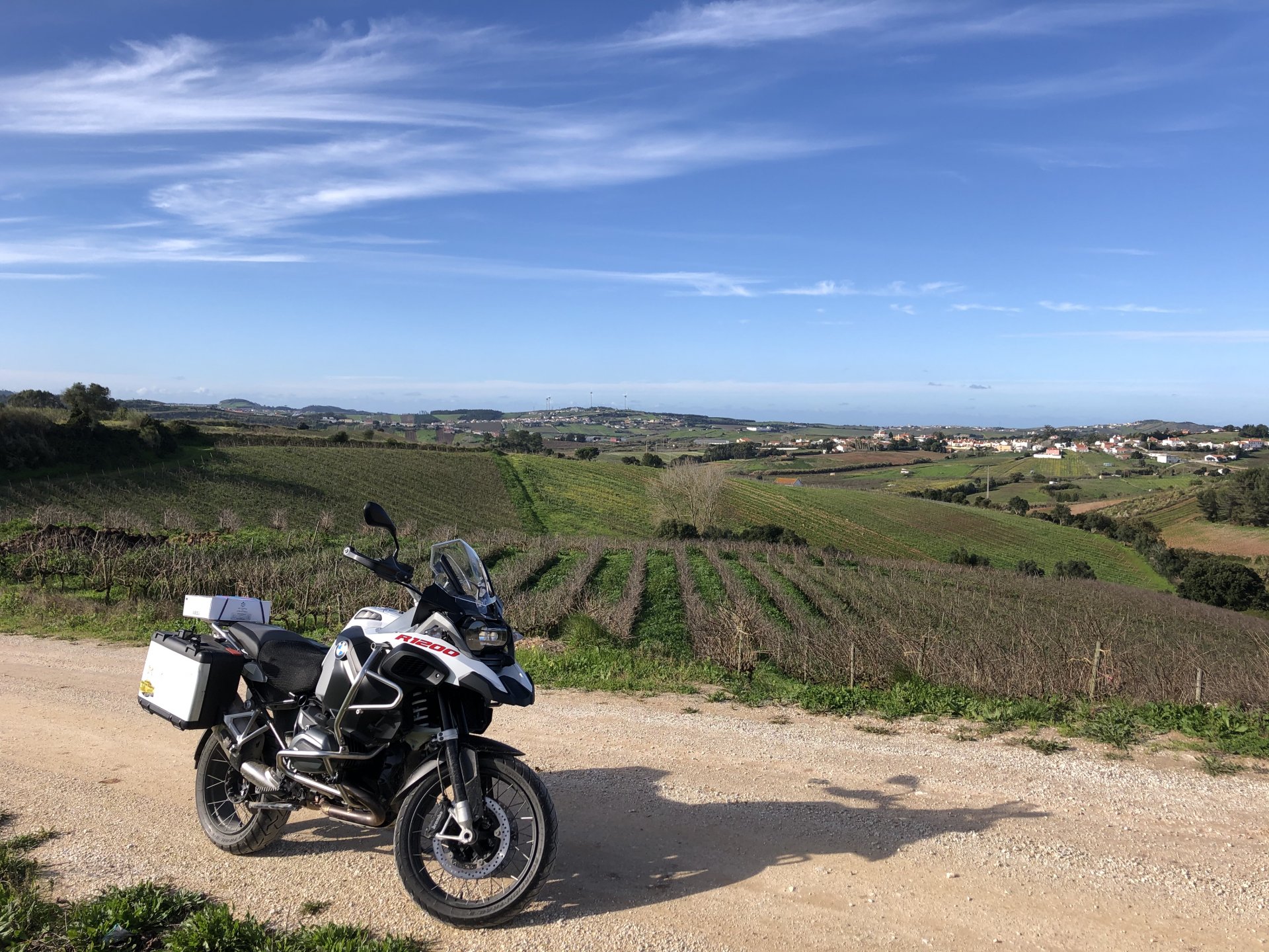 The mighty GS, carrying 3 bottles of wine accross the Lisbon wine country on a dirt road, on Christmas eve.