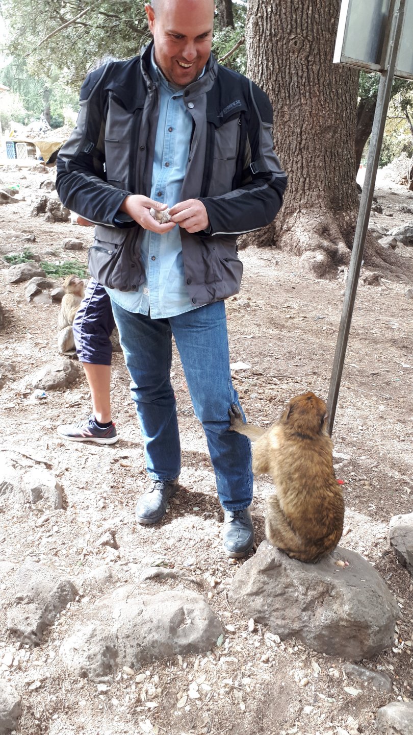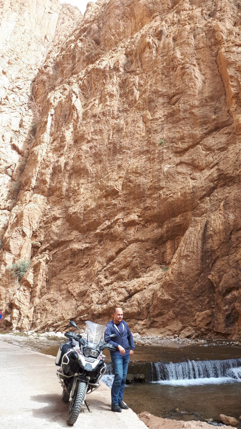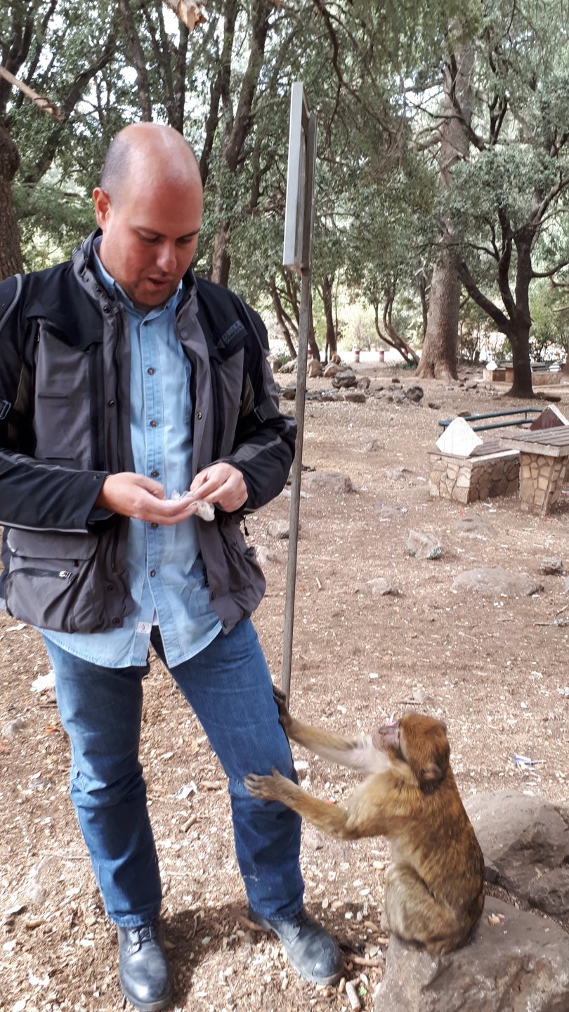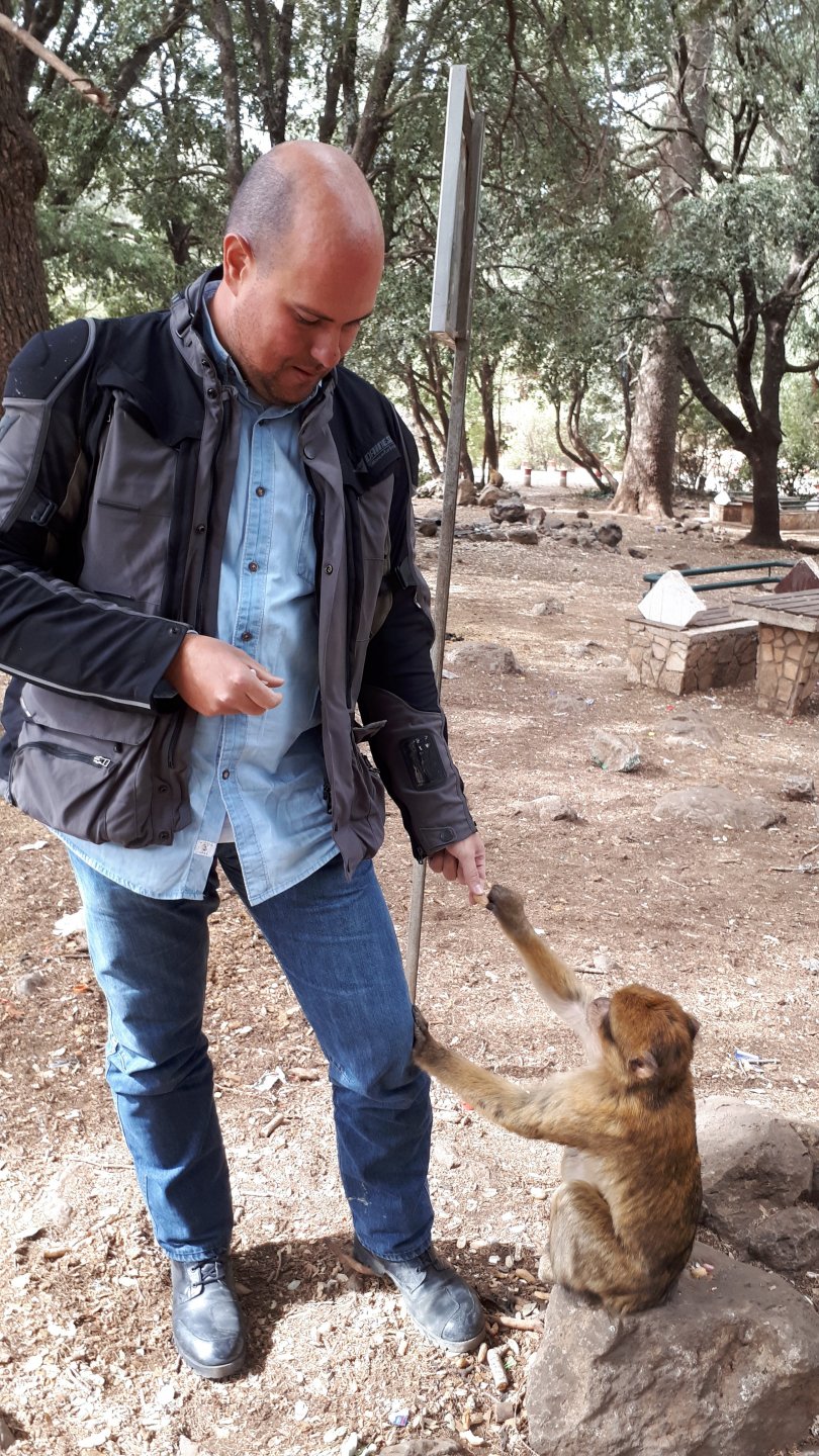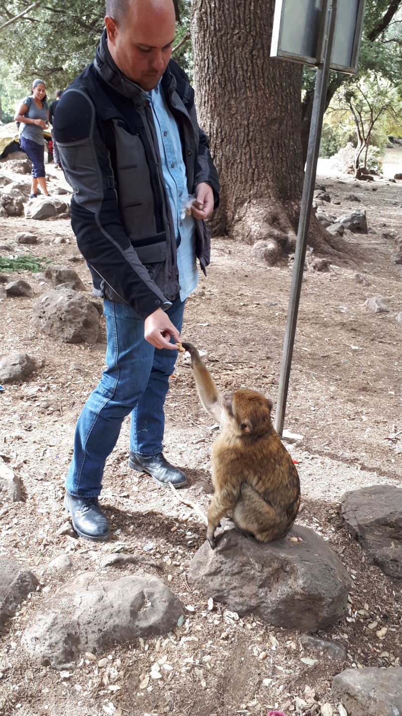 Morning, Fes, we decide to not go for the overpriced breakfast in our hotel and instead head out on the bike, knowing that there were a few cafes in our avenue. Few minutes later, and we're having great french style croissants, awesome orange juice and expresso. Take that Paris! We're next to a BNP, so Paris wins the big picture Efficiently, we make our way to visit our monkey friends. On the way there I stop to put on my shirt, it was a little cold and proper windy Today, we had shelled peanuts, and here I am taking the shells of peanuts to them hand them over to a monkey, I swear it's the same one from the first time. After sharing some snacks with my friend, we went on our way heading to Midelt via Itzer and Boumia. Weather threatened rain and it sure wasn't hot, I was glad to have been inspired by Rui to buy a more substantial jacket. Boumia is a small town in a pretty barren place, windswept high hills, but today was market day and you got people clearly coming from surrounding villages coming in, it was booming with trade. We stopped for lunch in a small cafe and had chicken, roasted on the rotisserie. If you're ever in Morocco in small villages in the middle of the mountains or desert, and are faced with a choice of what to eat, just have an omelette or the poulet roti. You'll eat the kind of chicken meat you used to get everywhere in Europe before it all turned to industrialized shit, it's amazing. We were very well greeted by a couple of traders having lunch on the table next to ours, and they liked it when I got up and went outside to start the bike and help some kids climb on it and give it a little honk. Made my day, and theirs as well. Coming in, we further impressed our next table friends by eating the chicken Moroccan style, meaning you peck at the meat with your fingers, dip it in the little sauce dish they serve next to it, and eat it with your fingers like that. I swear it tastes better that way. Didn't take pictures of that delicious lunch to try and not look like tourists Near Midelt, we tried to go to the Cirque de Jafaar again, but those dark clouds you saw in the previous pictures decided to open up with pretty strong rain and thunder. We didn't want to be stuck in a small flood or mud, so got out of there: On the first chance we had, we stopped under a gas station cover and sheltered for the worst if it. We were already in plastic overalls and properly wet outside, so no pictures. It was getting to mid afternoon, and we were a little damp, so headed for the same hotel we had visited before. Even though it wasn't very hot, the rain had passed, the skies opened up a little, so I went for my afternoon dip in a pool, trying not to loose the tradition. That water was cold, like you'd expect. Having a stroll through the property, we might have encountered relatives of our dinner: Donut remember what we had, but Maria had recently taken off her teeth corrective braces and was delighted at her perfect bite mark. We slept soundly, like you do when it's a little cold at night. The day after we would have one of the greatest biking days ever, with everything I love about riding in Morocco in one single day.