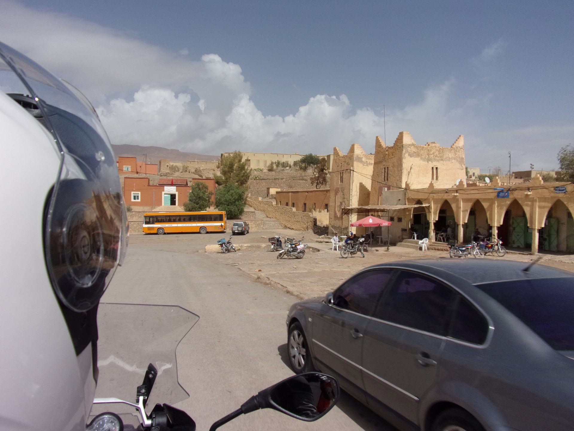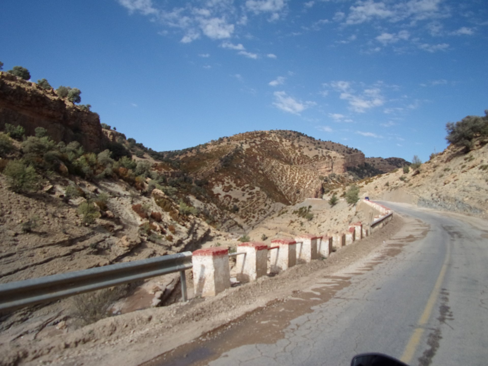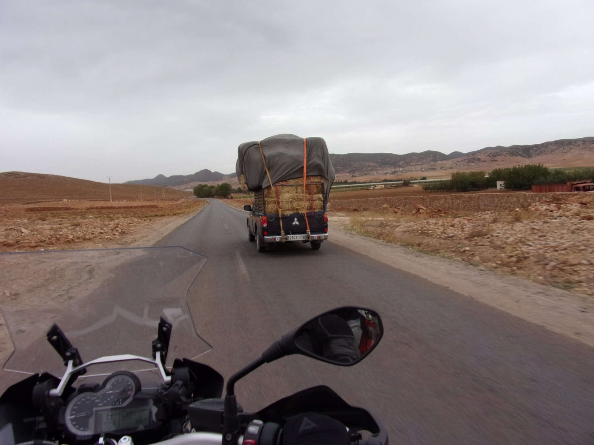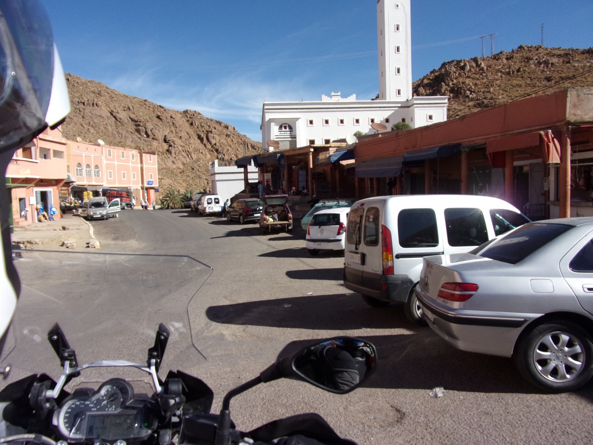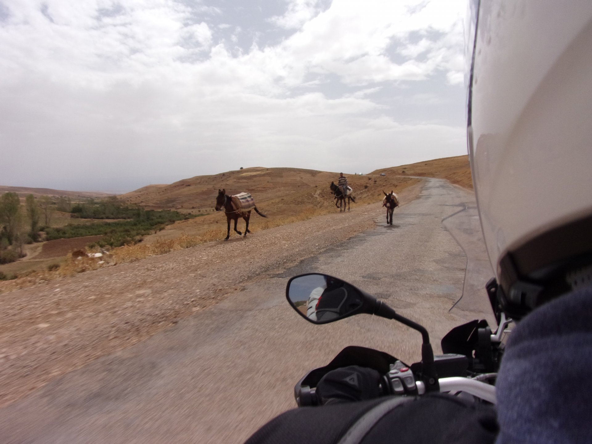 Morning, Fes, we decide to not go for the overpriced breakfast in our hotel and instead head out on the bike, knowing that there were a few cafes in our avenue. Few minutes later, and we're having great french style croissants, awesome orange juice and expresso. Take that Paris! We're next to a BNP, so Paris wins the big picture Efficiently, we make our way to visit our monkey friends. On the way there I stop to put on my shirt, it was a little cold and proper windy Today, we had shelled peanuts, and here I am taking the shells of peanuts to them hand them over to a monkey, I swear it's the same one from the first time. After sharing some snacks with my friend, we went on our way heading to Midelt via Itzer and Boumia. Weather threatened rain and it sure wasn't hot, I was glad to have been inspired by Rui to buy a more substantial jacket. Boumia is a small town in a pretty barren place, windswept high hills, but today was market day and you got people clearly coming from surrounding villages coming in, it was booming with trade. We stopped for lunch in a small cafe and had chicken, roasted on the rotisserie. If you're ever in Morocco in small villages in the middle of the mountains or desert, and are faced with a choice of what to eat, just have an omelette or the poulet roti. You'll eat the kind of chicken meat you used to get everywhere in Europe before it all turned to industrialized shit, it's amazing. We were very well greeted by a couple of traders having lunch on the table next to ours, and they liked it when I got up and went outside to start the bike and help some kids climb on it and give it a little honk. Made my day, and theirs as well. Coming in, we further impressed our next table friends by eating the chicken Moroccan style, meaning you peck at the meat with your fingers, dip it in the little sauce dish they serve next to it, and eat it with your fingers like that. I swear it tastes better that way. Didn't take pictures of that delicious lunch to try and not look like tourists Near Midelt, we tried to go to the Cirque de Jafaar again, but those dark clouds you saw in the previous pictures decided to open up with pretty strong rain and thunder. We didn't want to be stuck in a small flood or mud, so got out of there: On the first chance we had, we stopped under a gas station cover and sheltered for the worst if it. We were already in plastic overalls and properly wet outside, so no pictures. It was getting to mid afternoon, and we were a little damp, so headed for the same hotel we had visited before. Even though it wasn't very hot, the rain had passed, the skies opened up a little, so I went for my afternoon dip in a pool, trying not to loose the tradition. That water was cold, like you'd expect. Having a stroll through the property, we might have encountered relatives of our dinner: Donut remember what we had, but Maria had recently taken off her teeth corrective braces and was delighted at her perfect bite mark. We slept soundly, like you do when it's a little cold at night. The day after we would have one of the greatest biking days ever, with everything I love about riding in Morocco in one single day.