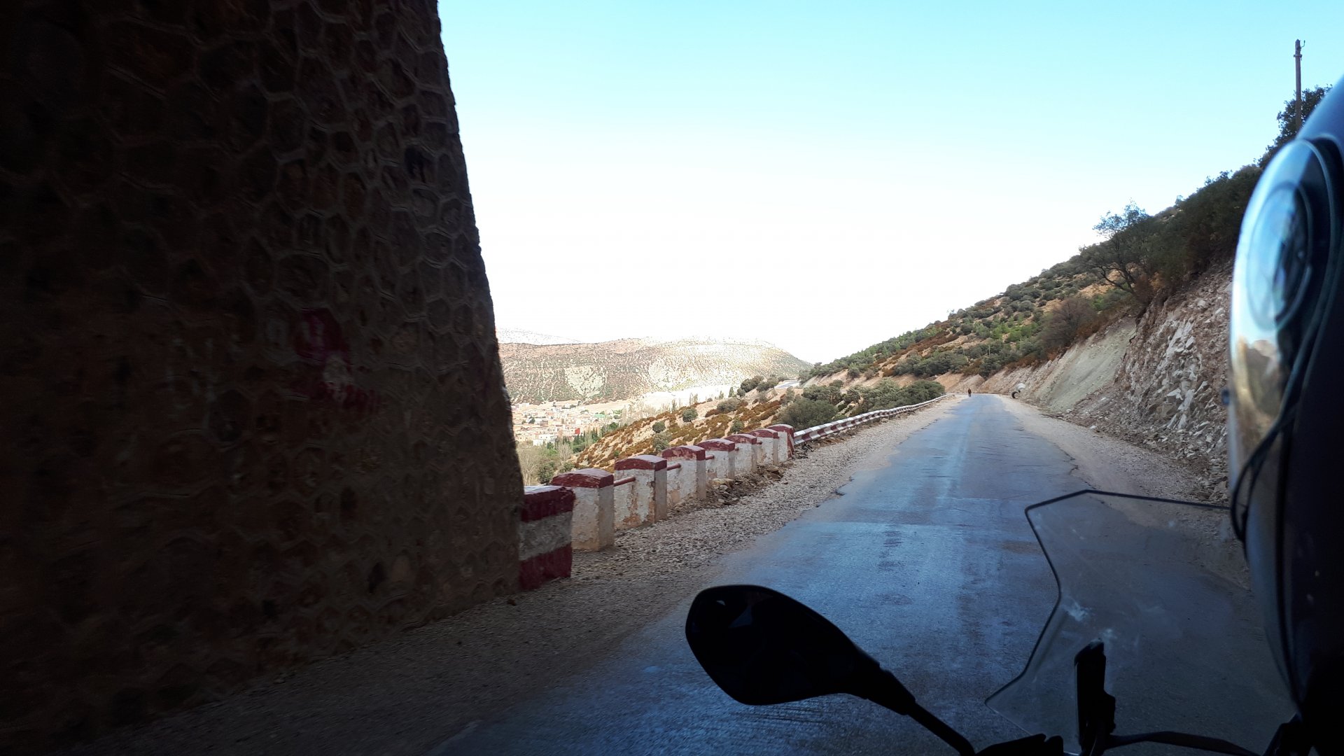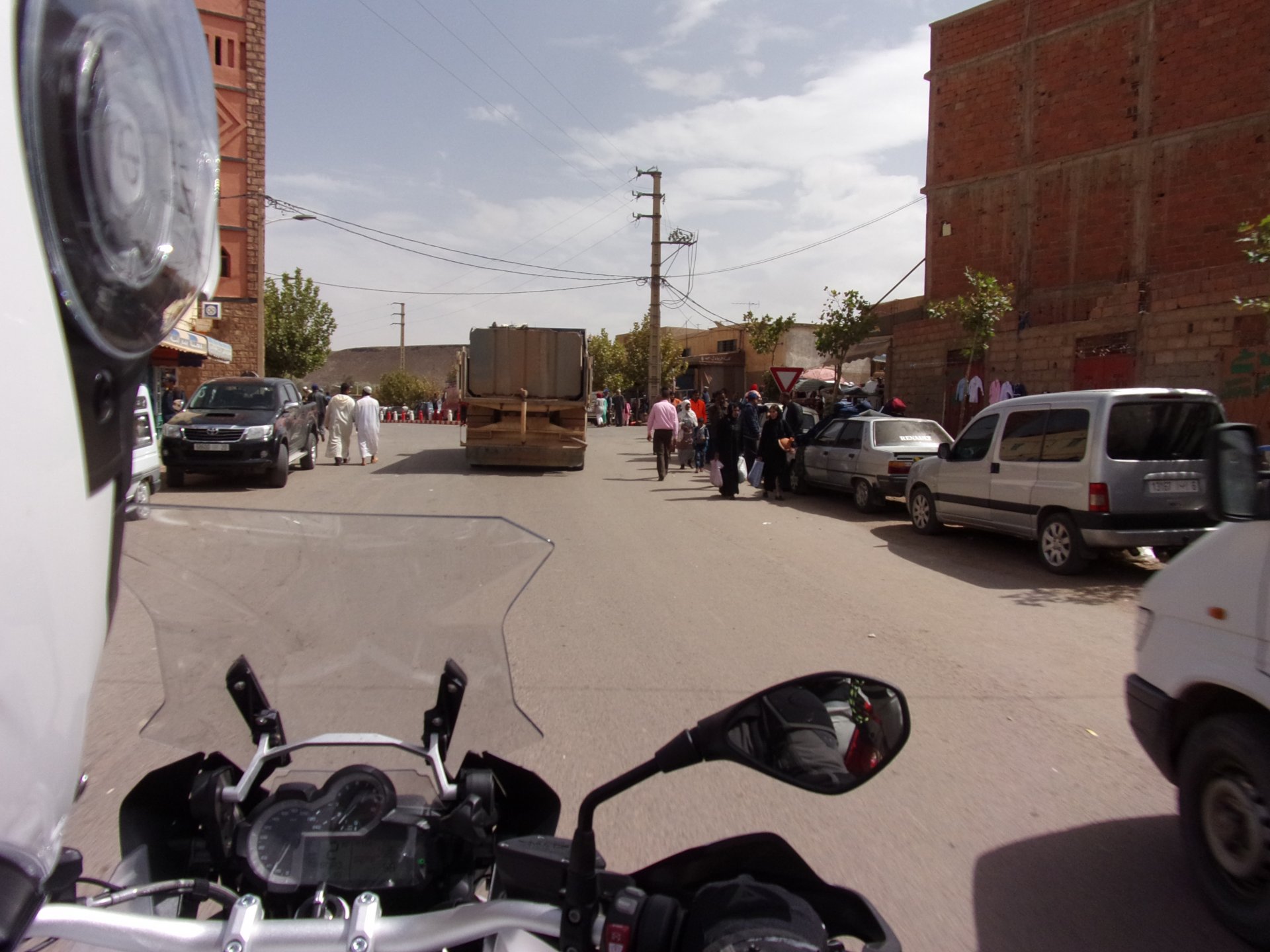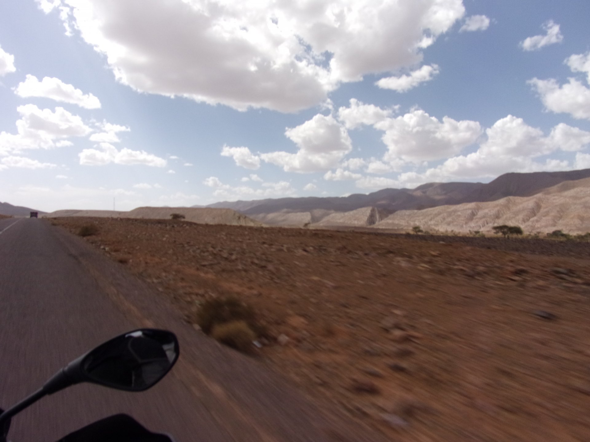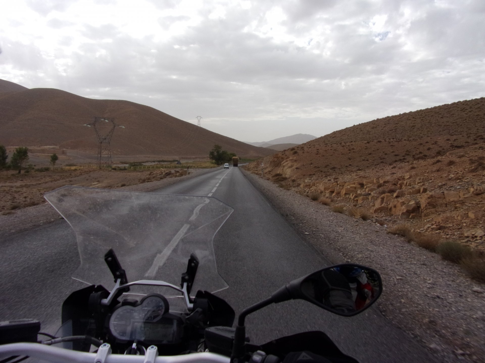 Morning, Fes, we decide to not go for the overpriced breakfast in our hotel and instead head out on the bike, knowing that there were a few cafes in our avenue. Few minutes later, and we're having great french style croissants, awesome orange juice and expresso. Take that Paris! We're next to a BNP, so Paris wins the big picture Efficiently, we make our way to visit our monkey friends. On the way there I stop to put on my shirt, it was a little cold and proper windy Today, we had shelled peanuts, and here I am taking the shells of peanuts to them hand them over to a monkey, I swear it's the same one from the first time. After sharing some snacks with my friend, we went on our way heading to Midelt via Itzer and Boumia. Weather threatened rain and it sure wasn't hot, I was glad to have been inspired by Rui to buy a more substantial jacket. Boumia is a small town in a pretty barren place, windswept high hills, but today was market day and you got people clearly coming from surrounding villages coming in, it was booming with trade. We stopped for lunch in a small cafe and had chicken, roasted on the rotisserie. If you're ever in Morocco in small villages in the middle of the mountains or desert, and are faced with a choice of what to eat, just have an omelette or the poulet roti. You'll eat the kind of chicken meat you used to get everywhere in Europe before it all turned to industrialized shit, it's amazing. We were very well greeted by a couple of traders having lunch on the table next to ours, and they liked it when I got up and went outside to start the bike and help some kids climb on it and give it a little honk. Made my day, and theirs as well. Coming in, we further impressed our next table friends by eating the chicken Moroccan style, meaning you peck at the meat with your fingers, dip it in the little sauce dish they serve next to it, and eat it with your fingers like that. I swear it tastes better that way. Didn't take pictures of that delicious lunch to try and not look like tourists Near Midelt, we tried to go to the Cirque de Jafaar again, but those dark clouds you saw in the previous pictures decided to open up with pretty strong rain and thunder. We didn't want to be stuck in a small flood or mud, so got out of there: On the first chance we had, we stopped under a gas station cover and sheltered for the worst if it. We were already in plastic overalls and properly wet outside, so no pictures. It was getting to mid afternoon, and we were a little damp, so headed for the same hotel we had visited before. Even though it wasn't very hot, the rain had passed, the skies opened up a little, so I went for my afternoon dip in a pool, trying not to loose the tradition. That water was cold, like you'd expect. Having a stroll through the property, we might have encountered relatives of our dinner: Donut remember what we had, but Maria had recently taken off her teeth corrective braces and was delighted at her perfect bite mark. We slept soundly, like you do when it's a little cold at night. The day after we would have one of the greatest biking days ever, with everything I love about riding in Morocco in one single day.