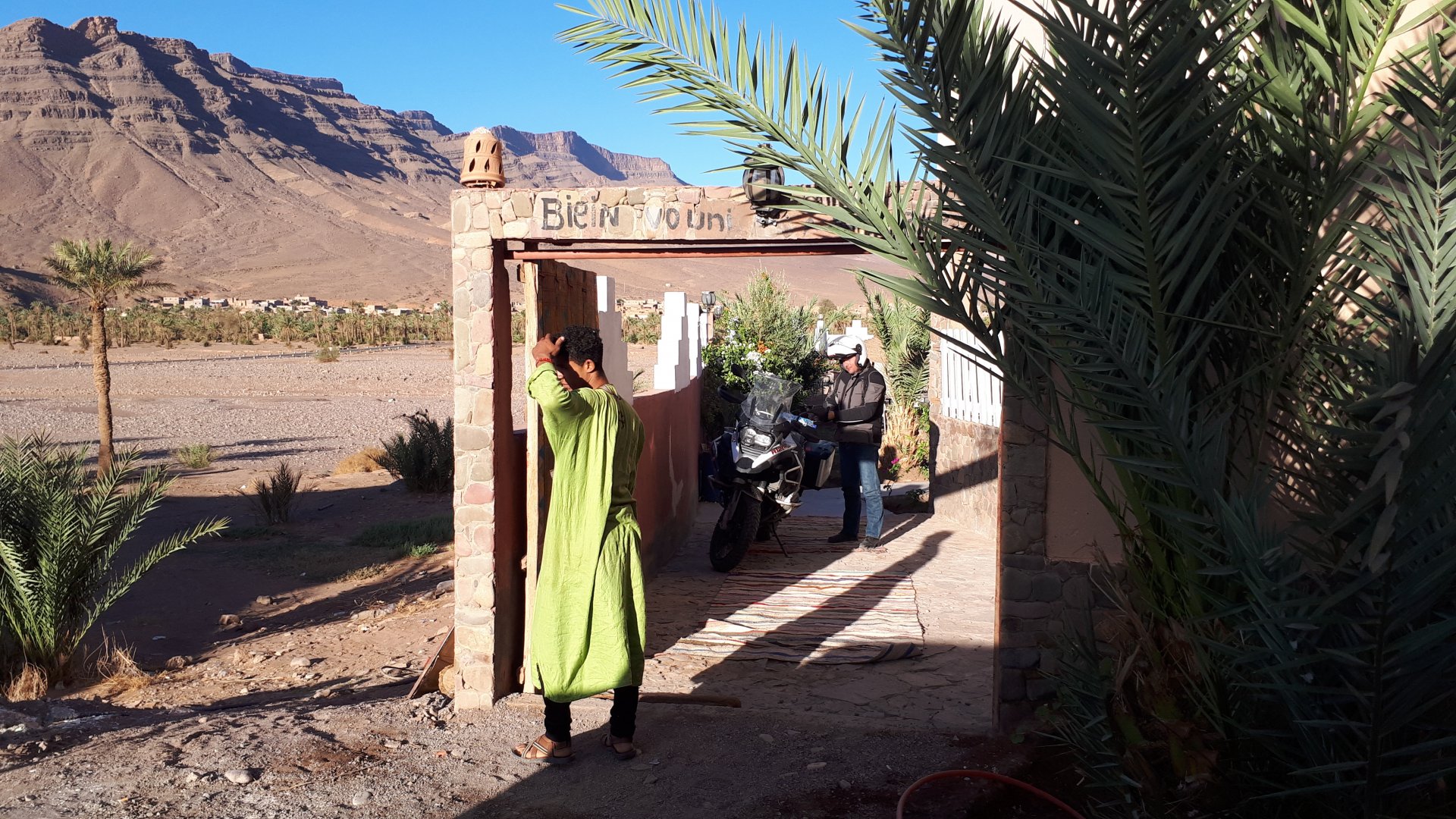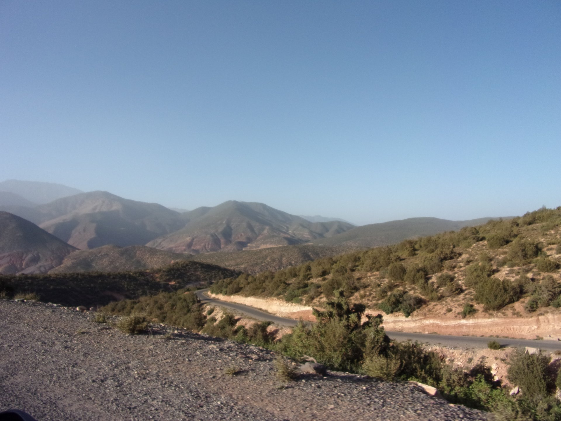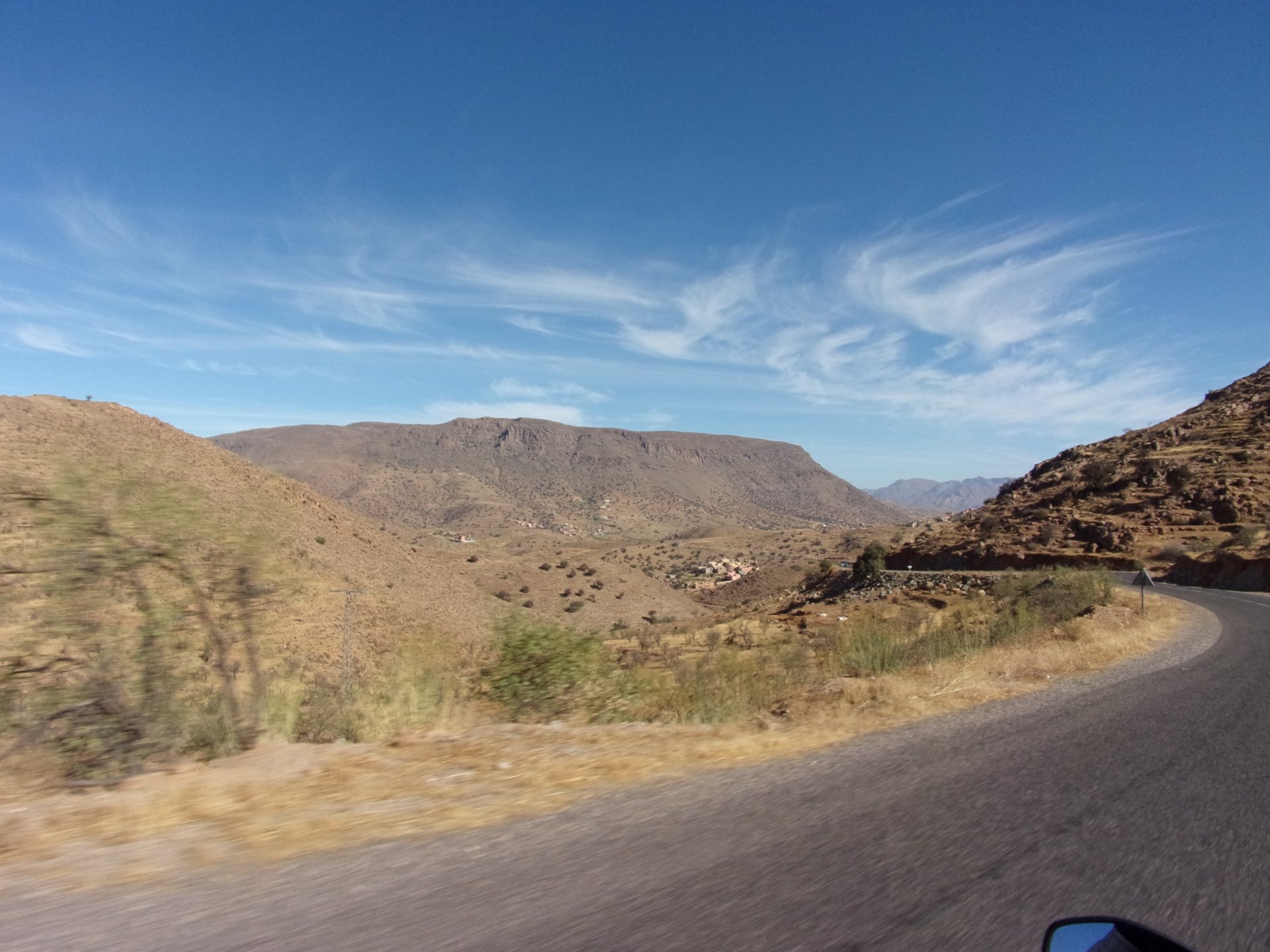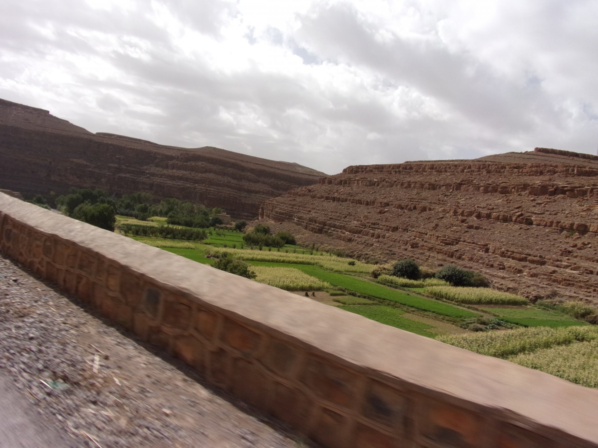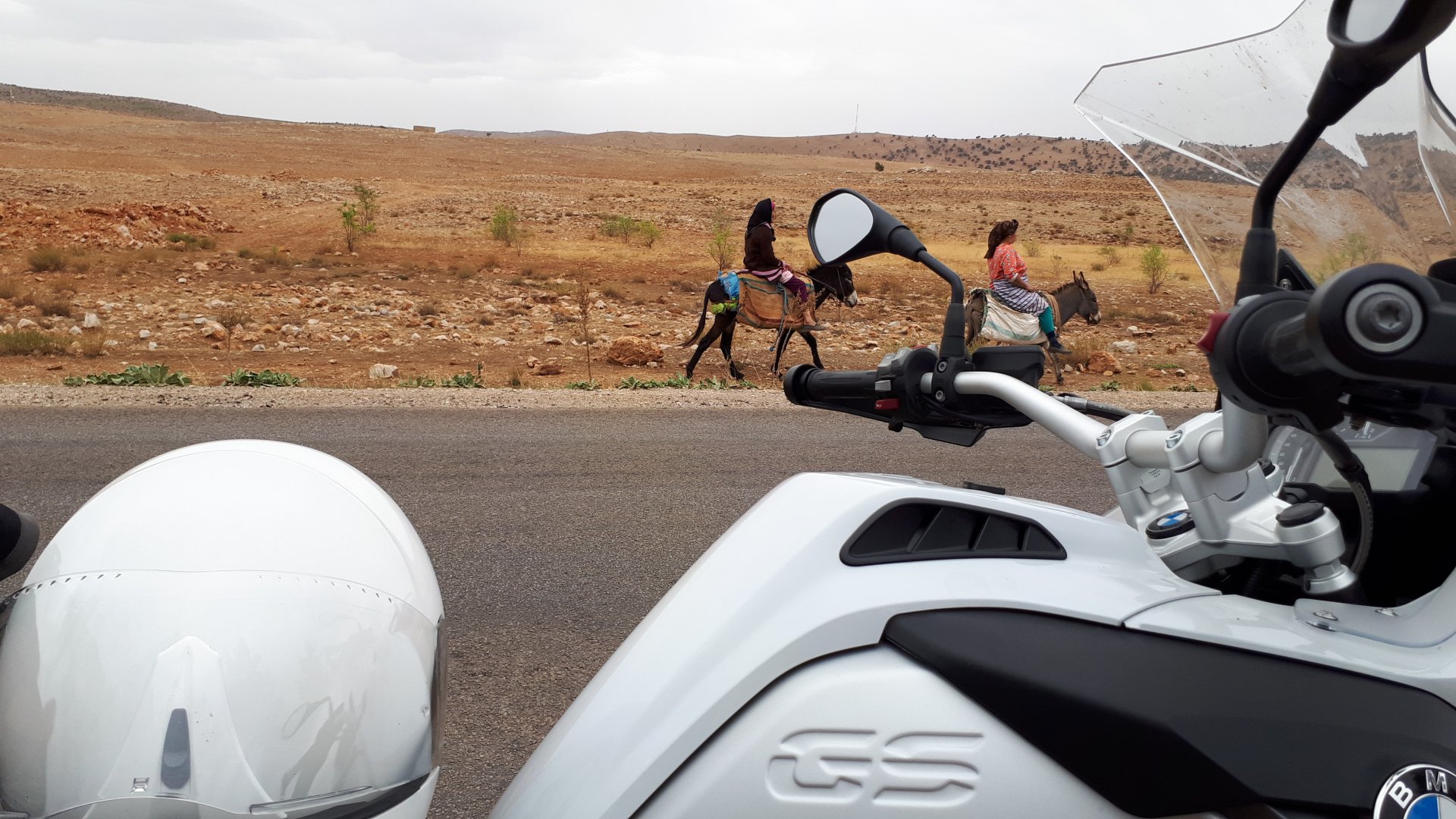 Morning, Fes, we decide to not go for the overpriced breakfast in our hotel and instead head out on the bike, knowing that there were a few cafes in our avenue. Few minutes later, and we're having great french style croissants, awesome orange juice and expresso. Take that Paris! We're next to a BNP, so Paris wins the big picture Efficiently, we make our way to visit our monkey friends. On the way there I stop to put on my shirt, it was a little cold and proper windy Today, we had shelled peanuts, and here I am taking the shells of peanuts to them hand them over to a monkey, I swear it's the same one from the first time. After sharing some snacks with my friend, we went on our way heading to Midelt via Itzer and Boumia. Weather threatened rain and it sure wasn't hot, I was glad to have been inspired by Rui to buy a more substantial jacket. Boumia is a small town in a pretty barren place, windswept high hills, but today was market day and you got people clearly coming from surrounding villages coming in, it was booming with trade. We stopped for lunch in a small cafe and had chicken, roasted on the rotisserie. If you're ever in Morocco in small villages in the middle of the mountains or desert, and are faced with a choice of what to eat, just have an omelette or the poulet roti. You'll eat the kind of chicken meat you used to get everywhere in Europe before it all turned to industrialized shit, it's amazing. We were very well greeted by a couple of traders having lunch on the table next to ours, and they liked it when I got up and went outside to start the bike and help some kids climb on it and give it a little honk. Made my day, and theirs as well. Coming in, we further impressed our next table friends by eating the chicken Moroccan style, meaning you peck at the meat with your fingers, dip it in the little sauce dish they serve next to it, and eat it with your fingers like that. I swear it tastes better that way. Didn't take pictures of that delicious lunch to try and not look like tourists Near Midelt, we tried to go to the Cirque de Jafaar again, but those dark clouds you saw in the previous pictures decided to open up with pretty strong rain and thunder. We didn't want to be stuck in a small flood or mud, so got out of there: On the first chance we had, we stopped under a gas station cover and sheltered for the worst if it. We were already in plastic overalls and properly wet outside, so no pictures. It was getting to mid afternoon, and we were a little damp, so headed for the same hotel we had visited before. Even though it wasn't very hot, the rain had passed, the skies opened up a little, so I went for my afternoon dip in a pool, trying not to loose the tradition. That water was cold, like you'd expect. Having a stroll through the property, we might have encountered relatives of our dinner: Donut remember what we had, but Maria had recently taken off her teeth corrective braces and was delighted at her perfect bite mark. We slept soundly, like you do when it's a little cold at night. The day after we would have one of the greatest biking days ever, with everything I love about riding in Morocco in one single day.