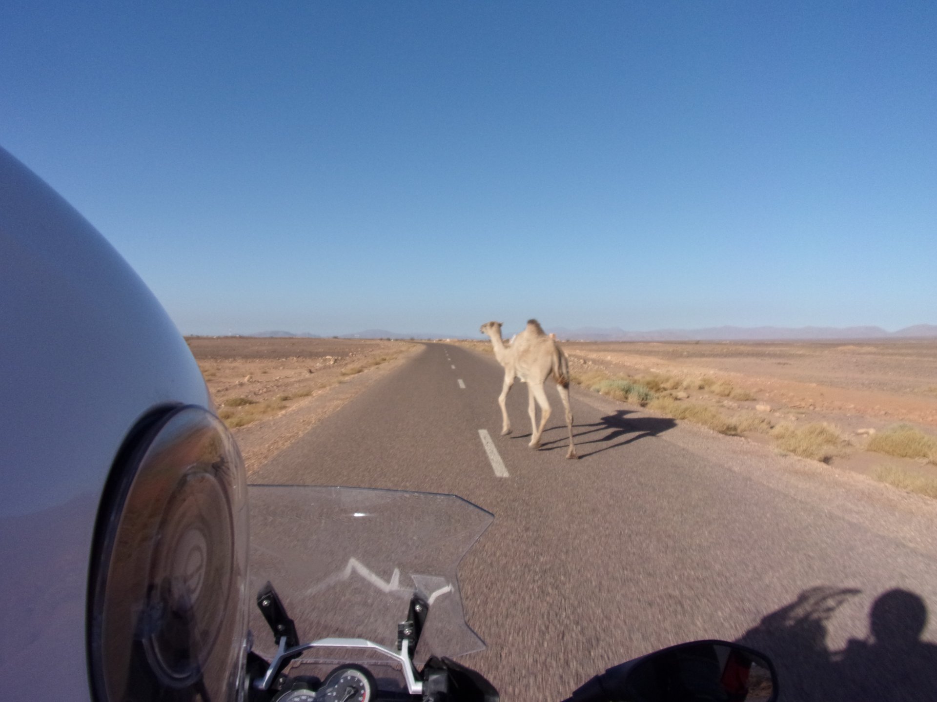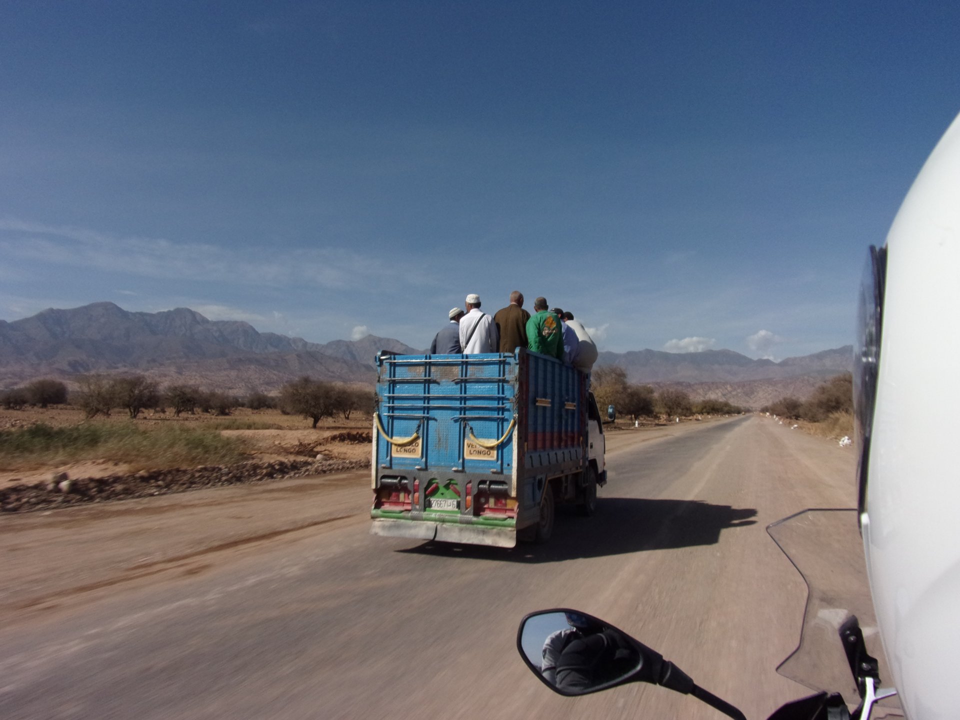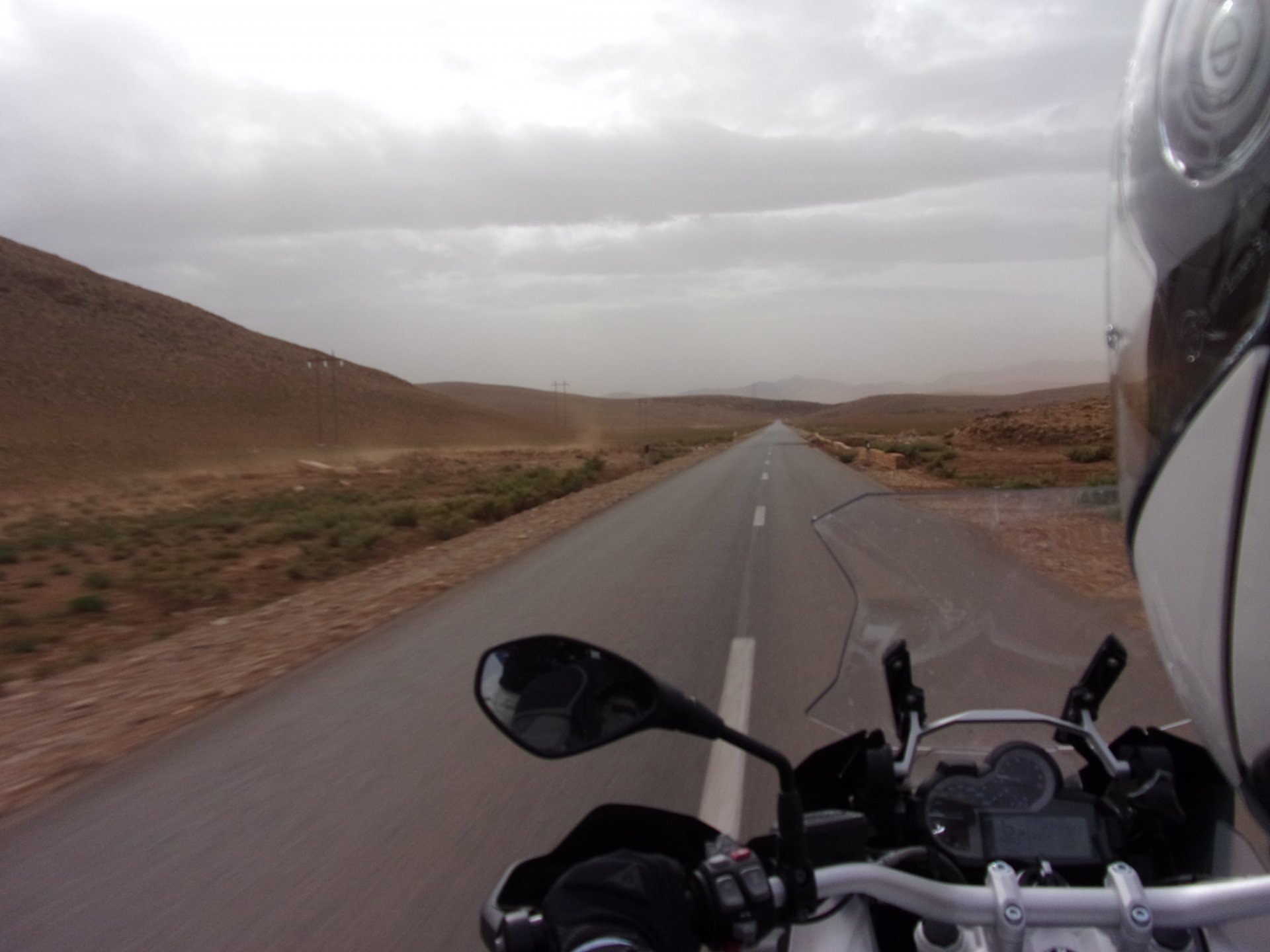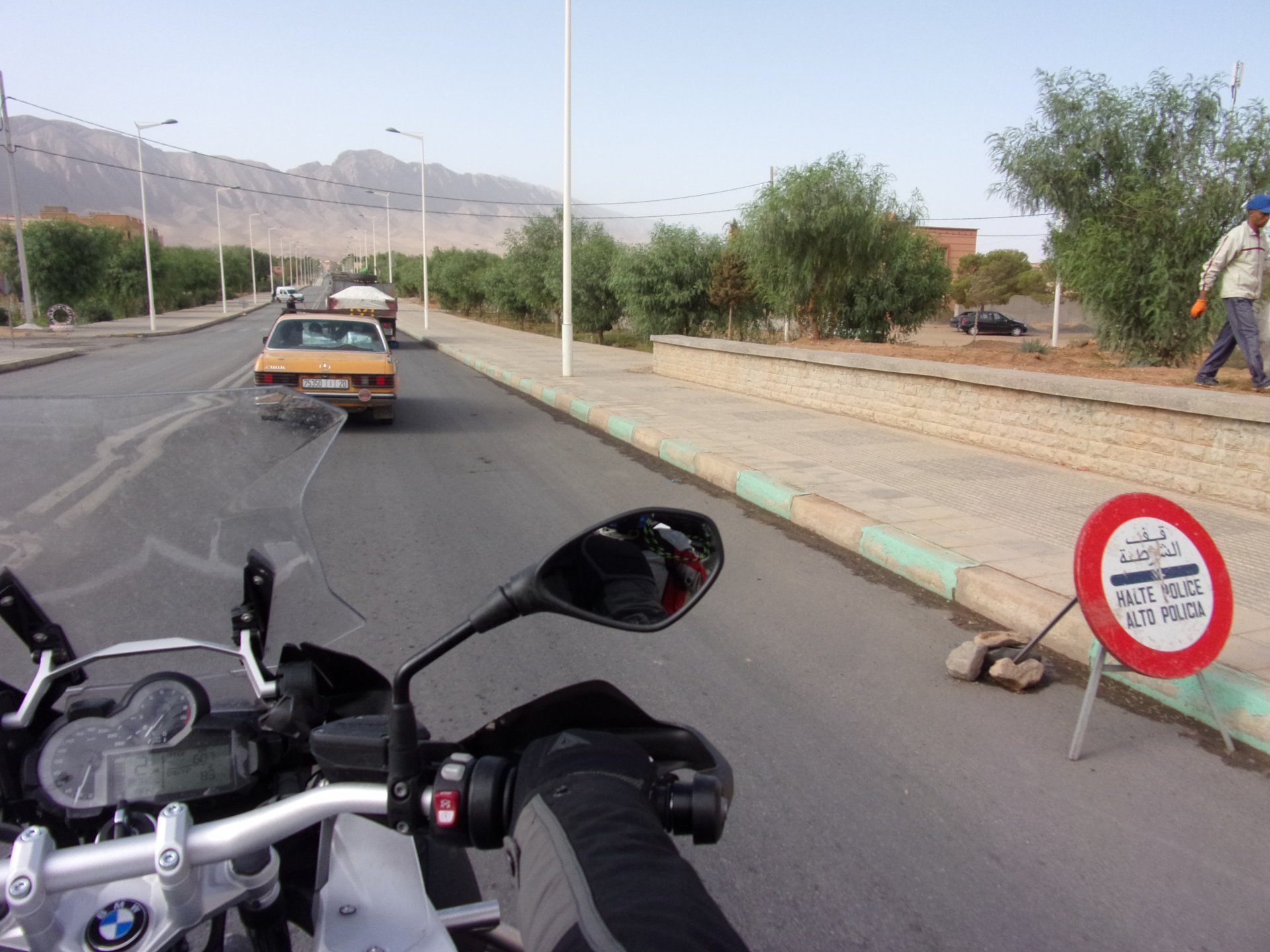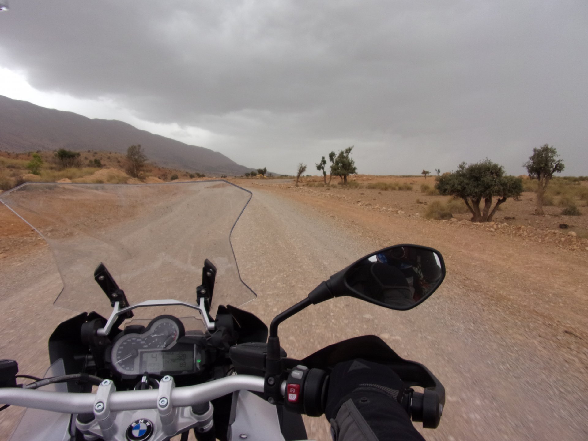 Morning, Fes, we decide to not go for the overpriced breakfast in our hotel and instead head out on the bike, knowing that there were a few cafes in our avenue. Few minutes later, and we're having great french style croissants, awesome orange juice and expresso. Take that Paris! We're next to a BNP, so Paris wins the big picture Efficiently, we make our way to visit our monkey friends. On the way there I stop to put on my shirt, it was a little cold and proper windy Today, we had shelled peanuts, and here I am taking the shells of peanuts to them hand them over to a monkey, I swear it's the same one from the first time. After sharing some snacks with my friend, we went on our way heading to Midelt via Itzer and Boumia. Weather threatened rain and it sure wasn't hot, I was glad to have been inspired by Rui to buy a more substantial jacket. Boumia is a small town in a pretty barren place, windswept high hills, but today was market day and you got people clearly coming from surrounding villages coming in, it was booming with trade. We stopped for lunch in a small cafe and had chicken, roasted on the rotisserie. If you're ever in Morocco in small villages in the middle of the mountains or desert, and are faced with a choice of what to eat, just have an omelette or the poulet roti. You'll eat the kind of chicken meat you used to get everywhere in Europe before it all turned to industrialized shit, it's amazing. We were very well greeted by a couple of traders having lunch on the table next to ours, and they liked it when I got up and went outside to start the bike and help some kids climb on it and give it a little honk. Made my day, and theirs as well. Coming in, we further impressed our next table friends by eating the chicken Moroccan style, meaning you peck at the meat with your fingers, dip it in the little sauce dish they serve next to it, and eat it with your fingers like that. I swear it tastes better that way. Didn't take pictures of that delicious lunch to try and not look like tourists Near Midelt, we tried to go to the Cirque de Jafaar again, but those dark clouds you saw in the previous pictures decided to open up with pretty strong rain and thunder. We didn't want to be stuck in a small flood or mud, so got out of there: On the first chance we had, we stopped under a gas station cover and sheltered for the worst if it. We were already in plastic overalls and properly wet outside, so no pictures. It was getting to mid afternoon, and we were a little damp, so headed for the same hotel we had visited before. Even though it wasn't very hot, the rain had passed, the skies opened up a little, so I went for my afternoon dip in a pool, trying not to loose the tradition. That water was cold, like you'd expect. Having a stroll through the property, we might have encountered relatives of our dinner: Donut remember what we had, but Maria had recently taken off her teeth corrective braces and was delighted at her perfect bite mark. We slept soundly, like you do when it's a little cold at night. The day after we would have one of the greatest biking days ever, with everything I love about riding in Morocco in one single day.