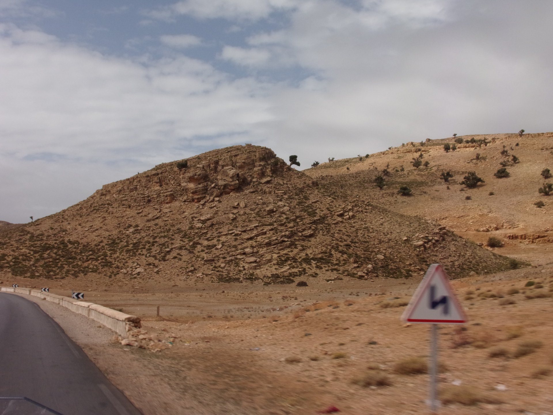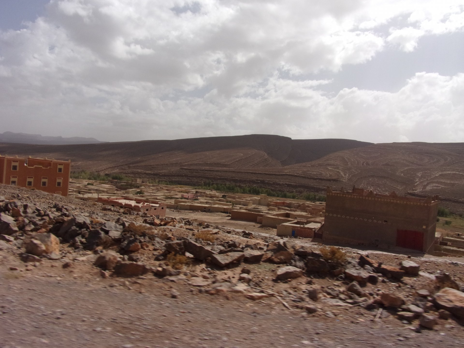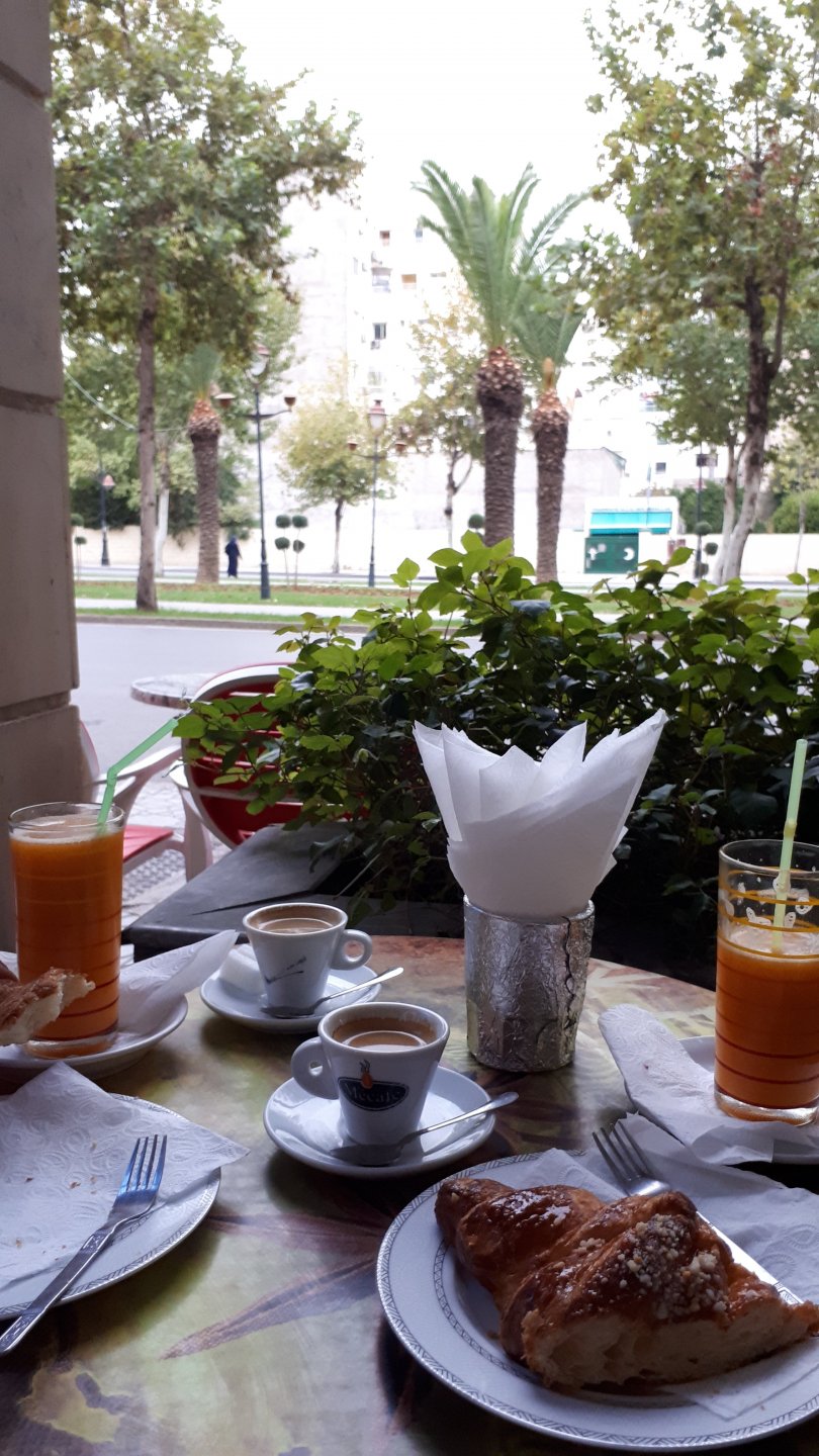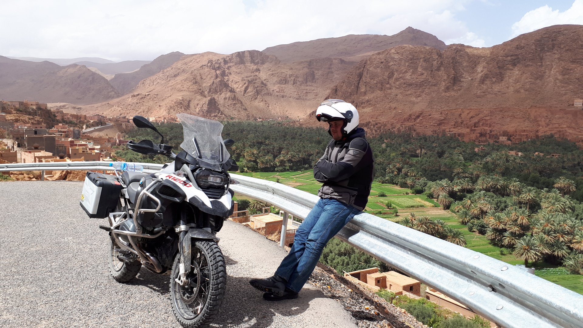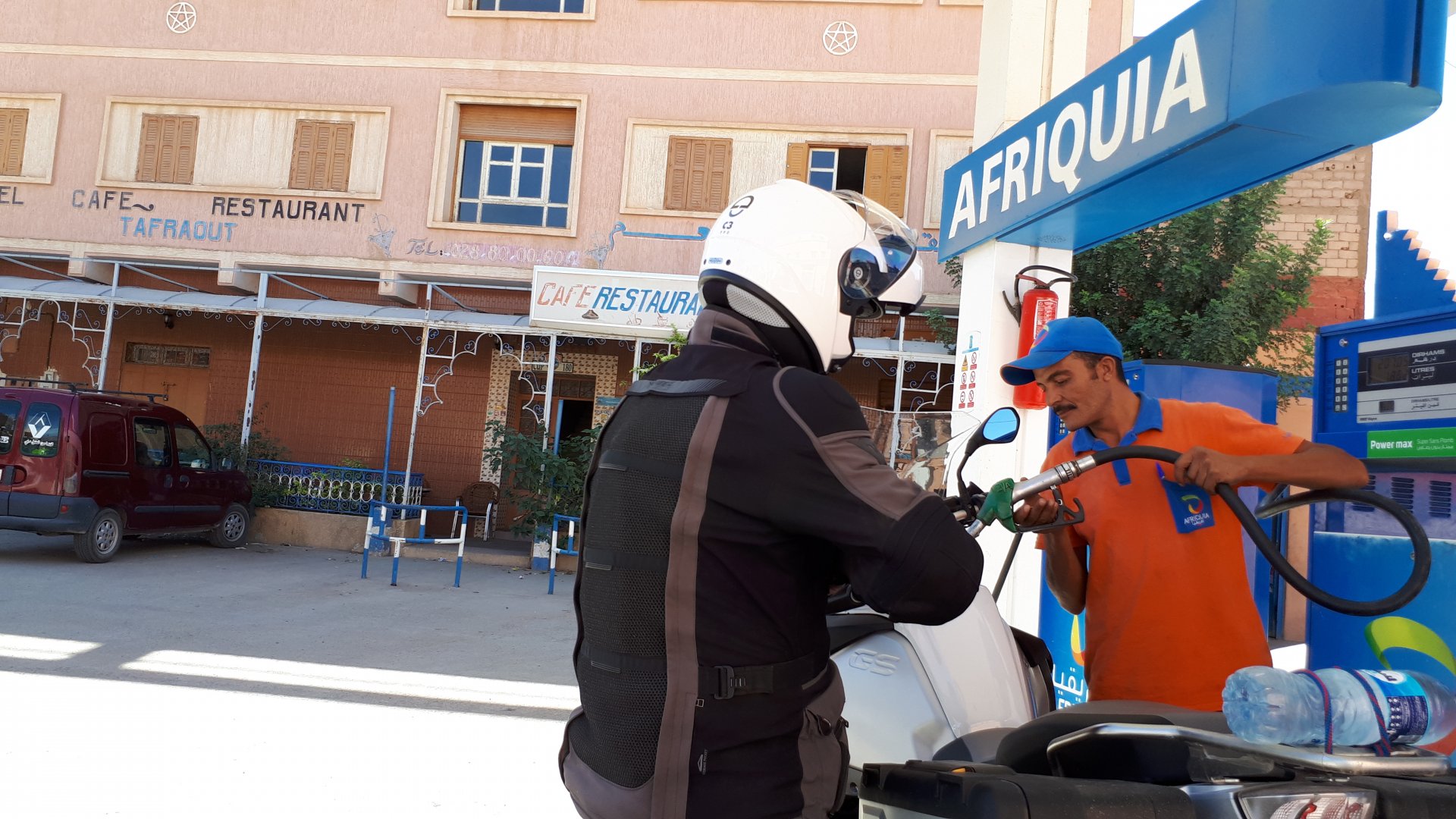 Morning, Fes, we decide to not go for the overpriced breakfast in our hotel and instead head out on the bike, knowing that there were a few cafes in our avenue. Few minutes later, and we're having great french style croissants, awesome orange juice and expresso. Take that Paris! We're next to a BNP, so Paris wins the big picture Efficiently, we make our way to visit our monkey friends. On the way there I stop to put on my shirt, it was a little cold and proper windy Today, we had shelled peanuts, and here I am taking the shells of peanuts to them hand them over to a monkey, I swear it's the same one from the first time. After sharing some snacks with my friend, we went on our way heading to Midelt via Itzer and Boumia. Weather threatened rain and it sure wasn't hot, I was glad to have been inspired by Rui to buy a more substantial jacket. Boumia is a small town in a pretty barren place, windswept high hills, but today was market day and you got people clearly coming from surrounding villages coming in, it was booming with trade. We stopped for lunch in a small cafe and had chicken, roasted on the rotisserie. If you're ever in Morocco in small villages in the middle of the mountains or desert, and are faced with a choice of what to eat, just have an omelette or the poulet roti. You'll eat the kind of chicken meat you used to get everywhere in Europe before it all turned to industrialized shit, it's amazing. We were very well greeted by a couple of traders having lunch on the table next to ours, and they liked it when I got up and went outside to start the bike and help some kids climb on it and give it a little honk. Made my day, and theirs as well. Coming in, we further impressed our next table friends by eating the chicken Moroccan style, meaning you peck at the meat with your fingers, dip it in the little sauce dish they serve next to it, and eat it with your fingers like that. I swear it tastes better that way. Didn't take pictures of that delicious lunch to try and not look like tourists Near Midelt, we tried to go to the Cirque de Jafaar again, but those dark clouds you saw in the previous pictures decided to open up with pretty strong rain and thunder. We didn't want to be stuck in a small flood or mud, so got out of there: On the first chance we had, we stopped under a gas station cover and sheltered for the worst if it. We were already in plastic overalls and properly wet outside, so no pictures. It was getting to mid afternoon, and we were a little damp, so headed for the same hotel we had visited before. Even though it wasn't very hot, the rain had passed, the skies opened up a little, so I went for my afternoon dip in a pool, trying not to loose the tradition. That water was cold, like you'd expect. Having a stroll through the property, we might have encountered relatives of our dinner: Donut remember what we had, but Maria had recently taken off her teeth corrective braces and was delighted at her perfect bite mark. We slept soundly, like you do when it's a little cold at night. The day after we would have one of the greatest biking days ever, with everything I love about riding in Morocco in one single day.