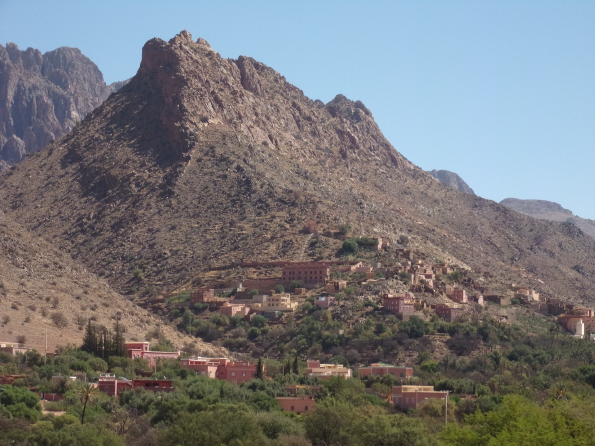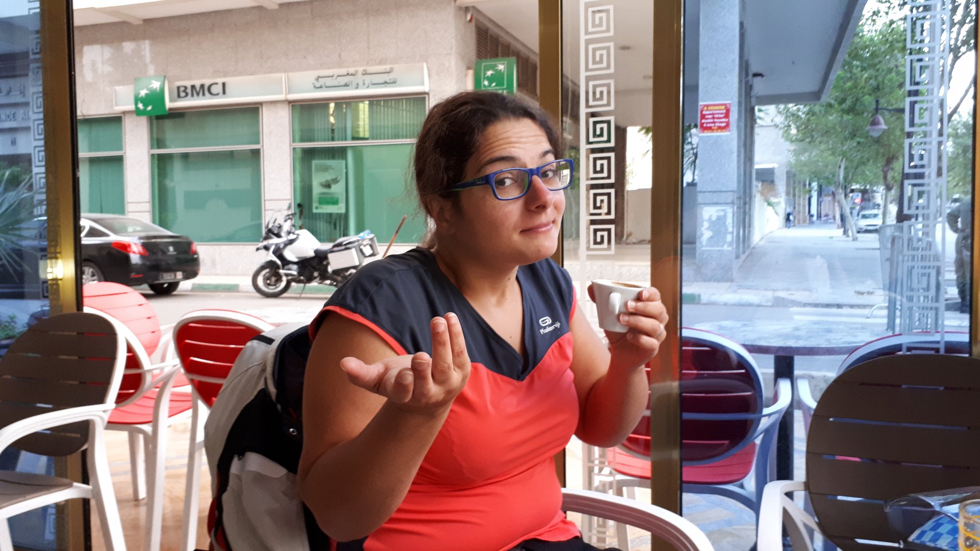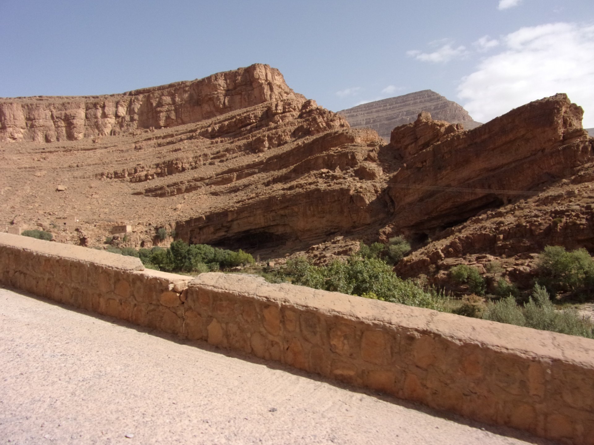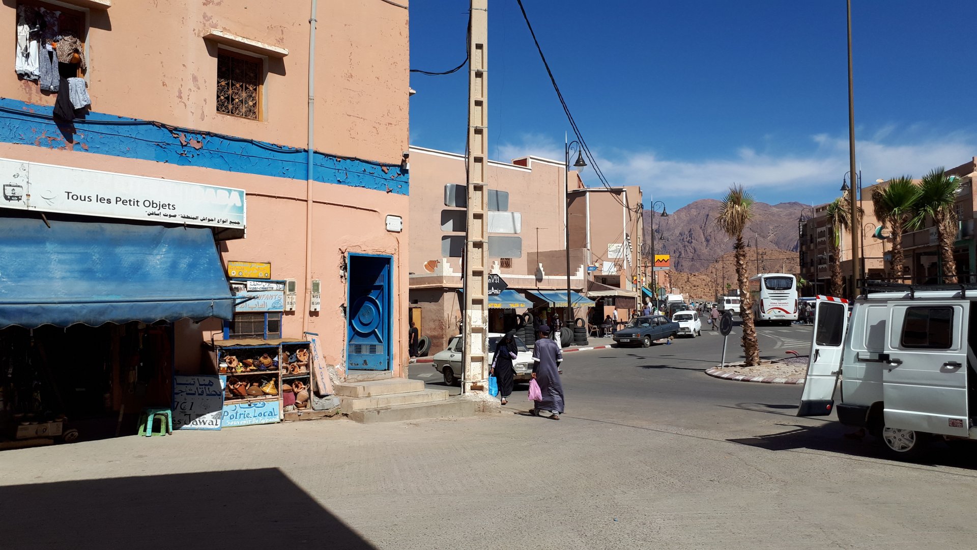 Morning, Fes, we decide to not go for the overpriced breakfast in our hotel and instead head out on the bike, knowing that there were a few cafes in our avenue. Few minutes later, and we're having great french style croissants, awesome orange juice and expresso. Take that Paris! We're next to a BNP, so Paris wins the big picture Efficiently, we make our way to visit our monkey friends. On the way there I stop to put on my shirt, it was a little cold and proper windy Today, we had shelled peanuts, and here I am taking the shells of peanuts to them hand them over to a monkey, I swear it's the same one from the first time. After sharing some snacks with my friend, we went on our way heading to Midelt via Itzer and Boumia. Weather threatened rain and it sure wasn't hot, I was glad to have been inspired by Rui to buy a more substantial jacket. Boumia is a small town in a pretty barren place, windswept high hills, but today was market day and you got people clearly coming from surrounding villages coming in, it was booming with trade. We stopped for lunch in a small cafe and had chicken, roasted on the rotisserie. If you're ever in Morocco in small villages in the middle of the mountains or desert, and are faced with a choice of what to eat, just have an omelette or the poulet roti. You'll eat the kind of chicken meat you used to get everywhere in Europe before it all turned to industrialized shit, it's amazing. We were very well greeted by a couple of traders having lunch on the table next to ours, and they liked it when I got up and went outside to start the bike and help some kids climb on it and give it a little honk. Made my day, and theirs as well. Coming in, we further impressed our next table friends by eating the chicken Moroccan style, meaning you peck at the meat with your fingers, dip it in the little sauce dish they serve next to it, and eat it with your fingers like that. I swear it tastes better that way. Didn't take pictures of that delicious lunch to try and not look like tourists Near Midelt, we tried to go to the Cirque de Jafaar again, but those dark clouds you saw in the previous pictures decided to open up with pretty strong rain and thunder. We didn't want to be stuck in a small flood or mud, so got out of there: On the first chance we had, we stopped under a gas station cover and sheltered for the worst if it. We were already in plastic overalls and properly wet outside, so no pictures. It was getting to mid afternoon, and we were a little damp, so headed for the same hotel we had visited before. Even though it wasn't very hot, the rain had passed, the skies opened up a little, so I went for my afternoon dip in a pool, trying not to loose the tradition. That water was cold, like you'd expect. Having a stroll through the property, we might have encountered relatives of our dinner: Donut remember what we had, but Maria had recently taken off her teeth corrective braces and was delighted at her perfect bite mark. We slept soundly, like you do when it's a little cold at night. The day after we would have one of the greatest biking days ever, with everything I love about riding in Morocco in one single day.