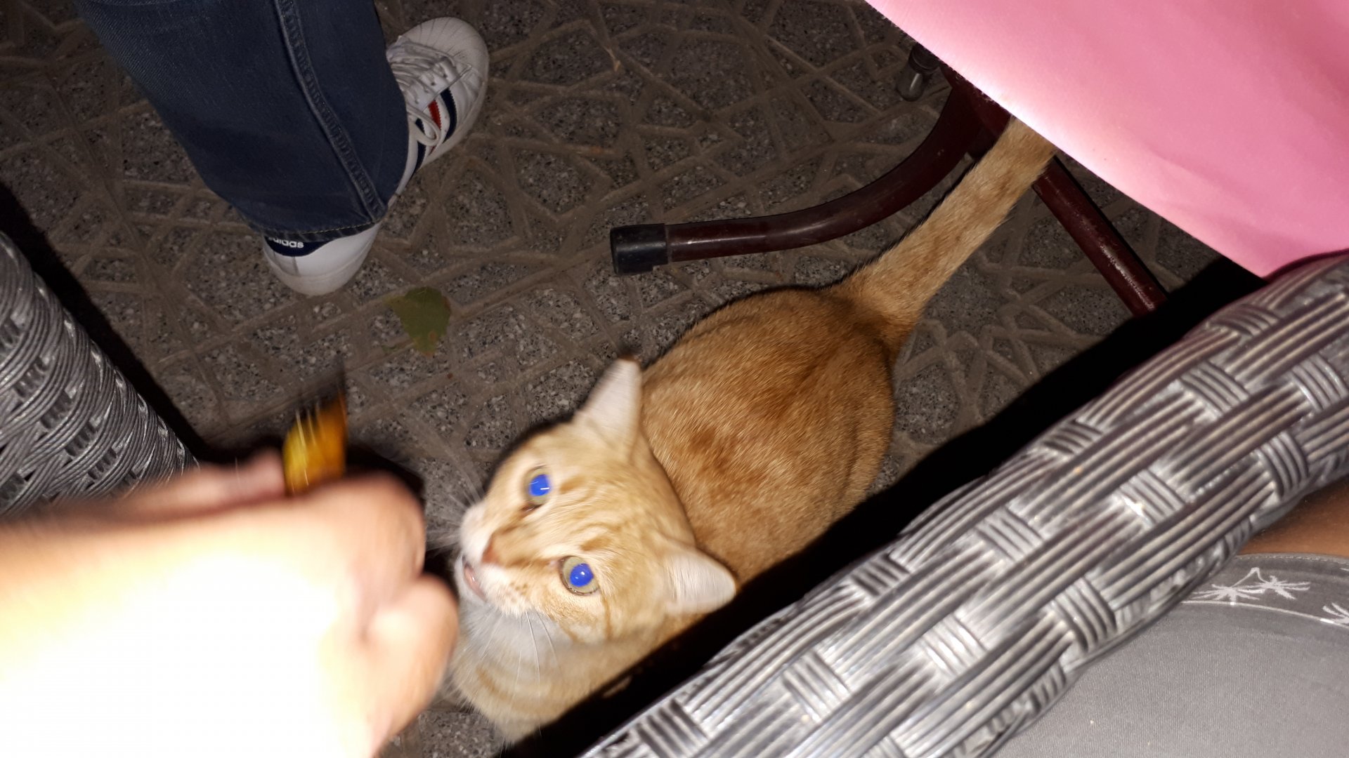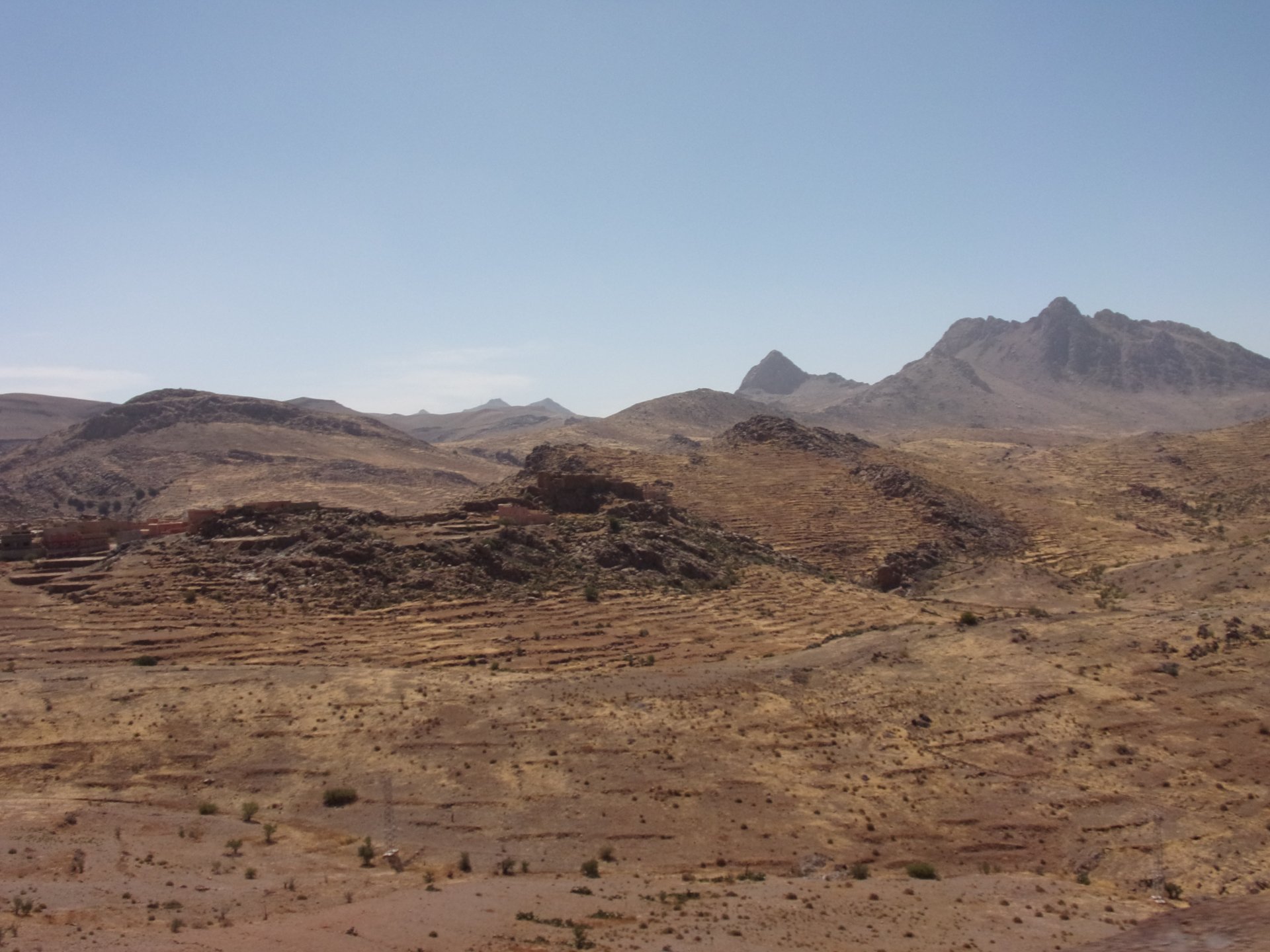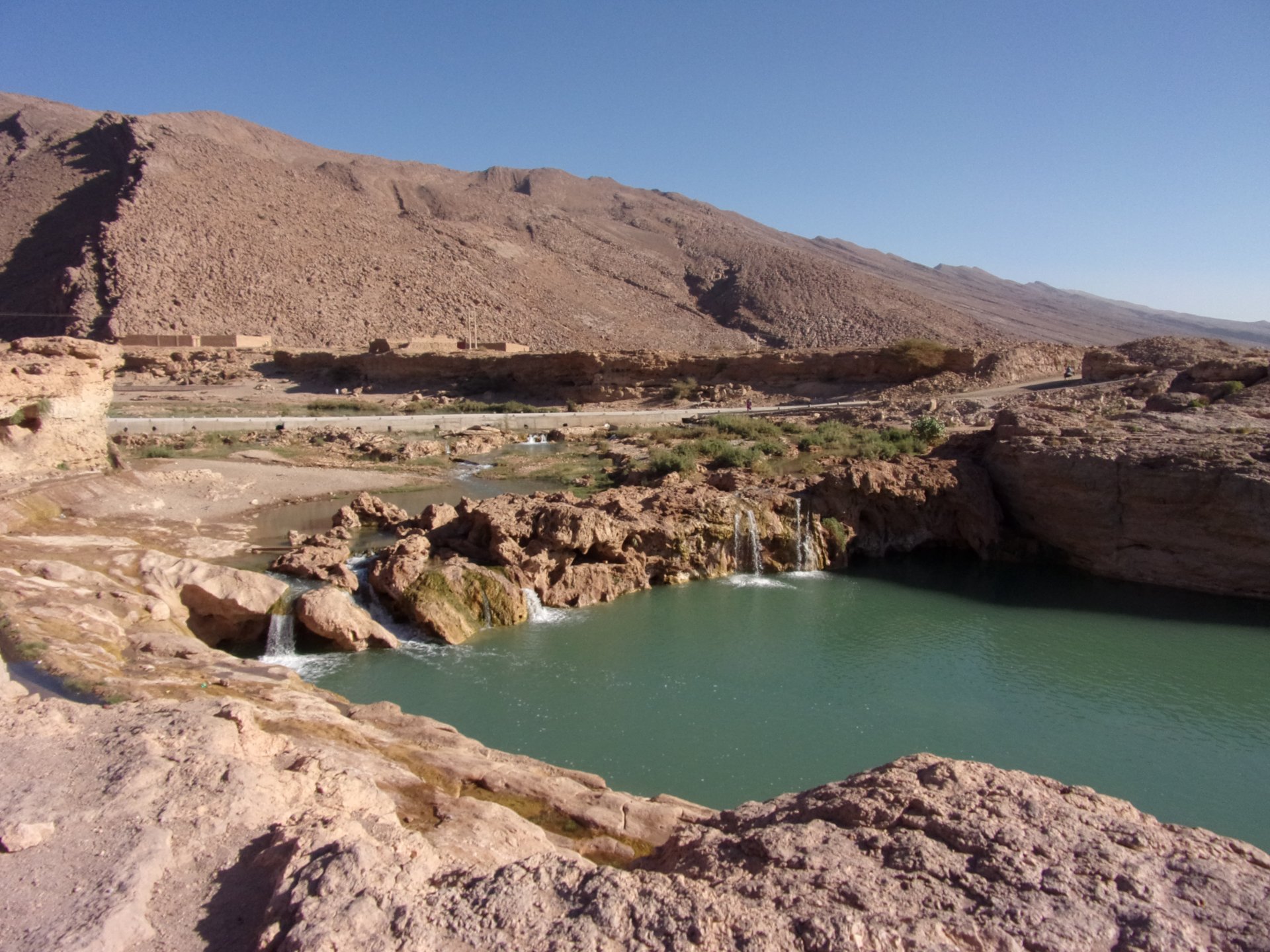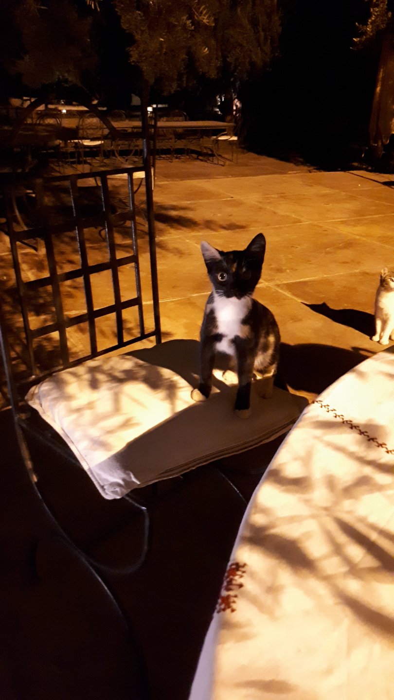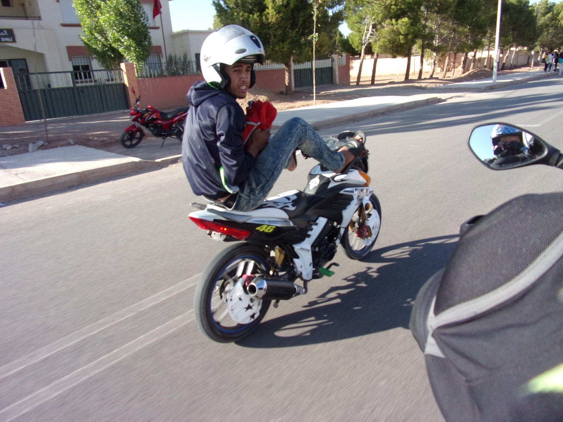 Morning, Fes, we decide to not go for the overpriced breakfast in our hotel and instead head out on the bike, knowing that there were a few cafes in our avenue. Few minutes later, and we're having great french style croissants, awesome orange juice and expresso. Take that Paris! We're next to a BNP, so Paris wins the big picture Efficiently, we make our way to visit our monkey friends. On the way there I stop to put on my shirt, it was a little cold and proper windy Today, we had shelled peanuts, and here I am taking the shells of peanuts to them hand them over to a monkey, I swear it's the same one from the first time. After sharing some snacks with my friend, we went on our way heading to Midelt via Itzer and Boumia. Weather threatened rain and it sure wasn't hot, I was glad to have been inspired by Rui to buy a more substantial jacket. Boumia is a small town in a pretty barren place, windswept high hills, but today was market day and you got people clearly coming from surrounding villages coming in, it was booming with trade. We stopped for lunch in a small cafe and had chicken, roasted on the rotisserie. If you're ever in Morocco in small villages in the middle of the mountains or desert, and are faced with a choice of what to eat, just have an omelette or the poulet roti. You'll eat the kind of chicken meat you used to get everywhere in Europe before it all turned to industrialized shit, it's amazing. We were very well greeted by a couple of traders having lunch on the table next to ours, and they liked it when I got up and went outside to start the bike and help some kids climb on it and give it a little honk. Made my day, and theirs as well. Coming in, we further impressed our next table friends by eating the chicken Moroccan style, meaning you peck at the meat with your fingers, dip it in the little sauce dish they serve next to it, and eat it with your fingers like that. I swear it tastes better that way. Didn't take pictures of that delicious lunch to try and not look like tourists Near Midelt, we tried to go to the Cirque de Jafaar again, but those dark clouds you saw in the previous pictures decided to open up with pretty strong rain and thunder. We didn't want to be stuck in a small flood or mud, so got out of there: On the first chance we had, we stopped under a gas station cover and sheltered for the worst if it. We were already in plastic overalls and properly wet outside, so no pictures. It was getting to mid afternoon, and we were a little damp, so headed for the same hotel we had visited before. Even though it wasn't very hot, the rain had passed, the skies opened up a little, so I went for my afternoon dip in a pool, trying not to loose the tradition. That water was cold, like you'd expect. Having a stroll through the property, we might have encountered relatives of our dinner: Donut remember what we had, but Maria had recently taken off her teeth corrective braces and was delighted at her perfect bite mark. We slept soundly, like you do when it's a little cold at night. The day after we would have one of the greatest biking days ever, with everything I love about riding in Morocco in one single day.