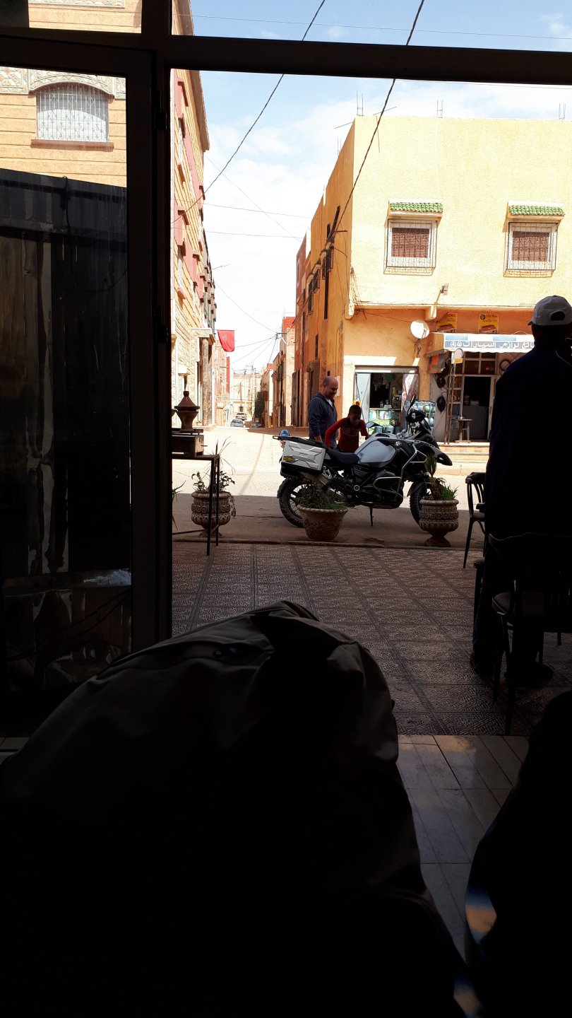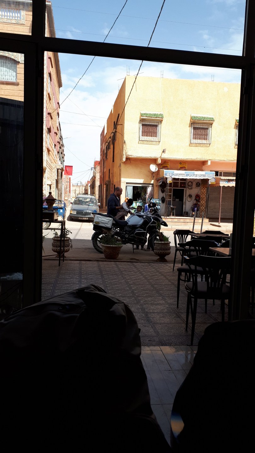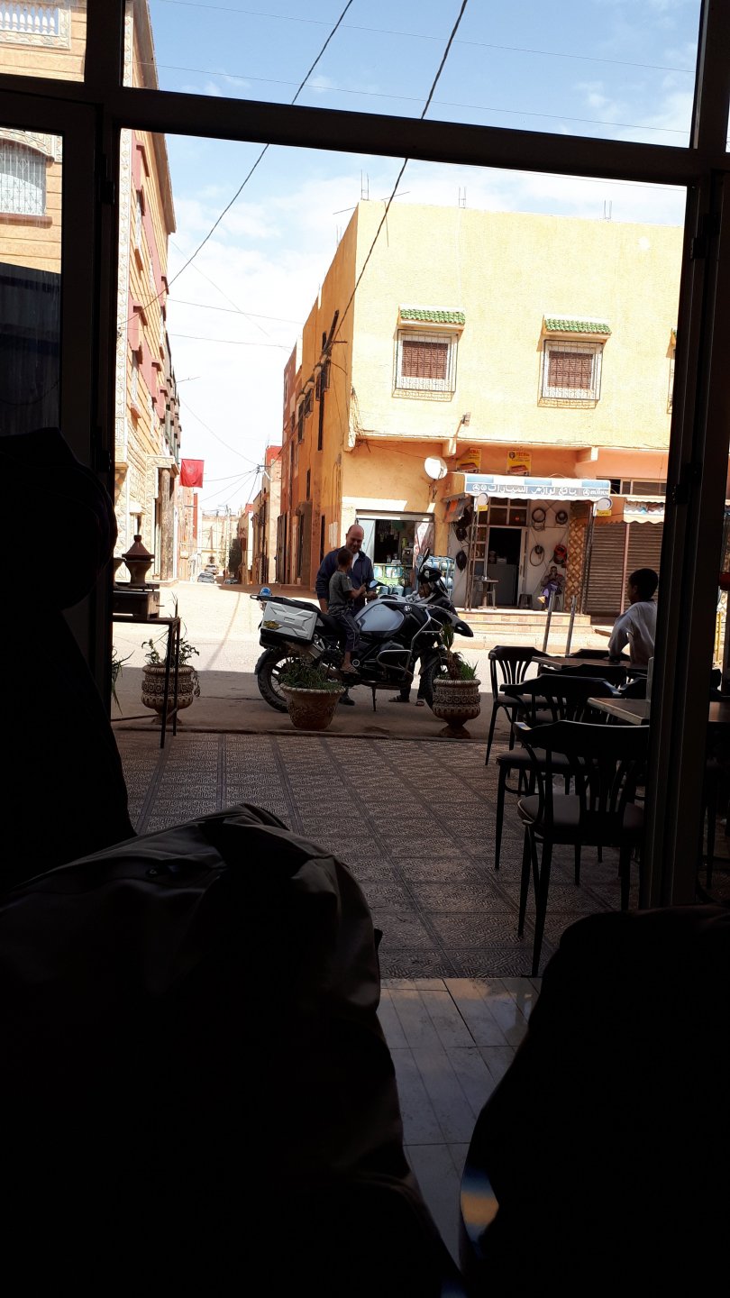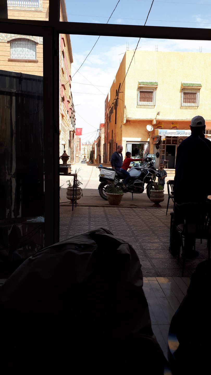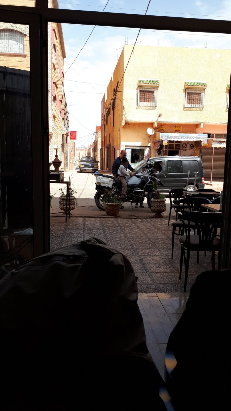 Breakfast was very nice, I mostly ate fruit trying to anticipate a warm day. We planned to going south to Tan Tan, checking it out, have a coffee, and ride back to Guelmim and stay back in the same hotel. Tan Tan was only 100km away so we could have gone further down, but I think that from here on south you're only really going if you want to continue heading to Mauritania, or at least to the border. We were both a little tired so could use an easy day with some rest in the afternoon. As we left for Tan Tan it was pretty foggy, but we assumed it would clear quite soon, we did almost the entire trip there under wet fog, our rain gear was at the hotel in the luggage. The road between Guelmim and Tan Tan has got a lot of three things: fish smell, slow moving, and traffic going further south to Africa. The fish smell comes out of nowhere next to some clearings by the side of the road where trucks carrying fish from Tan Tan's harbor empty their unfrozen ice, then the sun cooks that and the remaining smell is interesting because there is no ocean to be seen. Slow moving Land Rovers on old worn out leaf springs, carrying cargo or passengers at 60kmh, trudging along at a pace of a time gone past, driver patiently waiting out the trip in a car with no space for his elbow with a window that only slides open halfway in a car that is passed by every big truck, in over 40ºC heat, bless them! Here you see cars and trucks with license plates that I had never seen before, heading south to Mauritanica, Senegal, etc, feels exotic and something about the "body language" of these cars gives away that they know how long the trip is going to take regardless of being in a hurry or not. The fog eventually clears and we have a little bit of sunshine Tan Tan! Still pretty wet here. Nothing really noticeable about Tan Tan except that I created a little chaos by riding into the customs part of the harbor like it was a normal road. Got properly told off, and then waved by with a smile. After our coffee, which did it's job of warming us a little, we headed back for lunch at Guelmim Poulet Roti, my favourite: Little bit early after lunch, so we explored a little around the surroundings of Guelmim, and went to the beach And again, time to soak up We had dinner at the hotel and Maria ordered lasagna while trying to each something "normal", she gasped at her portion The next day, we'd have mountains again ...