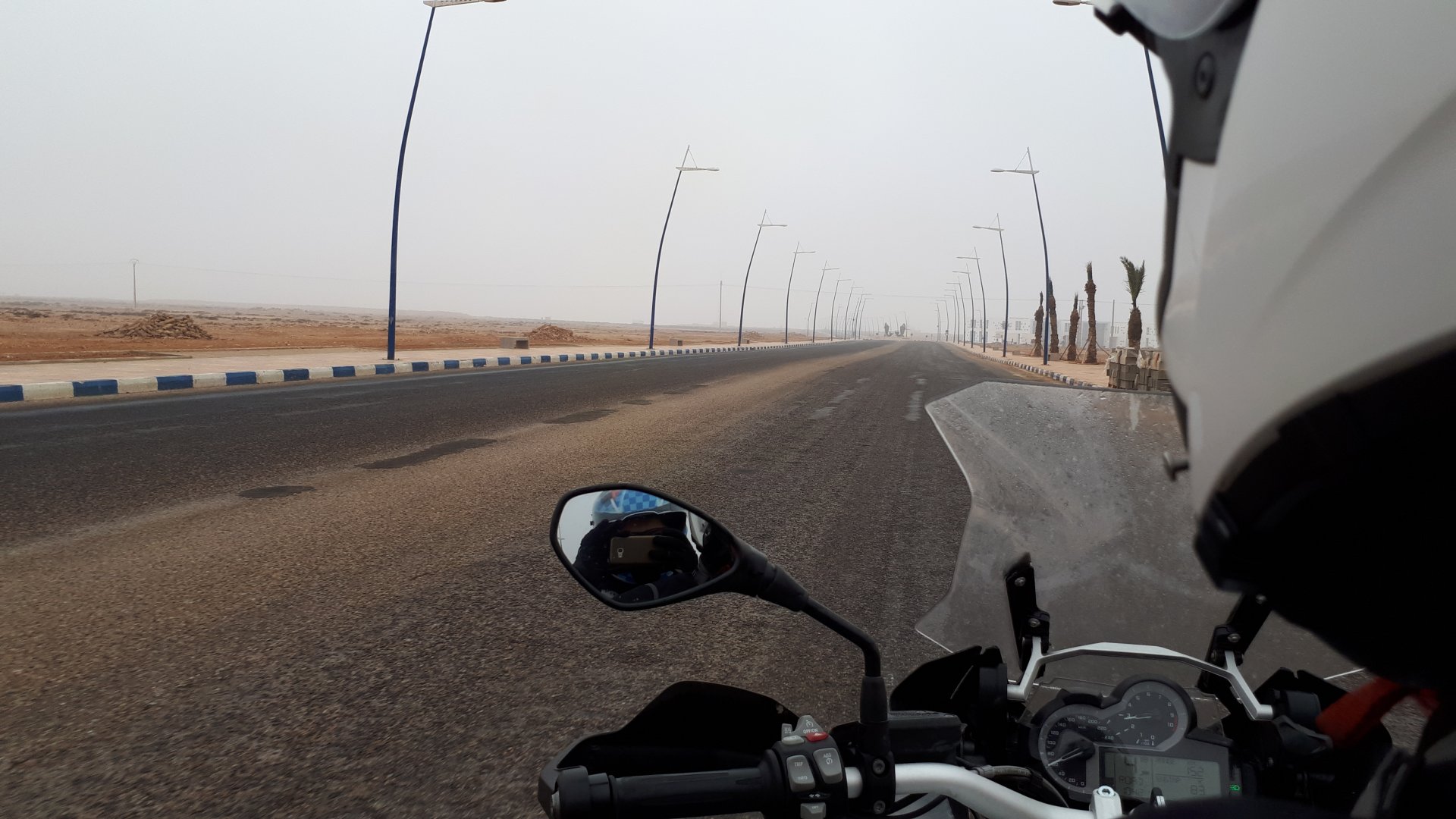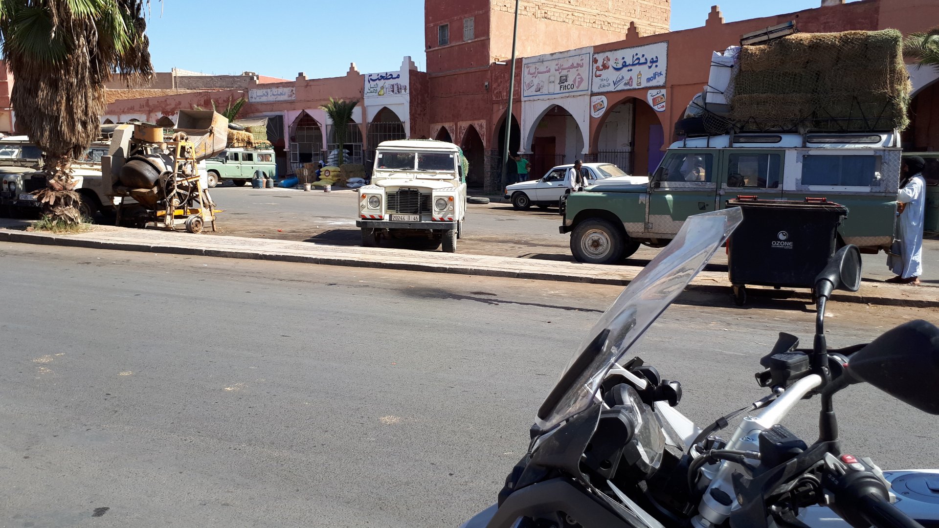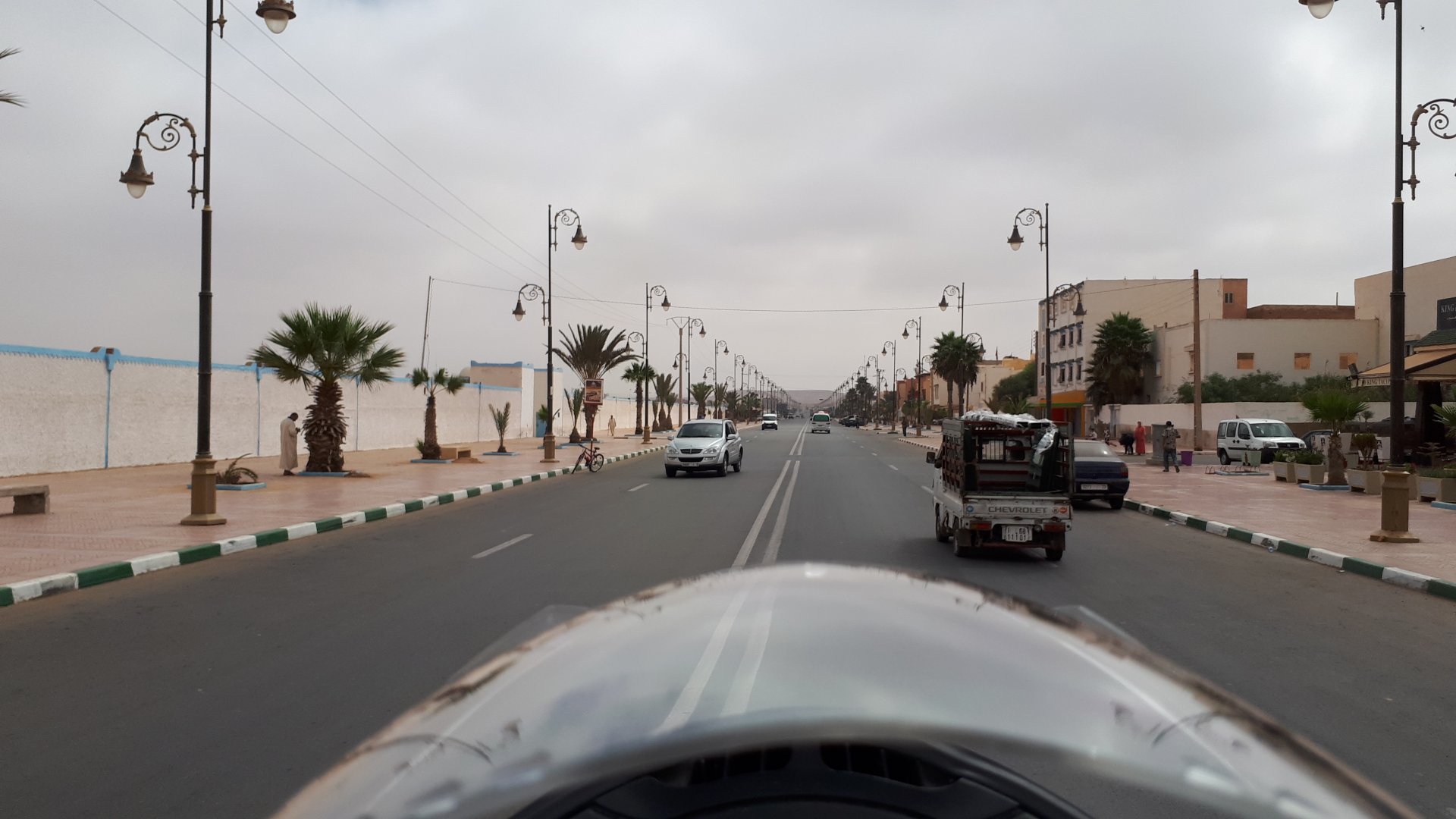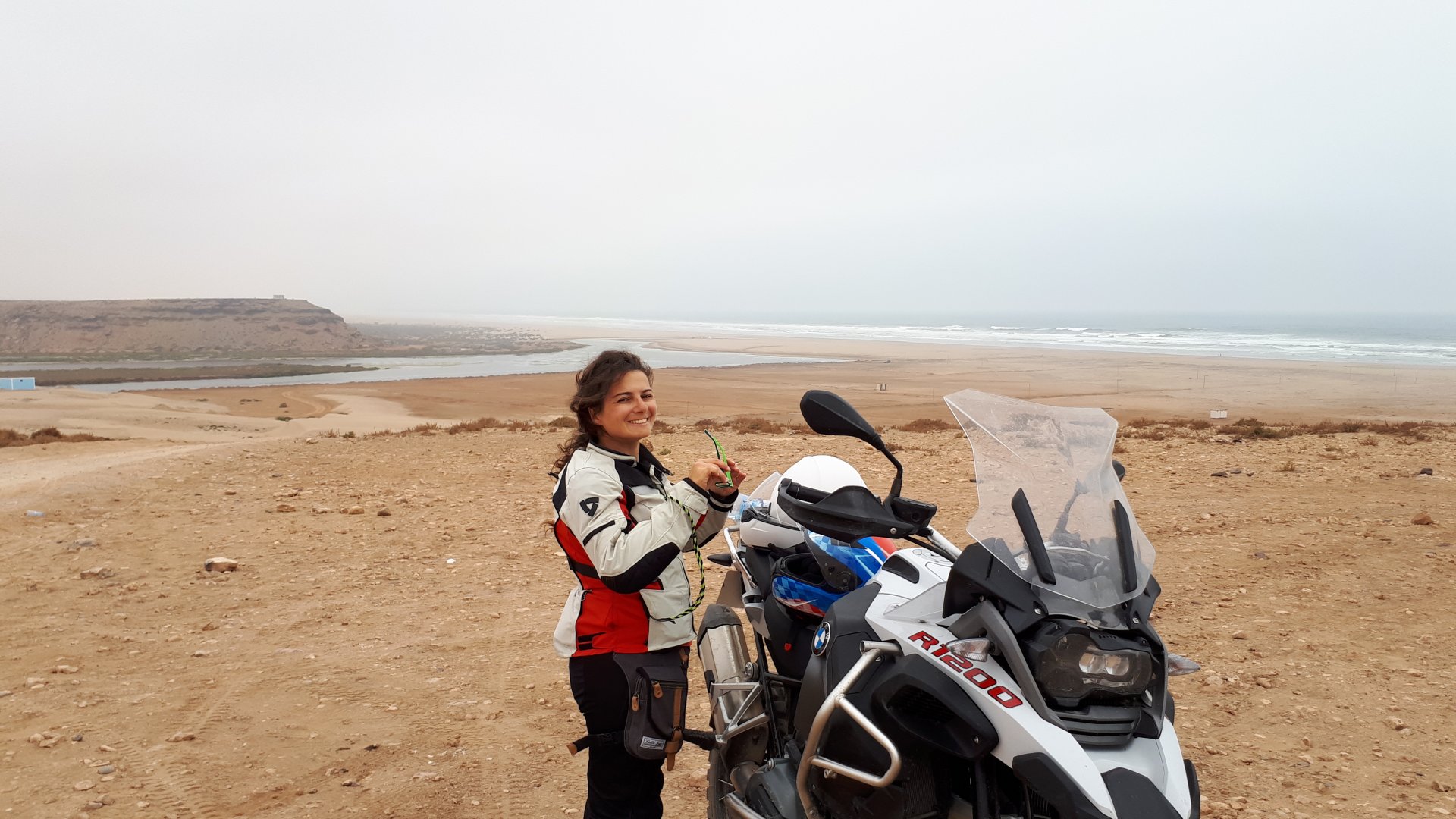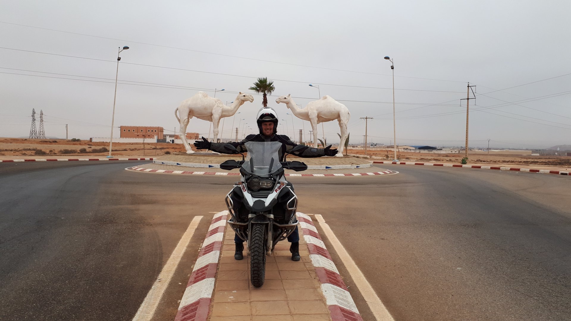 Breakfast was very nice, I mostly ate fruit trying to anticipate a warm day. We planned to going south to Tan Tan, checking it out, have a coffee, and ride back to Guelmim and stay back in the same hotel. Tan Tan was only 100km away so we could have gone further down, but I think that from here on south you're only really going if you want to continue heading to Mauritania, or at least to the border. We were both a little tired so could use an easy day with some rest in the afternoon. As we left for Tan Tan it was pretty foggy, but we assumed it would clear quite soon, we did almost the entire trip there under wet fog, our rain gear was at the hotel in the luggage. The road between Guelmim and Tan Tan has got a lot of three things: fish smell, slow moving, and traffic going further south to Africa. The fish smell comes out of nowhere next to some clearings by the side of the road where trucks carrying fish from Tan Tan's harbor empty their unfrozen ice, then the sun cooks that and the remaining smell is interesting because there is no ocean to be seen. Slow moving Land Rovers on old worn out leaf springs, carrying cargo or passengers at 60kmh, trudging along at a pace of a time gone past, driver patiently waiting out the trip in a car with no space for his elbow with a window that only slides open halfway in a car that is passed by every big truck, in over 40ºC heat, bless them! Here you see cars and trucks with license plates that I had never seen before, heading south to Mauritanica, Senegal, etc, feels exotic and something about the "body language" of these cars gives away that they know how long the trip is going to take regardless of being in a hurry or not. The fog eventually clears and we have a little bit of sunshine Tan Tan! Still pretty wet here. Nothing really noticeable about Tan Tan except that I created a little chaos by riding into the customs part of the harbor like it was a normal road. Got properly told off, and then waved by with a smile. After our coffee, which did it's job of warming us a little, we headed back for lunch at Guelmim Poulet Roti, my favourite: Little bit early after lunch, so we explored a little around the surroundings of Guelmim, and went to the beach And again, time to soak up We had dinner at the hotel and Maria ordered lasagna while trying to each something "normal", she gasped at her portion The next day, we'd have mountains again ...