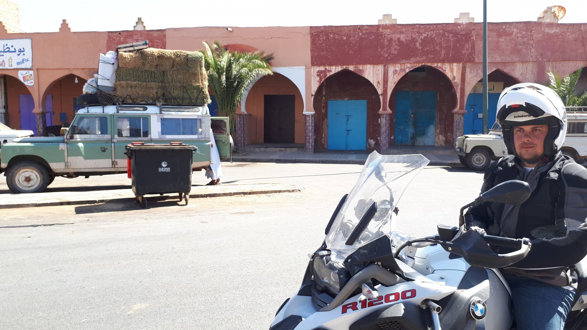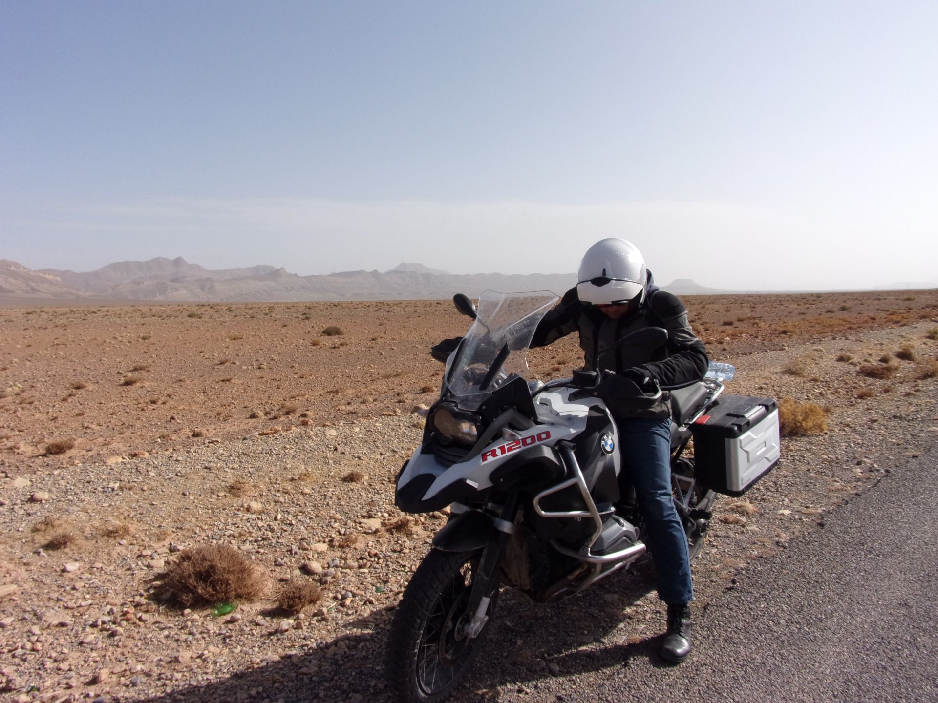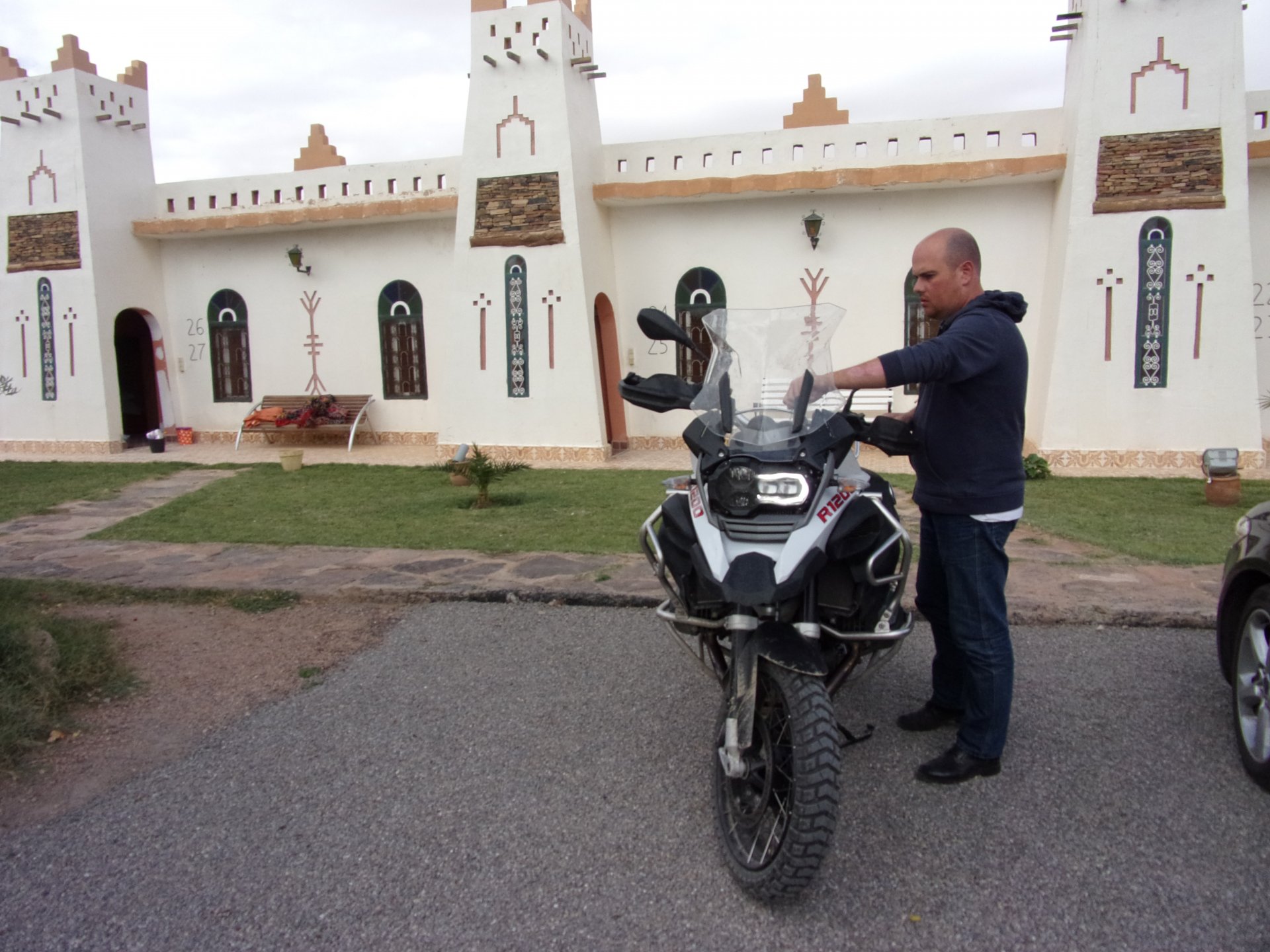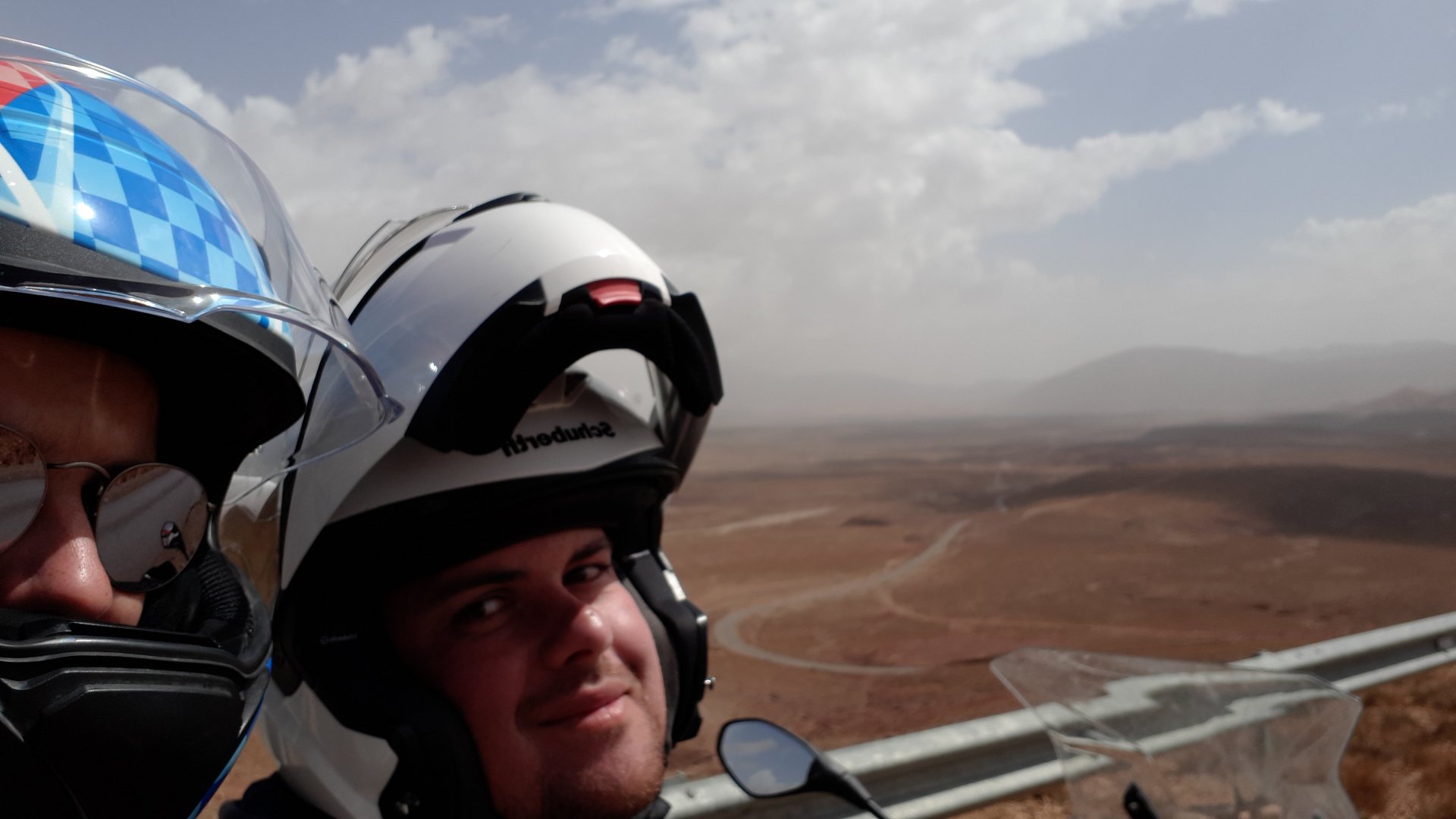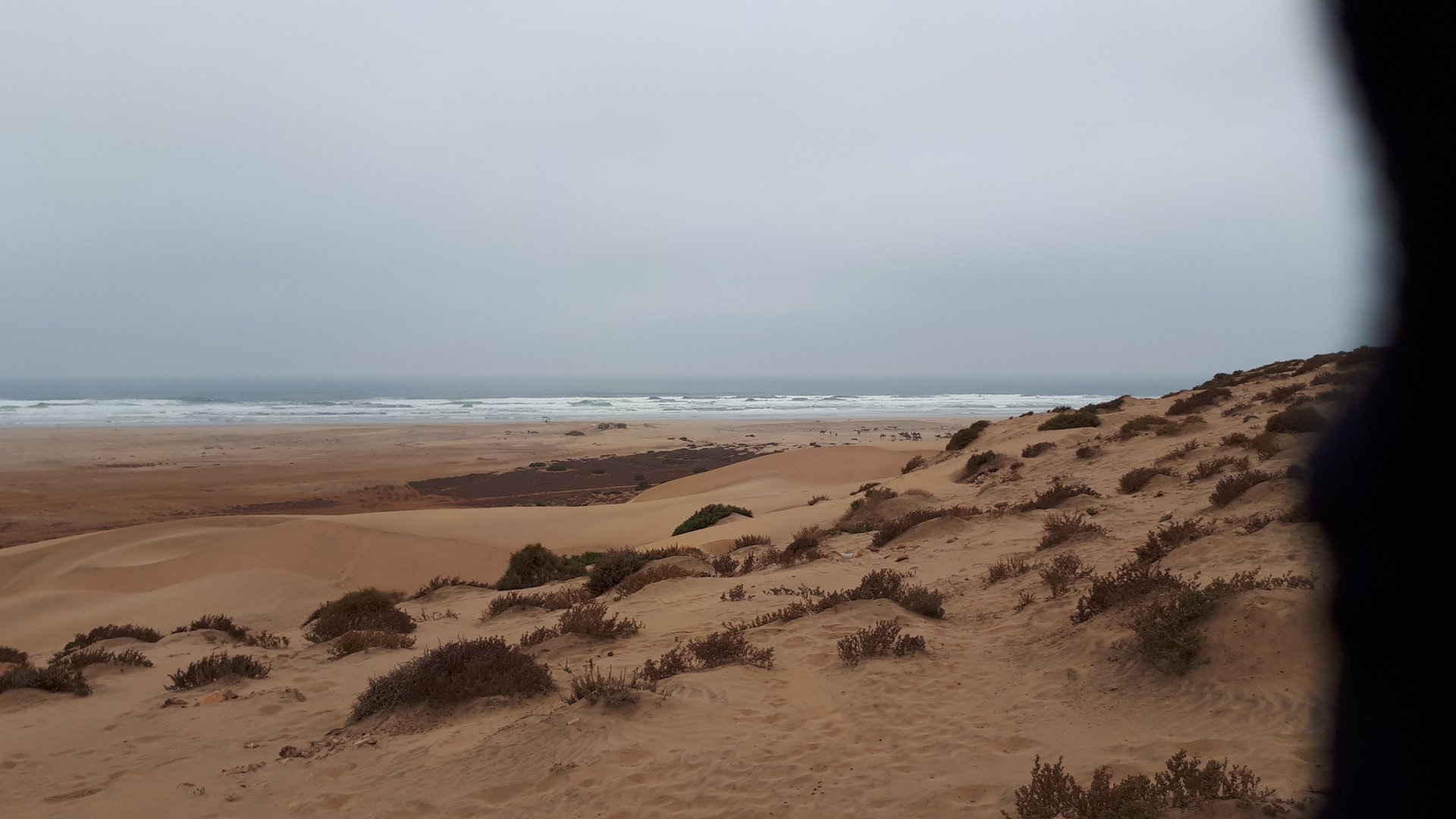 Breakfast was very nice, I mostly ate fruit trying to anticipate a warm day. We planned to going south to Tan Tan, checking it out, have a coffee, and ride back to Guelmim and stay back in the same hotel. Tan Tan was only 100km away so we could have gone further down, but I think that from here on south you're only really going if you want to continue heading to Mauritania, or at least to the border. We were both a little tired so could use an easy day with some rest in the afternoon. As we left for Tan Tan it was pretty foggy, but we assumed it would clear quite soon, we did almost the entire trip there under wet fog, our rain gear was at the hotel in the luggage. The road between Guelmim and Tan Tan has got a lot of three things: fish smell, slow moving, and traffic going further south to Africa. The fish smell comes out of nowhere next to some clearings by the side of the road where trucks carrying fish from Tan Tan's harbor empty their unfrozen ice, then the sun cooks that and the remaining smell is interesting because there is no ocean to be seen. Slow moving Land Rovers on old worn out leaf springs, carrying cargo or passengers at 60kmh, trudging along at a pace of a time gone past, driver patiently waiting out the trip in a car with no space for his elbow with a window that only slides open halfway in a car that is passed by every big truck, in over 40ºC heat, bless them! Here you see cars and trucks with license plates that I had never seen before, heading south to Mauritanica, Senegal, etc, feels exotic and something about the "body language" of these cars gives away that they know how long the trip is going to take regardless of being in a hurry or not. The fog eventually clears and we have a little bit of sunshine Tan Tan! Still pretty wet here. Nothing really noticeable about Tan Tan except that I created a little chaos by riding into the customs part of the harbor like it was a normal road. Got properly told off, and then waved by with a smile. After our coffee, which did it's job of warming us a little, we headed back for lunch at Guelmim Poulet Roti, my favourite: Little bit early after lunch, so we explored a little around the surroundings of Guelmim, and went to the beach And again, time to soak up We had dinner at the hotel and Maria ordered lasagna while trying to each something "normal", she gasped at her portion The next day, we'd have mountains again ...