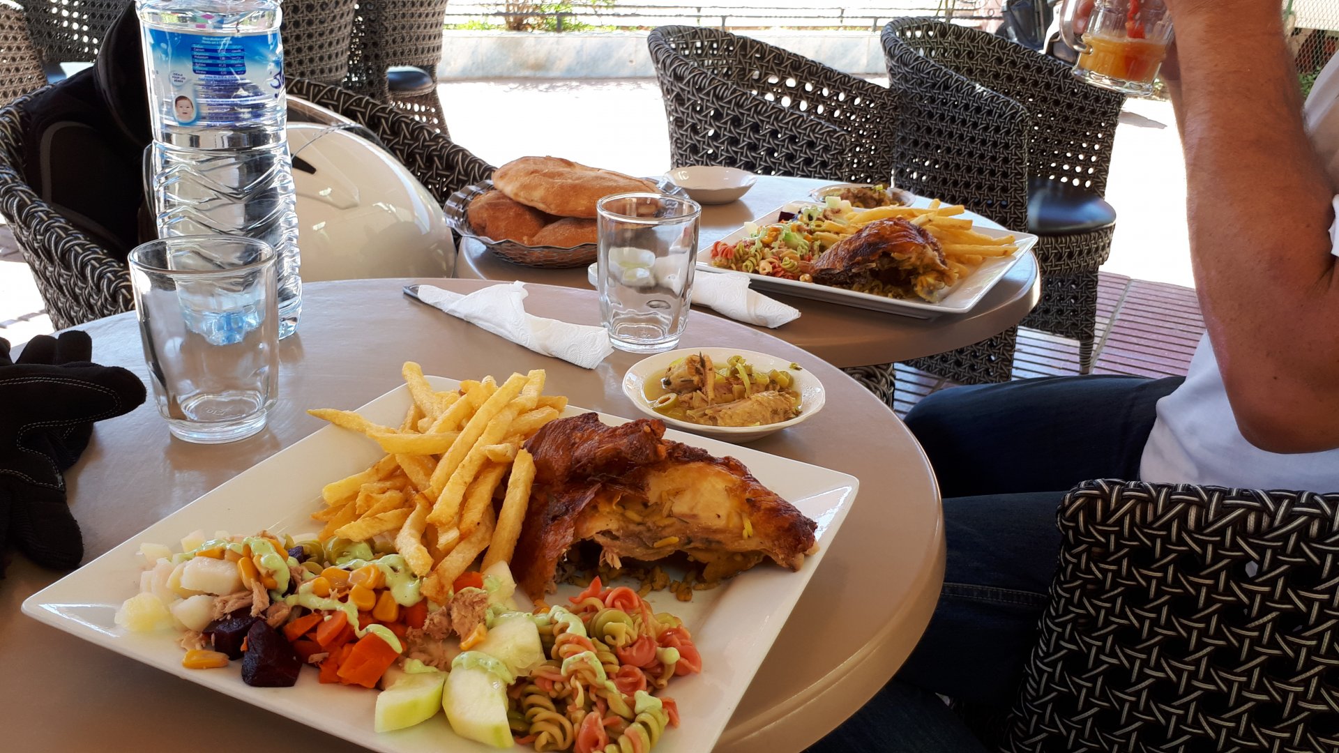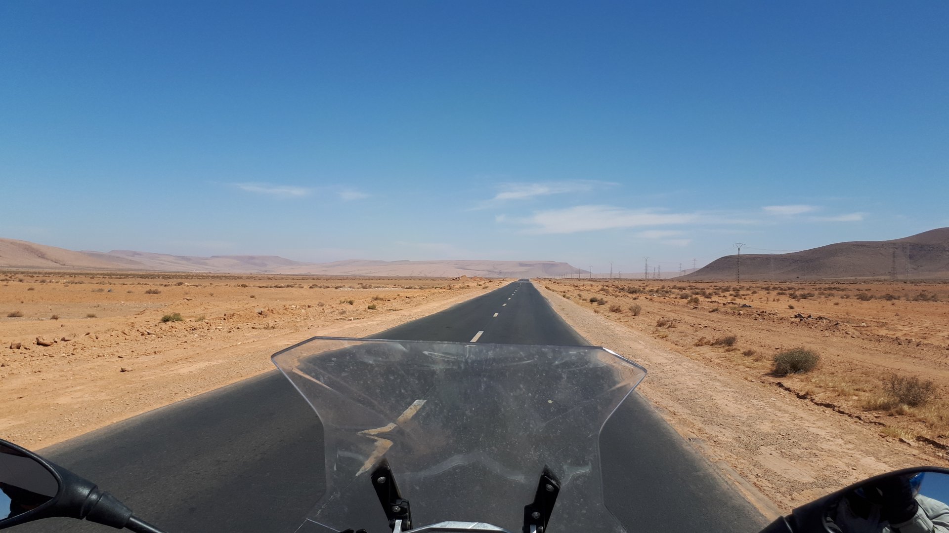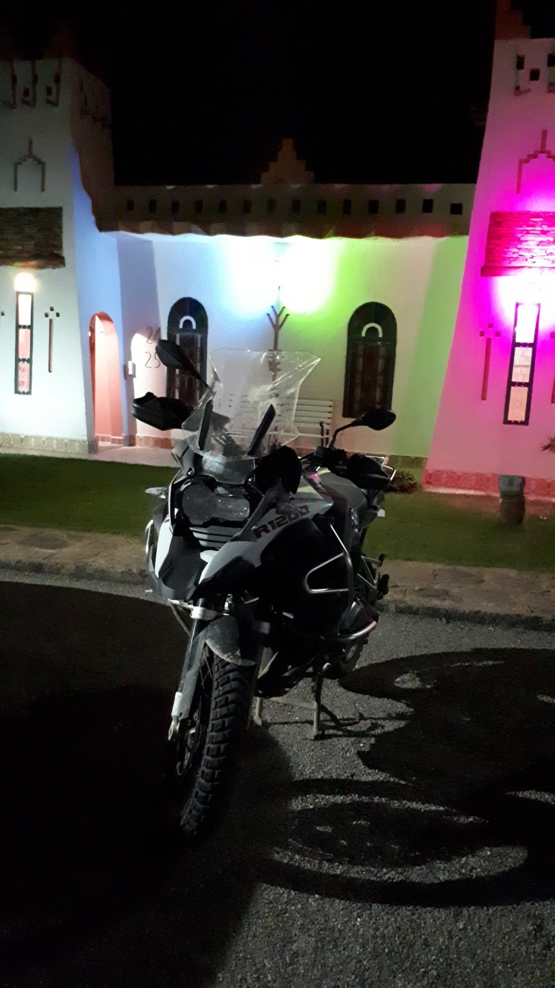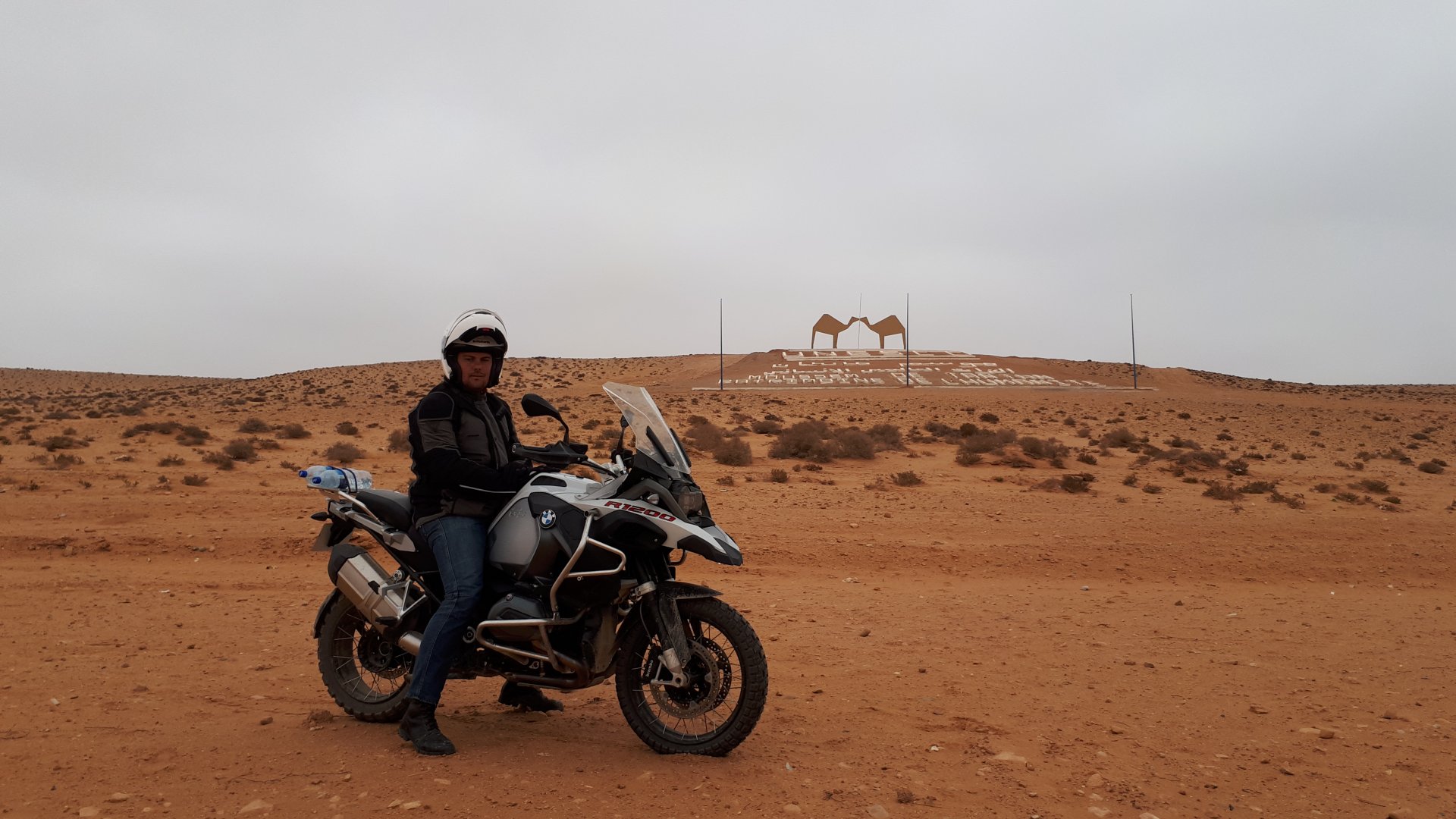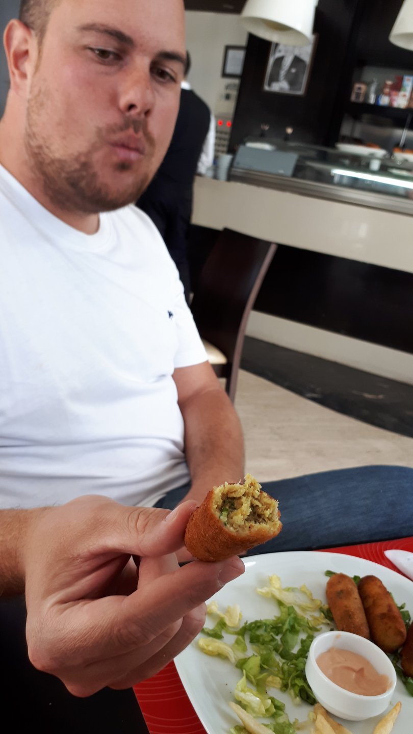 Breakfast was very nice, I mostly ate fruit trying to anticipate a warm day. We planned to going south to Tan Tan, checking it out, have a coffee, and ride back to Guelmim and stay back in the same hotel. Tan Tan was only 100km away so we could have gone further down, but I think that from here on south you're only really going if you want to continue heading to Mauritania, or at least to the border. We were both a little tired so could use an easy day with some rest in the afternoon. As we left for Tan Tan it was pretty foggy, but we assumed it would clear quite soon, we did almost the entire trip there under wet fog, our rain gear was at the hotel in the luggage. The road between Guelmim and Tan Tan has got a lot of three things: fish smell, slow moving, and traffic going further south to Africa. The fish smell comes out of nowhere next to some clearings by the side of the road where trucks carrying fish from Tan Tan's harbor empty their unfrozen ice, then the sun cooks that and the remaining smell is interesting because there is no ocean to be seen. Slow moving Land Rovers on old worn out leaf springs, carrying cargo or passengers at 60kmh, trudging along at a pace of a time gone past, driver patiently waiting out the trip in a car with no space for his elbow with a window that only slides open halfway in a car that is passed by every big truck, in over 40ºC heat, bless them! Here you see cars and trucks with license plates that I had never seen before, heading south to Mauritanica, Senegal, etc, feels exotic and something about the "body language" of these cars gives away that they know how long the trip is going to take regardless of being in a hurry or not. The fog eventually clears and we have a little bit of sunshine Tan Tan! Still pretty wet here. Nothing really noticeable about Tan Tan except that I created a little chaos by riding into the customs part of the harbor like it was a normal road. Got properly told off, and then waved by with a smile. After our coffee, which did it's job of warming us a little, we headed back for lunch at Guelmim Poulet Roti, my favourite: Little bit early after lunch, so we explored a little around the surroundings of Guelmim, and went to the beach And again, time to soak up We had dinner at the hotel and Maria ordered lasagna while trying to each something "normal", she gasped at her portion The next day, we'd have mountains again ...