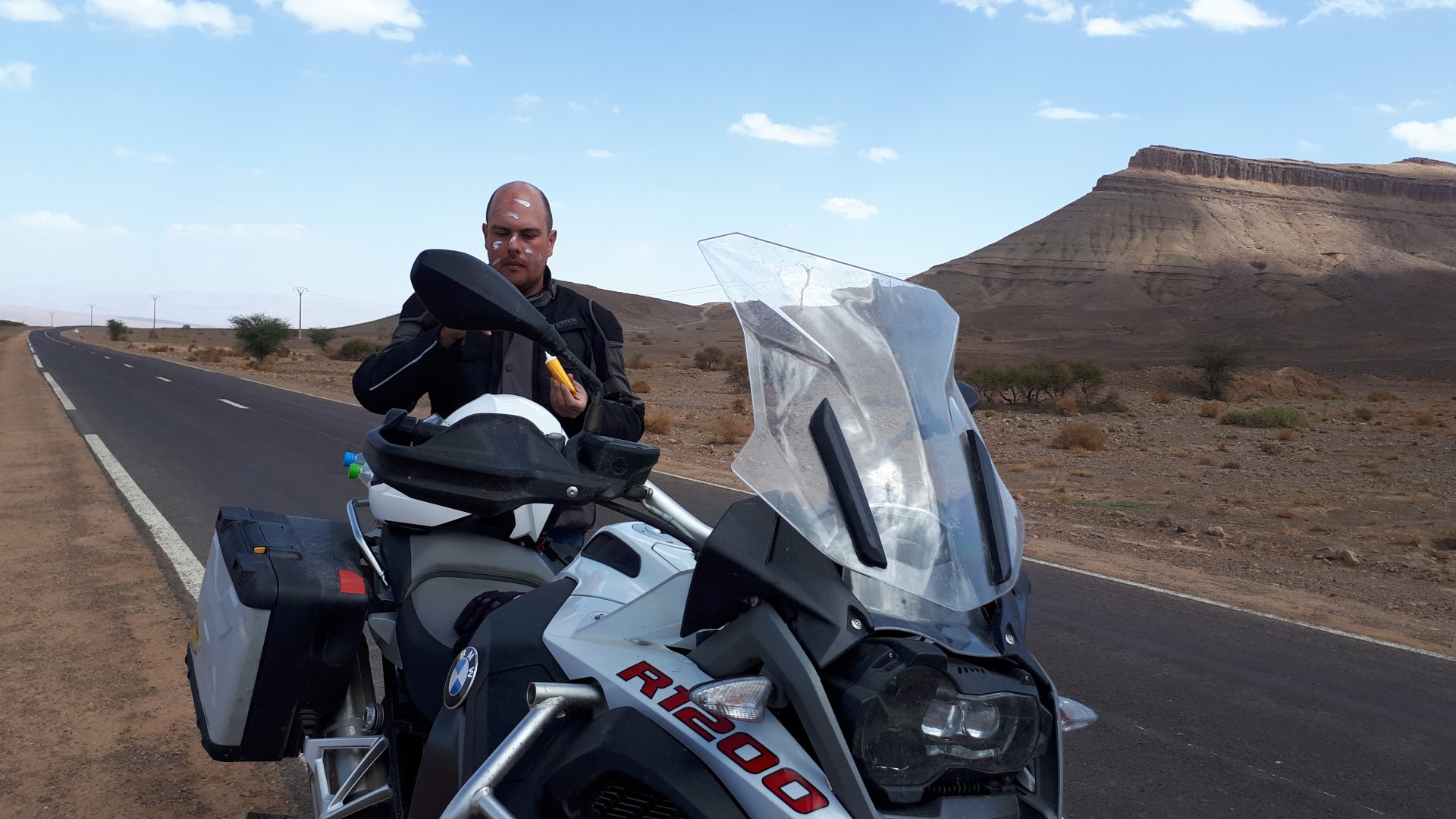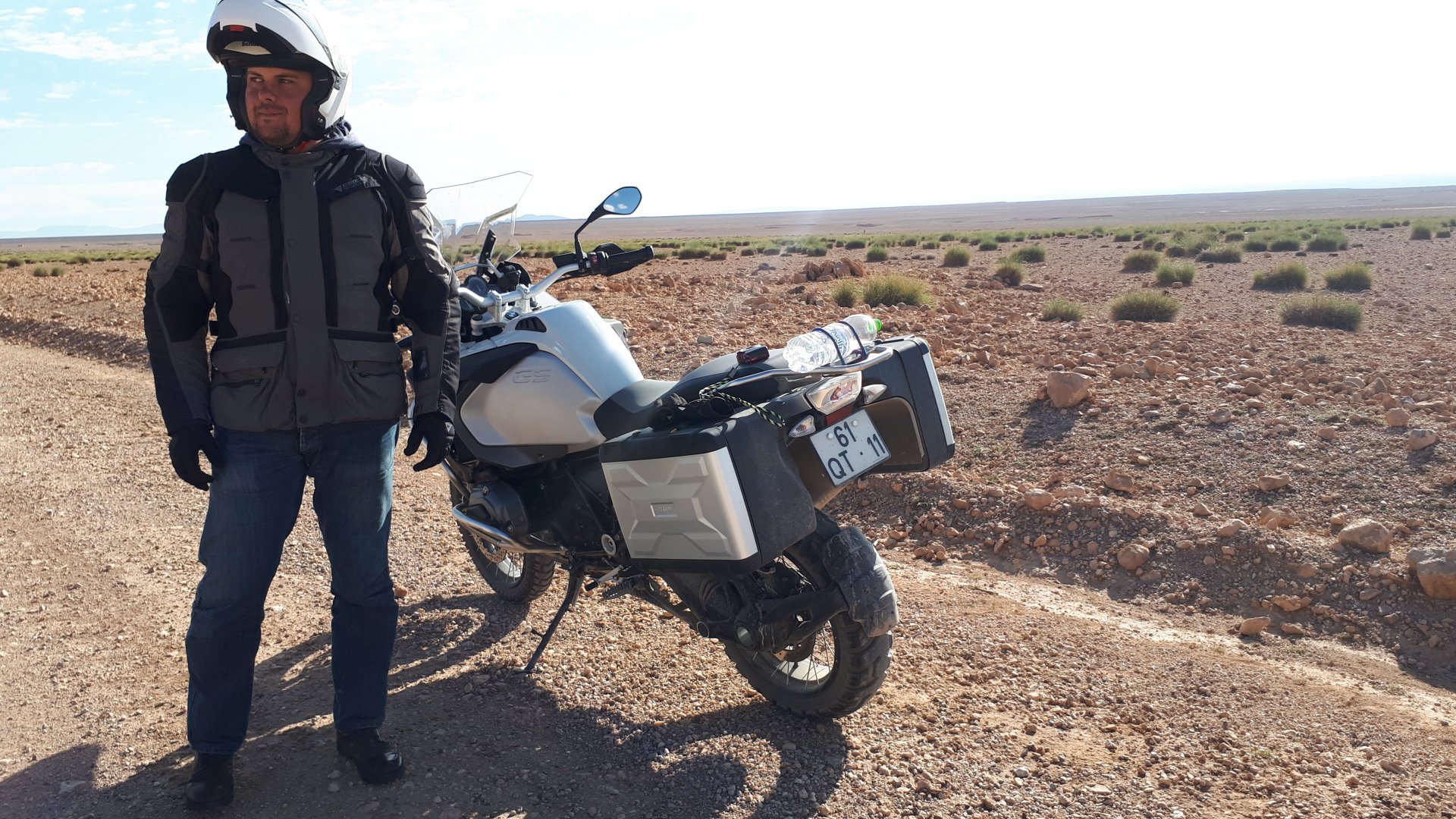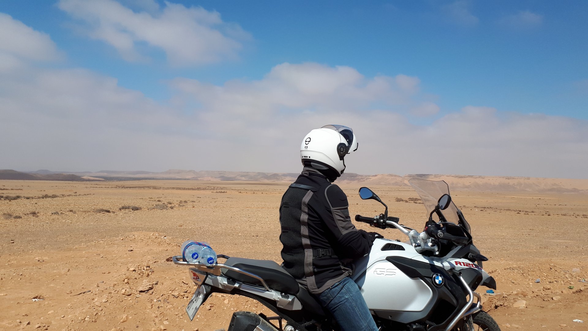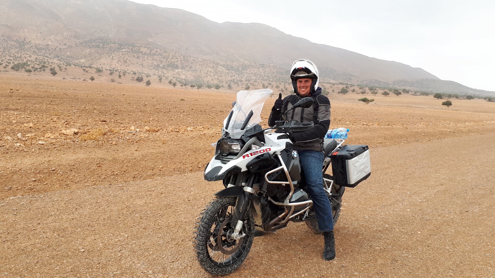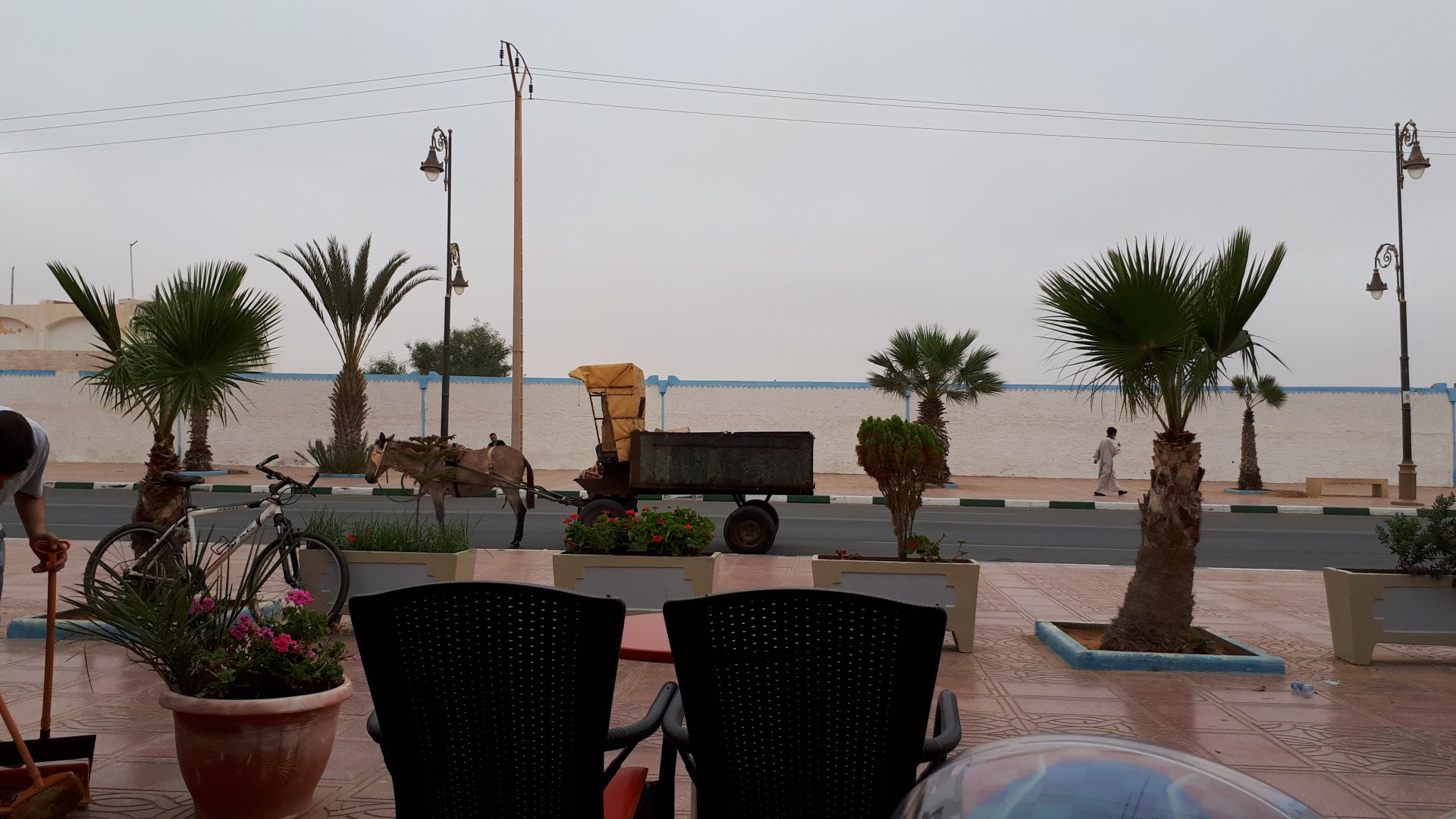 Breakfast was very nice, I mostly ate fruit trying to anticipate a warm day. We planned to going south to Tan Tan, checking it out, have a coffee, and ride back to Guelmim and stay back in the same hotel. Tan Tan was only 100km away so we could have gone further down, but I think that from here on south you're only really going if you want to continue heading to Mauritania, or at least to the border. We were both a little tired so could use an easy day with some rest in the afternoon. As we left for Tan Tan it was pretty foggy, but we assumed it would clear quite soon, we did almost the entire trip there under wet fog, our rain gear was at the hotel in the luggage. The road between Guelmim and Tan Tan has got a lot of three things: fish smell, slow moving, and traffic going further south to Africa. The fish smell comes out of nowhere next to some clearings by the side of the road where trucks carrying fish from Tan Tan's harbor empty their unfrozen ice, then the sun cooks that and the remaining smell is interesting because there is no ocean to be seen. Slow moving Land Rovers on old worn out leaf springs, carrying cargo or passengers at 60kmh, trudging along at a pace of a time gone past, driver patiently waiting out the trip in a car with no space for his elbow with a window that only slides open halfway in a car that is passed by every big truck, in over 40ºC heat, bless them! Here you see cars and trucks with license plates that I had never seen before, heading south to Mauritanica, Senegal, etc, feels exotic and something about the "body language" of these cars gives away that they know how long the trip is going to take regardless of being in a hurry or not. The fog eventually clears and we have a little bit of sunshine Tan Tan! Still pretty wet here. Nothing really noticeable about Tan Tan except that I created a little chaos by riding into the customs part of the harbor like it was a normal road. Got properly told off, and then waved by with a smile. After our coffee, which did it's job of warming us a little, we headed back for lunch at Guelmim Poulet Roti, my favourite: Little bit early after lunch, so we explored a little around the surroundings of Guelmim, and went to the beach And again, time to soak up We had dinner at the hotel and Maria ordered lasagna while trying to each something "normal", she gasped at her portion The next day, we'd have mountains again ...