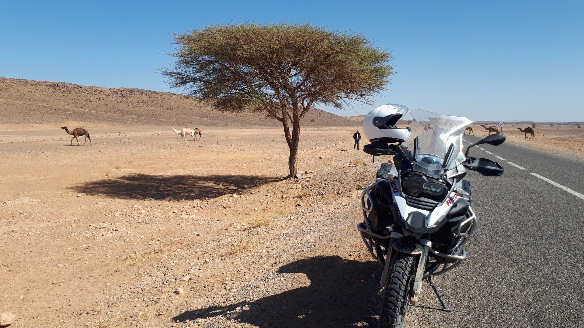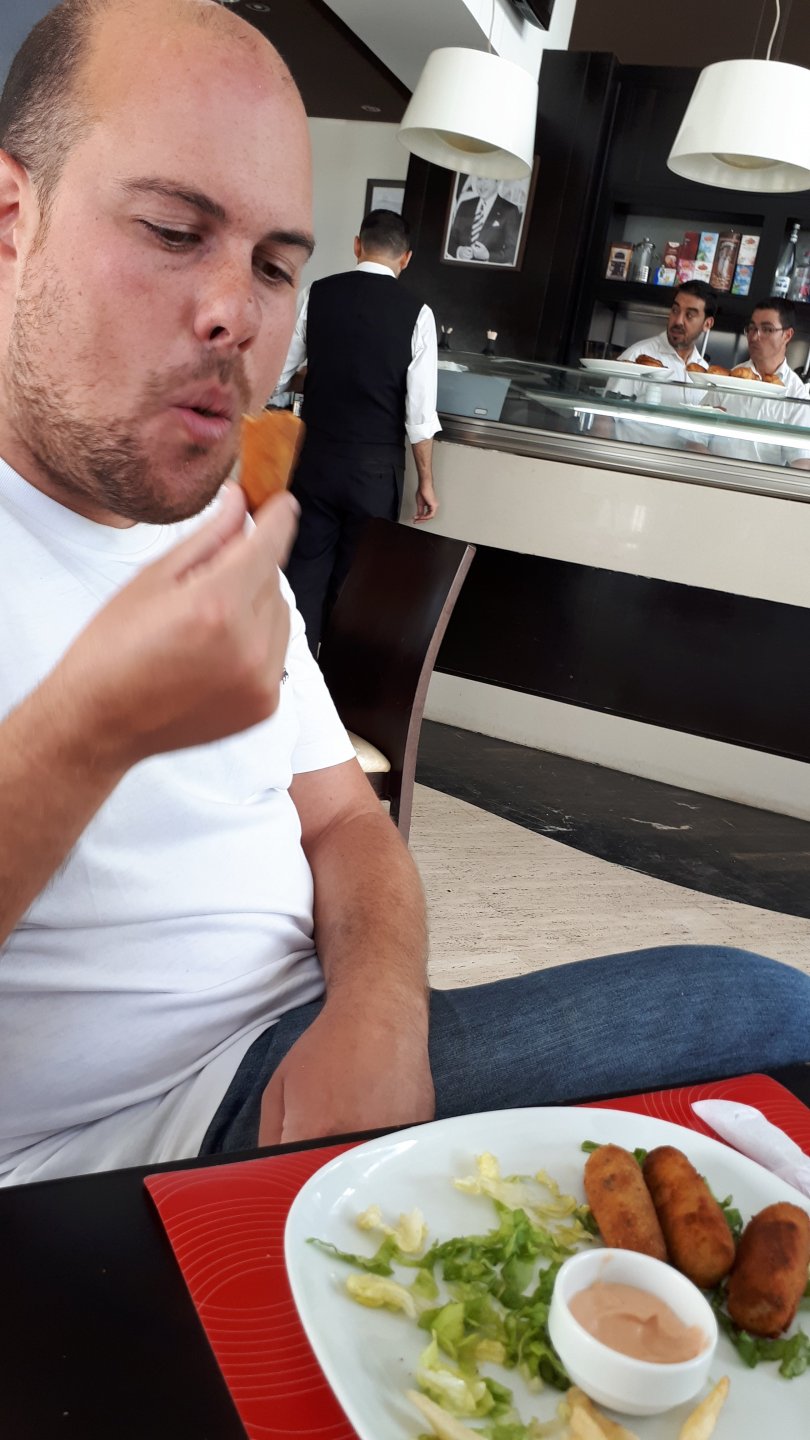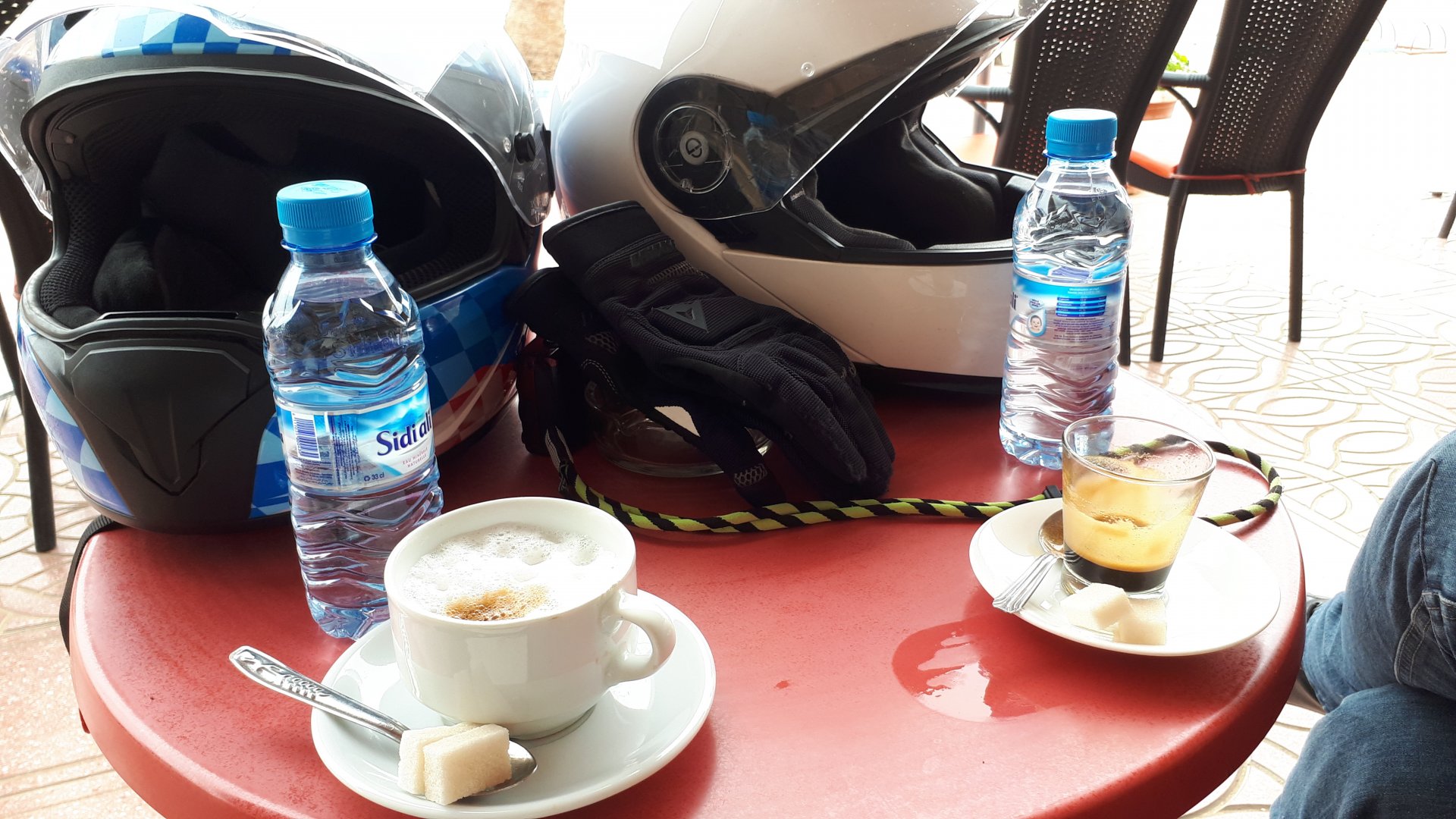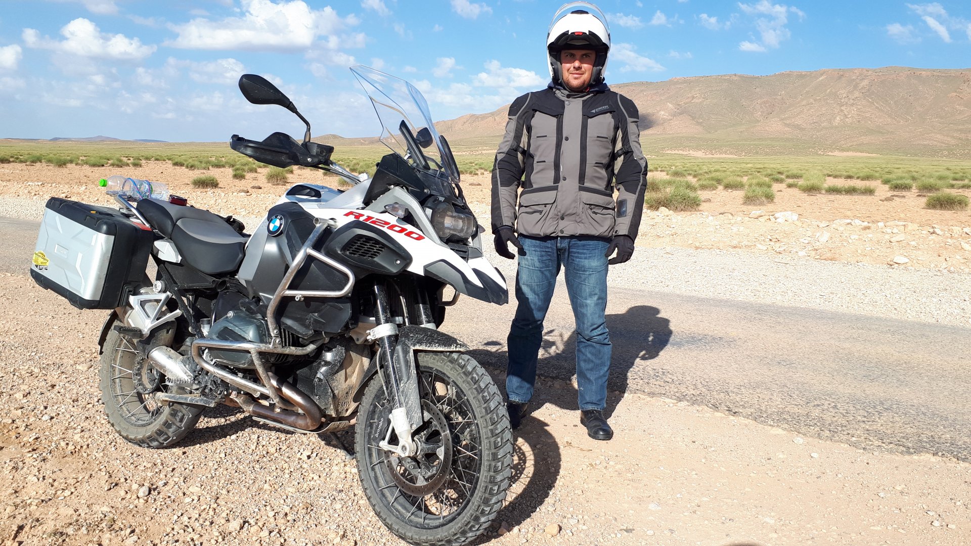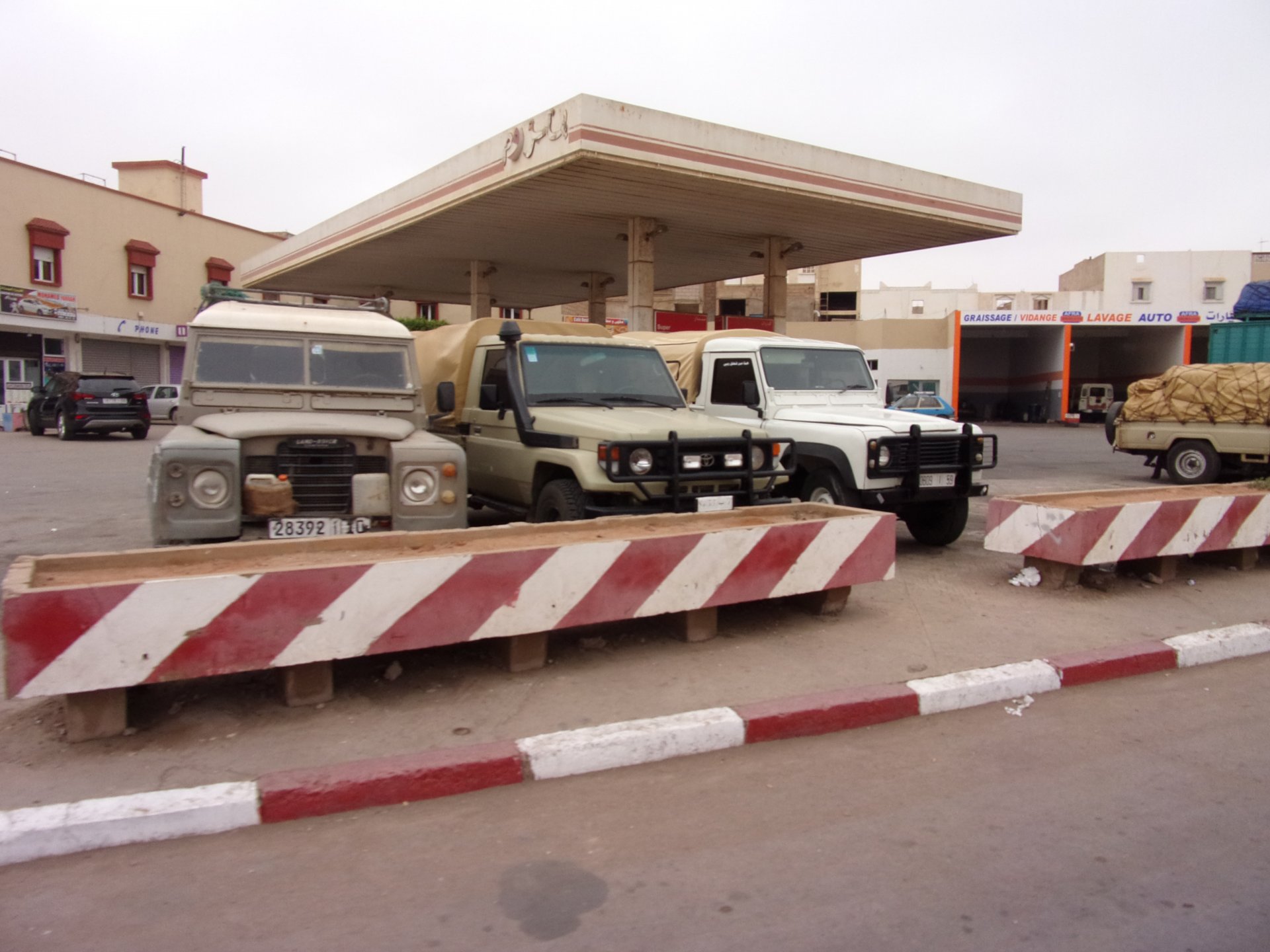 Breakfast was very nice, I mostly ate fruit trying to anticipate a warm day. We planned to going south to Tan Tan, checking it out, have a coffee, and ride back to Guelmim and stay back in the same hotel. Tan Tan was only 100km away so we could have gone further down, but I think that from here on south you're only really going if you want to continue heading to Mauritania, or at least to the border. We were both a little tired so could use an easy day with some rest in the afternoon. As we left for Tan Tan it was pretty foggy, but we assumed it would clear quite soon, we did almost the entire trip there under wet fog, our rain gear was at the hotel in the luggage. The road between Guelmim and Tan Tan has got a lot of three things: fish smell, slow moving, and traffic going further south to Africa. The fish smell comes out of nowhere next to some clearings by the side of the road where trucks carrying fish from Tan Tan's harbor empty their unfrozen ice, then the sun cooks that and the remaining smell is interesting because there is no ocean to be seen. Slow moving Land Rovers on old worn out leaf springs, carrying cargo or passengers at 60kmh, trudging along at a pace of a time gone past, driver patiently waiting out the trip in a car with no space for his elbow with a window that only slides open halfway in a car that is passed by every big truck, in over 40ºC heat, bless them! Here you see cars and trucks with license plates that I had never seen before, heading south to Mauritanica, Senegal, etc, feels exotic and something about the "body language" of these cars gives away that they know how long the trip is going to take regardless of being in a hurry or not. The fog eventually clears and we have a little bit of sunshine Tan Tan! Still pretty wet here. Nothing really noticeable about Tan Tan except that I created a little chaos by riding into the customs part of the harbor like it was a normal road. Got properly told off, and then waved by with a smile. After our coffee, which did it's job of warming us a little, we headed back for lunch at Guelmim Poulet Roti, my favourite: Little bit early after lunch, so we explored a little around the surroundings of Guelmim, and went to the beach And again, time to soak up We had dinner at the hotel and Maria ordered lasagna while trying to each something "normal", she gasped at her portion The next day, we'd have mountains again ...