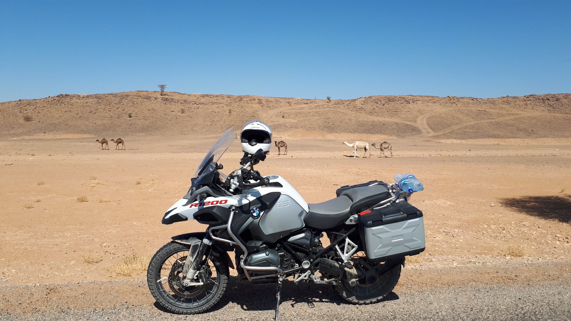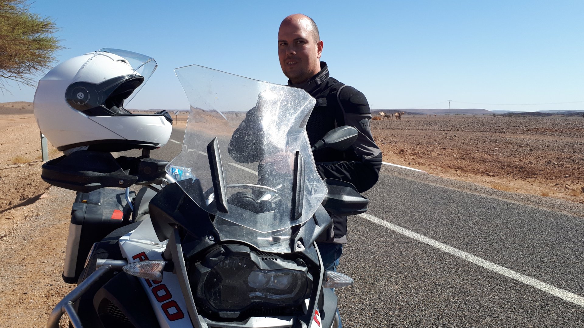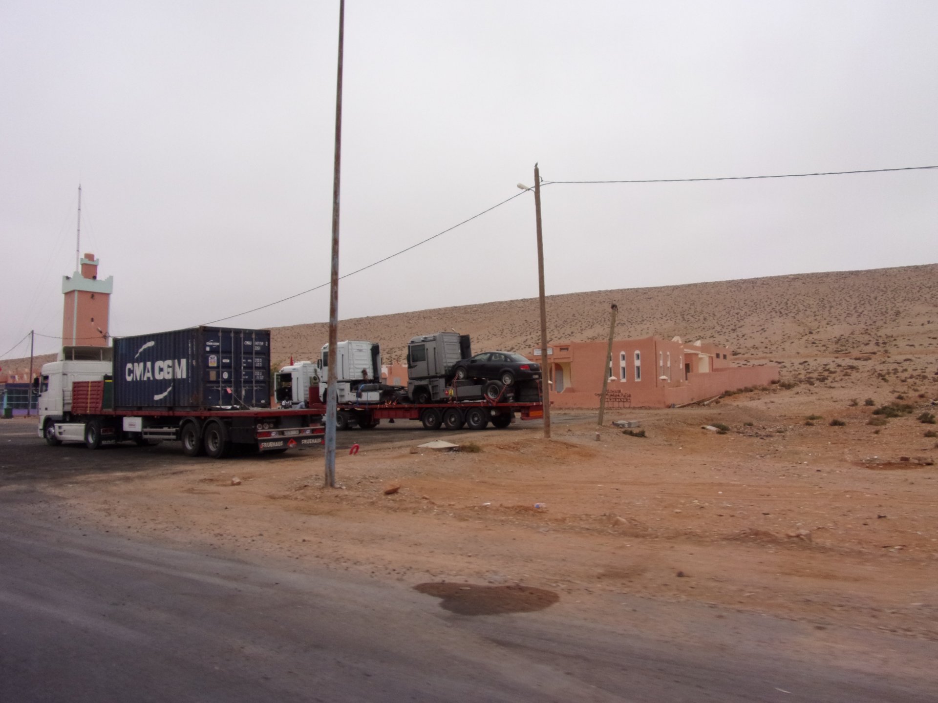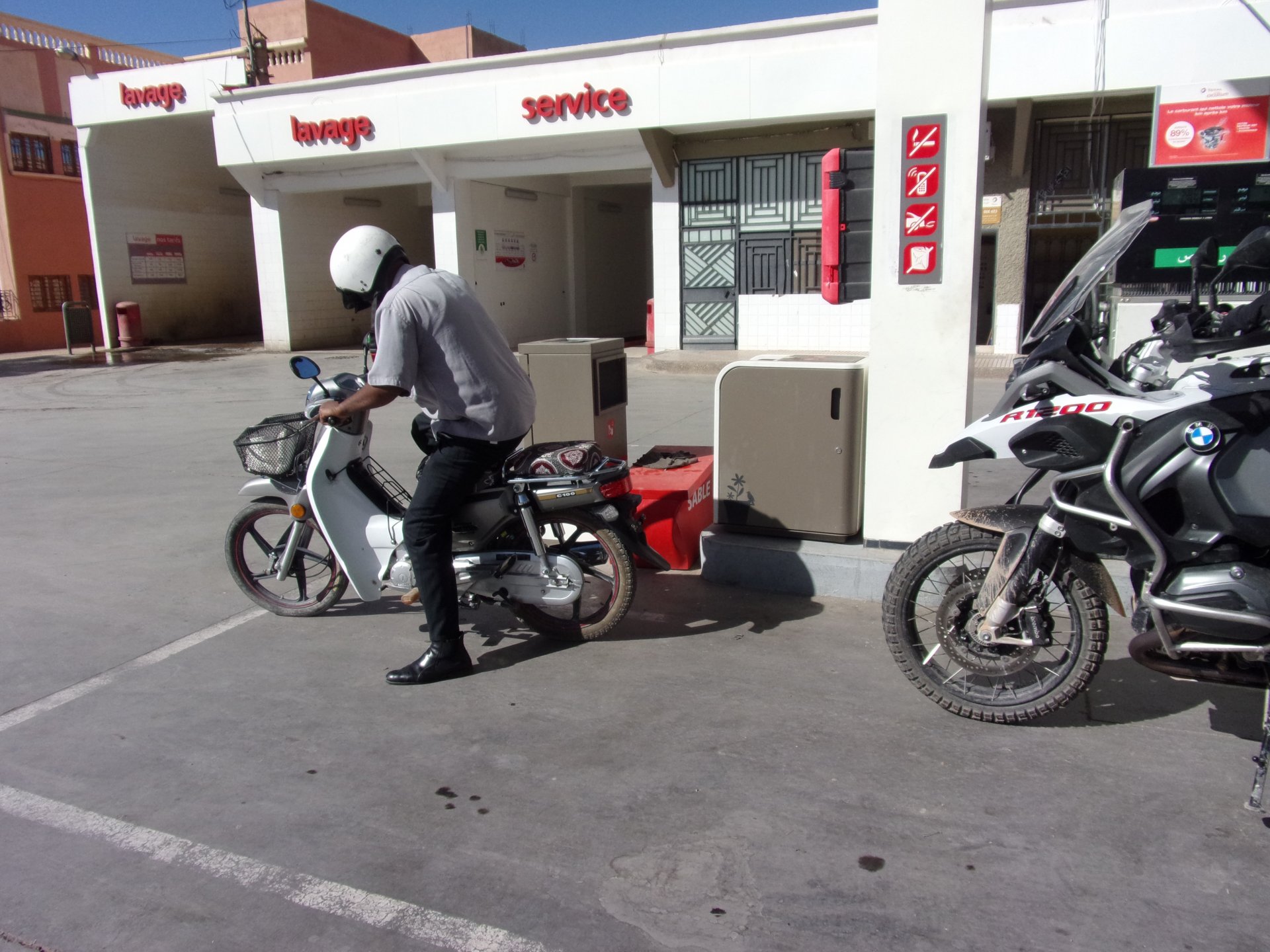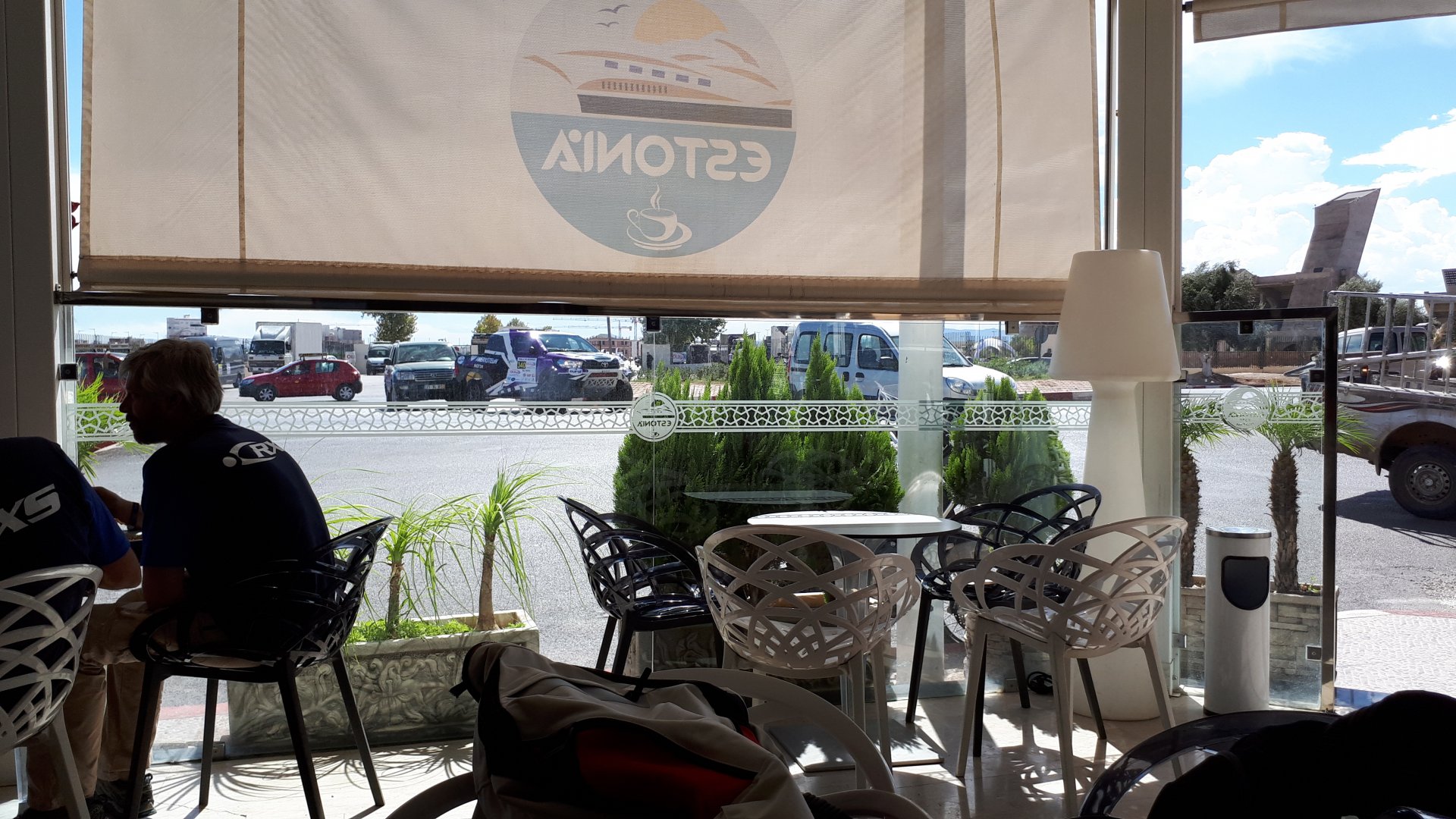 Breakfast was very nice, I mostly ate fruit trying to anticipate a warm day. We planned to going south to Tan Tan, checking it out, have a coffee, and ride back to Guelmim and stay back in the same hotel. Tan Tan was only 100km away so we could have gone further down, but I think that from here on south you're only really going if you want to continue heading to Mauritania, or at least to the border. We were both a little tired so could use an easy day with some rest in the afternoon. As we left for Tan Tan it was pretty foggy, but we assumed it would clear quite soon, we did almost the entire trip there under wet fog, our rain gear was at the hotel in the luggage. The road between Guelmim and Tan Tan has got a lot of three things: fish smell, slow moving, and traffic going further south to Africa. The fish smell comes out of nowhere next to some clearings by the side of the road where trucks carrying fish from Tan Tan's harbor empty their unfrozen ice, then the sun cooks that and the remaining smell is interesting because there is no ocean to be seen. Slow moving Land Rovers on old worn out leaf springs, carrying cargo or passengers at 60kmh, trudging along at a pace of a time gone past, driver patiently waiting out the trip in a car with no space for his elbow with a window that only slides open halfway in a car that is passed by every big truck, in over 40ºC heat, bless them! Here you see cars and trucks with license plates that I had never seen before, heading south to Mauritanica, Senegal, etc, feels exotic and something about the "body language" of these cars gives away that they know how long the trip is going to take regardless of being in a hurry or not. The fog eventually clears and we have a little bit of sunshine Tan Tan! Still pretty wet here. Nothing really noticeable about Tan Tan except that I created a little chaos by riding into the customs part of the harbor like it was a normal road. Got properly told off, and then waved by with a smile. After our coffee, which did it's job of warming us a little, we headed back for lunch at Guelmim Poulet Roti, my favourite: Little bit early after lunch, so we explored a little around the surroundings of Guelmim, and went to the beach And again, time to soak up We had dinner at the hotel and Maria ordered lasagna while trying to each something "normal", she gasped at her portion The next day, we'd have mountains again ...
