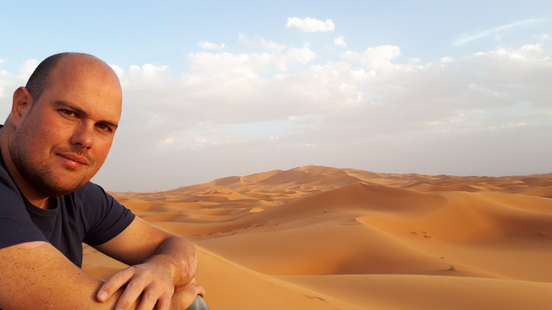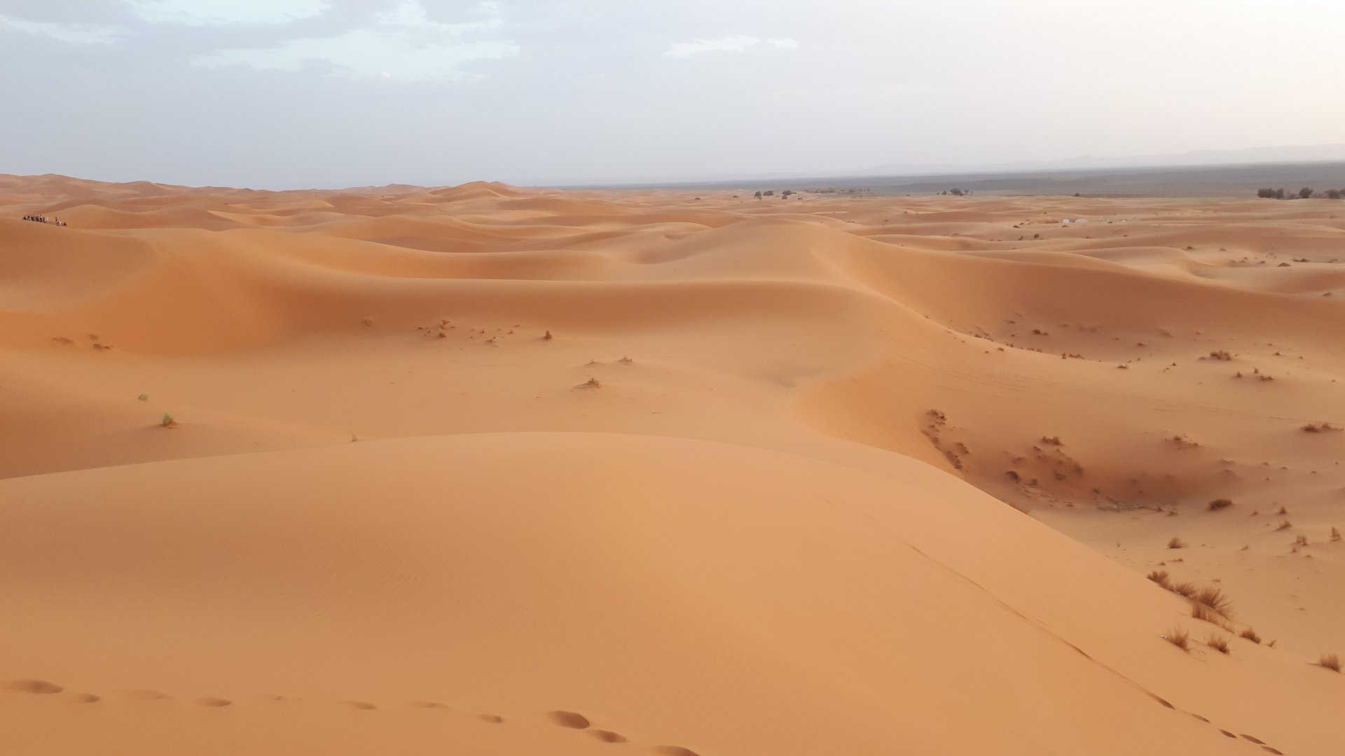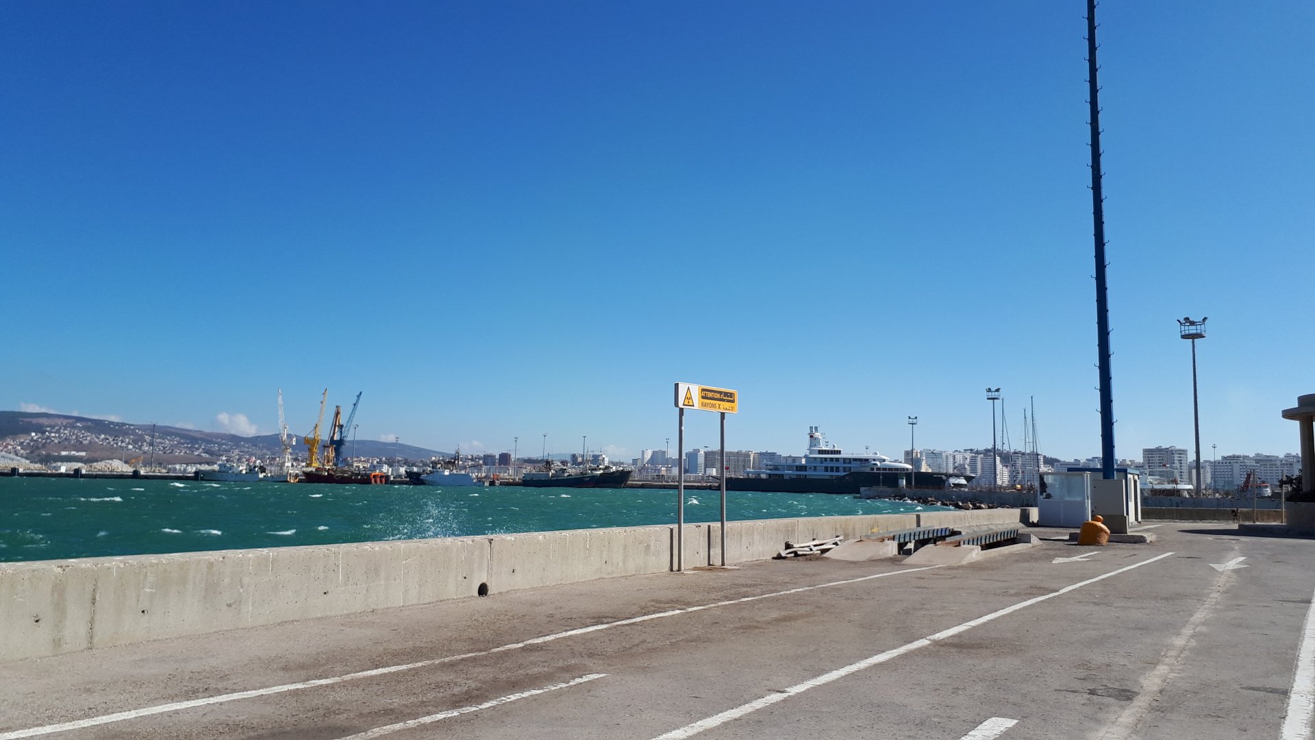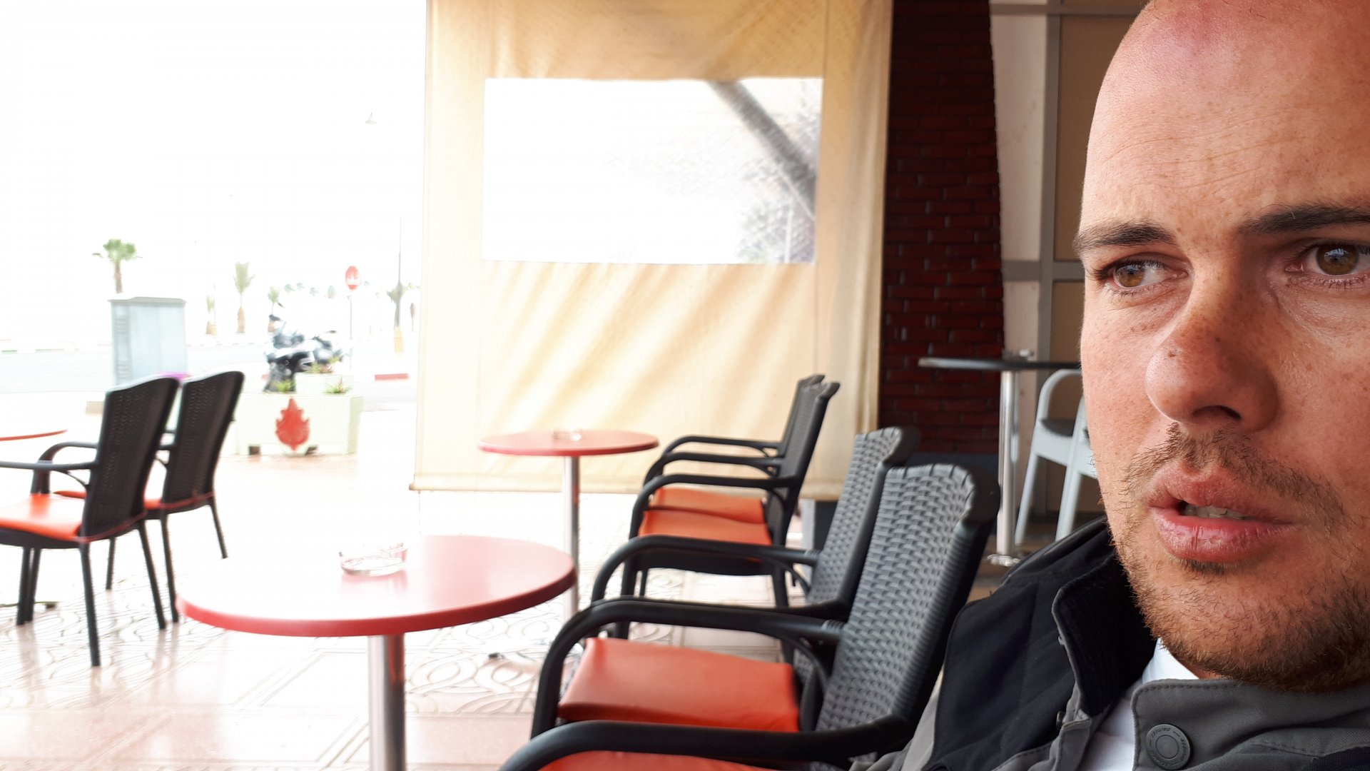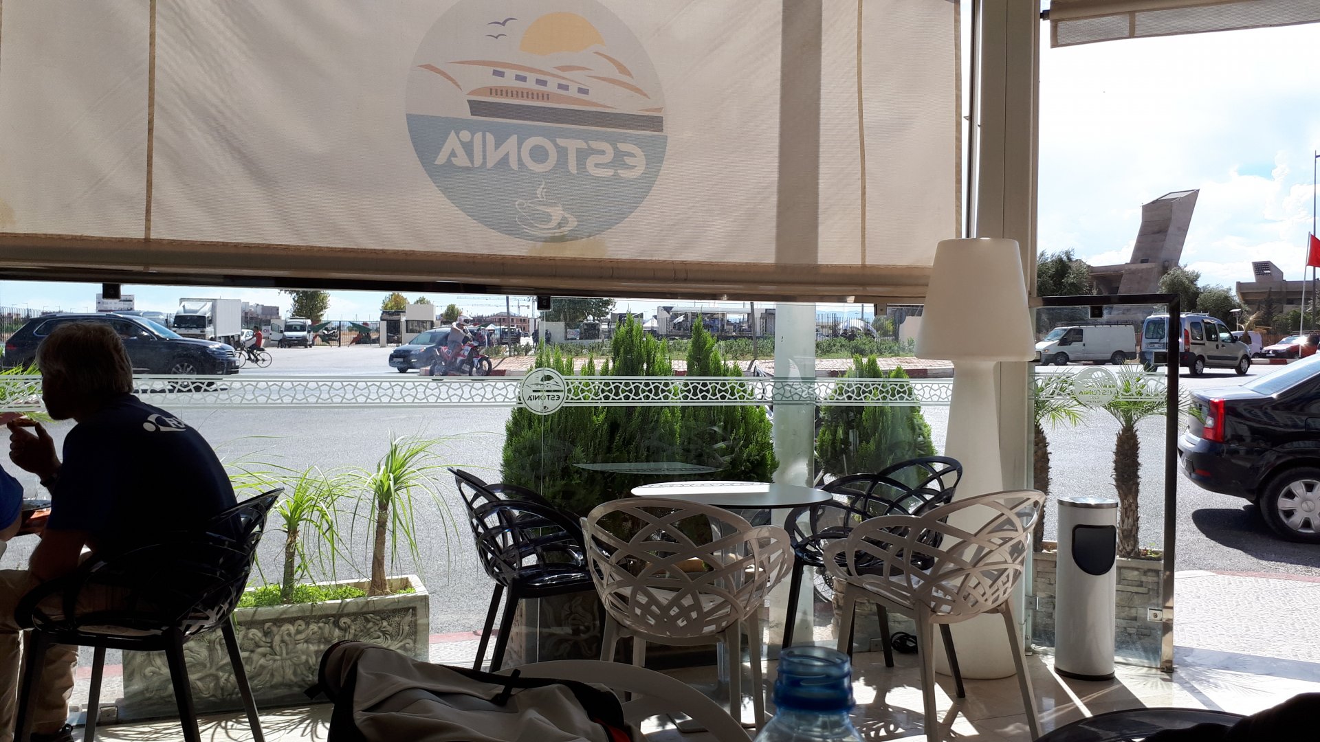 Breakfast was very nice, I mostly ate fruit trying to anticipate a warm day. We planned to going south to Tan Tan, checking it out, have a coffee, and ride back to Guelmim and stay back in the same hotel. Tan Tan was only 100km away so we could have gone further down, but I think that from here on south you're only really going if you want to continue heading to Mauritania, or at least to the border. We were both a little tired so could use an easy day with some rest in the afternoon. As we left for Tan Tan it was pretty foggy, but we assumed it would clear quite soon, we did almost the entire trip there under wet fog, our rain gear was at the hotel in the luggage. The road between Guelmim and Tan Tan has got a lot of three things: fish smell, slow moving, and traffic going further south to Africa. The fish smell comes out of nowhere next to some clearings by the side of the road where trucks carrying fish from Tan Tan's harbor empty their unfrozen ice, then the sun cooks that and the remaining smell is interesting because there is no ocean to be seen. Slow moving Land Rovers on old worn out leaf springs, carrying cargo or passengers at 60kmh, trudging along at a pace of a time gone past, driver patiently waiting out the trip in a car with no space for his elbow with a window that only slides open halfway in a car that is passed by every big truck, in over 40ºC heat, bless them! Here you see cars and trucks with license plates that I had never seen before, heading south to Mauritanica, Senegal, etc, feels exotic and something about the "body language" of these cars gives away that they know how long the trip is going to take regardless of being in a hurry or not. The fog eventually clears and we have a little bit of sunshine Tan Tan! Still pretty wet here. Nothing really noticeable about Tan Tan except that I created a little chaos by riding into the customs part of the harbor like it was a normal road. Got properly told off, and then waved by with a smile. After our coffee, which did it's job of warming us a little, we headed back for lunch at Guelmim Poulet Roti, my favourite: Little bit early after lunch, so we explored a little around the surroundings of Guelmim, and went to the beach And again, time to soak up We had dinner at the hotel and Maria ordered lasagna while trying to each something "normal", she gasped at her portion The next day, we'd have mountains again ...