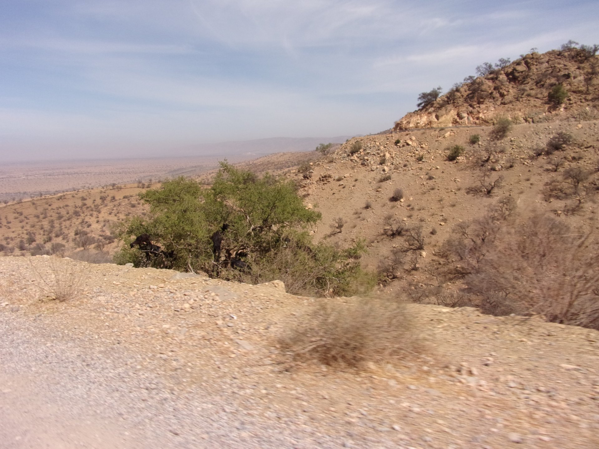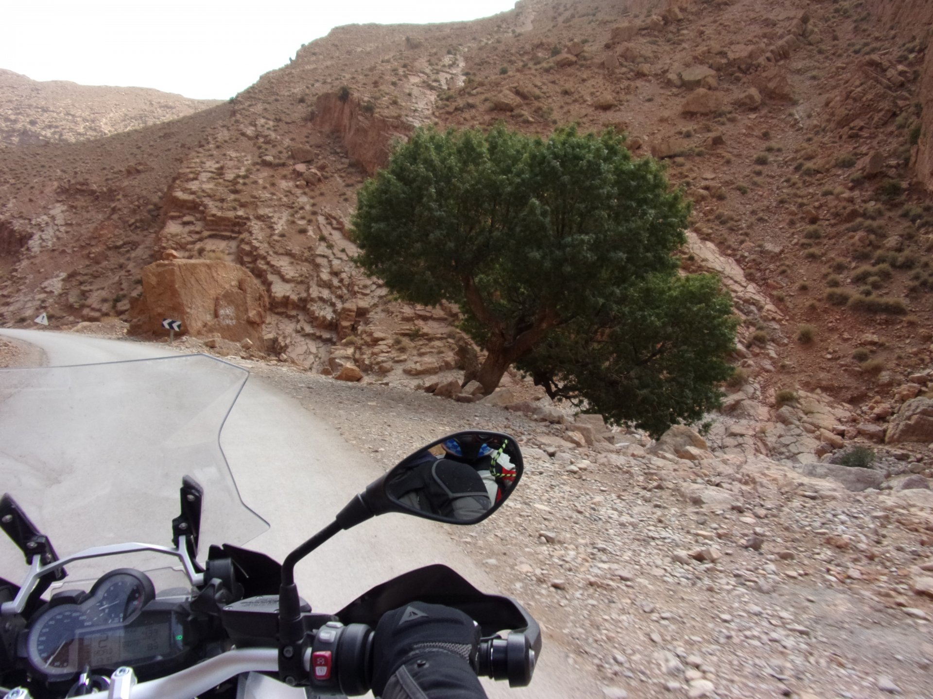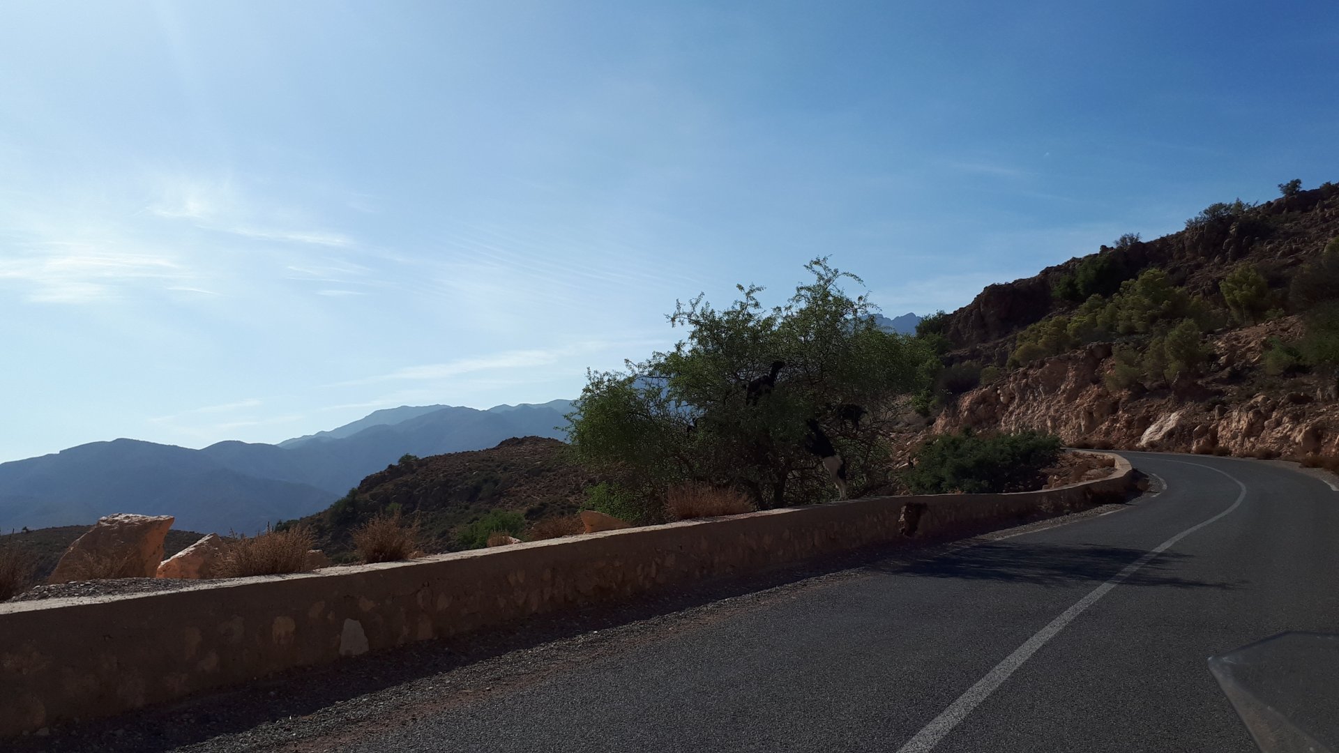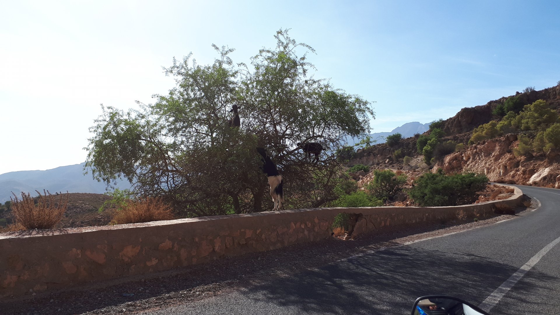On the next day, we have a nice breakfast before riding out. The weather forecast was for rain on the coast and judging by our previous days in Tan Tan and Guelmim, we would be getting shitty weather all the way back to Tangier, so instead we decided to go back via the interior which was also very much preferred next to the coast as far as roads and people. It was also understood that we wouldn't be visiting Morocco on the bike on the following year, so might as well be on our preferred roads. Heading north still towards Marrakech, but before getting there we were turning east towards Beni Mellal and then Midelt. Moroccan cruise control: We were now heading to the plateau once again, but before we got there we both spent one of the most uncomfortable hours on a bike ever. Although it wasn't the hottest we've ridden through, the humidity was off the charts, we were soaked in sweat and uncomfortable. My groin ..., well, you know how it feels after a few hours like that. We were very happy to arrive at our hotel for the evening, and I swear it took me less than 5 minutes between arriving for check-in and getting in the pool. There are no pictures of the afternoon because we didn't really care for that area and Maria was too uncomfortable to be feeling like holding up a camera. With every part of me feeling relieved and fresh, we enjoyed a cool evening sitting outside having cold water, while being kept company by chickens unaware of the menu. In Morocco, every animal climbs trees, or was it just trying to escape the cooking pot? A very good night's sleep was had in our very colorfully lit hotel room.