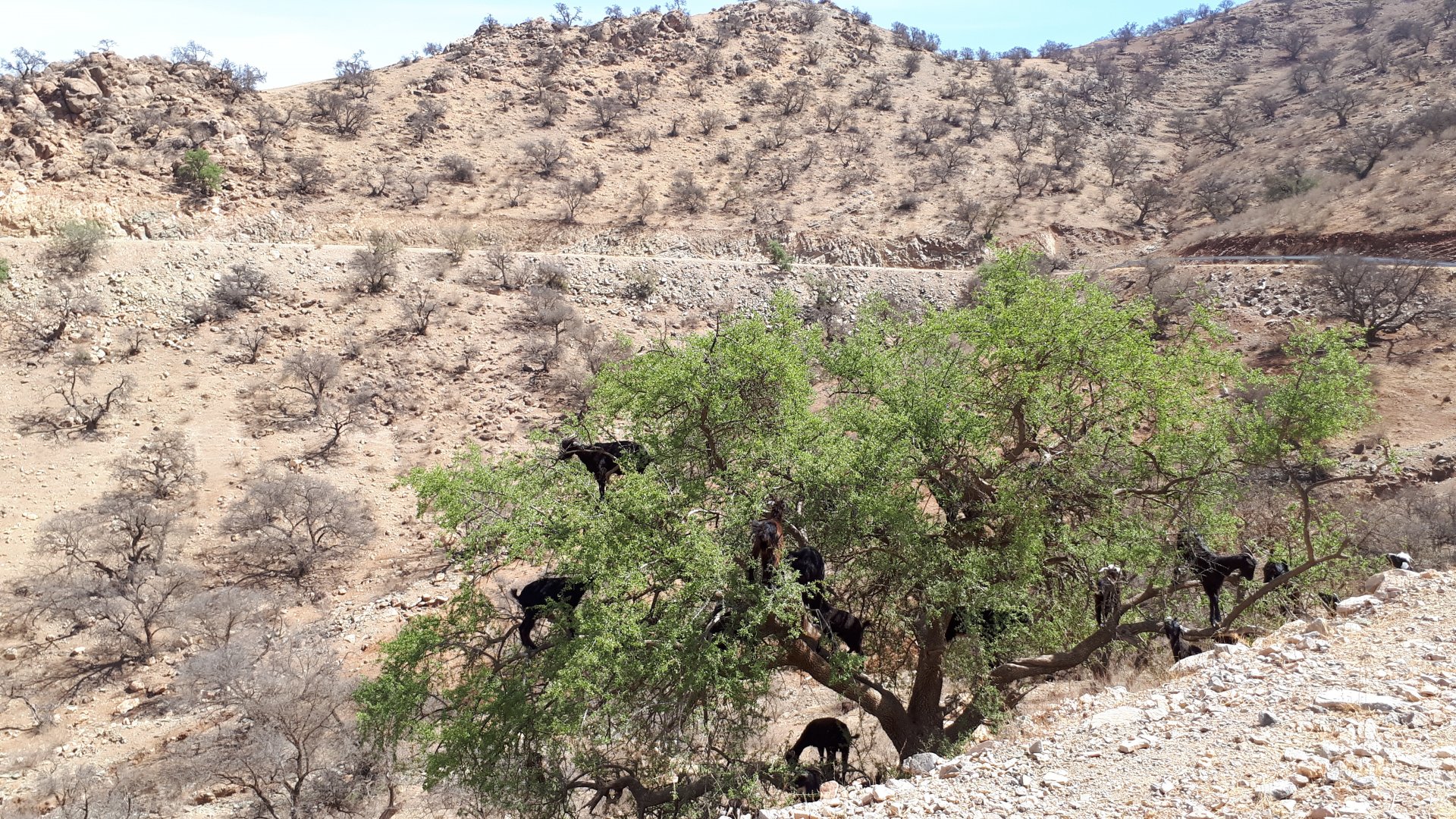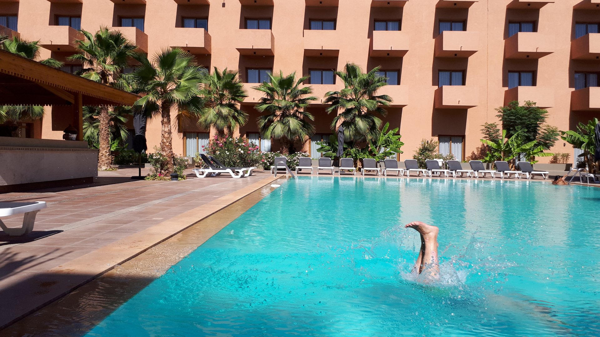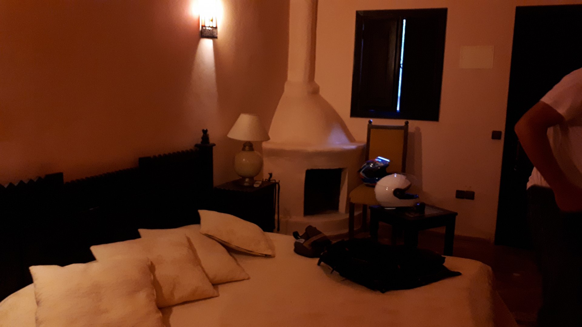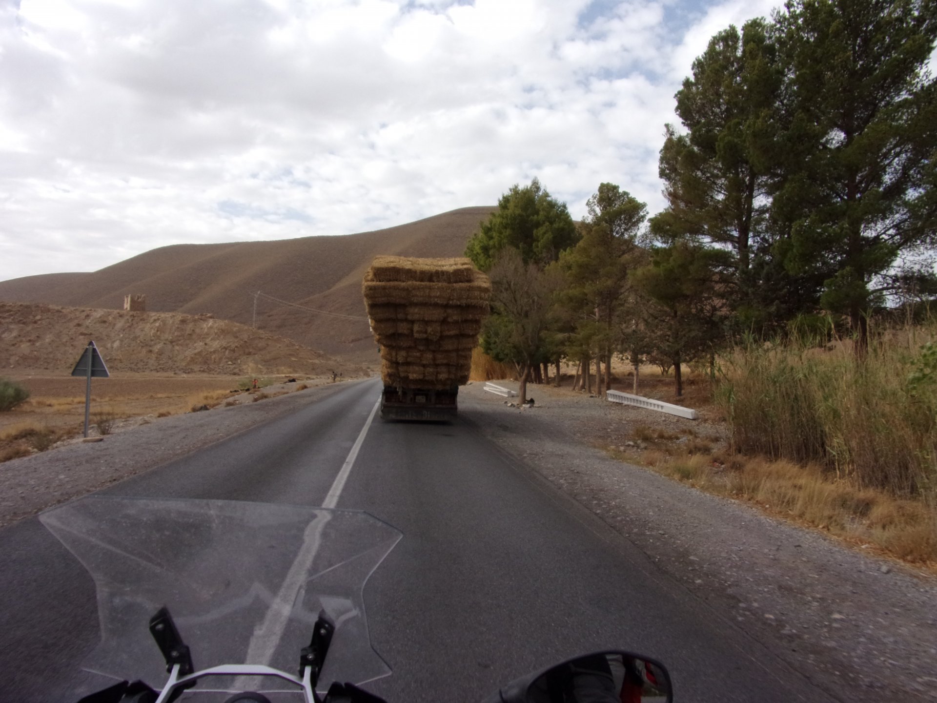 On the next day, we have a nice breakfast before riding out. The weather forecast was for rain on the coast and judging by our previous days in Tan Tan and Guelmim, we would be getting shitty weather all the way back to Tangier, so instead we decided to go back via the interior which was also very much preferred next to the coast as far as roads and people. It was also understood that we wouldn't be visiting Morocco on the bike on the following year, so might as well be on our preferred roads. Heading north still towards Marrakech, but before getting there we were turning east towards Beni Mellal and then Midelt. Moroccan cruise control: We were now heading to the plateau once again, but before we got there we both spent one of the most uncomfortable hours on a bike ever. Although it wasn't the hottest we've ridden through, the humidity was off the charts, we were soaked in sweat and uncomfortable. My groin ..., well, you know how it feels after a few hours like that. We were very happy to arrive at our hotel for the evening, and I swear it took me less than 5 minutes between arriving for check-in and getting in the pool. There are no pictures of the afternoon because we didn't really care for that area and Maria was too uncomfortable to be feeling like holding up a camera. With every part of me feeling relieved and fresh, we enjoyed a cool evening sitting outside having cold water, while being kept company by chickens unaware of the menu. In Morocco, every animal climbs trees, or was it just trying to escape the cooking pot? A very good night's sleep was had in our very colorfully lit hotel room.