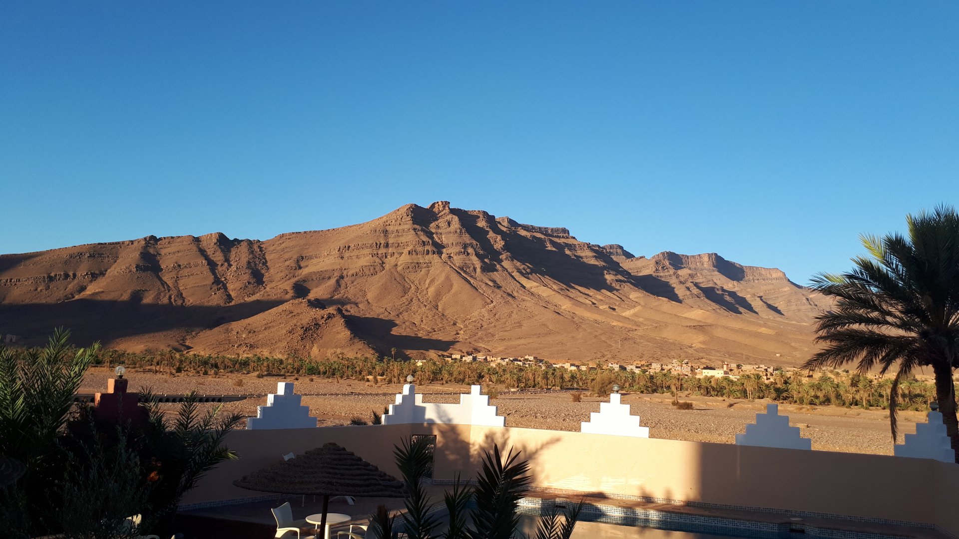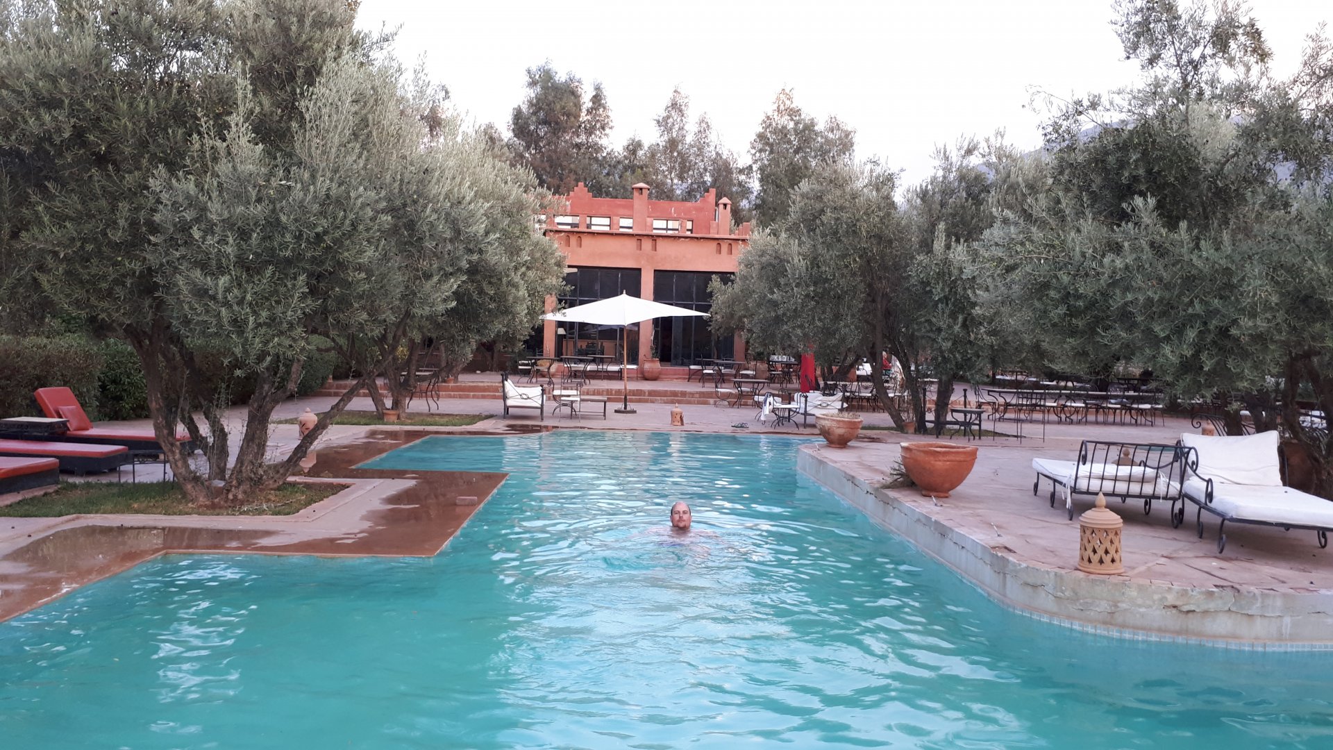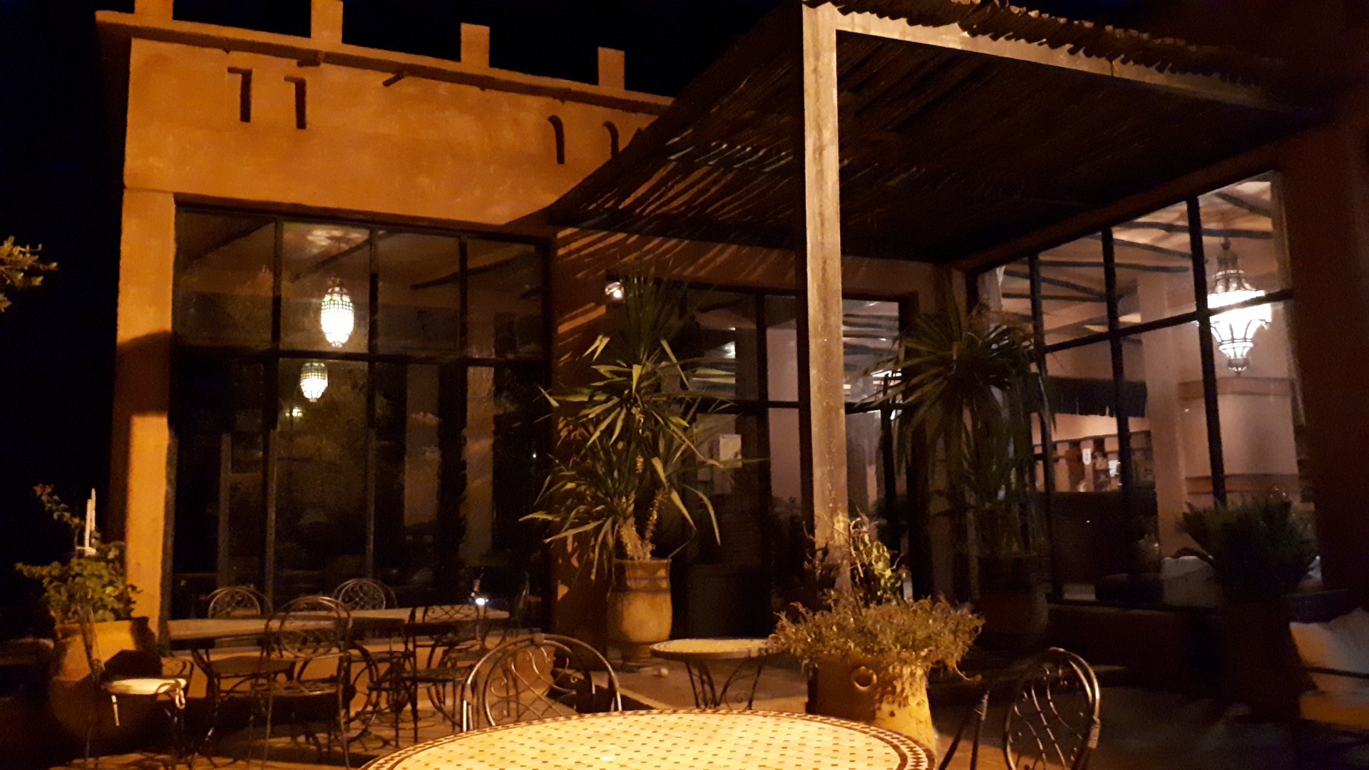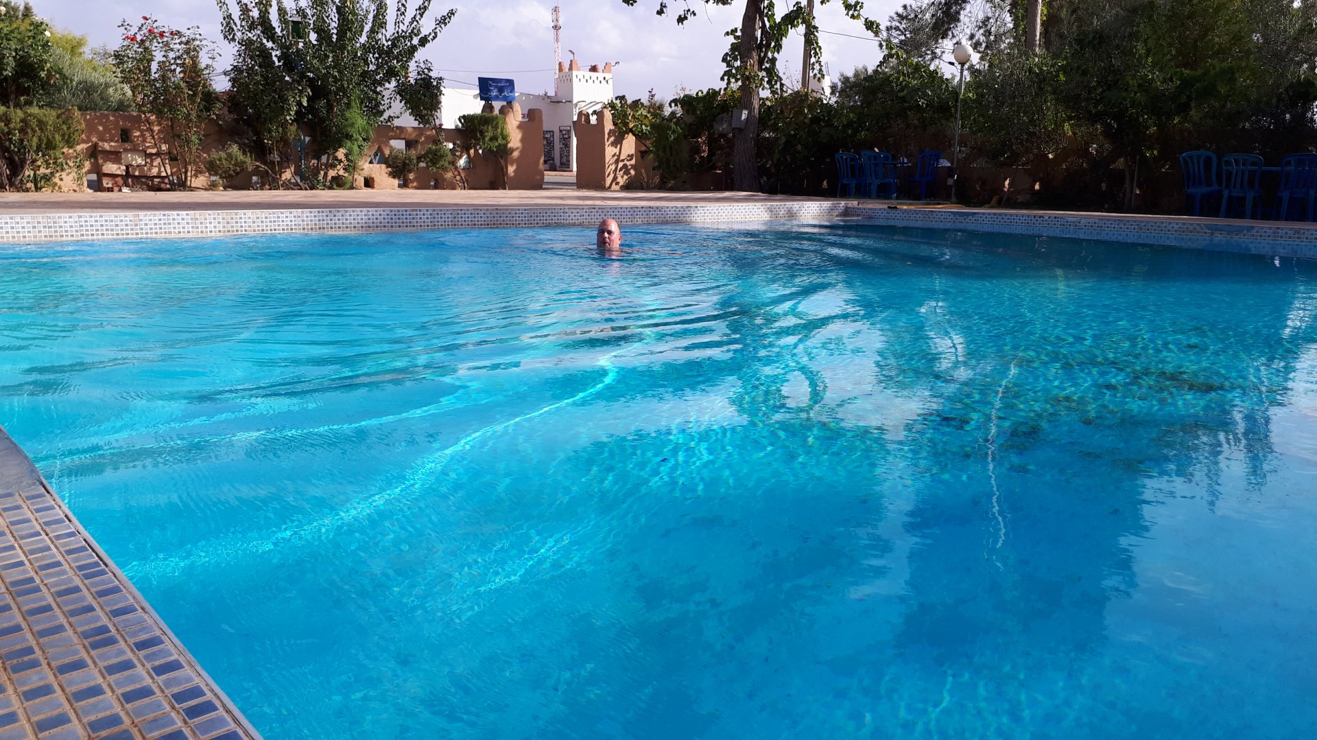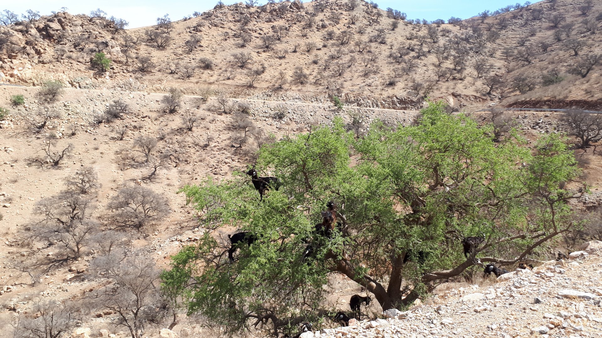 On the next day, we have a nice breakfast before riding out. The weather forecast was for rain on the coast and judging by our previous days in Tan Tan and Guelmim, we would be getting shitty weather all the way back to Tangier, so instead we decided to go back via the interior which was also very much preferred next to the coast as far as roads and people. It was also understood that we wouldn't be visiting Morocco on the bike on the following year, so might as well be on our preferred roads. Heading north still towards Marrakech, but before getting there we were turning east towards Beni Mellal and then Midelt. Moroccan cruise control: We were now heading to the plateau once again, but before we got there we both spent one of the most uncomfortable hours on a bike ever. Although it wasn't the hottest we've ridden through, the humidity was off the charts, we were soaked in sweat and uncomfortable. My groin ..., well, you know how it feels after a few hours like that. We were very happy to arrive at our hotel for the evening, and I swear it took me less than 5 minutes between arriving for check-in and getting in the pool. There are no pictures of the afternoon because we didn't really care for that area and Maria was too uncomfortable to be feeling like holding up a camera. With every part of me feeling relieved and fresh, we enjoyed a cool evening sitting outside having cold water, while being kept company by chickens unaware of the menu. In Morocco, every animal climbs trees, or was it just trying to escape the cooking pot? A very good night's sleep was had in our very colorfully lit hotel room.