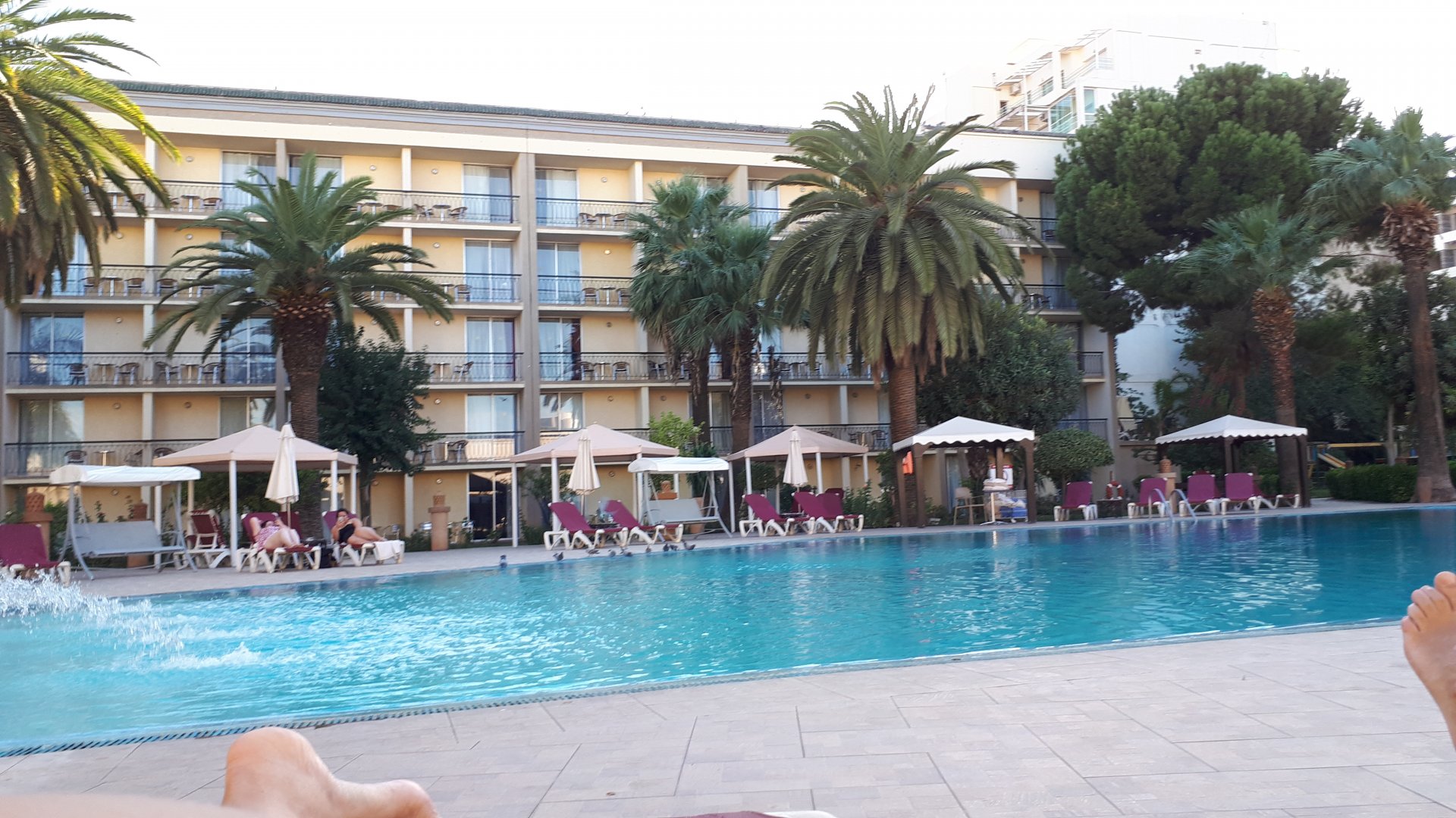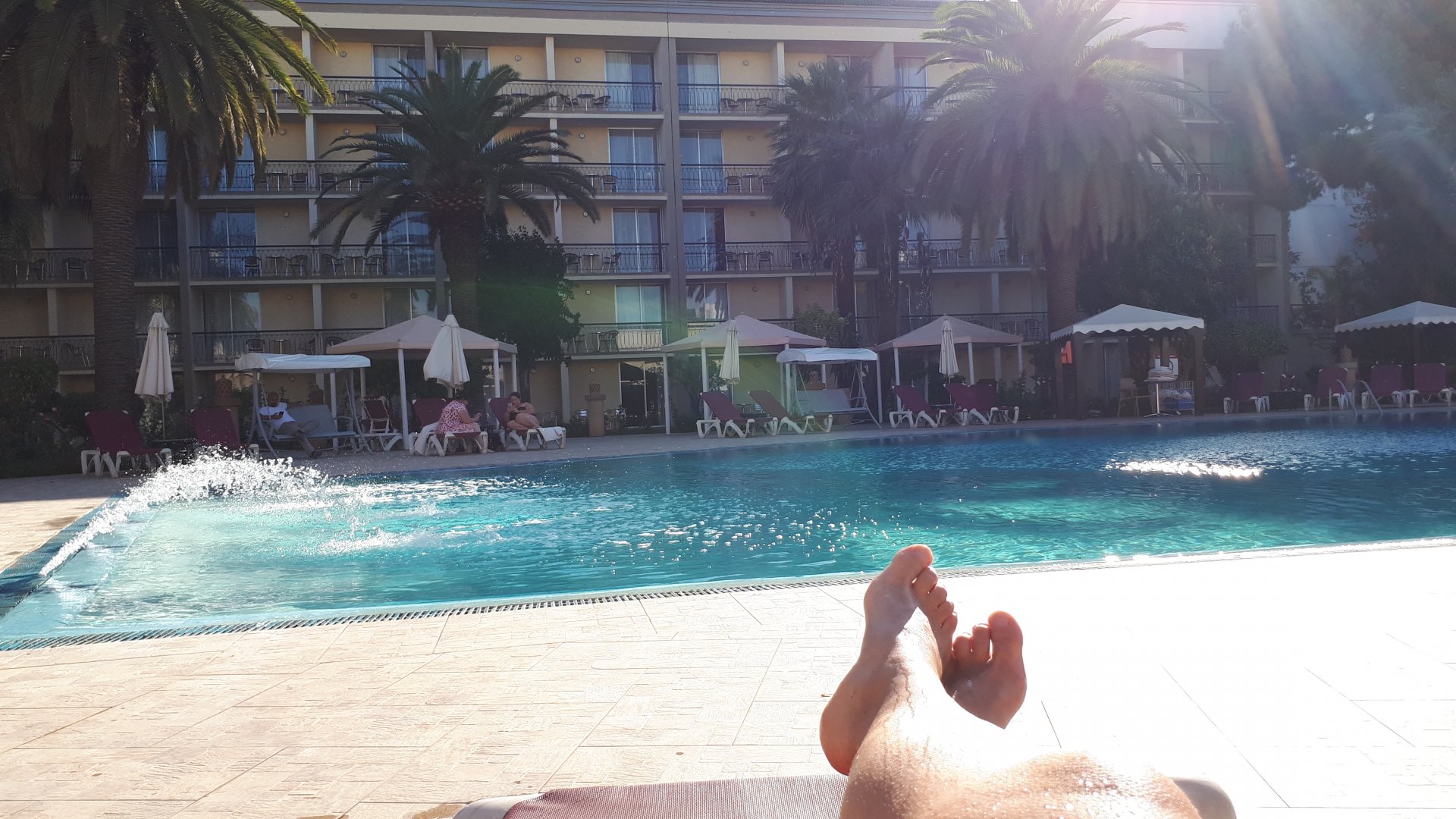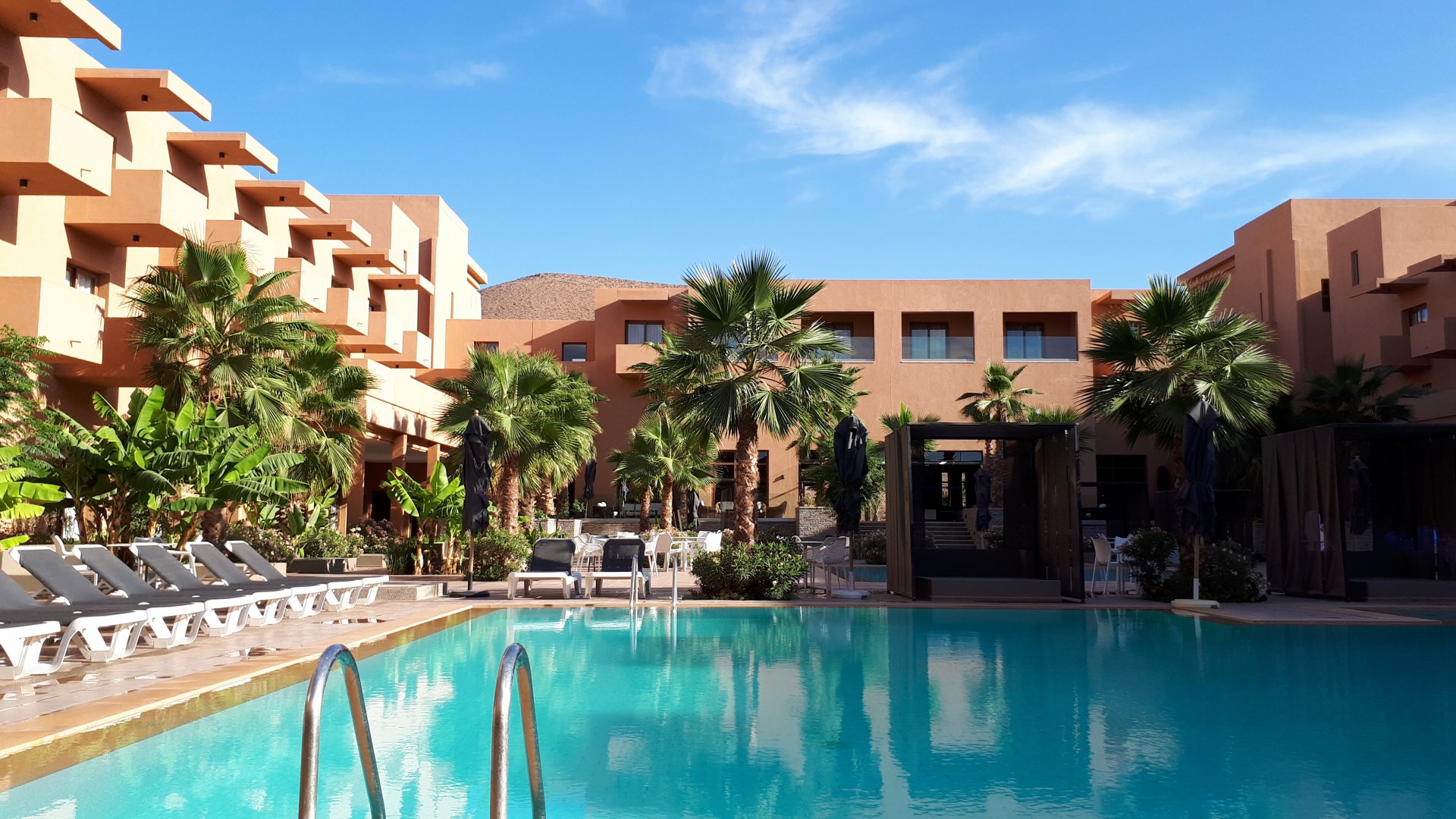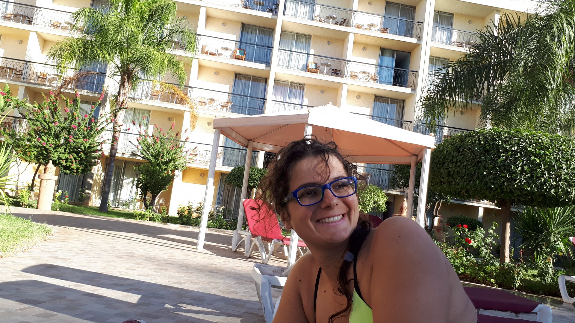 On the next day, we have a nice breakfast before riding out. The weather forecast was for rain on the coast and judging by our previous days in Tan Tan and Guelmim, we would be getting shitty weather all the way back to Tangier, so instead we decided to go back via the interior which was also very much preferred next to the coast as far as roads and people. It was also understood that we wouldn't be visiting Morocco on the bike on the following year, so might as well be on our preferred roads. Heading north still towards Marrakech, but before getting there we were turning east towards Beni Mellal and then Midelt. Moroccan cruise control: We were now heading to the plateau once again, but before we got there we both spent one of the most uncomfortable hours on a bike ever. Although it wasn't the hottest we've ridden through, the humidity was off the charts, we were soaked in sweat and uncomfortable. My groin ..., well, you know how it feels after a few hours like that. We were very happy to arrive at our hotel for the evening, and I swear it took me less than 5 minutes between arriving for check-in and getting in the pool. There are no pictures of the afternoon because we didn't really care for that area and Maria was too uncomfortable to be feeling like holding up a camera. With every part of me feeling relieved and fresh, we enjoyed a cool evening sitting outside having cold water, while being kept company by chickens unaware of the menu. In Morocco, every animal climbs trees, or was it just trying to escape the cooking pot? A very good night's sleep was had in our very colorfully lit hotel room.