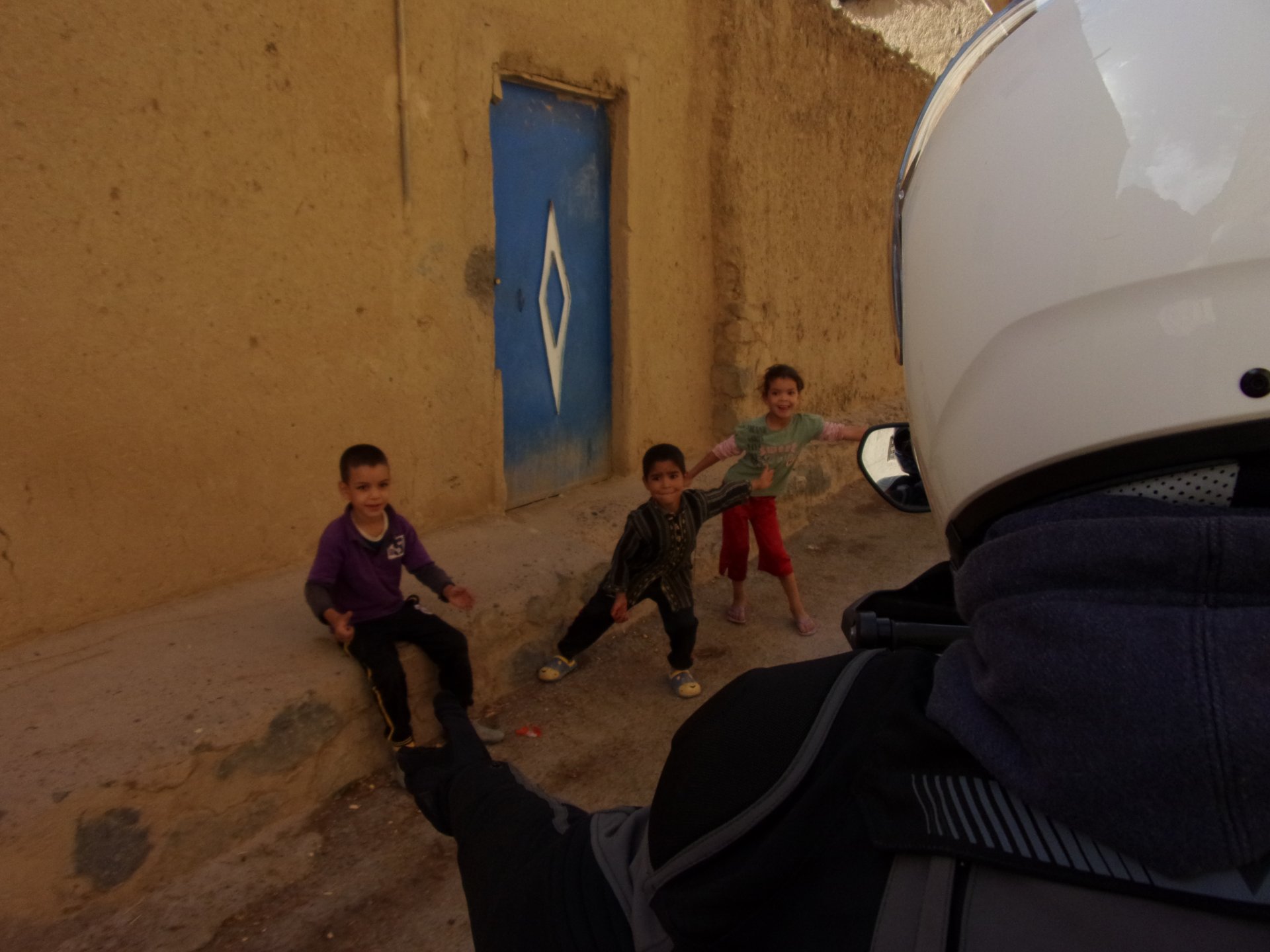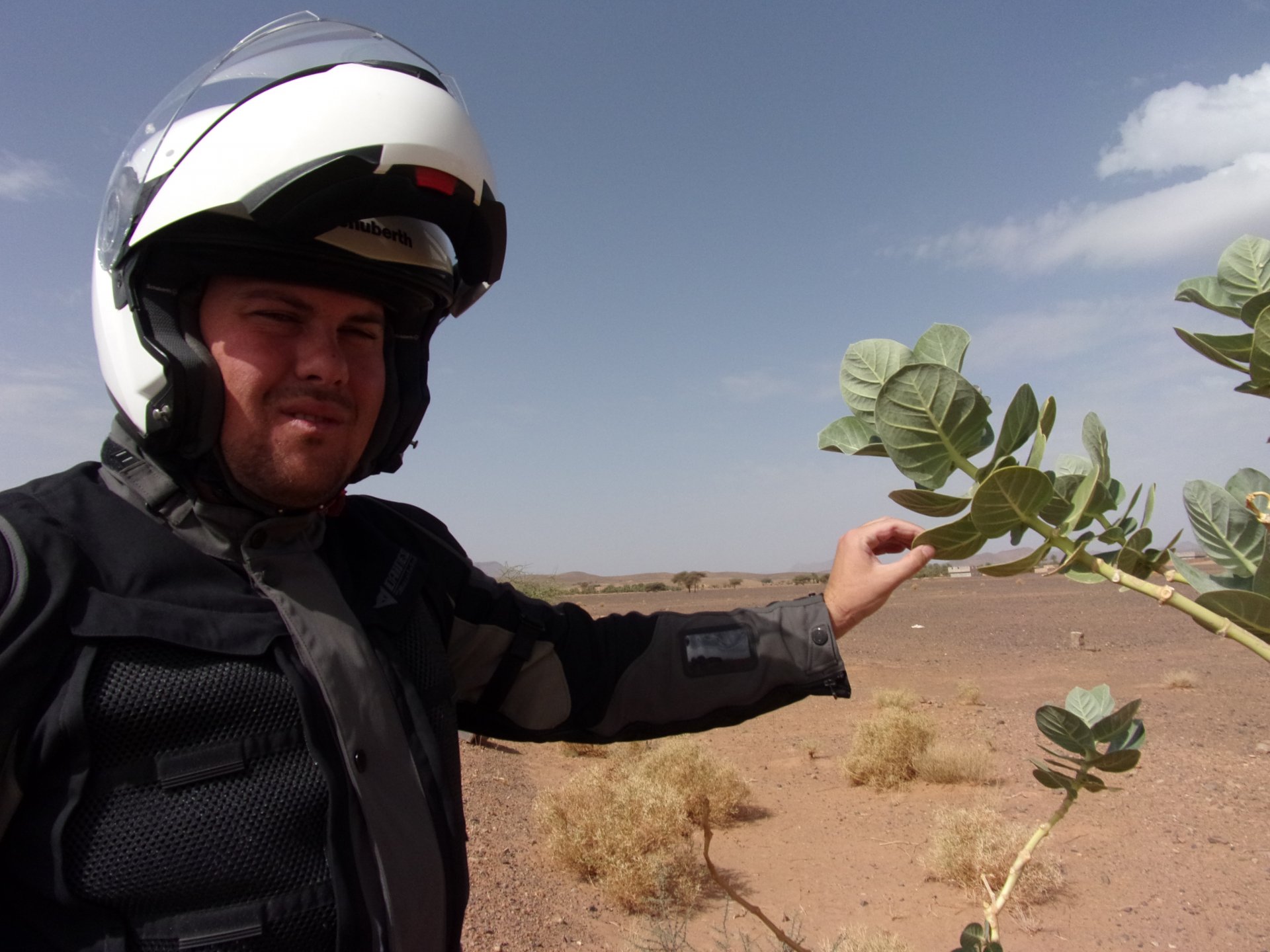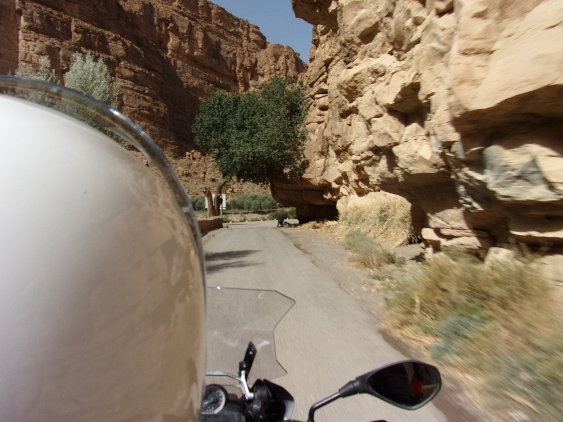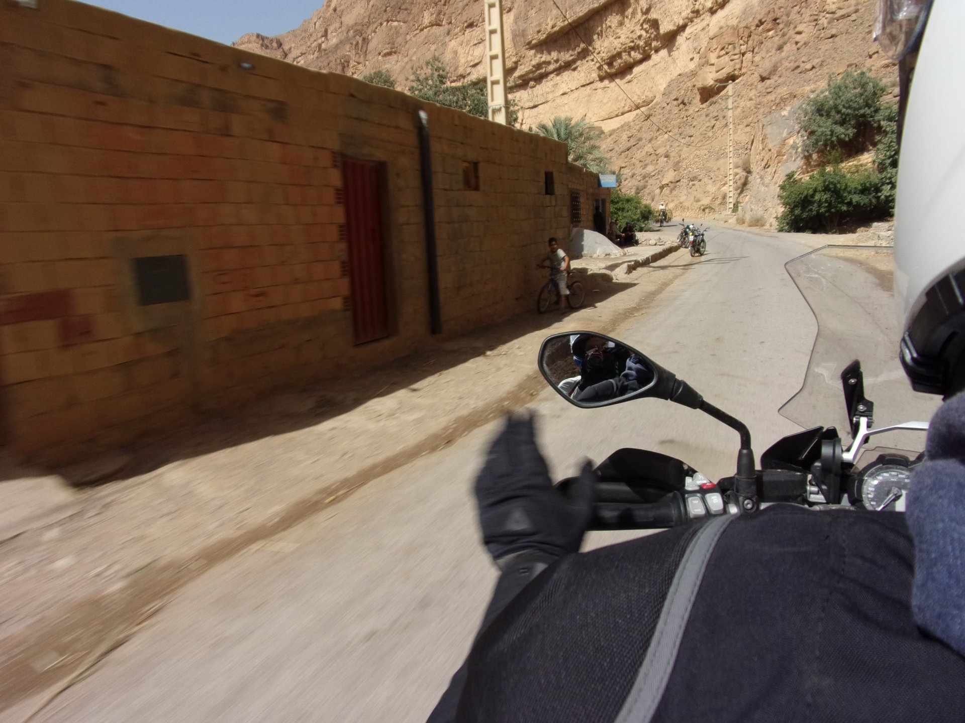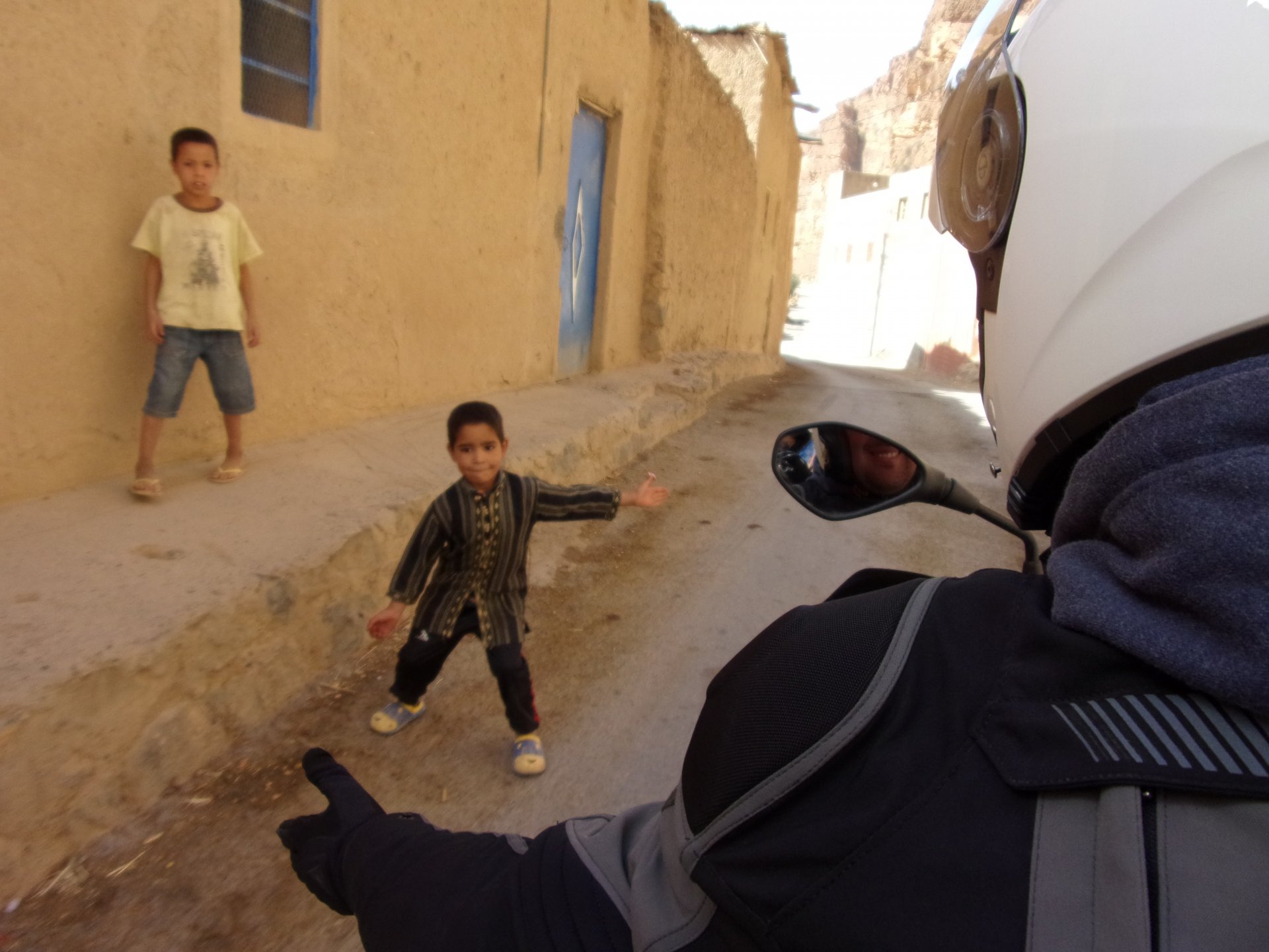 So, waking up excited for a ride, and realizing it's not raining again is a great feeling. We put both cases on the bike and go for breakfast, I remember plenty of fruit and a big cup of coffee. From near Midelt, we left for Er-Rich ... Nothing really special about it, just a sort of outpost place surrounded by lots of space, but also very typical down to the shop style carpentry, give it a look as Maria navigates us out of there in 20 seconds after I've been ending up at the same dead end for the third time and thus started a great ride, from there to the Gorges du Todra. First stretch is as flat as flat gets My face is already dry, even though we didn't face lots of heat in this trip, so as the sun starts to come out Maria makes me stop to put sunscreen off. I take the chance to document something very weird that happens in Morocco. In medium to big towns, in a country where "nobody" drinks alcohol, there is this circle of broken beer and whiskey bottles surrounding said towns. Magic, aliens must ditch their booze bottles here. This plateau eventually leeds to the most scenic and bucolic stretch of road ever I'm so happy to be here that when one girl out of a group of kids fails to slap my hand as we ride by, I stop, backtrack, and go for a second run, everyone thought it was funny and both we and the kids got a real kick out of it, that made my day. She's wearing the red shorts/pants in this picture, just look at her smile: Backtracking and going for the second run: And this mini ninja almost took my hand off on the second run And just like that we are out of that magic little canyon/valley ... Happy days: We spot some squirrel like creature, spot it in the next three pictures: A brief stop at the canyon touristy spot, would be rude not to A short stop a few miles on just before the canyon ends and we face the heat while making a dash for the dunes, to our special place. I don't remember why, but I ended up tasting one of those leaves ... it was awful.... Quick enough, and we're there with sand under our feet! This might be repetitive, but it is an amazing place ... Most of the ride that day was from places where we had been before, to places where we had been before, and yet we were surprised at how amazing the ride was.