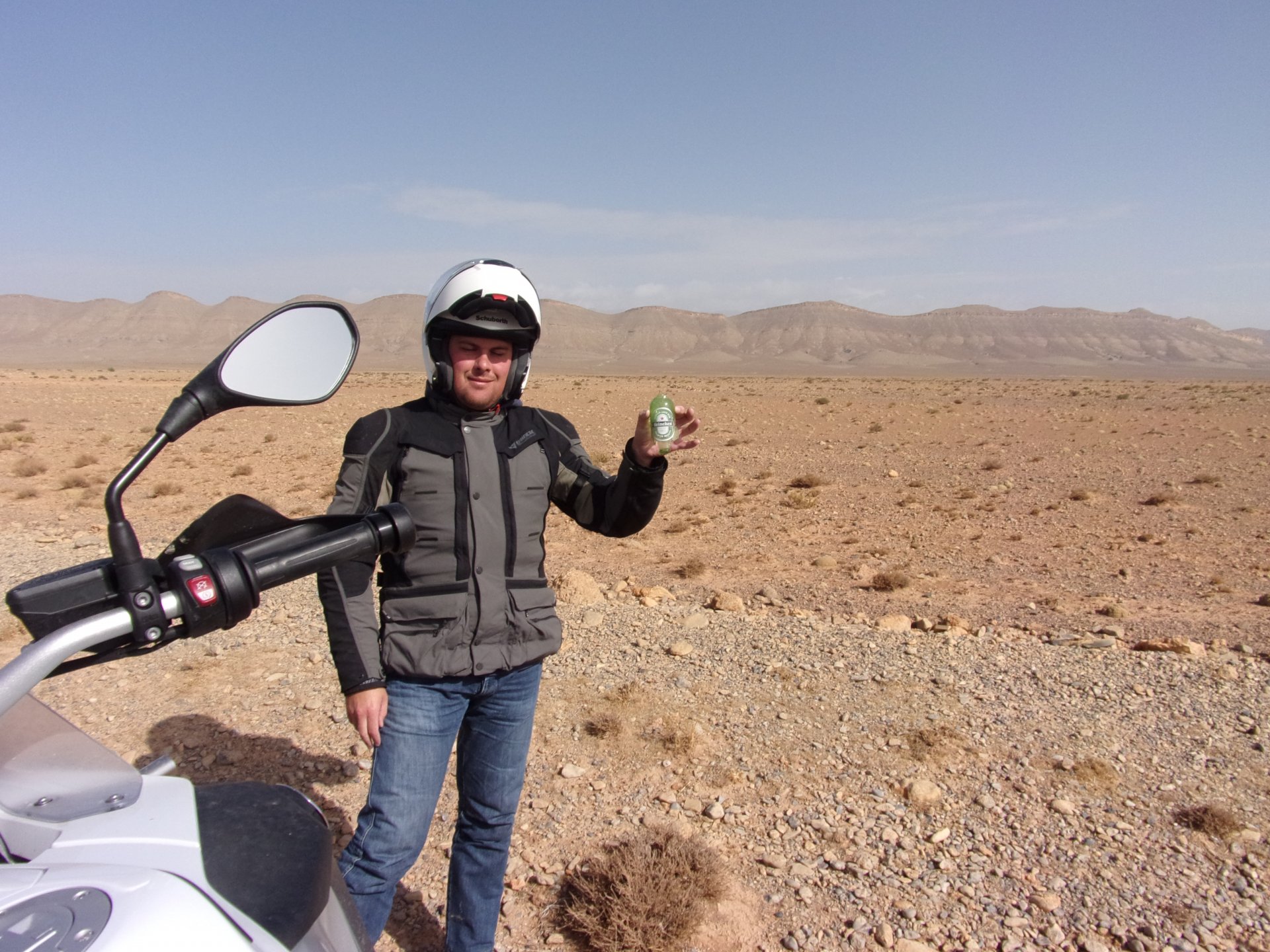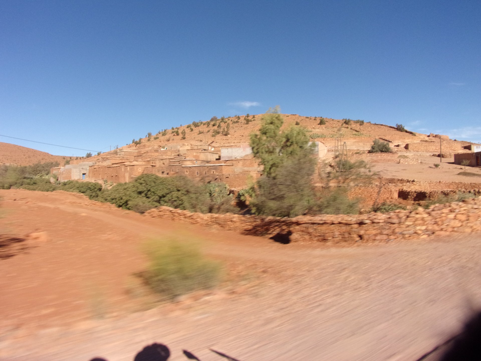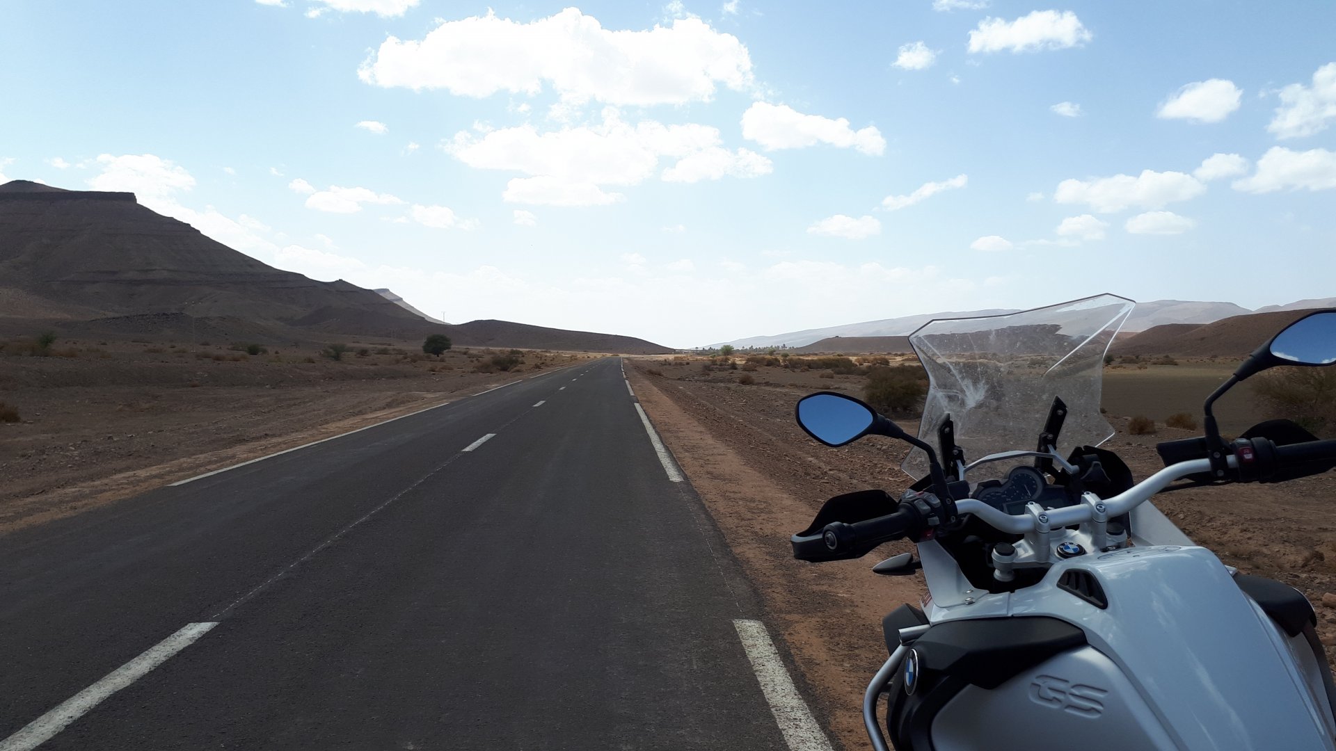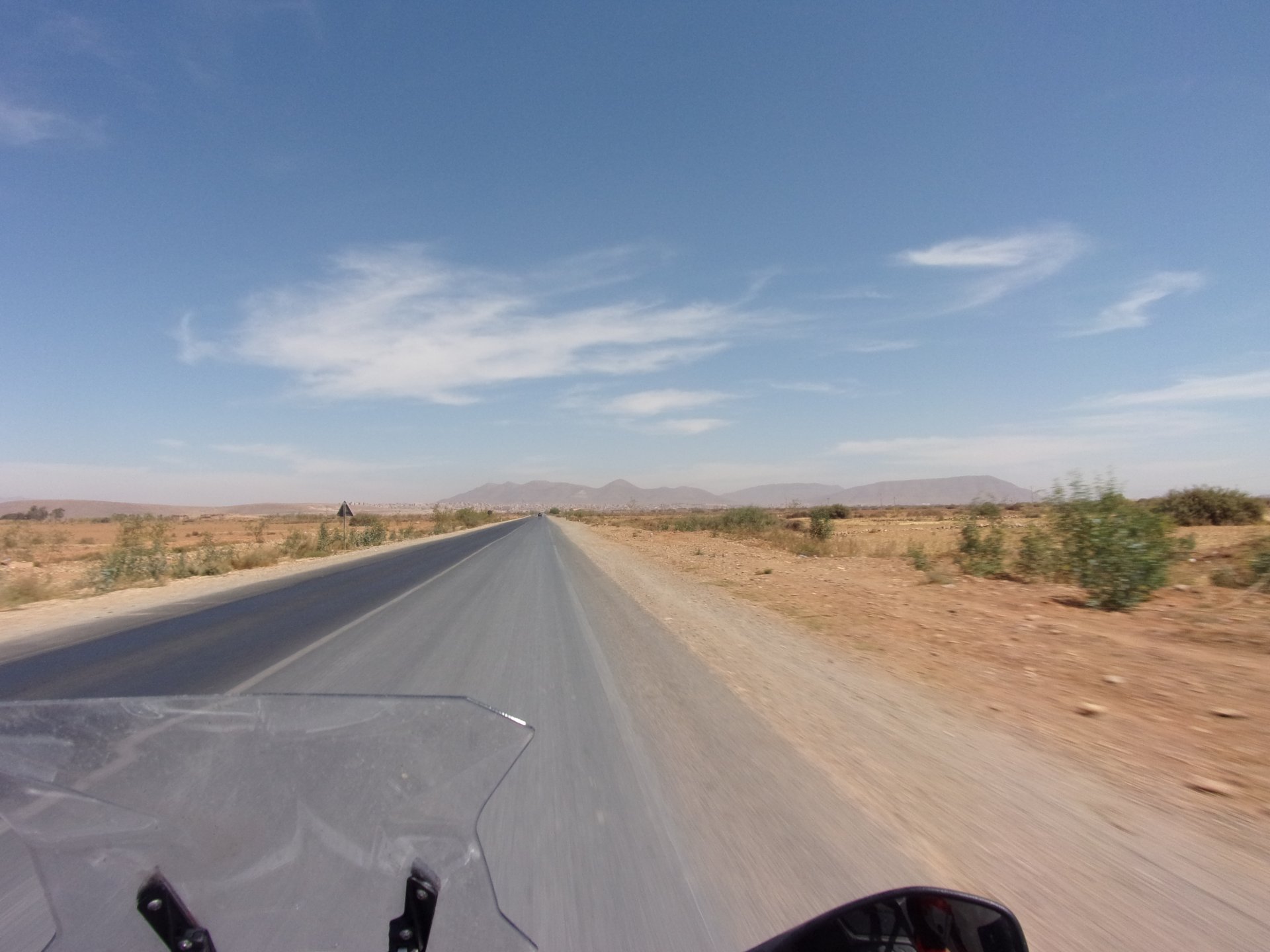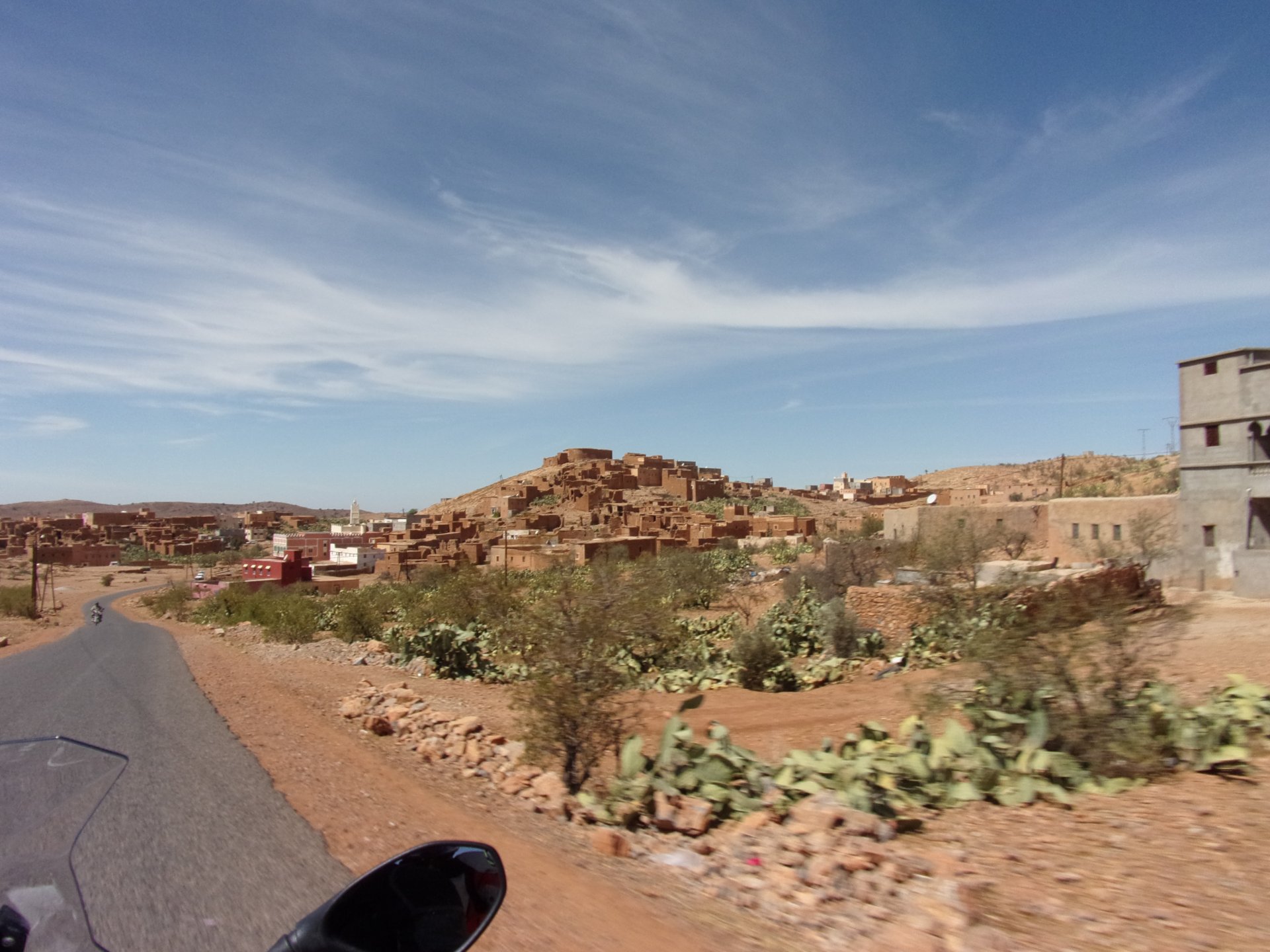 So, waking up excited for a ride, and realizing it's not raining again is a great feeling. We put both cases on the bike and go for breakfast, I remember plenty of fruit and a big cup of coffee. From near Midelt, we left for Er-Rich ... Nothing really special about it, just a sort of outpost place surrounded by lots of space, but also very typical down to the shop style carpentry, give it a look as Maria navigates us out of there in 20 seconds after I've been ending up at the same dead end for the third time and thus started a great ride, from there to the Gorges du Todra. First stretch is as flat as flat gets My face is already dry, even though we didn't face lots of heat in this trip, so as the sun starts to come out Maria makes me stop to put sunscreen off. I take the chance to document something very weird that happens in Morocco. In medium to big towns, in a country where "nobody" drinks alcohol, there is this circle of broken beer and whiskey bottles surrounding said towns. Magic, aliens must ditch their booze bottles here. This plateau eventually leeds to the most scenic and bucolic stretch of road ever I'm so happy to be here that when one girl out of a group of kids fails to slap my hand as we ride by, I stop, backtrack, and go for a second run, everyone thought it was funny and both we and the kids got a real kick out of it, that made my day. She's wearing the red shorts/pants in this picture, just look at her smile: Backtracking and going for the second run: And this mini ninja almost took my hand off on the second run And just like that we are out of that magic little canyon/valley ... Happy days: We spot some squirrel like creature, spot it in the next three pictures: A brief stop at the canyon touristy spot, would be rude not to A short stop a few miles on just before the canyon ends and we face the heat while making a dash for the dunes, to our special place. I don't remember why, but I ended up tasting one of those leaves ... it was awful.... Quick enough, and we're there with sand under our feet! This might be repetitive, but it is an amazing place ... Most of the ride that day was from places where we had been before, to places where we had been before, and yet we were surprised at how amazing the ride was.