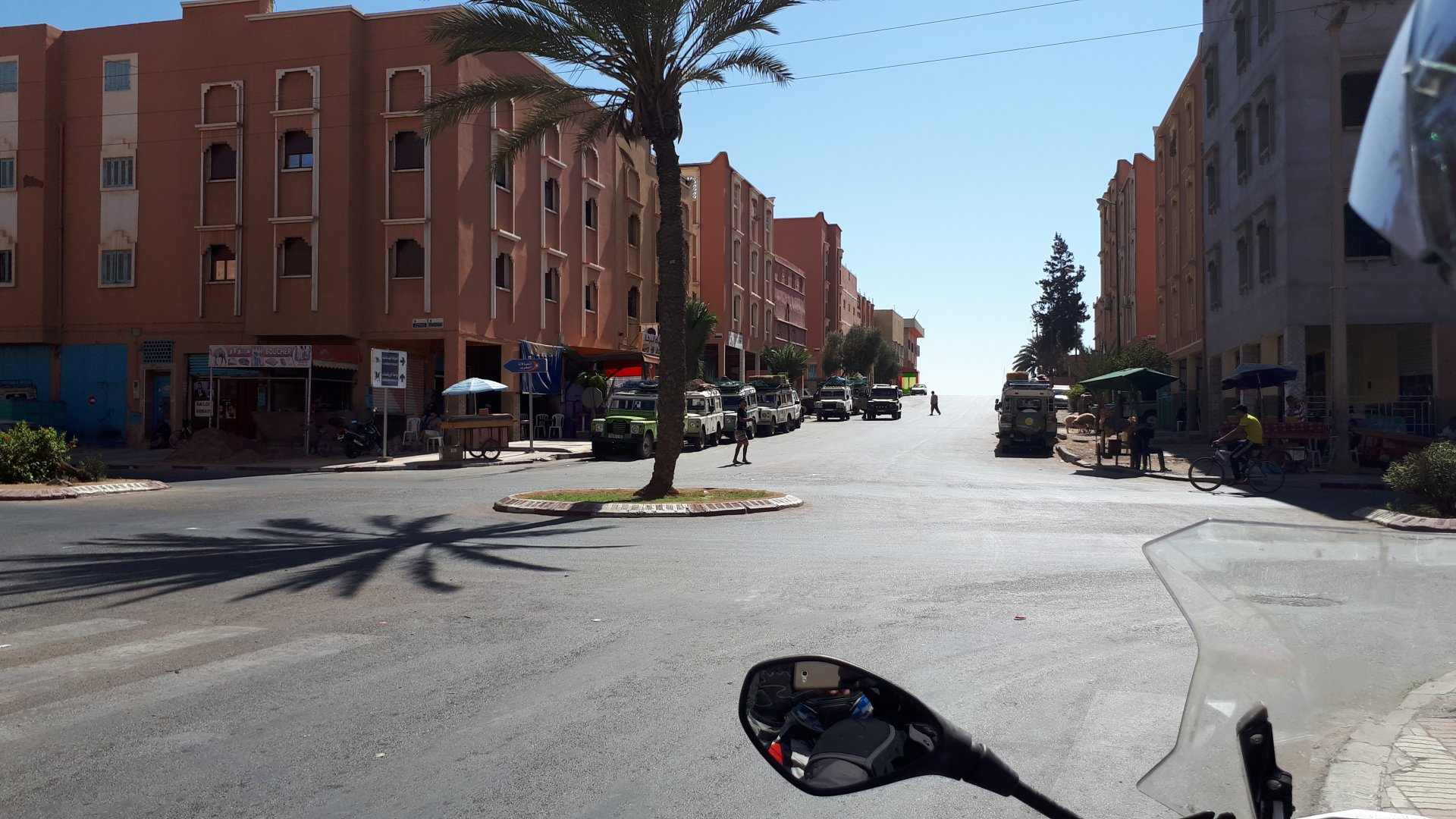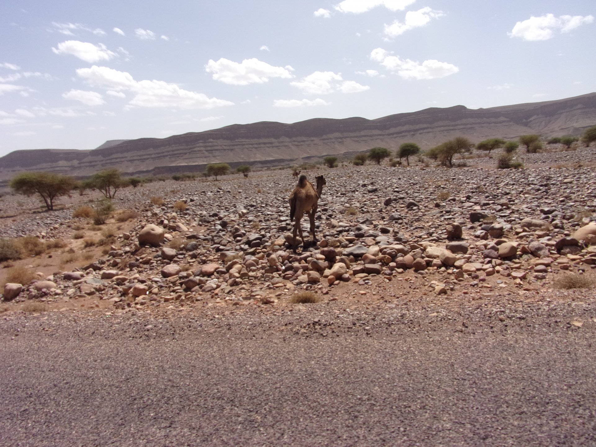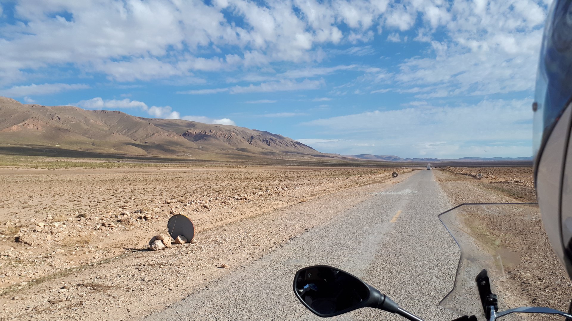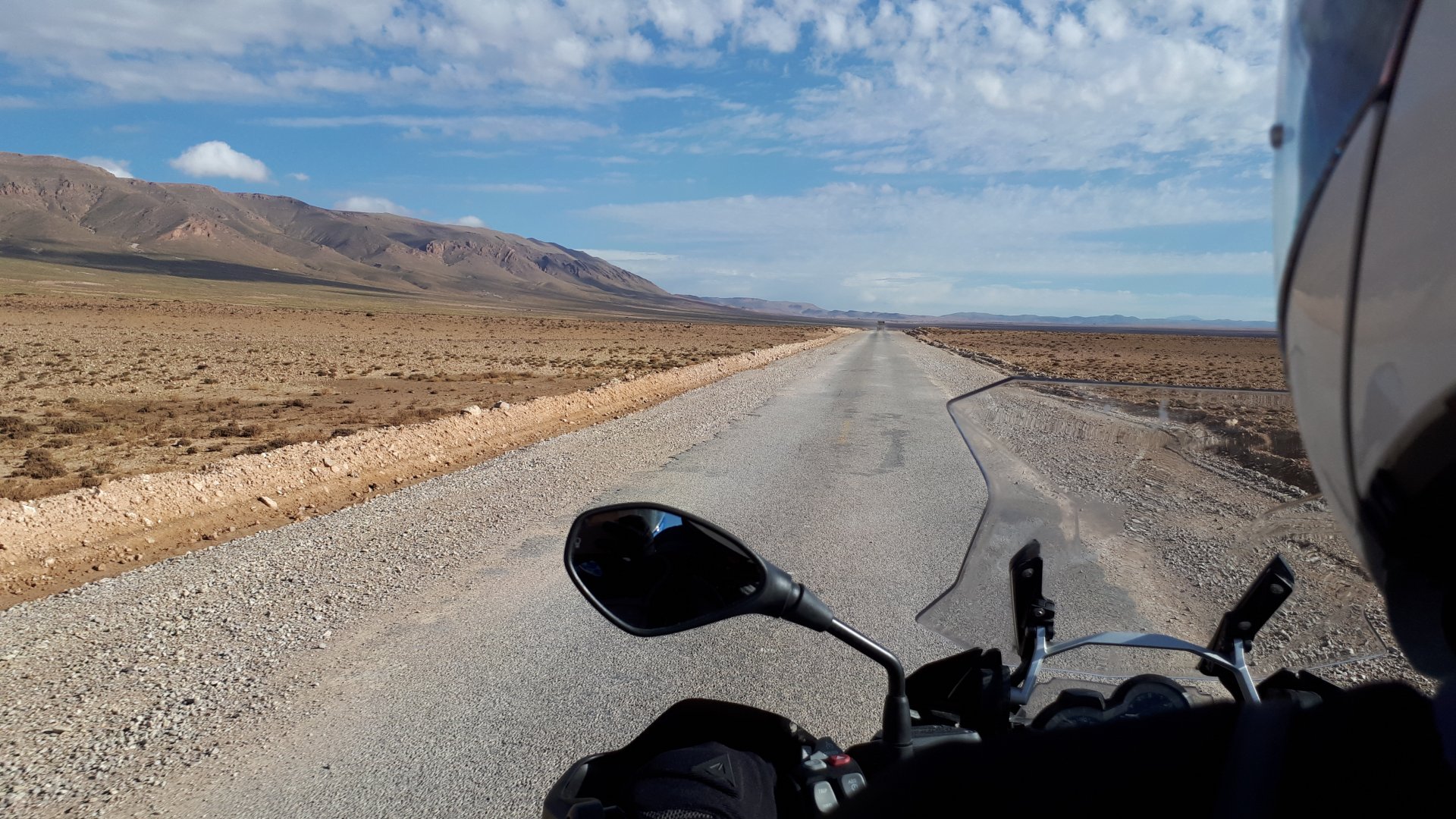 So, waking up excited for a ride, and realizing it's not raining again is a great feeling. We put both cases on the bike and go for breakfast, I remember plenty of fruit and a big cup of coffee. From near Midelt, we left for Er-Rich ... Nothing really special about it, just a sort of outpost place surrounded by lots of space, but also very typical down to the shop style carpentry, give it a look as Maria navigates us out of there in 20 seconds after I've been ending up at the same dead end for the third time and thus started a great ride, from there to the Gorges du Todra. First stretch is as flat as flat gets My face is already dry, even though we didn't face lots of heat in this trip, so as the sun starts to come out Maria makes me stop to put sunscreen off. I take the chance to document something very weird that happens in Morocco. In medium to big towns, in a country where "nobody" drinks alcohol, there is this circle of broken beer and whiskey bottles surrounding said towns. Magic, aliens must ditch their booze bottles here. This plateau eventually leeds to the most scenic and bucolic stretch of road ever I'm so happy to be here that when one girl out of a group of kids fails to slap my hand as we ride by, I stop, backtrack, and go for a second run, everyone thought it was funny and both we and the kids got a real kick out of it, that made my day. She's wearing the red shorts/pants in this picture, just look at her smile: Backtracking and going for the second run: And this mini ninja almost took my hand off on the second run And just like that we are out of that magic little canyon/valley ... Happy days: We spot some squirrel like creature, spot it in the next three pictures: A brief stop at the canyon touristy spot, would be rude not to A short stop a few miles on just before the canyon ends and we face the heat while making a dash for the dunes, to our special place. I don't remember why, but I ended up tasting one of those leaves ... it was awful.... Quick enough, and we're there with sand under our feet! This might be repetitive, but it is an amazing place ... Most of the ride that day was from places where we had been before, to places where we had been before, and yet we were surprised at how amazing the ride was.