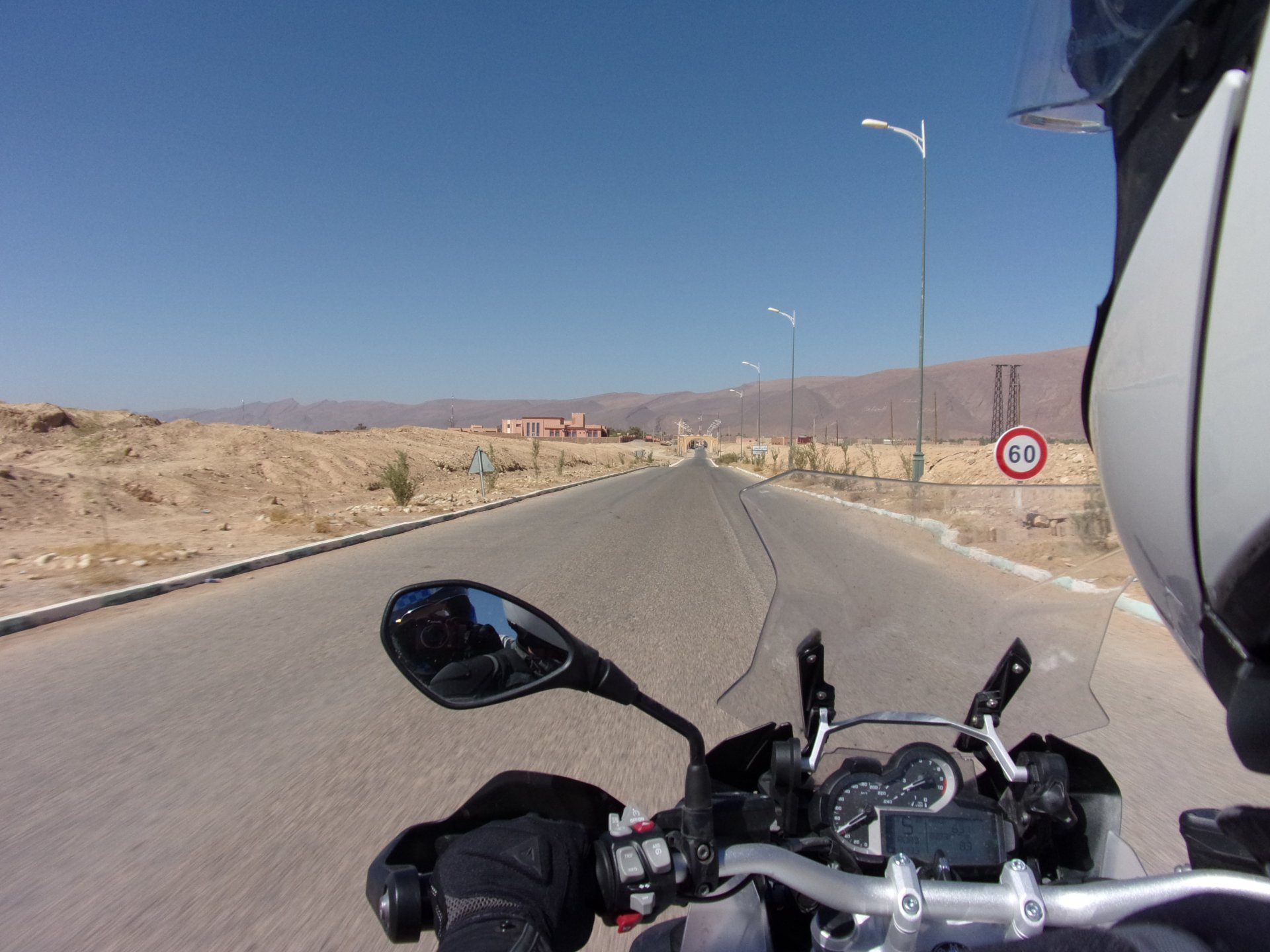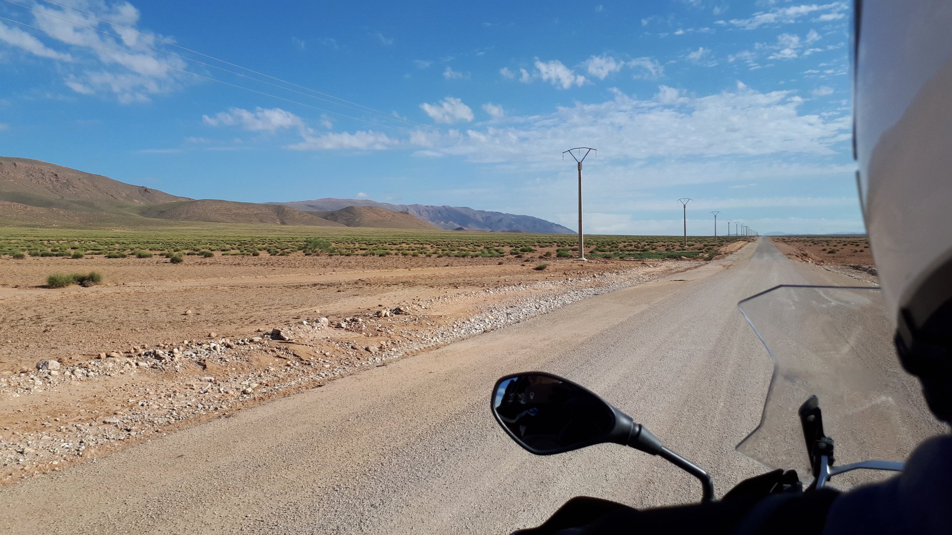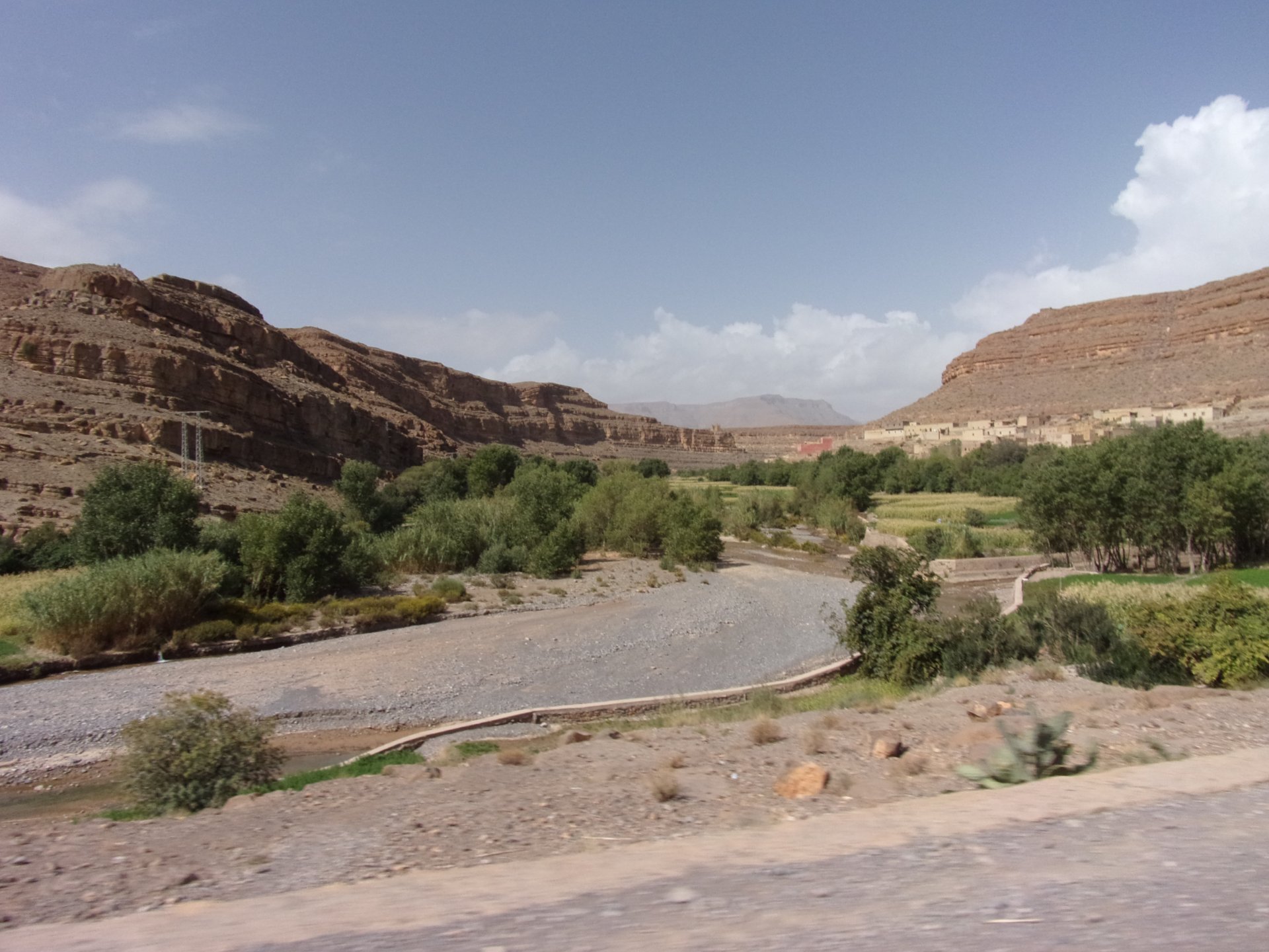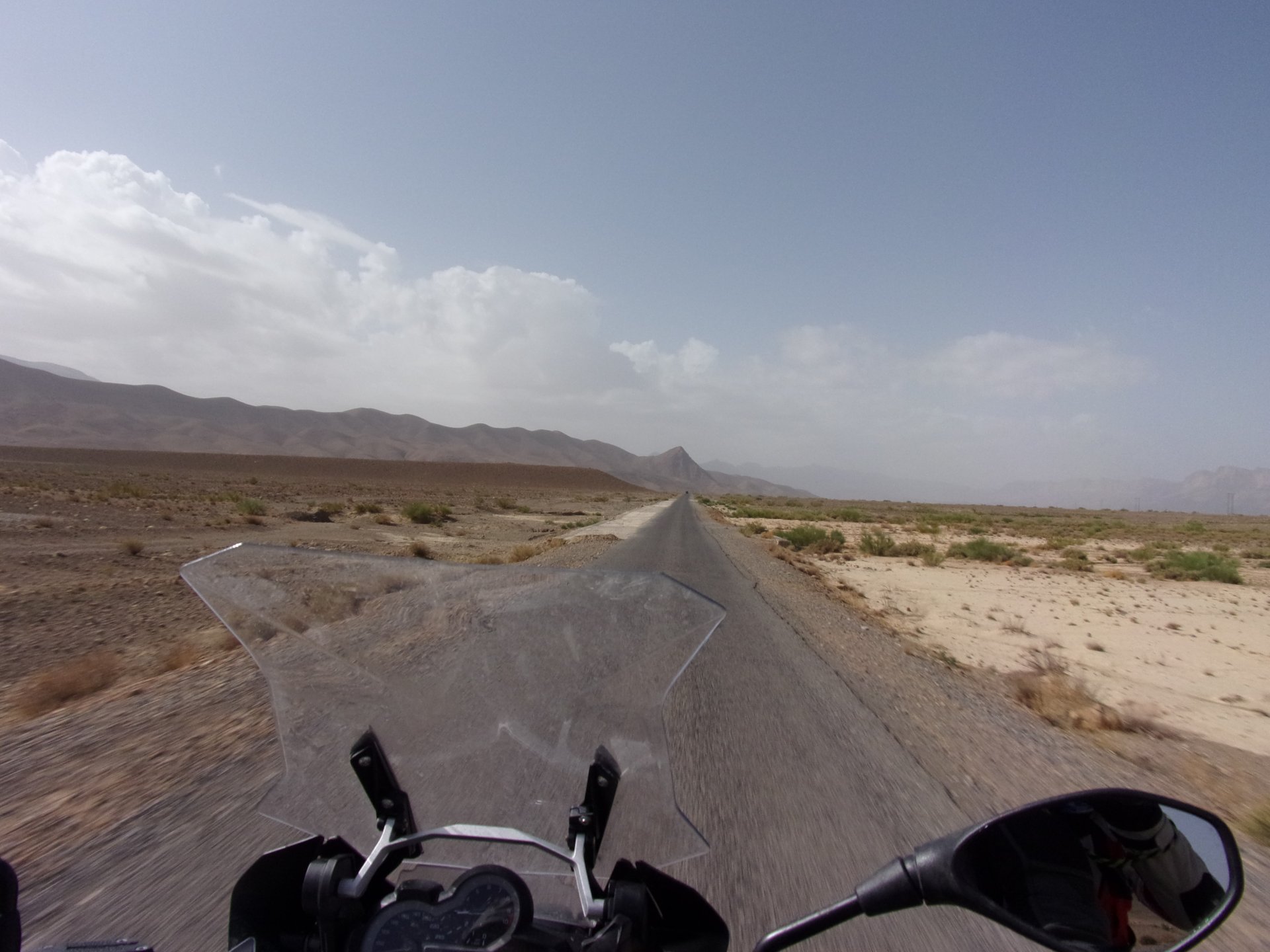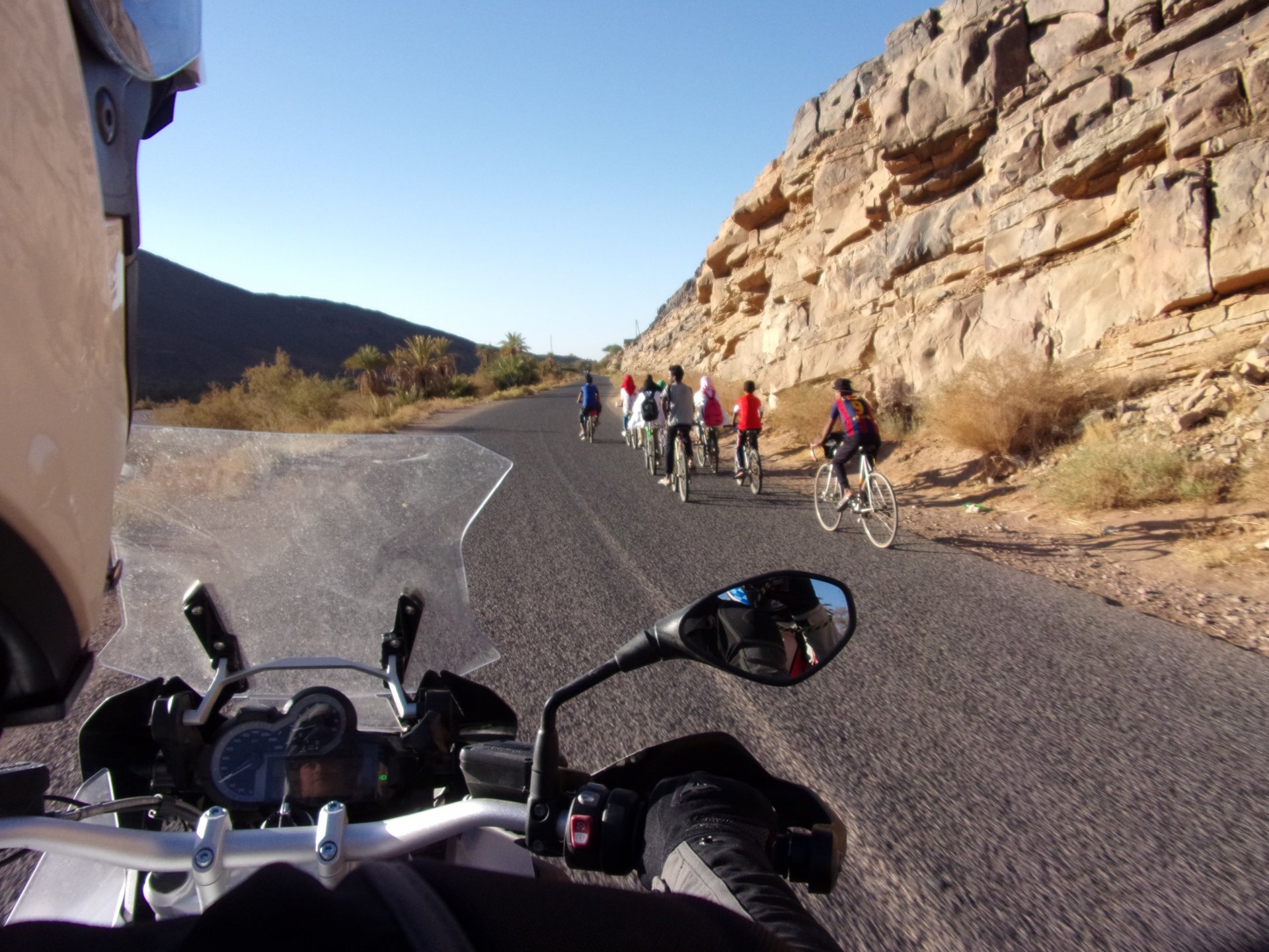 So, waking up excited for a ride, and realizing it's not raining again is a great feeling. We put both cases on the bike and go for breakfast, I remember plenty of fruit and a big cup of coffee. From near Midelt, we left for Er-Rich ... Nothing really special about it, just a sort of outpost place surrounded by lots of space, but also very typical down to the shop style carpentry, give it a look as Maria navigates us out of there in 20 seconds after I've been ending up at the same dead end for the third time and thus started a great ride, from there to the Gorges du Todra. First stretch is as flat as flat gets My face is already dry, even though we didn't face lots of heat in this trip, so as the sun starts to come out Maria makes me stop to put sunscreen off. I take the chance to document something very weird that happens in Morocco. In medium to big towns, in a country where "nobody" drinks alcohol, there is this circle of broken beer and whiskey bottles surrounding said towns. Magic, aliens must ditch their booze bottles here. This plateau eventually leeds to the most scenic and bucolic stretch of road ever I'm so happy to be here that when one girl out of a group of kids fails to slap my hand as we ride by, I stop, backtrack, and go for a second run, everyone thought it was funny and both we and the kids got a real kick out of it, that made my day. She's wearing the red shorts/pants in this picture, just look at her smile: Backtracking and going for the second run: And this mini ninja almost took my hand off on the second run And just like that we are out of that magic little canyon/valley ... Happy days: We spot some squirrel like creature, spot it in the next three pictures: A brief stop at the canyon touristy spot, would be rude not to A short stop a few miles on just before the canyon ends and we face the heat while making a dash for the dunes, to our special place. I don't remember why, but I ended up tasting one of those leaves ... it was awful.... Quick enough, and we're there with sand under our feet! This might be repetitive, but it is an amazing place ... Most of the ride that day was from places where we had been before, to places where we had been before, and yet we were surprised at how amazing the ride was.