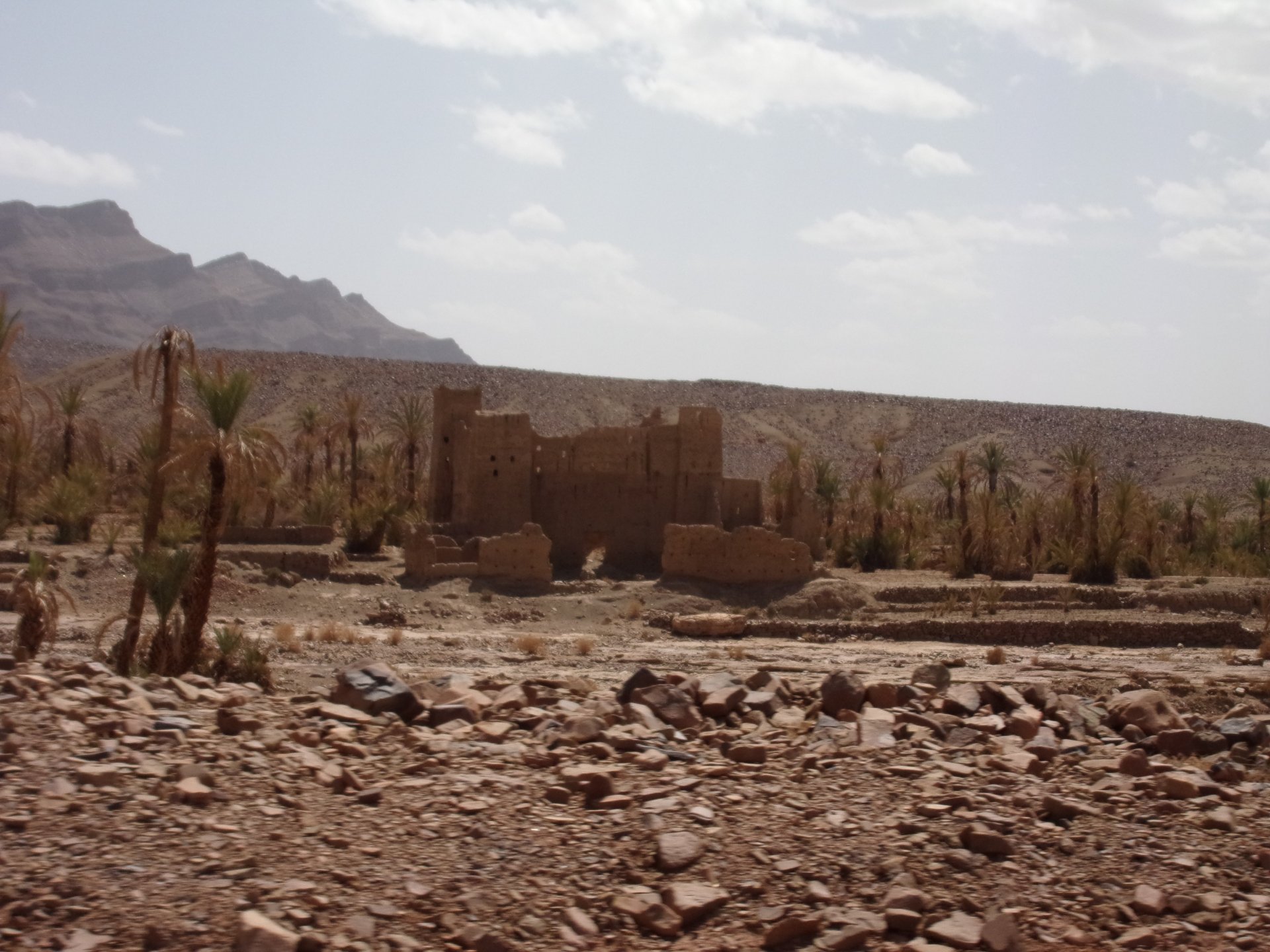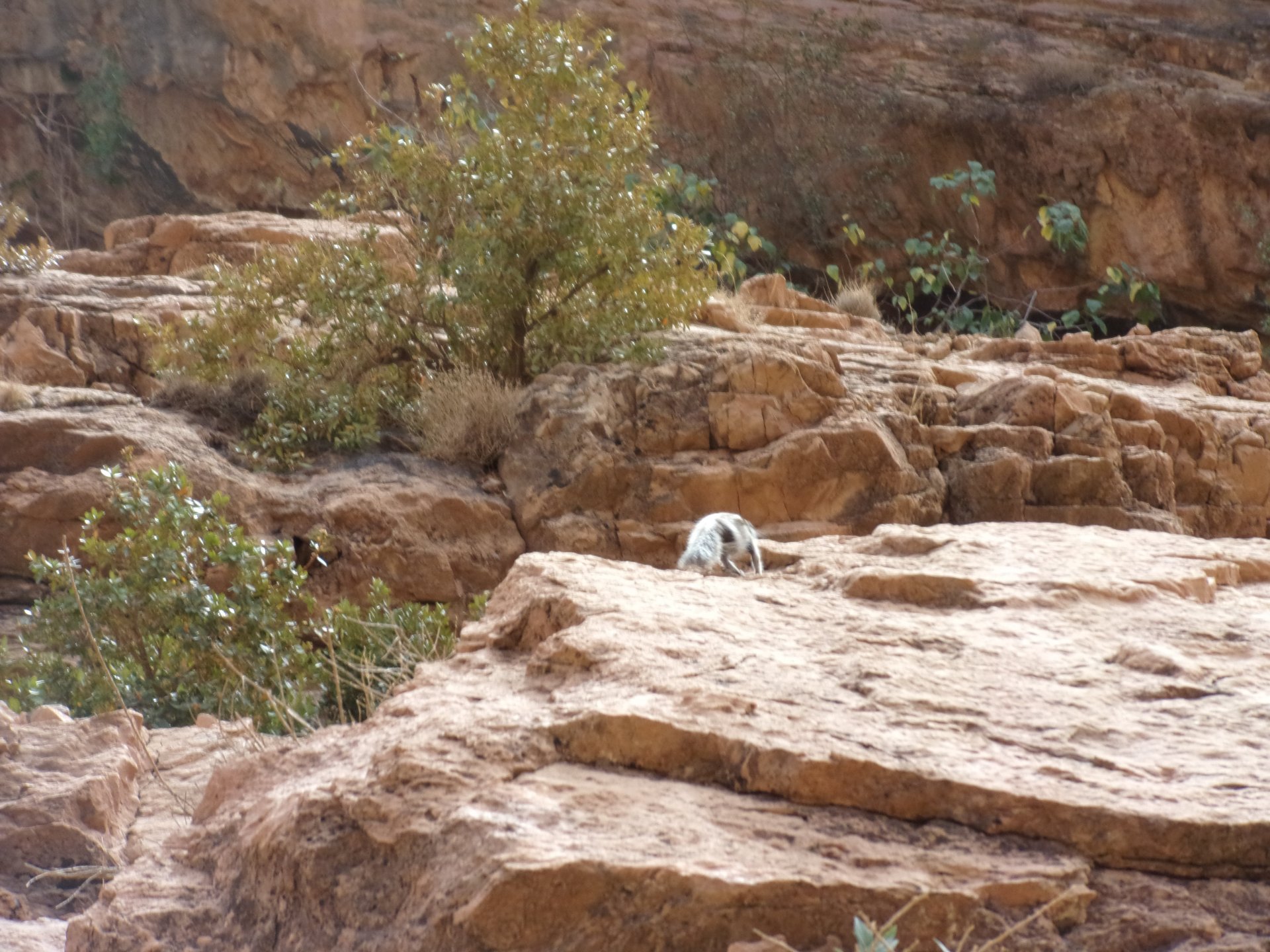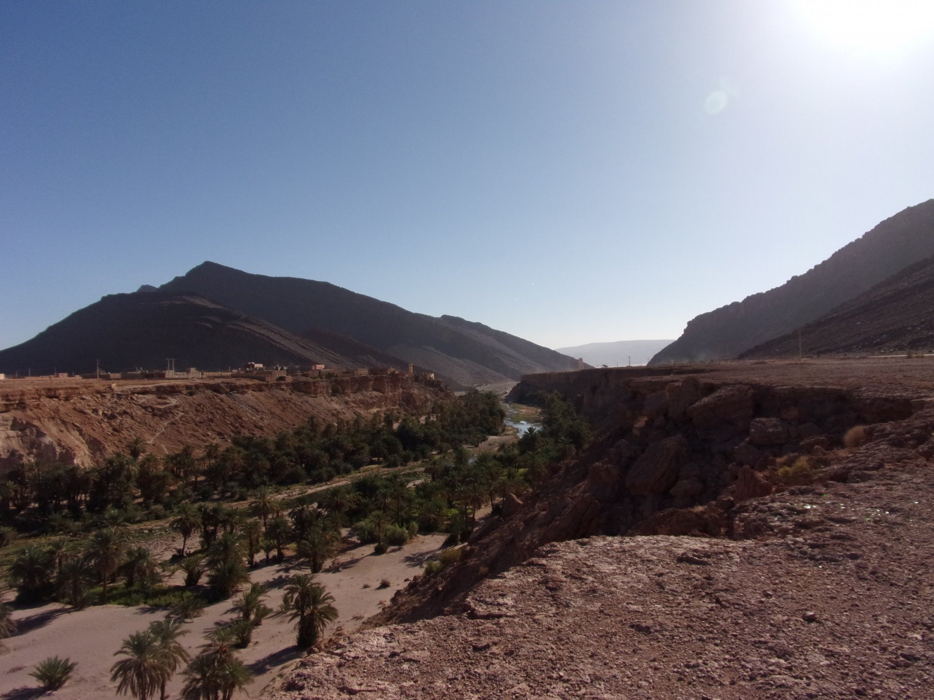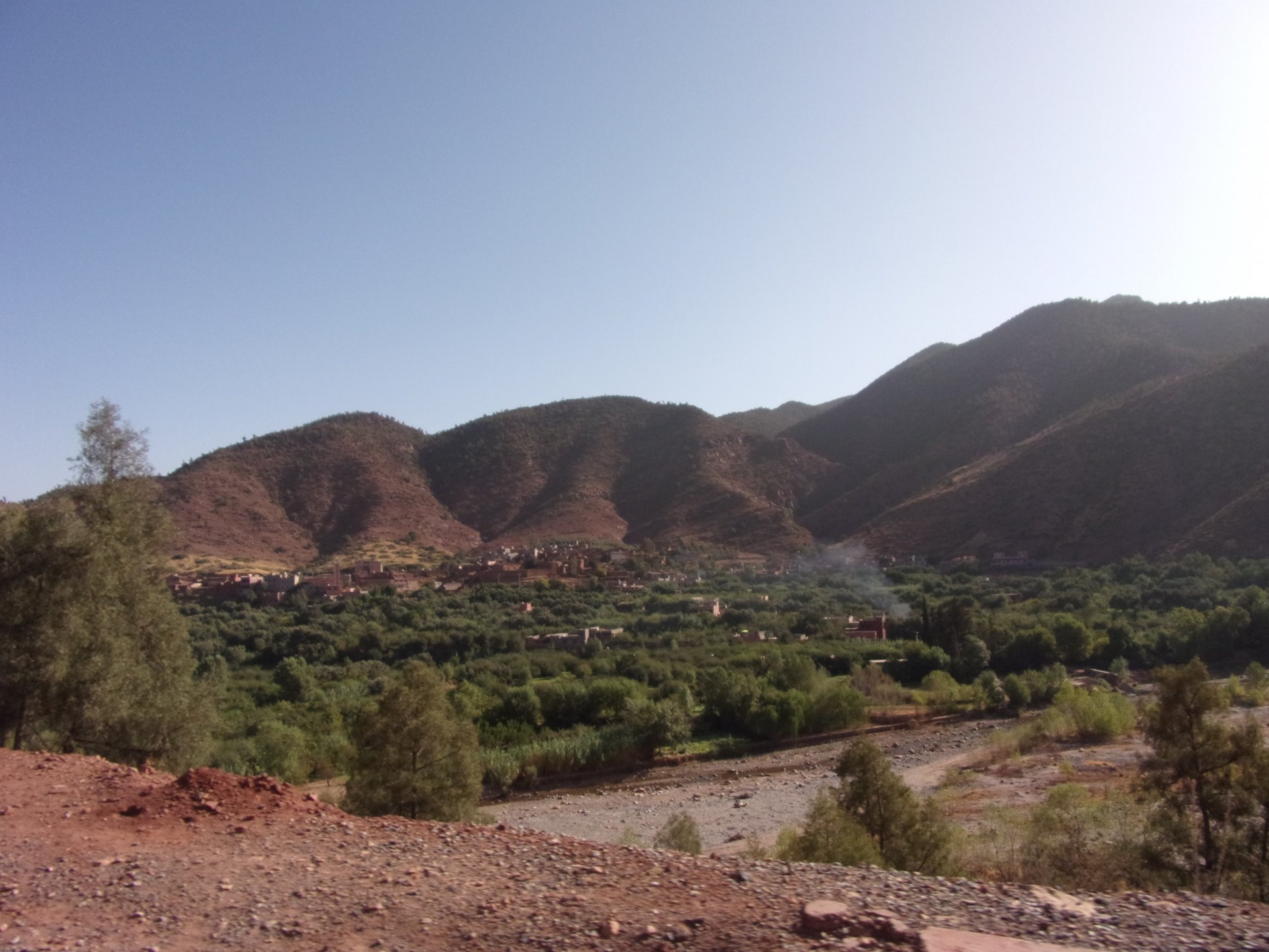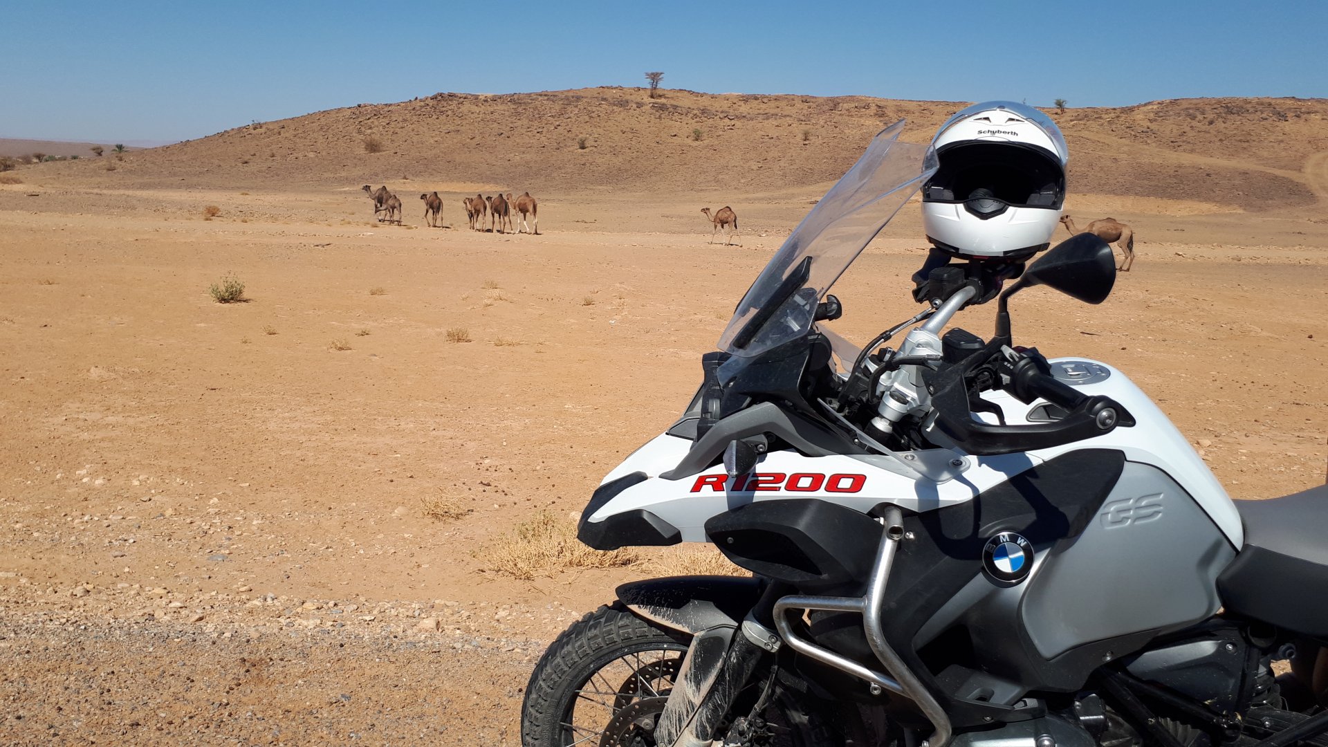 So, waking up excited for a ride, and realizing it's not raining again is a great feeling. We put both cases on the bike and go for breakfast, I remember plenty of fruit and a big cup of coffee. From near Midelt, we left for Er-Rich ... Nothing really special about it, just a sort of outpost place surrounded by lots of space, but also very typical down to the shop style carpentry, give it a look as Maria navigates us out of there in 20 seconds after I've been ending up at the same dead end for the third time and thus started a great ride, from there to the Gorges du Todra. First stretch is as flat as flat gets My face is already dry, even though we didn't face lots of heat in this trip, so as the sun starts to come out Maria makes me stop to put sunscreen off. I take the chance to document something very weird that happens in Morocco. In medium to big towns, in a country where "nobody" drinks alcohol, there is this circle of broken beer and whiskey bottles surrounding said towns. Magic, aliens must ditch their booze bottles here. This plateau eventually leeds to the most scenic and bucolic stretch of road ever I'm so happy to be here that when one girl out of a group of kids fails to slap my hand as we ride by, I stop, backtrack, and go for a second run, everyone thought it was funny and both we and the kids got a real kick out of it, that made my day. She's wearing the red shorts/pants in this picture, just look at her smile: Backtracking and going for the second run: And this mini ninja almost took my hand off on the second run And just like that we are out of that magic little canyon/valley ... Happy days: We spot some squirrel like creature, spot it in the next three pictures: A brief stop at the canyon touristy spot, would be rude not to A short stop a few miles on just before the canyon ends and we face the heat while making a dash for the dunes, to our special place. I don't remember why, but I ended up tasting one of those leaves ... it was awful.... Quick enough, and we're there with sand under our feet! This might be repetitive, but it is an amazing place ... Most of the ride that day was from places where we had been before, to places where we had been before, and yet we were surprised at how amazing the ride was.