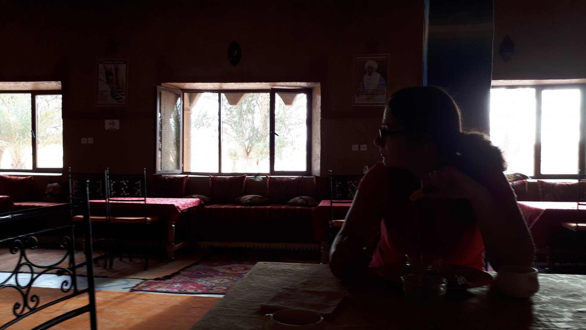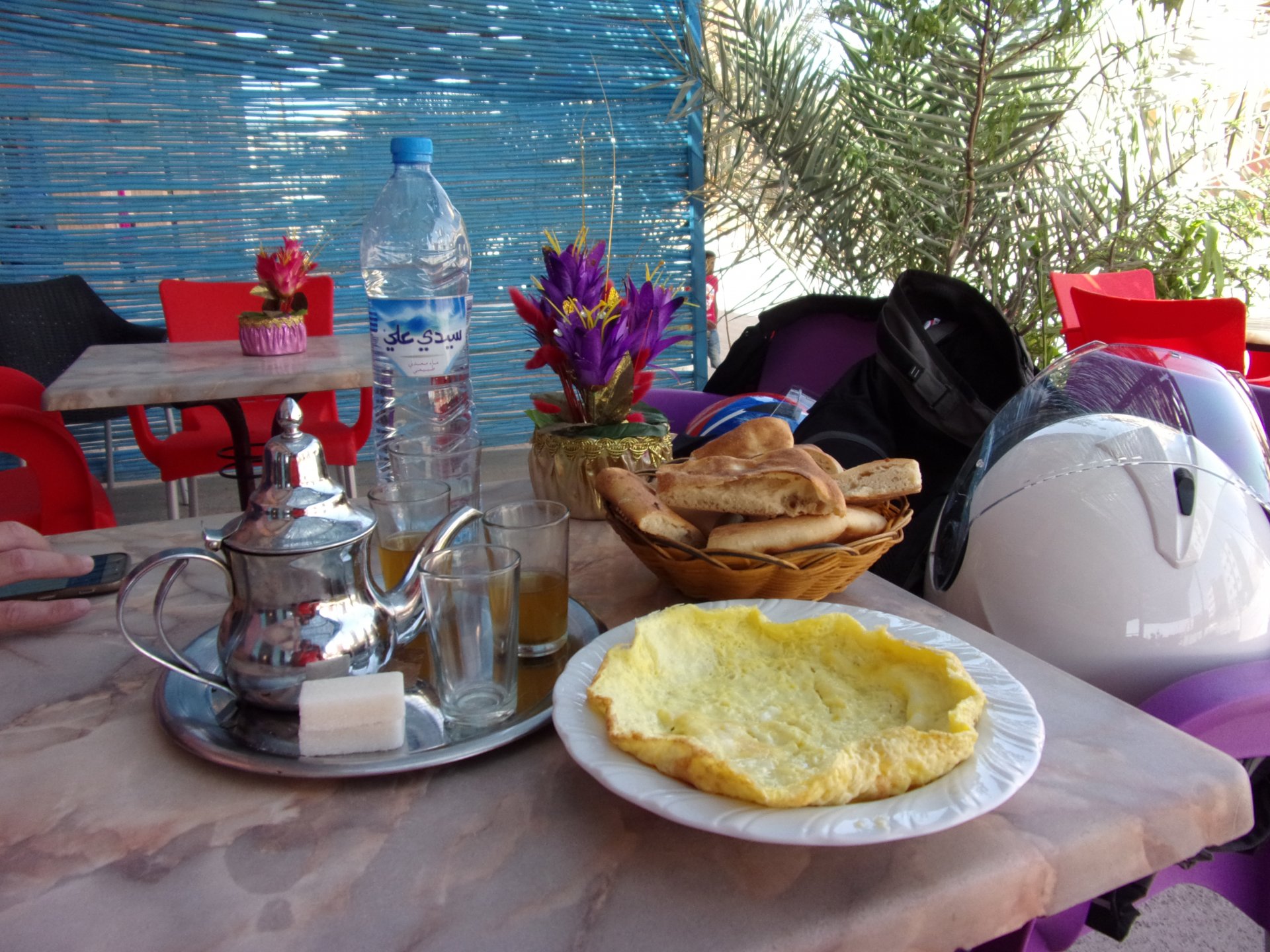 So, we woke up quite early, I always feel like staying here but Maria felt like we should give other places a chance. The day before had been amazing but a little tiresome, regardless off we went heading to Tata, which was halfway to Guelmim, which was near Tan Tan. First stop was not even an hour in, for face sunscreen, she made me We had a lot of this An omelette for lunch That day was pretty tough, in the afternoon. The roads weren't very inspiring, it was pretty boring, hard, traffic was too heavy and for whatever reason I was annoyed. Eventually we didn't make it to Tata, but stopped a little before in a very small inn. After a short conversation I realize that I had been feeling like coming on this trip for a while, and there was some pressure on seeing everything we wanted before having to go back home, together with a few worries regarding work I was actually stressed out today. After a while, everything was fine, we decided to carry on and go till Tan Tan, and take our time even if that meant having to rush for two days on motorways to go home. Allowing that accumulated stress to come out instantly made me feel great, and we were ready for dinner and adventures. And the view? Our hotel was a little simple and sparse, the only one person on staff when we arrived was very hospitable and nice and the smell outside was amazing, smelled like wet desert and adventure. During dinner there was no lighting for pictures, but we ended up having one of our best Moroccan meals ever, it was about a third of a country chicken cooked with onions and preserved lemons. It was amazing, and the effort those dudes made to make us feel welcomed was surreal. We had a great night's sleep, I was exhausted.