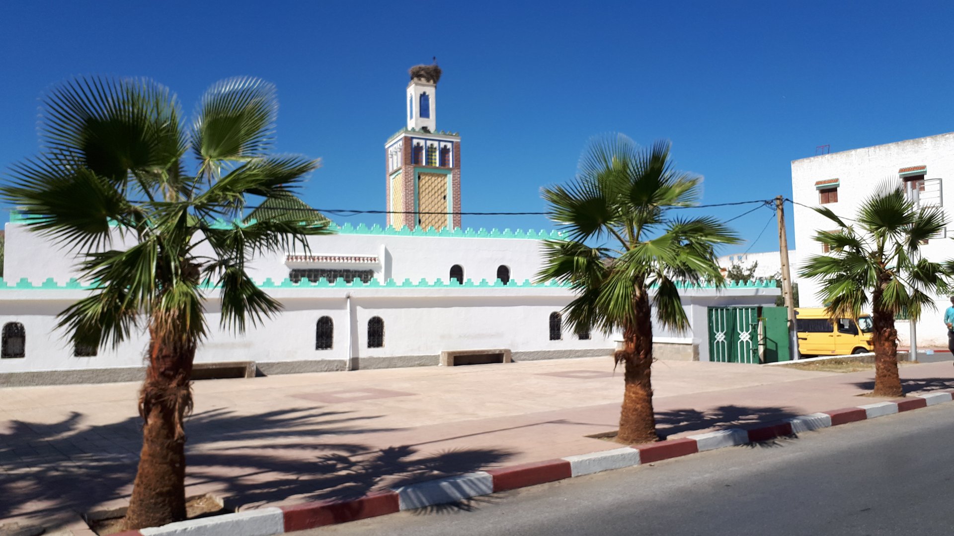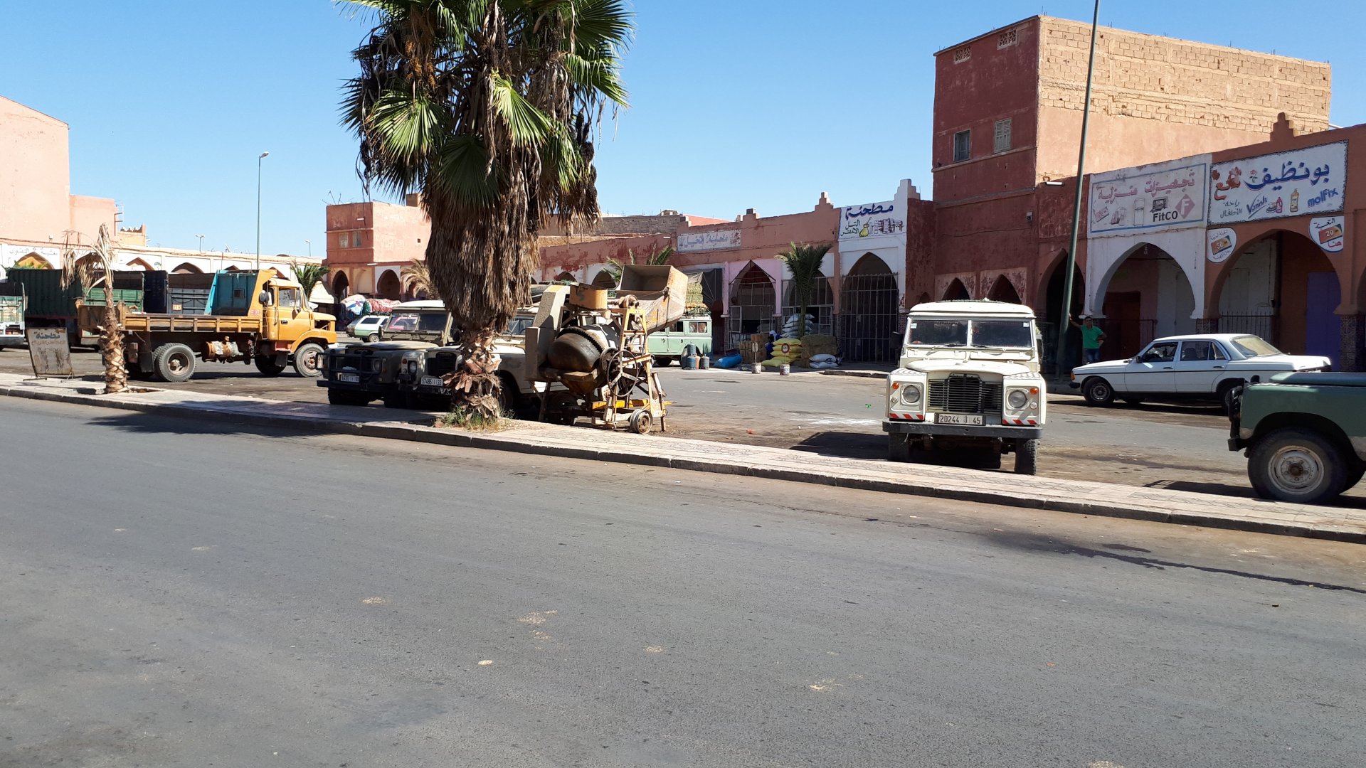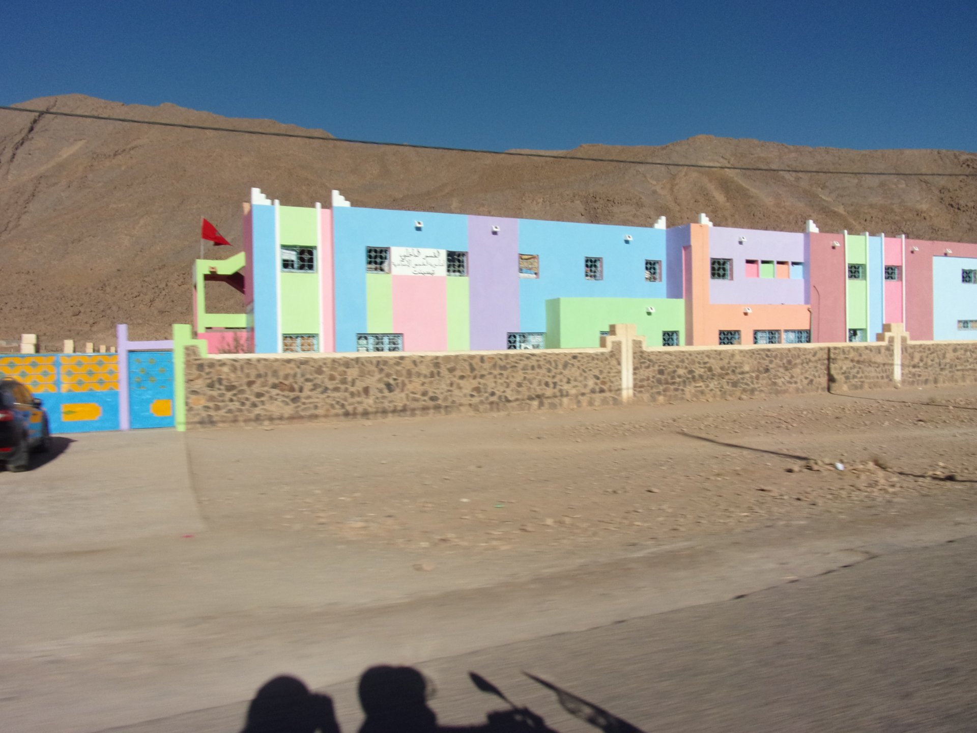 In the morning we had a little but very tasty breakfast, said goodbye, and off we went in search of the Desert Let's go to Guelmim! Schools are usually the most colorful buildings you'll ever see Heading from there to Guelmim we had one of this trip's best memories. We finally felt like being close to the Sahara as I imagined from reading books, it had just gotten proper hot and I decided to stop and drink some water, when a few camels appeared, and then continued to appear, must have been over 50 all scattered into smaller herds, it was pretty great. Guelmim, perfect mix of desert frontier city with developed world, never had I seen so many old Land Rovers as here and from here on south. We got here during the afternoon having had no lunch. Very hot and sweaty, we weren't hungry but each drank a full bottle of water and a couple of very cold orange juices. Made our way to our very nice hotel, and had some more water there, after diving head first into the swimming pool. We slept in a very comfy bed, feeling like a million bucks. I was very excited to go to Tan Tan, gateway to the desert.