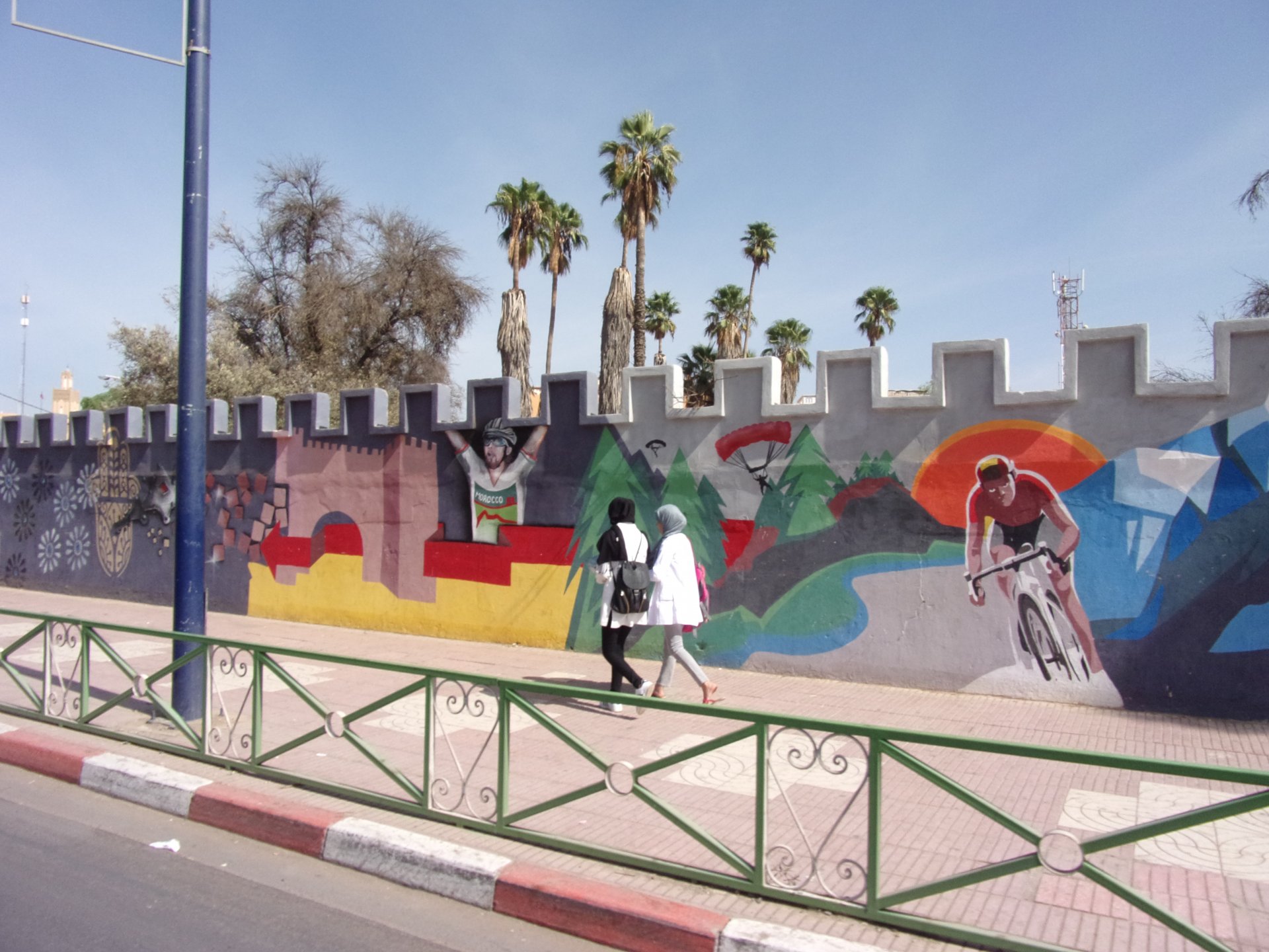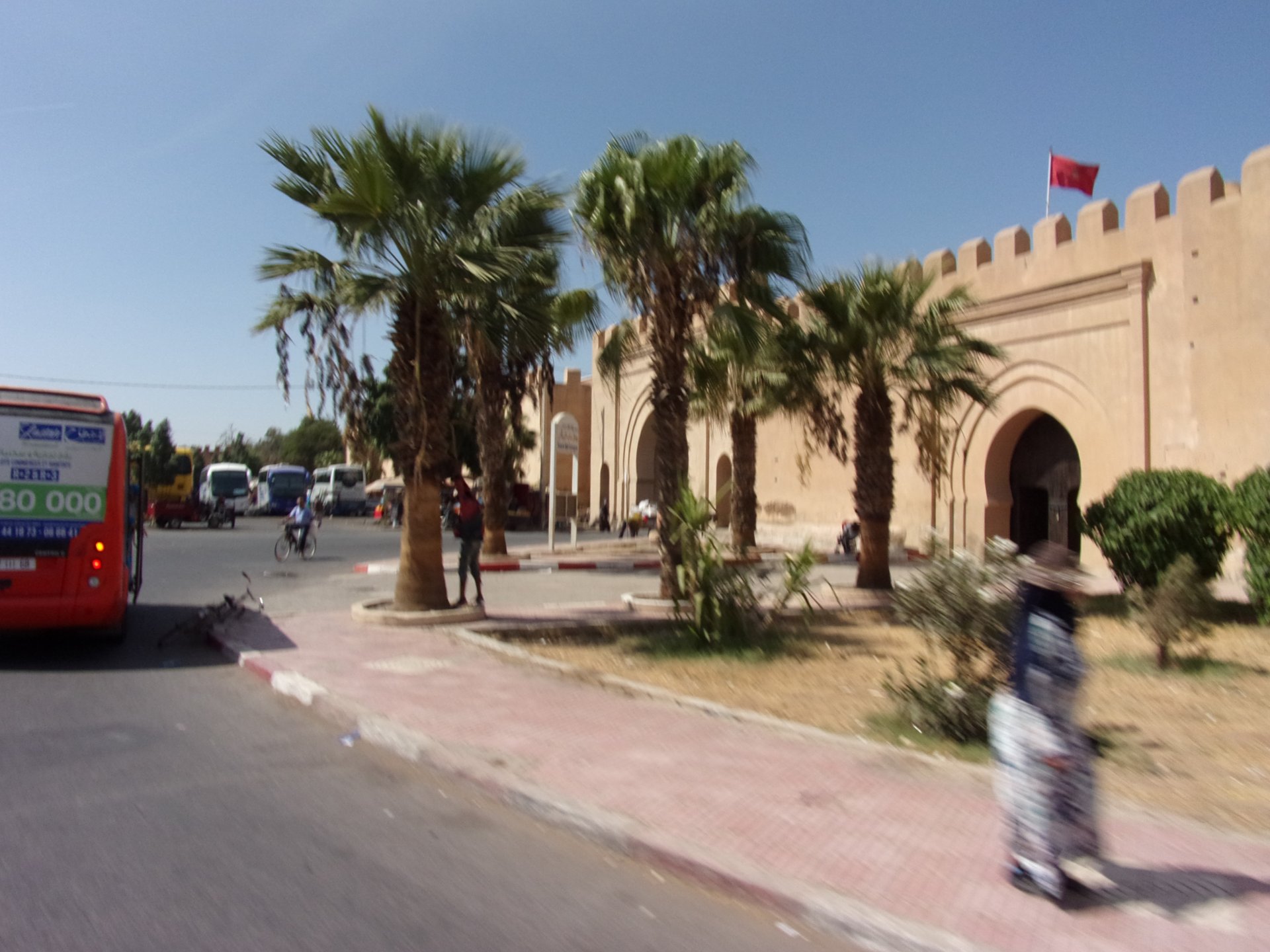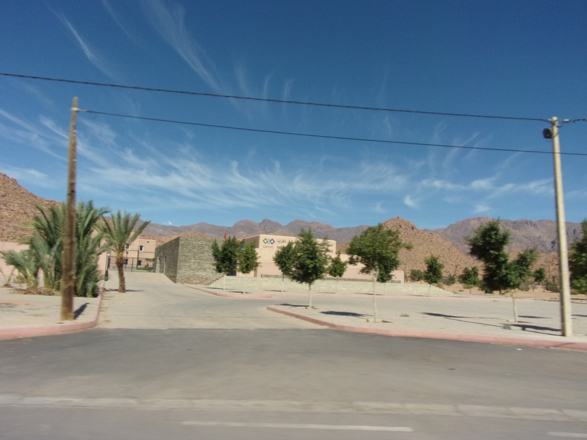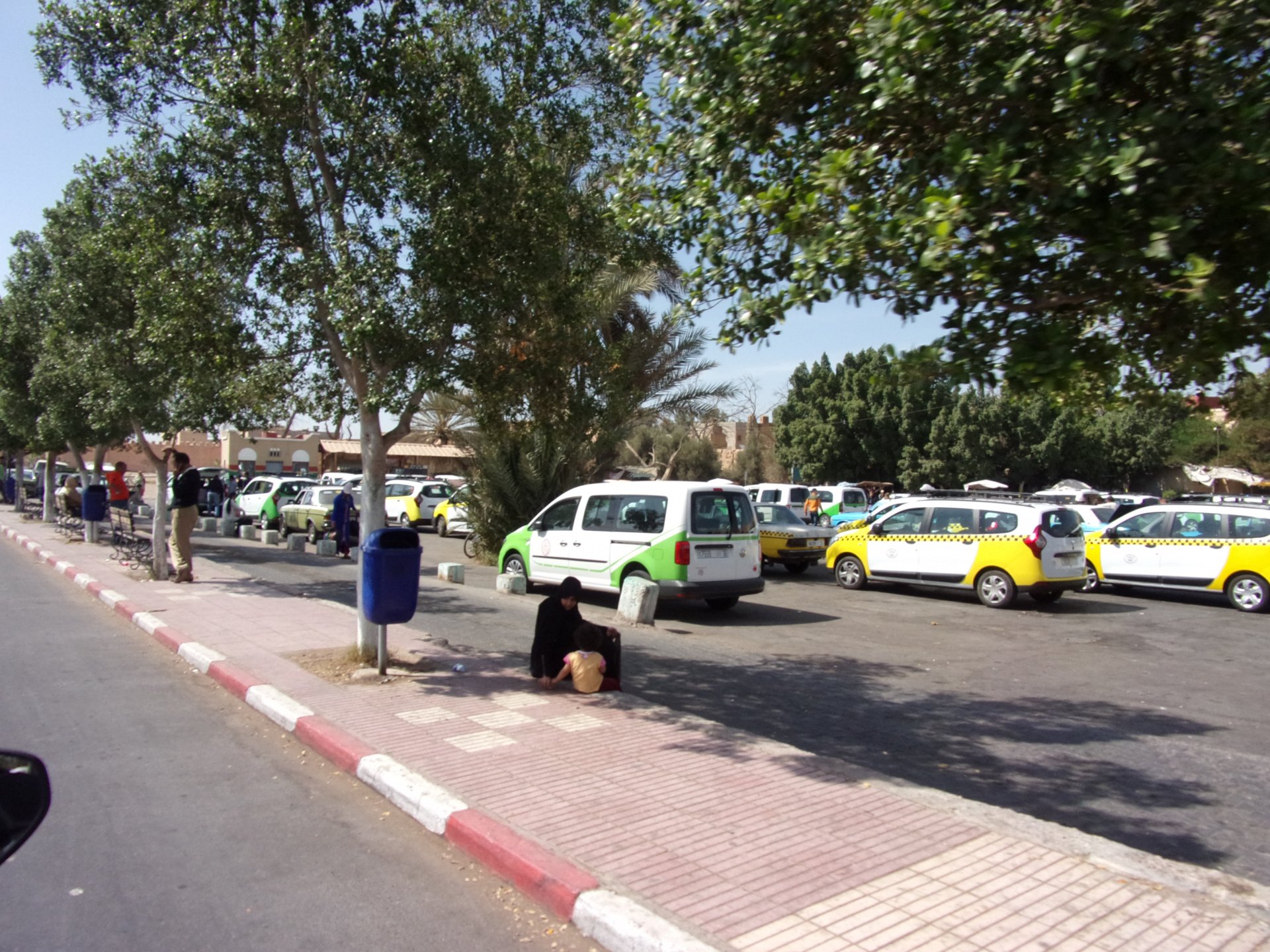 In the morning we had a little but very tasty breakfast, said goodbye, and off we went in search of the Desert Let's go to Guelmim! Schools are usually the most colorful buildings you'll ever see Heading from there to Guelmim we had one of this trip's best memories. We finally felt like being close to the Sahara as I imagined from reading books, it had just gotten proper hot and I decided to stop and drink some water, when a few camels appeared, and then continued to appear, must have been over 50 all scattered into smaller herds, it was pretty great. Guelmim, perfect mix of desert frontier city with developed world, never had I seen so many old Land Rovers as here and from here on south. We got here during the afternoon having had no lunch. Very hot and sweaty, we weren't hungry but each drank a full bottle of water and a couple of very cold orange juices. Made our way to our very nice hotel, and had some more water there, after diving head first into the swimming pool. We slept in a very comfy bed, feeling like a million bucks. I was very excited to go to Tan Tan, gateway to the desert.