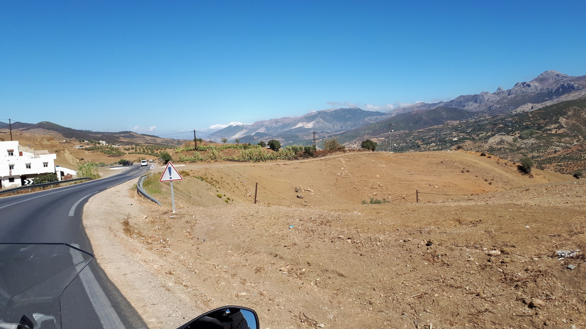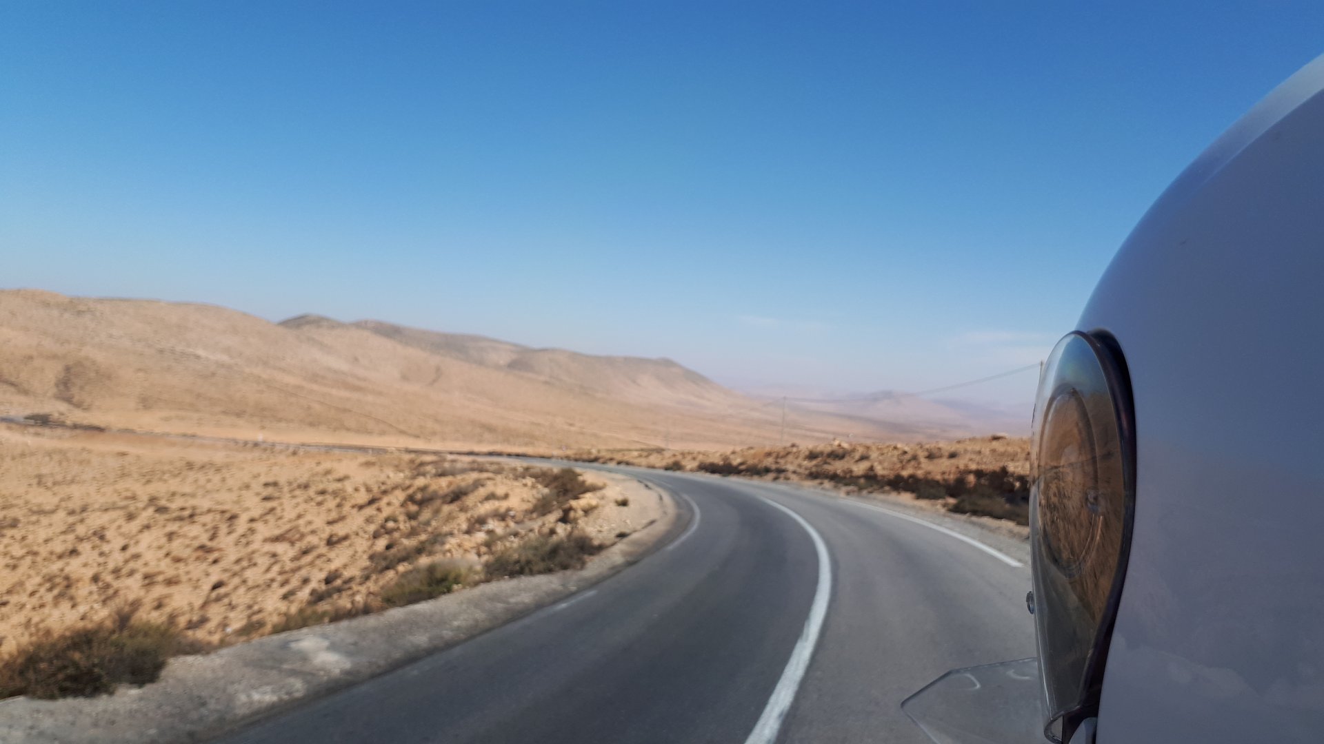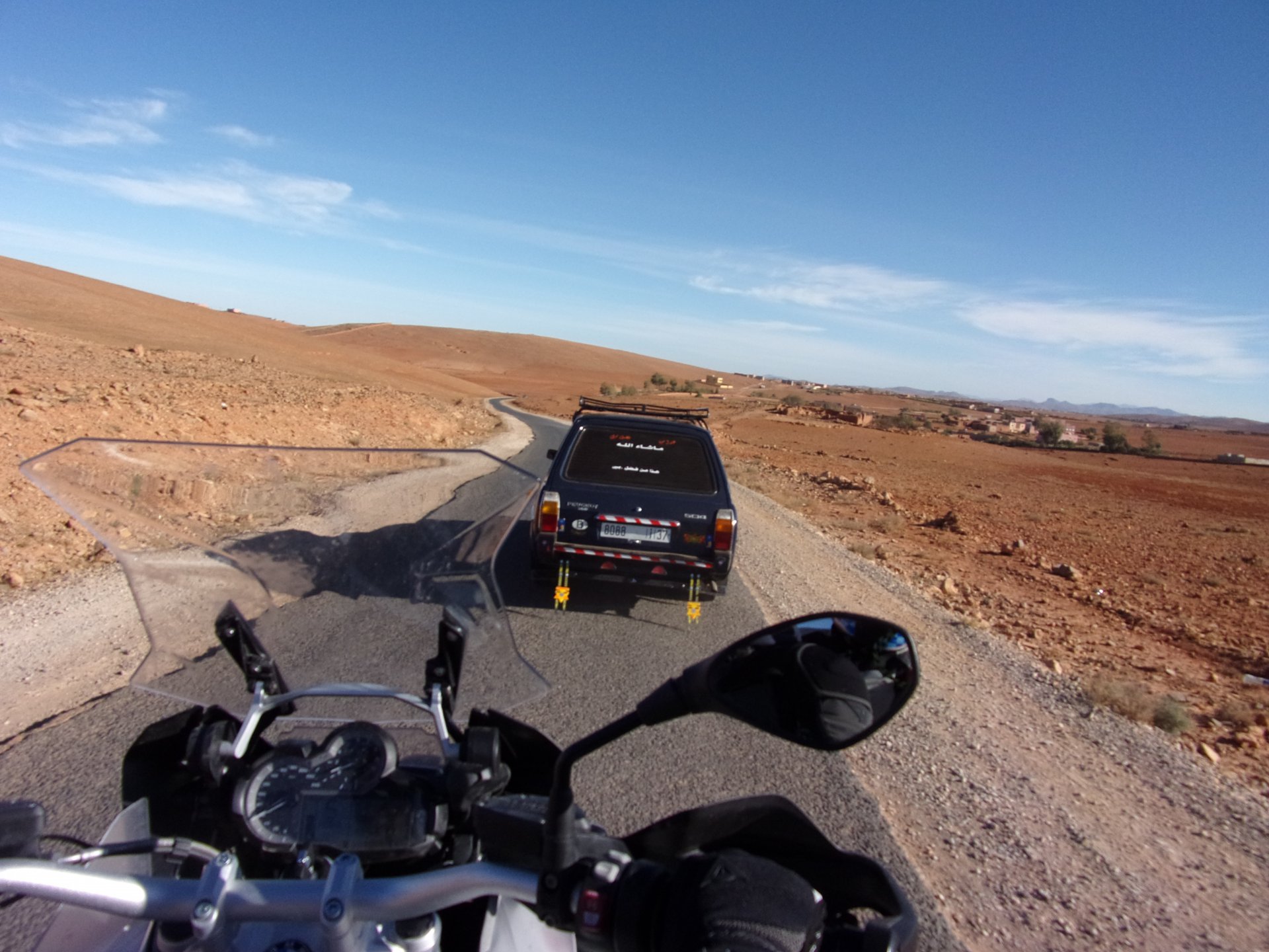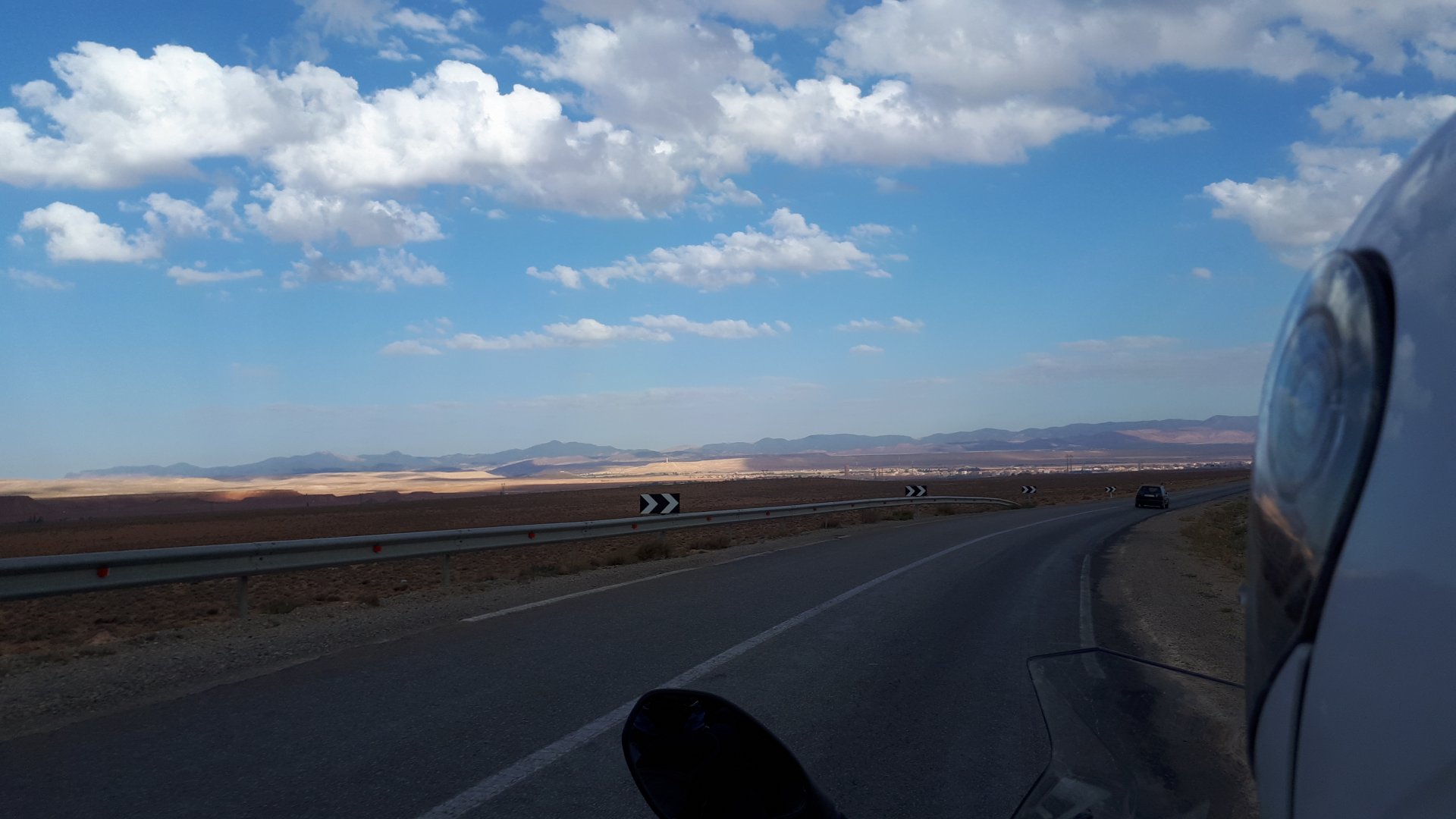 I have a few places scattered around Germany, Portugal, and Morocco, that I call home. It's always hard to leave them after only one night, and this simple hotel in the middle of a windswept plateau is one of them. Regardless, we were to go to bed in Fes tonight, so we made way enjoying a fresh October early morning. I was aware this would be our last big open space in Morocco this year, so I cruised these valleys slower than normal (which isn't fast anyway), and even stopped for a couple of pictures Here I am practicing my intrepid adventurer's thousand mile stare, if the camera's pointed at you don't fear a goofy pose! It was a good thing the sun was now clearing the top of the mountains, as we were both a little cold. I remember enjoying this vastness, aware I would miss this. Little did I know back then, how much I would miss that feeling. Having a sandwich arriving at Fes, with the Morocco Rally cars and bikes passing outside stopped in front of an old dealership with a forgotten S-Class inside, just stuff you notice In Fes, our regular hotel was again fully booked, so we stayed next door, at a less cooler place but with an almost 4 meter deep swimming pool, enough to make my ears ache while going for the bottom. That night we had some sort of tajine with meat after being received with open arms at a known restaurant. We shared it The next day would be a long one, although not in our plans so far.