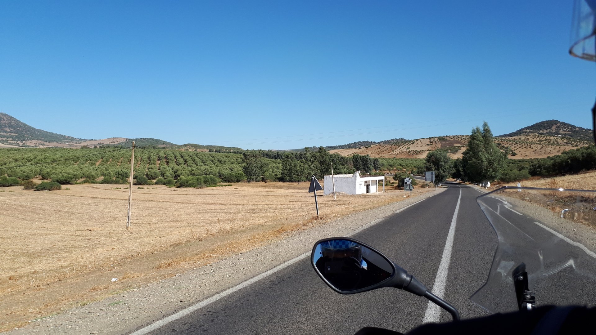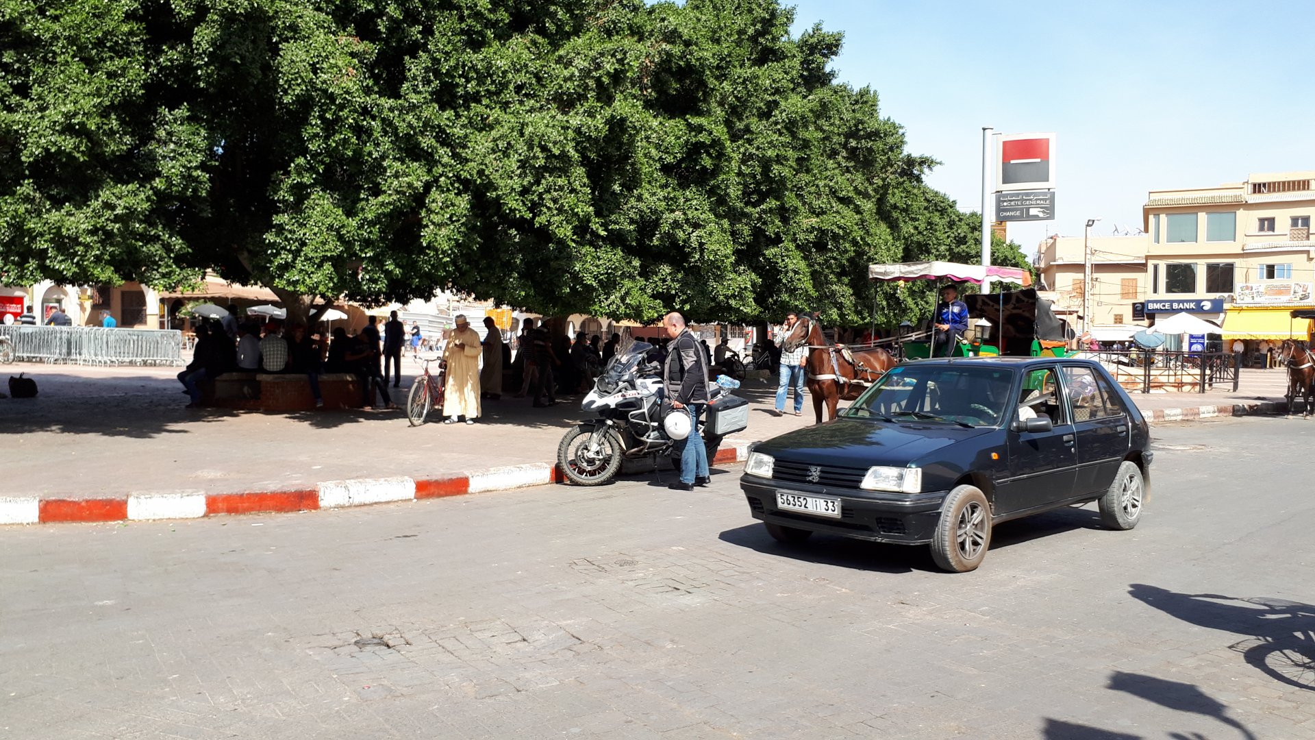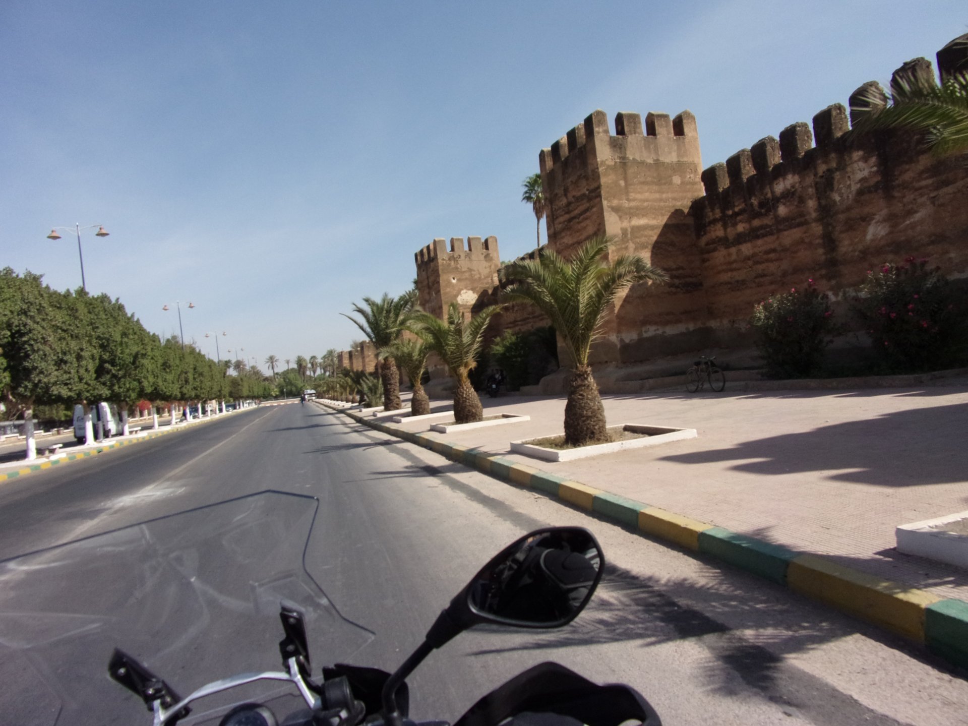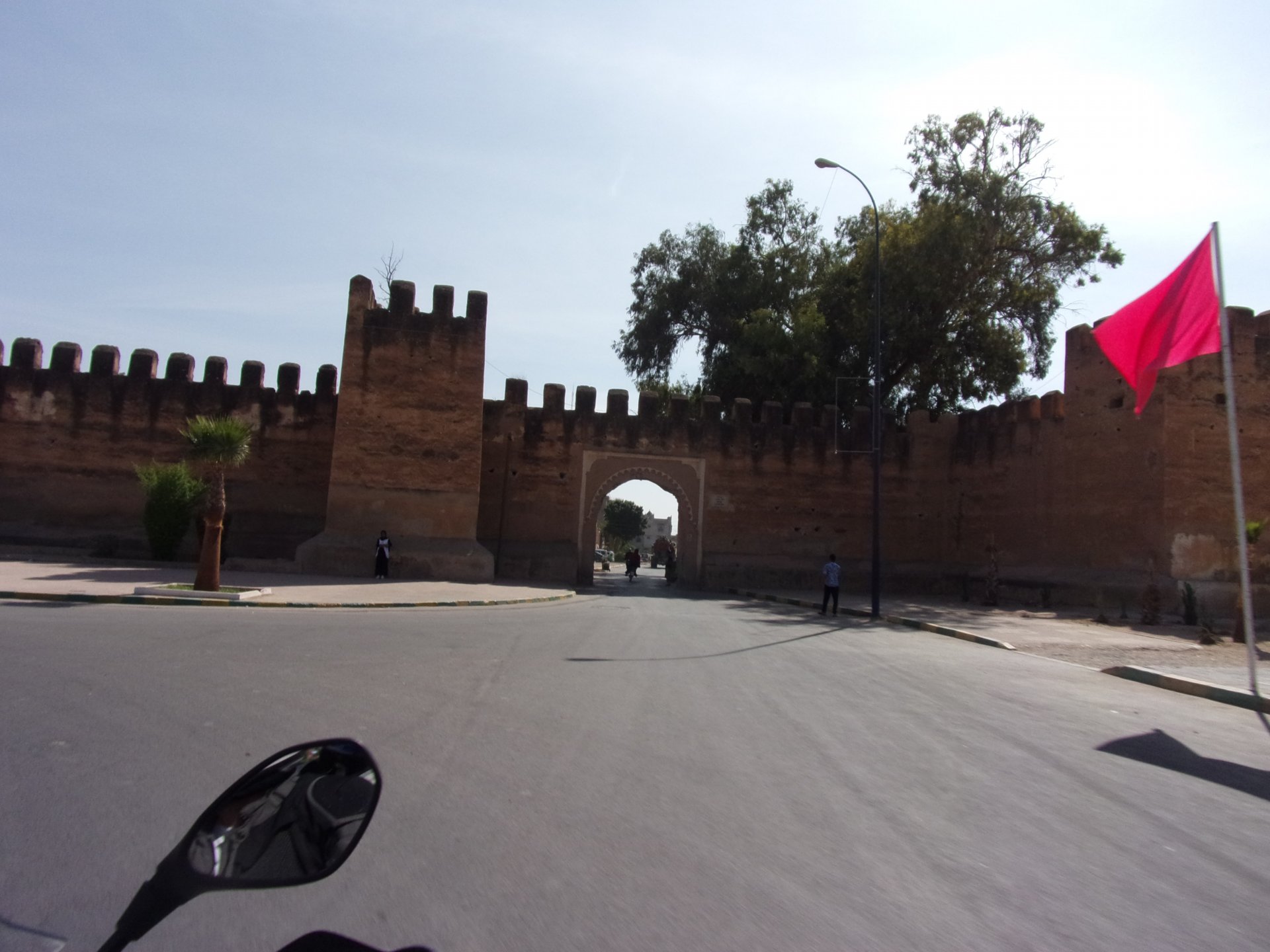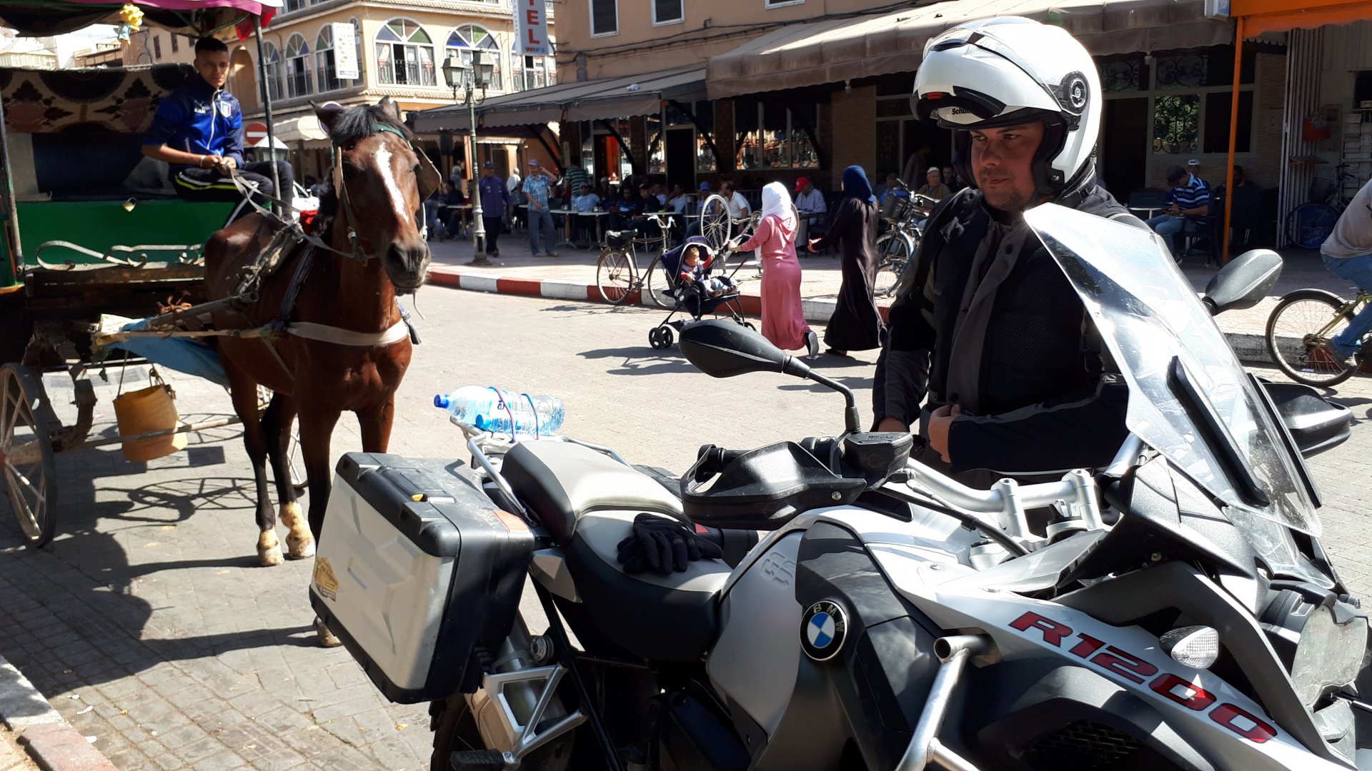 I have a few places scattered around Germany, Portugal, and Morocco, that I call home. It's always hard to leave them after only one night, and this simple hotel in the middle of a windswept plateau is one of them. Regardless, we were to go to bed in Fes tonight, so we made way enjoying a fresh October early morning. I was aware this would be our last big open space in Morocco this year, so I cruised these valleys slower than normal (which isn't fast anyway), and even stopped for a couple of pictures Here I am practicing my intrepid adventurer's thousand mile stare, if the camera's pointed at you don't fear a goofy pose! It was a good thing the sun was now clearing the top of the mountains, as we were both a little cold. I remember enjoying this vastness, aware I would miss this. Little did I know back then, how much I would miss that feeling. Having a sandwich arriving at Fes, with the Morocco Rally cars and bikes passing outside stopped in front of an old dealership with a forgotten S-Class inside, just stuff you notice In Fes, our regular hotel was again fully booked, so we stayed next door, at a less cooler place but with an almost 4 meter deep swimming pool, enough to make my ears ache while going for the bottom. That night we had some sort of tajine with meat after being received with open arms at a known restaurant. We shared it The next day would be a long one, although not in our plans so far.