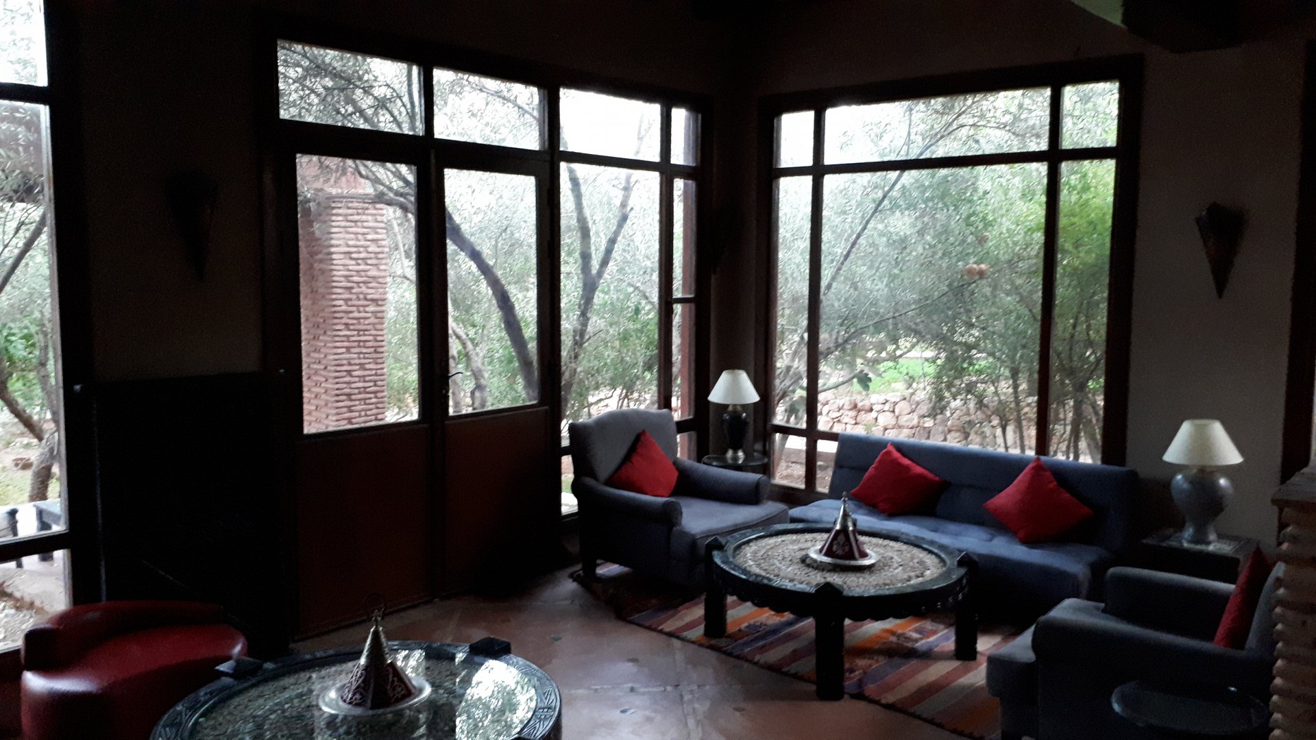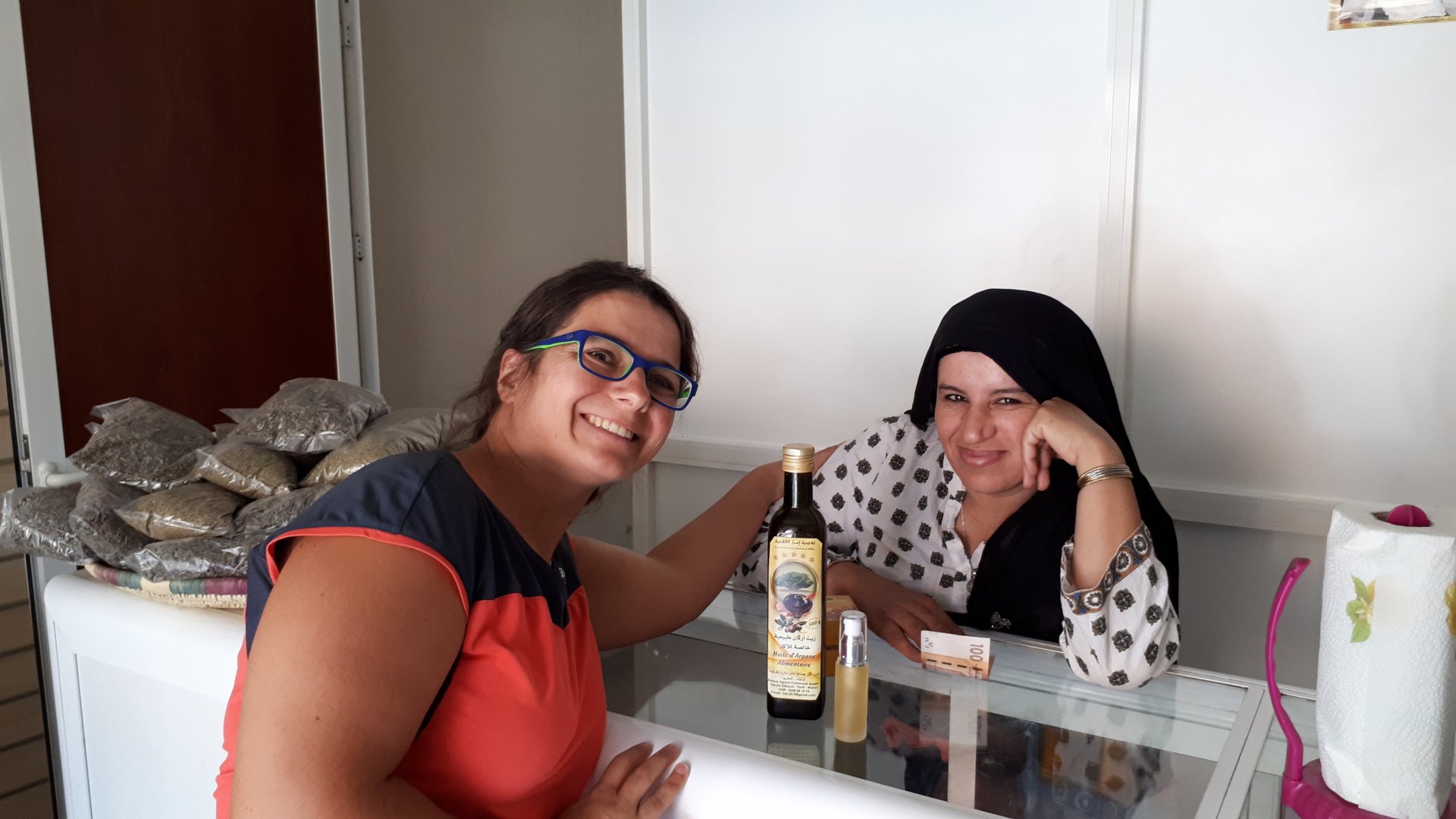 It was wet as we rode off in the morning, thick wet fog, the kinds of roads we were on and also the worn out suspension and tires in most cars meant traffic moved surprisingly carefully in the wet, I wonder how they cope with snow in places like Midelt where it really comes down and a significant part of cars seem to have had nothing done to them in the last 10 years. I didn't enjoy turning back north, my real wish would have been for us to go further south for 2 or 3 months! Anyway, we were off into the mountains, and surprisingly, this would be the day I was to ride my favourite biking road ever, to this day. Half an hour into the ride, as we turned away from the ocean and started climbing a little, the sun came out and it warmed up instantly, and out came our layers and the camera! In Tafraoute, a mountain town, we stopped at a small cooperative shop to buy one of our souvenirs for this trip. Argan oil is a very labour intensive work, the nuts' shell is split and it's the seed inside that is used for cold pressing for the precious oil. The cold pressing is done with a wooden hand tool, and is incredibly tedious and long work. Traditionally, all this is only done by women, so it's women who set up these cooperatives and run them with barely no influence by men who traditionally are dedicated to herding. It's also their way of controlling cash inflow to the household. This whole area is rich in Argan trees, and it's obviously going to be a rich business since major michelin star restaurants started using Argan oil for salads, as well as the beauty industry started to publicize Argan extract in expensive skin and hair products. In these hills or mountains, we stopped and watched a herd of goats enjoy the argan suits directly from a tree on a cliffside This is the stuff you can't find near tourist traps: We stop by Taroudant in search of lunch, and eat at a big cafe in the center. It was hot and busy, and no tourists in sight except for both of us. I left Taroudant with the feeling that it is a cool place to sleep over for another trip. Busy and big enough to be lively and get lost in but not chaotic and harsh like Marrakech. We were off again, heading towards Marrakech. Our plan was to stop an hour or so ahead and figure out where to sleep, our michelin map showed the R203 as a dangerous mountain road with drops, so I was obviously keen to try it The R203, between Tafingoult and Asni, is the best road I've ever done, look it up in google maps if you want. Starts pretty "European": But as you start to climb, it's not one to ride fast: At the top there is a dirt section, but I fear this might all have been "fixed" when I return for another run. This is a mountain, though, and they get plenty of winter weather here, so I understand why this road might be considered a little dangerous. We stop and check booking and google for a place to stay, and decide on one. Then just show up and ask for rates instead of settling for the internet prices, it was a good choice and was one of the best places we've slept and ate in Morocco. It had a comfy room, a swimming pool, ducks!, and an amazing restaurant that surprised us with Moroccan flavors in a more modern cuisine than we were used to, it was delicious. Dinner was outside, warm enough but with too little light for food pictures. We did have company, as always when eating outside in Morocco. A couple of old ladies from England sat on the table next to us, they were on a cooking learning trip learning different dishes in each town, and told Maria both would love to tour Morocco on a bike. One of them, having owned motorcycles for decades told us her adventures of motorcycling in the 50s and 60s in the UK. Sadly, I forgot to take a picture of them. We slept great.
