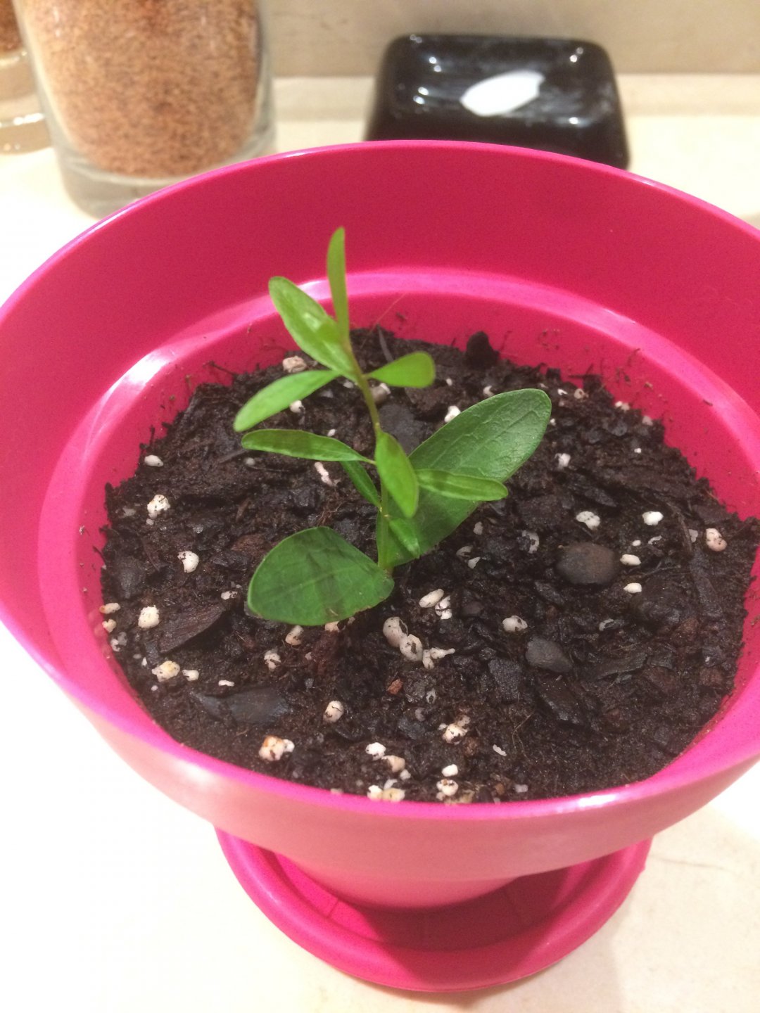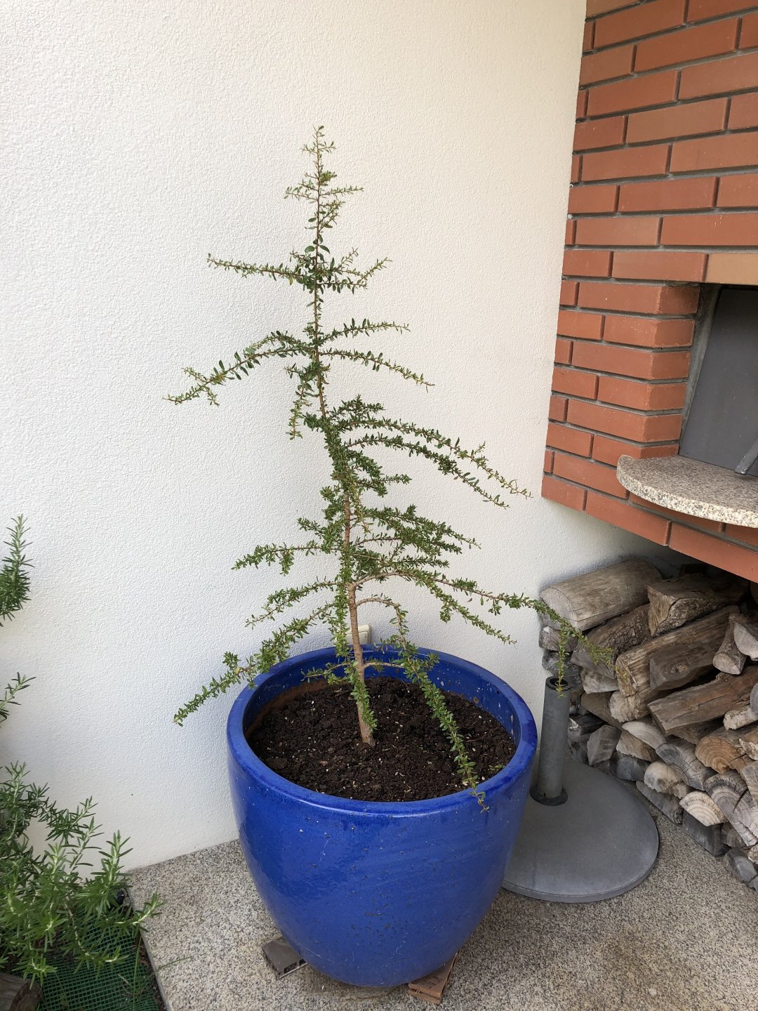 On that day, near where the goats were climbing the trees to get to the Argan fruit, Maria picked a couple of nuts off the ground and brought them as a souvenir. Later, I took the seeds out of their shell and one of them I managed to germinate into a small tree that has been growing for almost three years: It currently looks like this