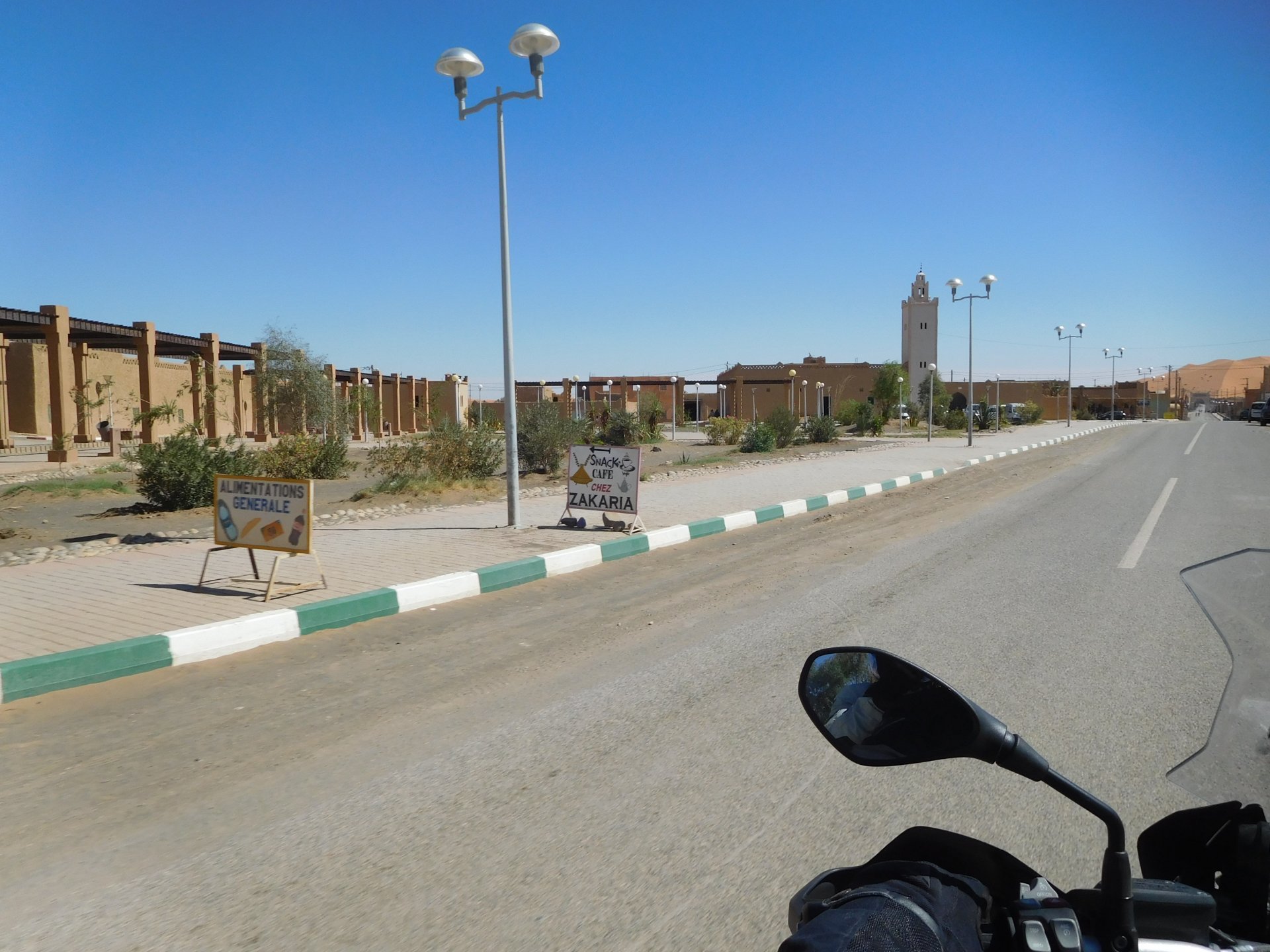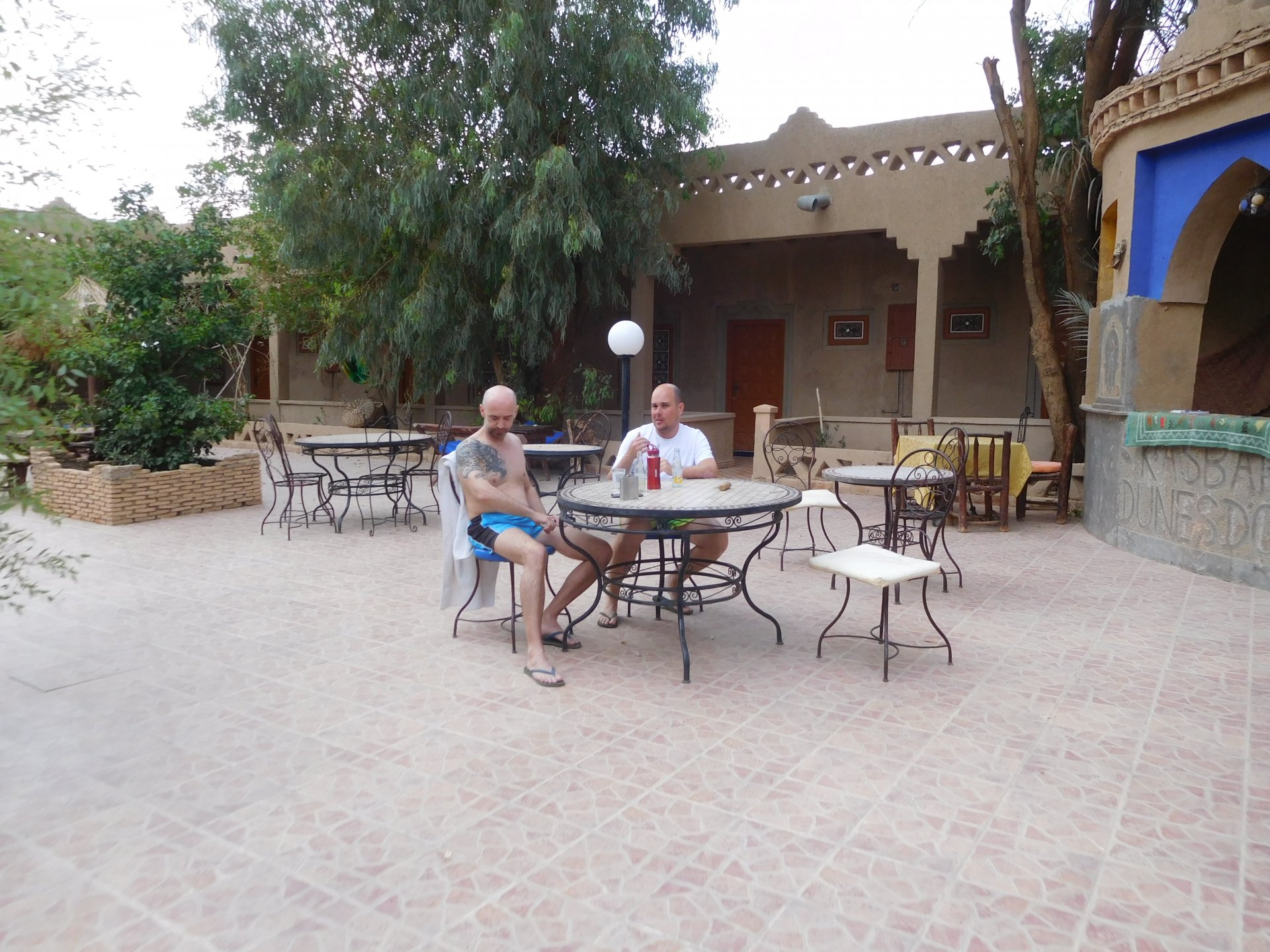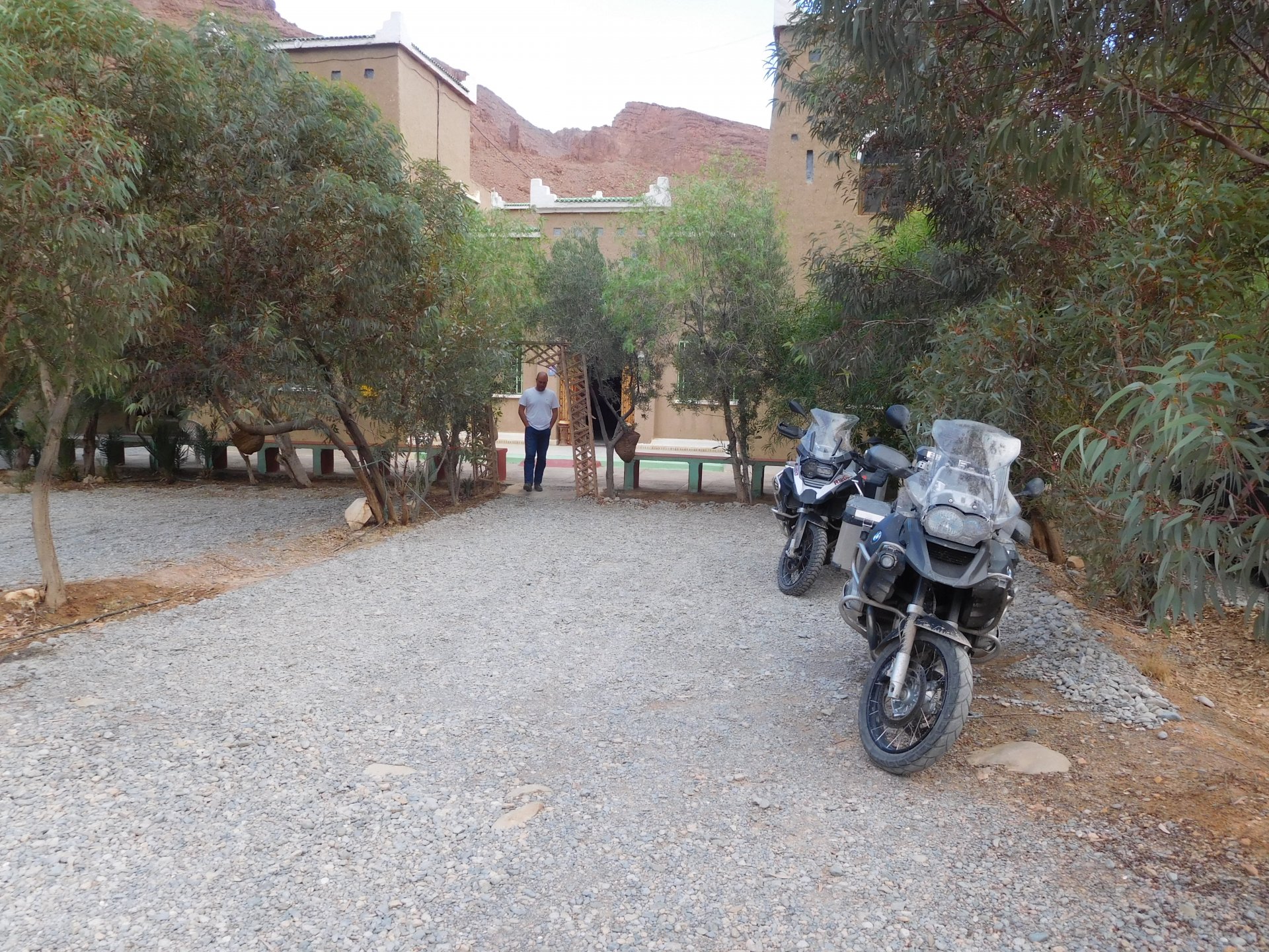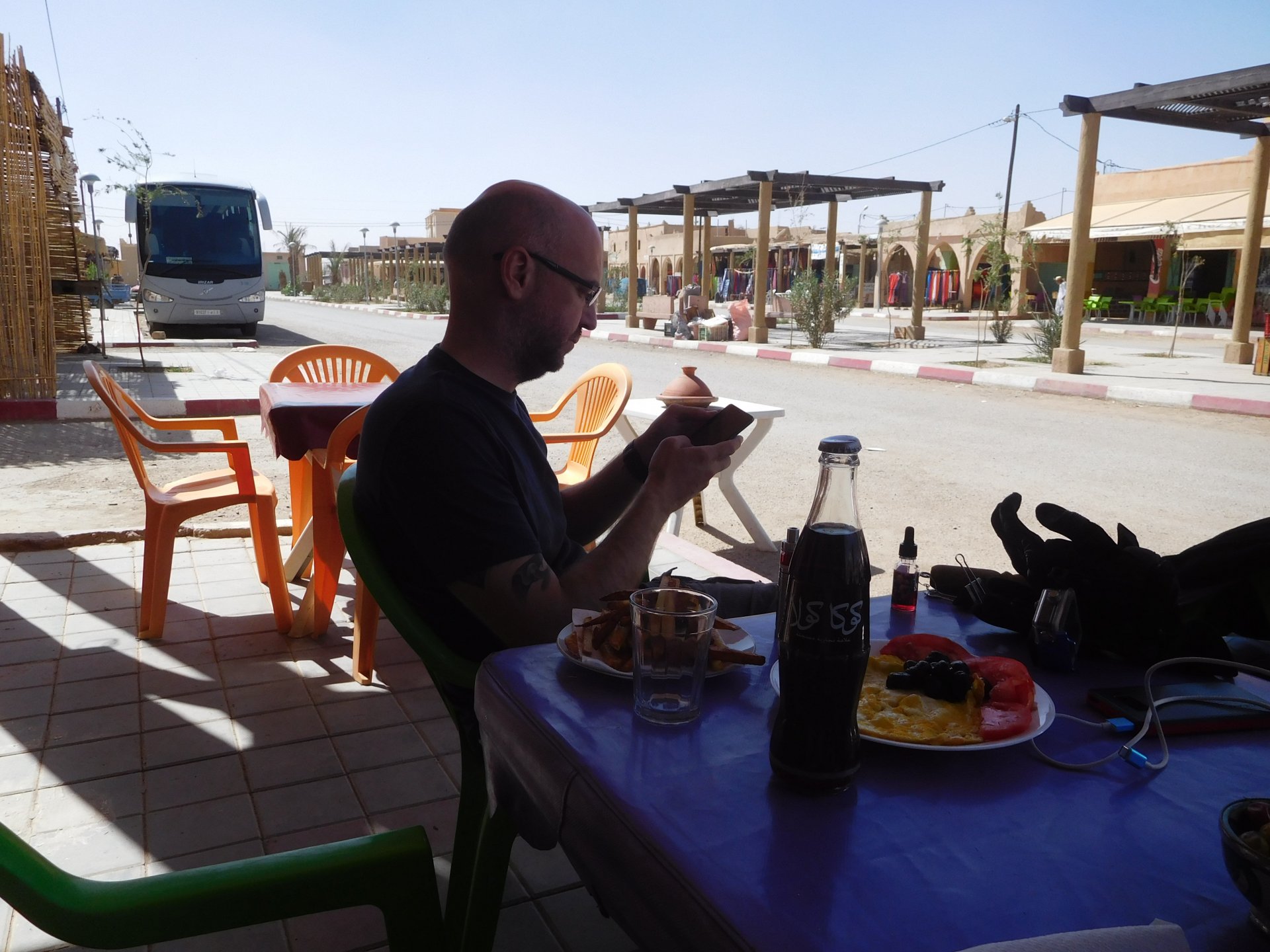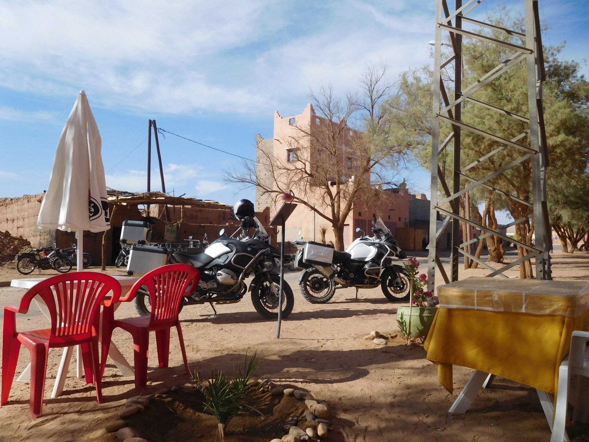 We slept like babies, on a room on the rooftop of the kasbah, a net for mosquitoes on the window, woke up to birds getting busy and singing at dawn We lingered around a little before breakfast Breakfast was to my liking I'll return, for sure: But the road is calling: There's a gas refinery in Errachidia and plenty of army around, for simple security I assume. We aren't that far away from Algeria. You get used to big views I think I put some poor quality fuel the day before on the bike, so as soon as I got an Afriquia station I fueled up, usually Afriquia stuff works well. We've come to Errachidia to buy Rui a sim card, for data and international calls. Administration done, time for some coffee And we're off to the Sahara! Scenery is really changing now We were headed to Merzouga and the golden dunes again, to stay at our favourite place. We were to spend two nights there, taking in the desert, a plan was forming in my head... stay tuned And finally arriving at out oasis, very hot and tired but with some time to kill before sunset. Inside one of Rui´s metal cases were a couple of aluminium flasks with some nice gin and vodka. We quickly ordered a few cold tonics and relaxed a little Tomorrow would be an extraordinary day...