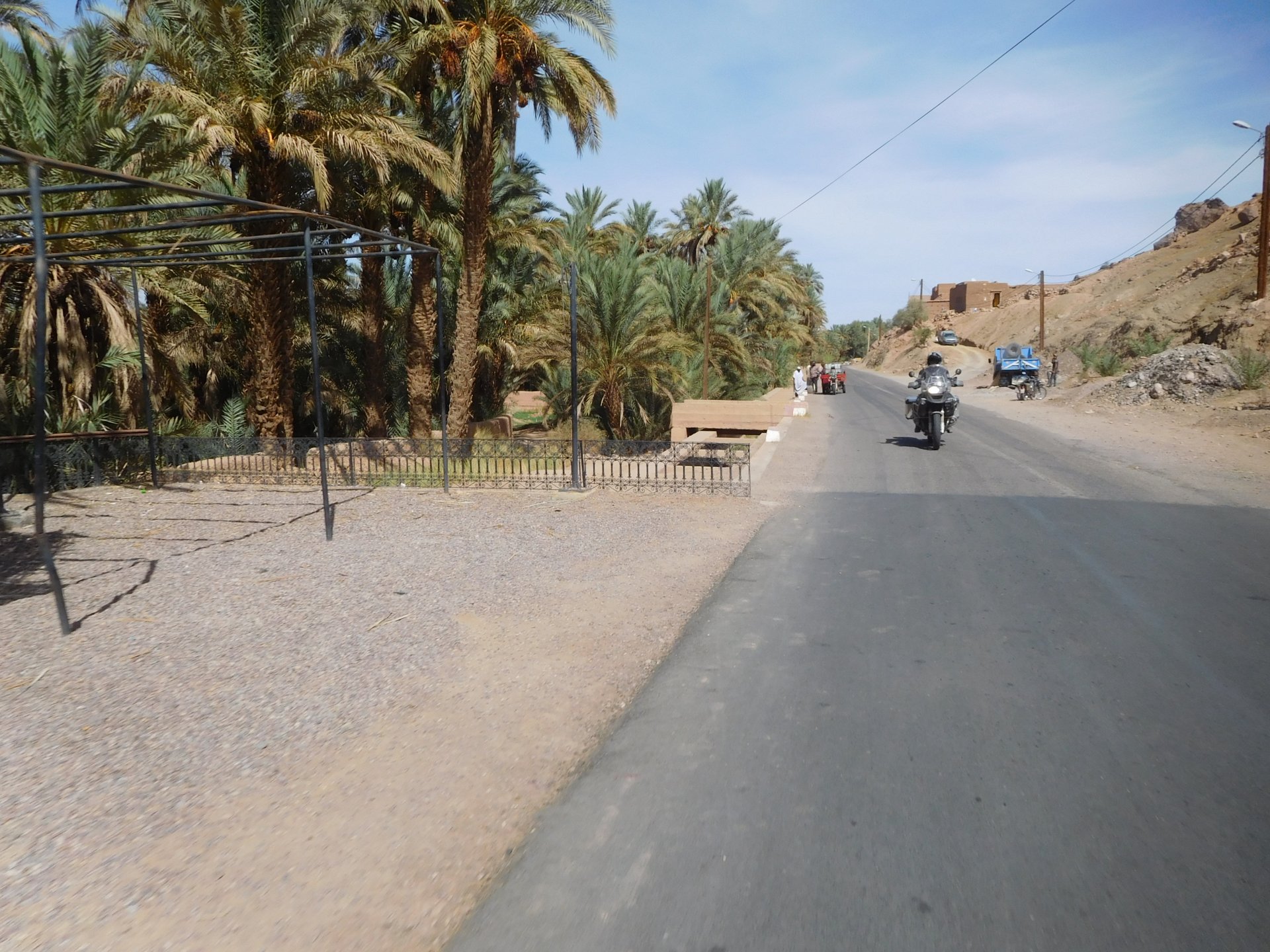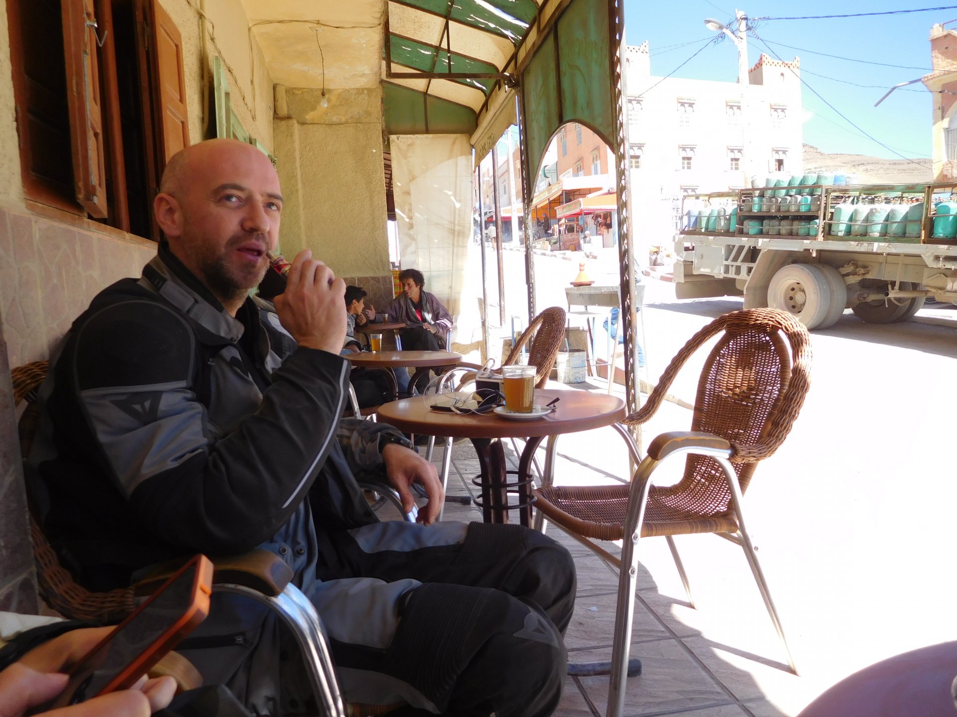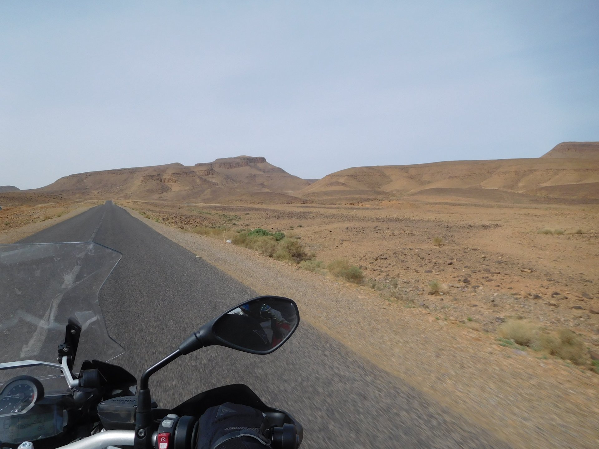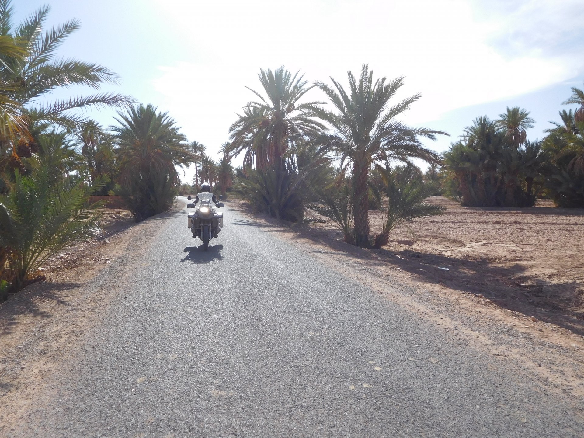 We slept like babies, on a room on the rooftop of the kasbah, a net for mosquitoes on the window, woke up to birds getting busy and singing at dawn We lingered around a little before breakfast Breakfast was to my liking I'll return, for sure: But the road is calling: There's a gas refinery in Errachidia and plenty of army around, for simple security I assume. We aren't that far away from Algeria. You get used to big views I think I put some poor quality fuel the day before on the bike, so as soon as I got an Afriquia station I fueled up, usually Afriquia stuff works well. We've come to Errachidia to buy Rui a sim card, for data and international calls. Administration done, time for some coffee And we're off to the Sahara! Scenery is really changing now We were headed to Merzouga and the golden dunes again, to stay at our favourite place. We were to spend two nights there, taking in the desert, a plan was forming in my head... stay tuned And finally arriving at out oasis, very hot and tired but with some time to kill before sunset. Inside one of Rui´s metal cases were a couple of aluminium flasks with some nice gin and vodka. We quickly ordered a few cold tonics and relaxed a little Tomorrow would be an extraordinary day...