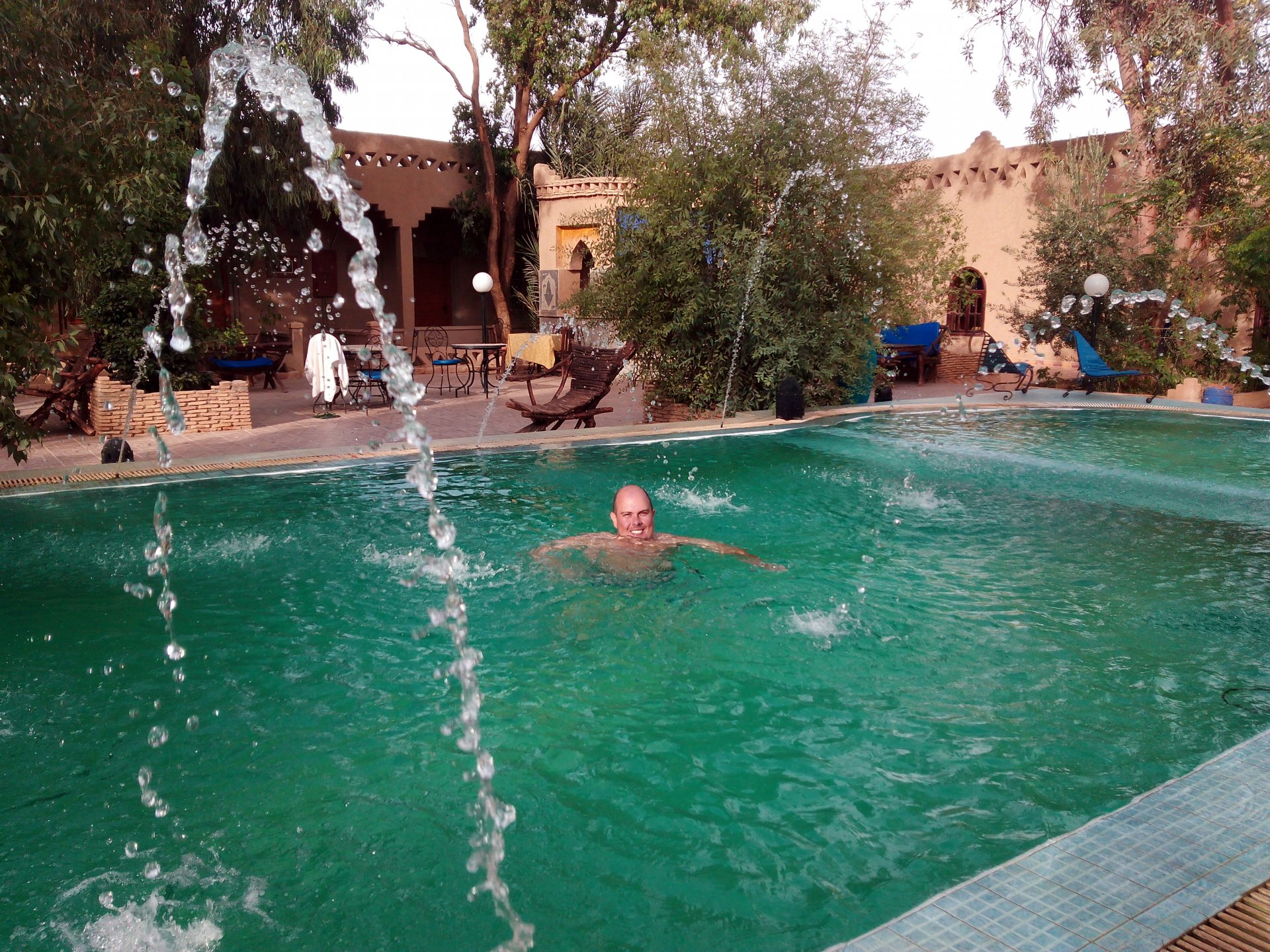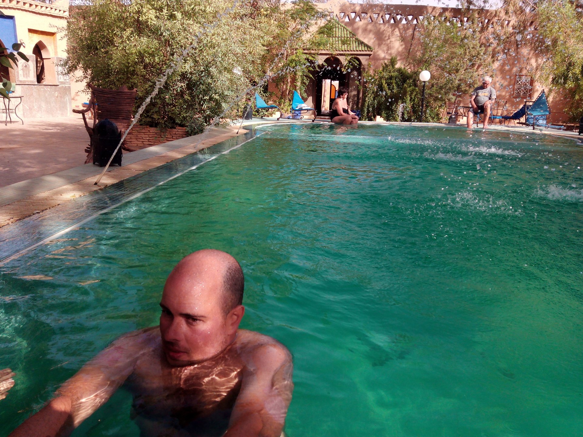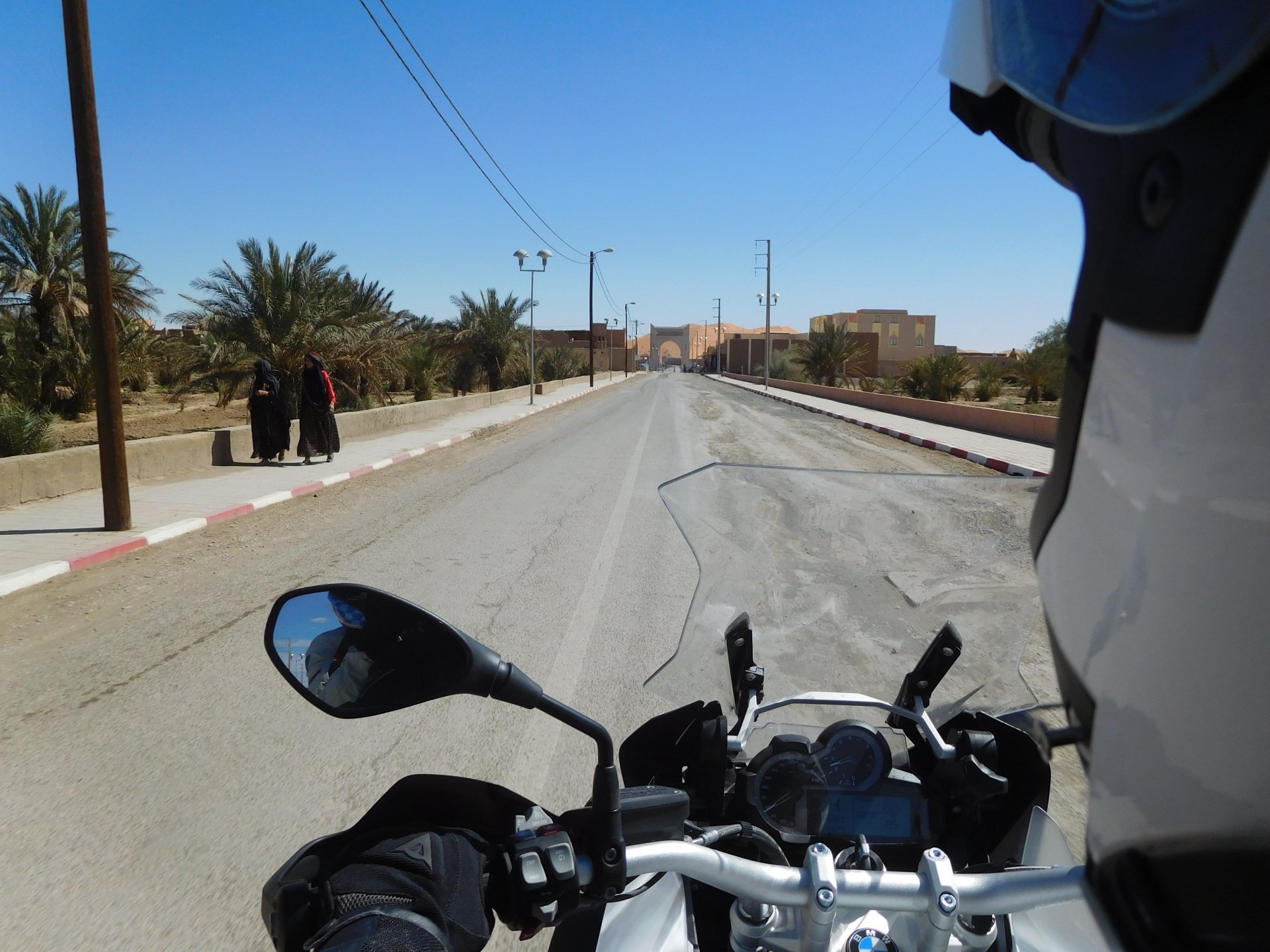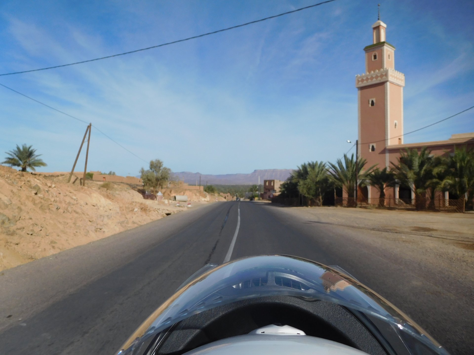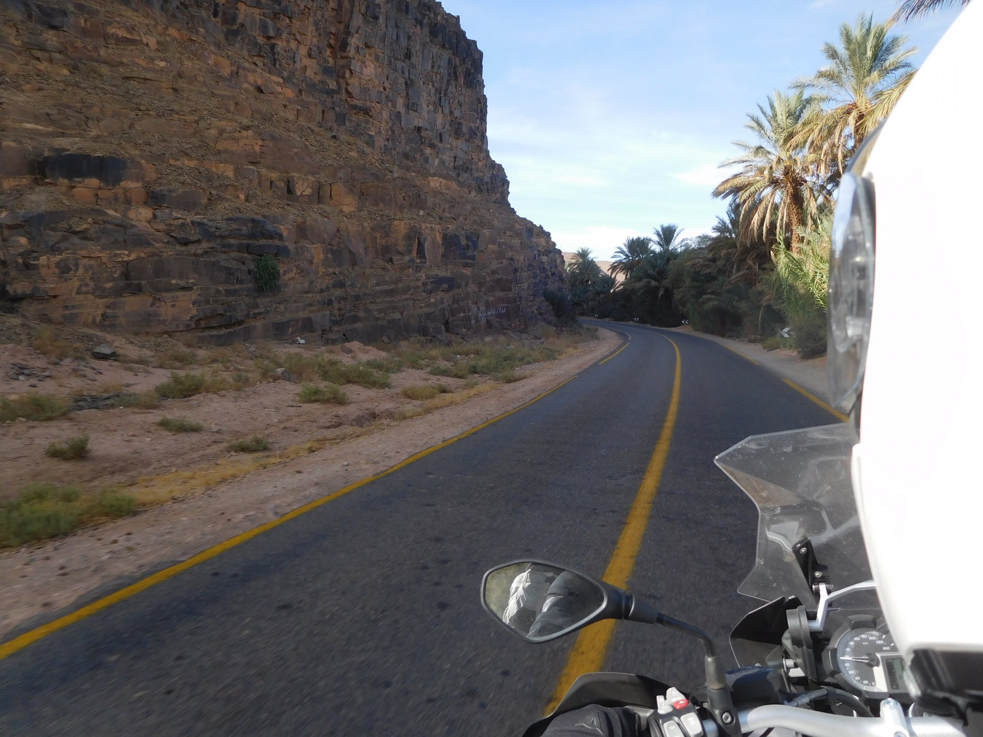 We slept like babies, on a room on the rooftop of the kasbah, a net for mosquitoes on the window, woke up to birds getting busy and singing at dawn We lingered around a little before breakfast Breakfast was to my liking I'll return, for sure: But the road is calling: There's a gas refinery in Errachidia and plenty of army around, for simple security I assume. We aren't that far away from Algeria. You get used to big views I think I put some poor quality fuel the day before on the bike, so as soon as I got an Afriquia station I fueled up, usually Afriquia stuff works well. We've come to Errachidia to buy Rui a sim card, for data and international calls. Administration done, time for some coffee And we're off to the Sahara! Scenery is really changing now We were headed to Merzouga and the golden dunes again, to stay at our favourite place. We were to spend two nights there, taking in the desert, a plan was forming in my head... stay tuned And finally arriving at out oasis, very hot and tired but with some time to kill before sunset. Inside one of Rui´s metal cases were a couple of aluminium flasks with some nice gin and vodka. We quickly ordered a few cold tonics and relaxed a little Tomorrow would be an extraordinary day...